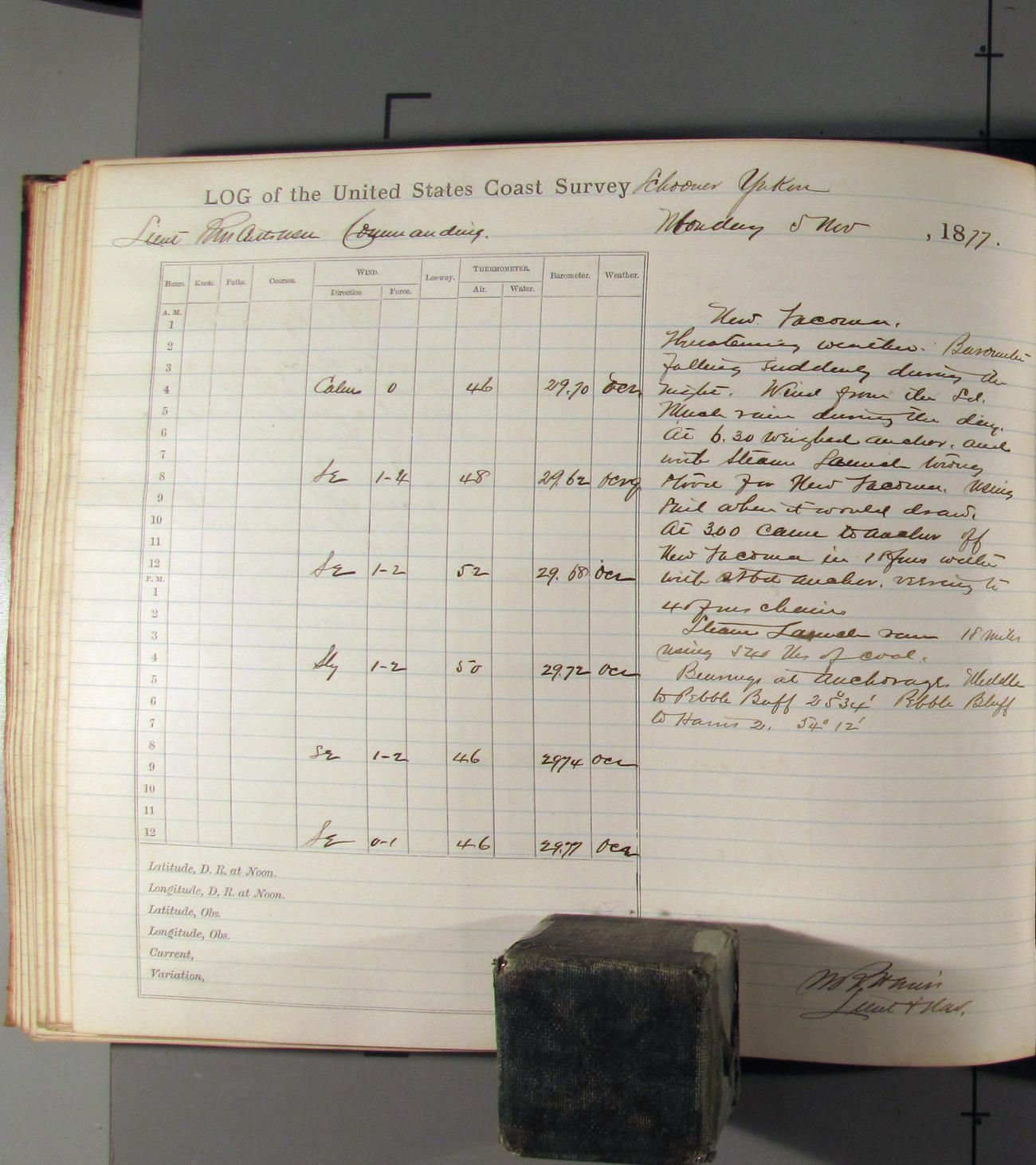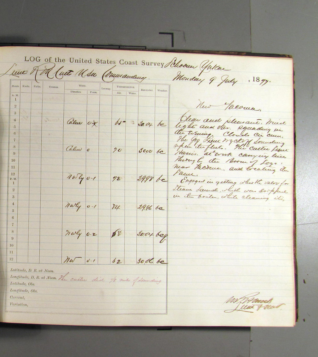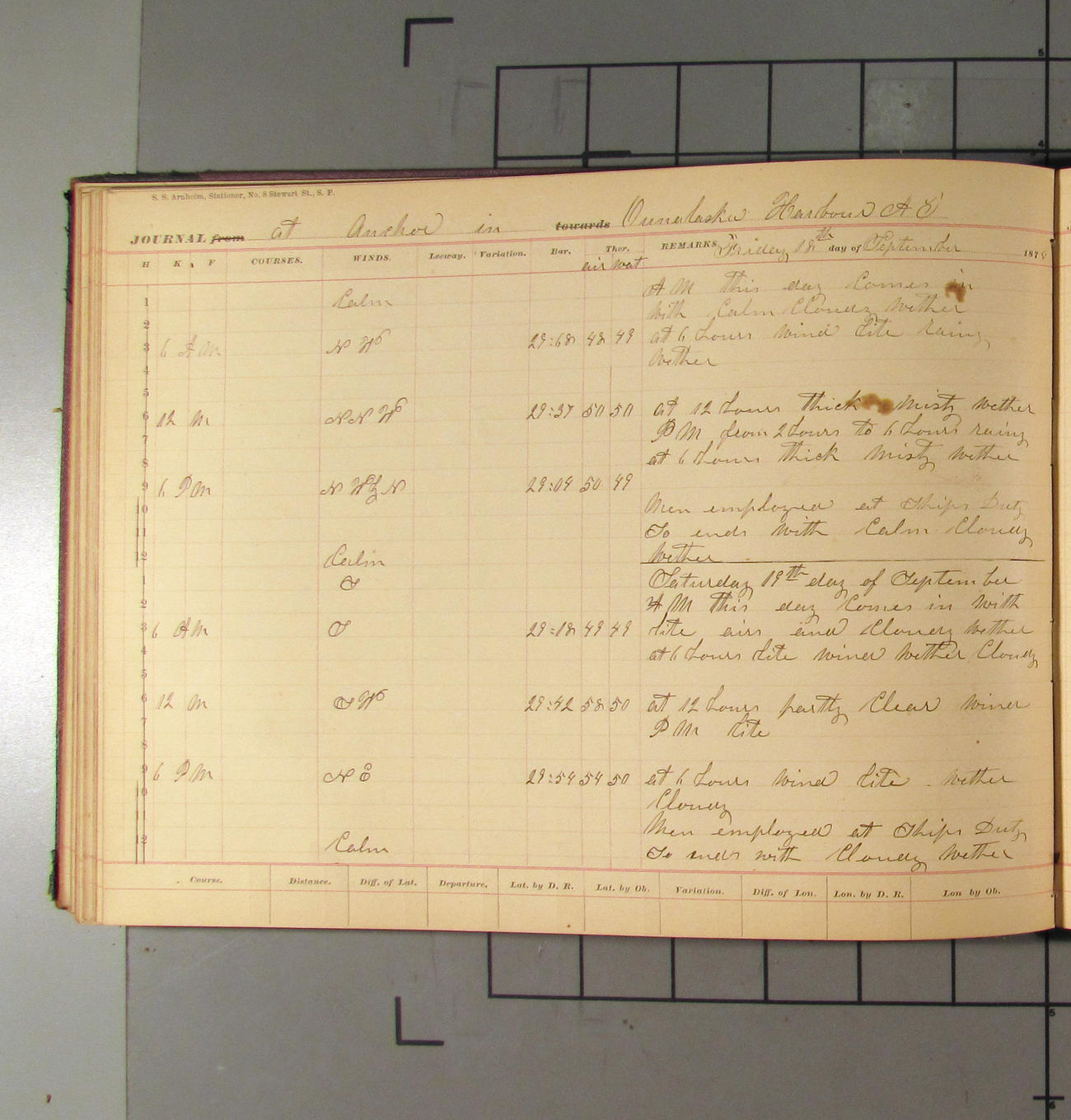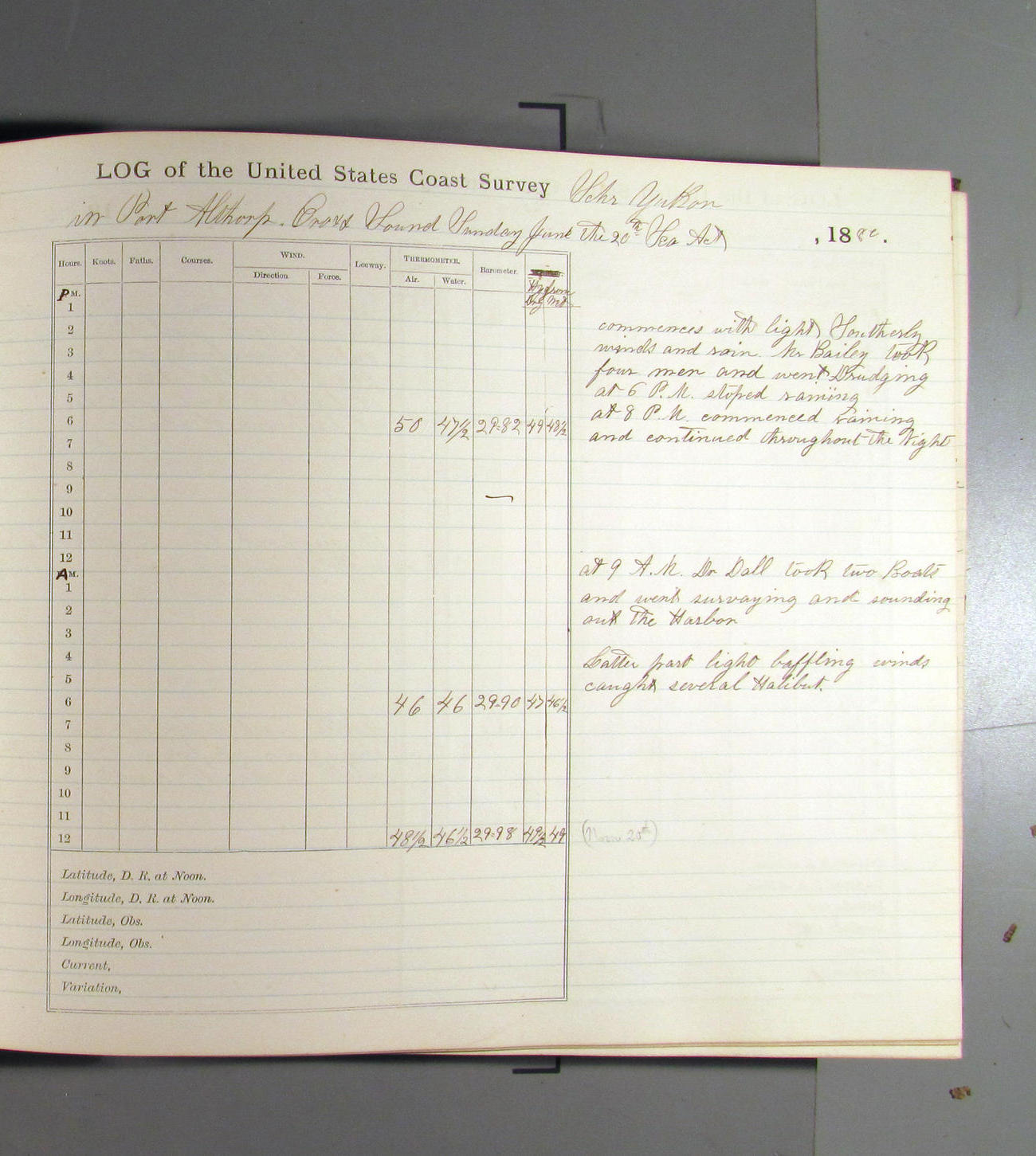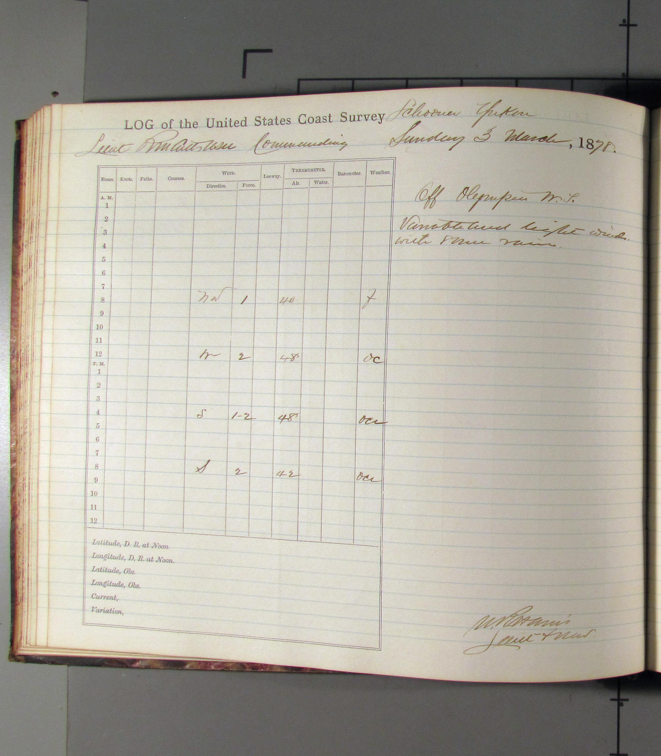This day commences with light variable airs attended by light rain. Latter part wind fresh NW. Weather clear.