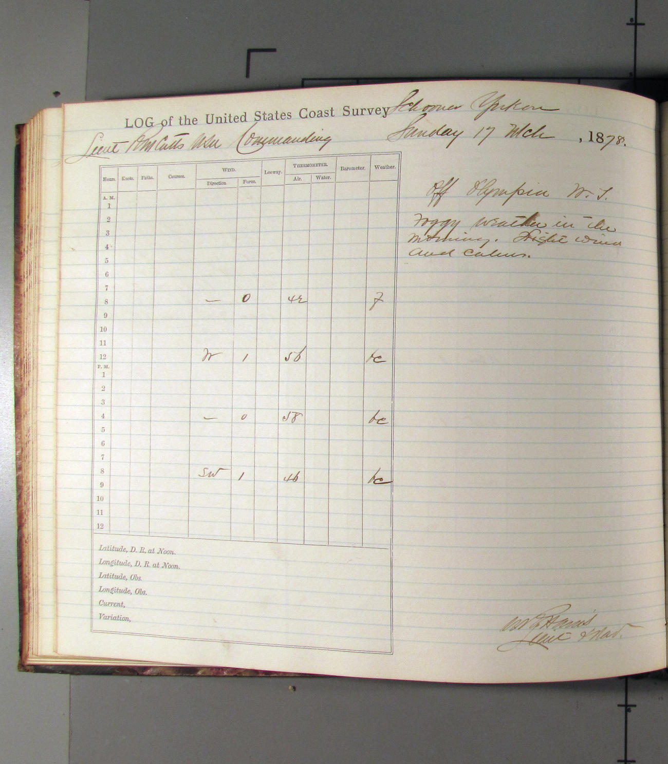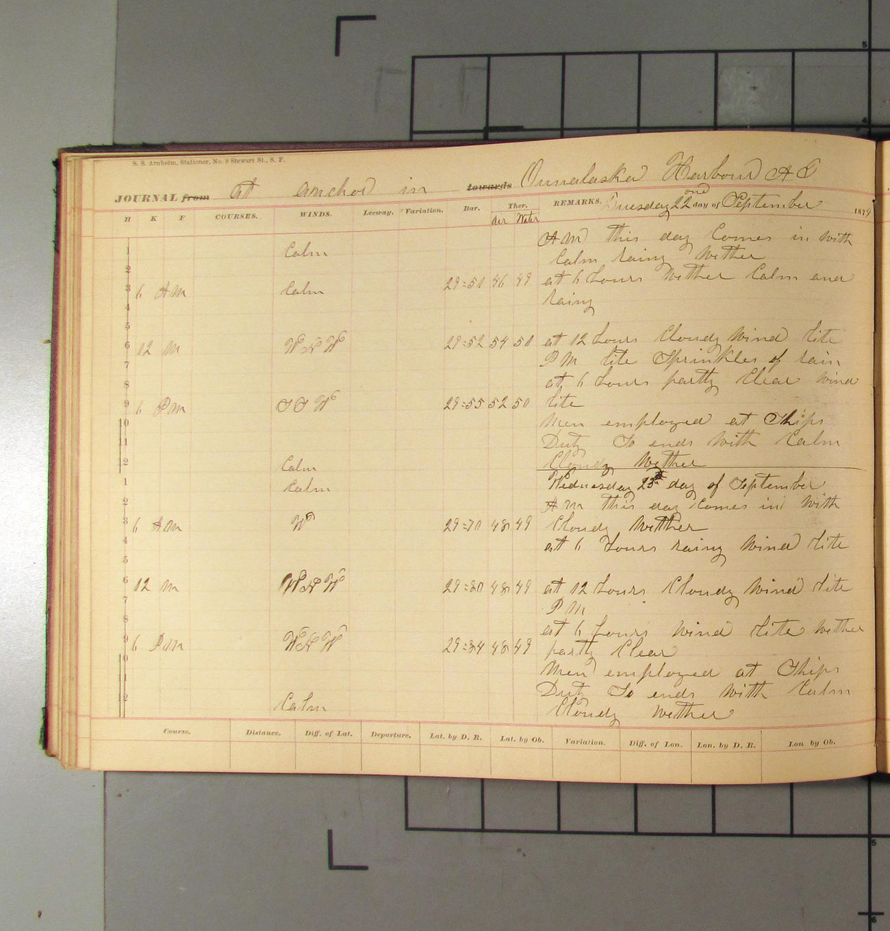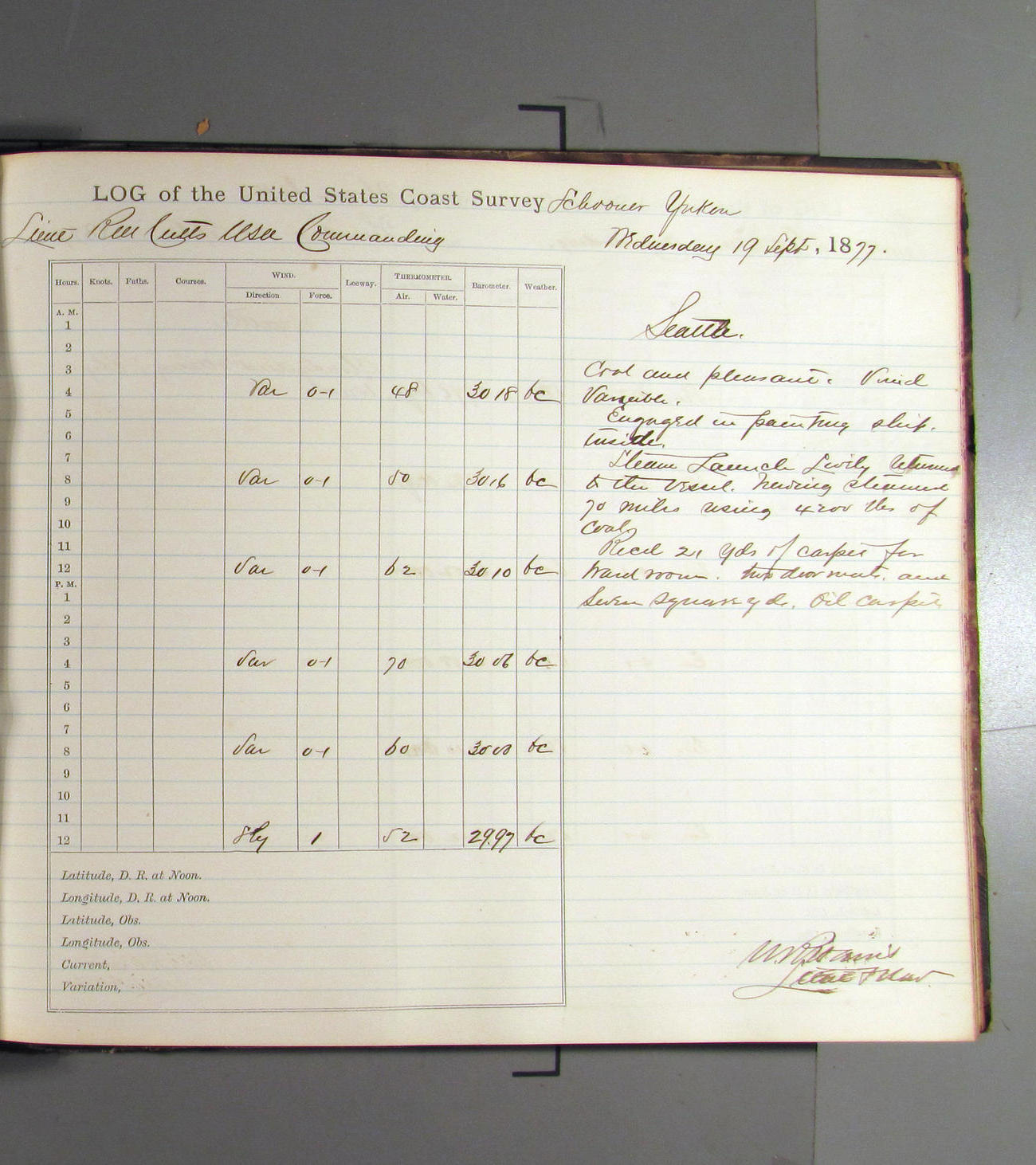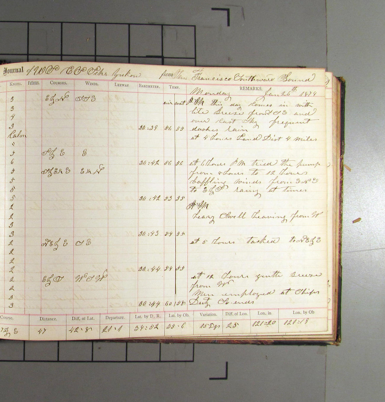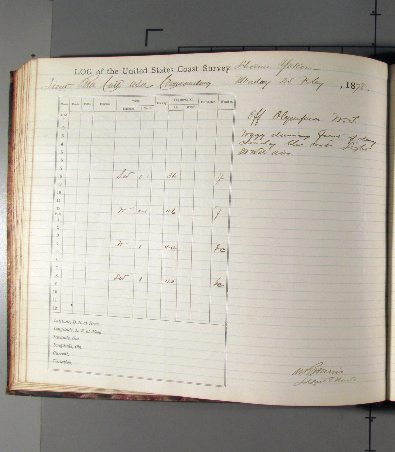 This day commences with light variable airs attended by light rain. Latter part wind fresh NW. Weather clear.