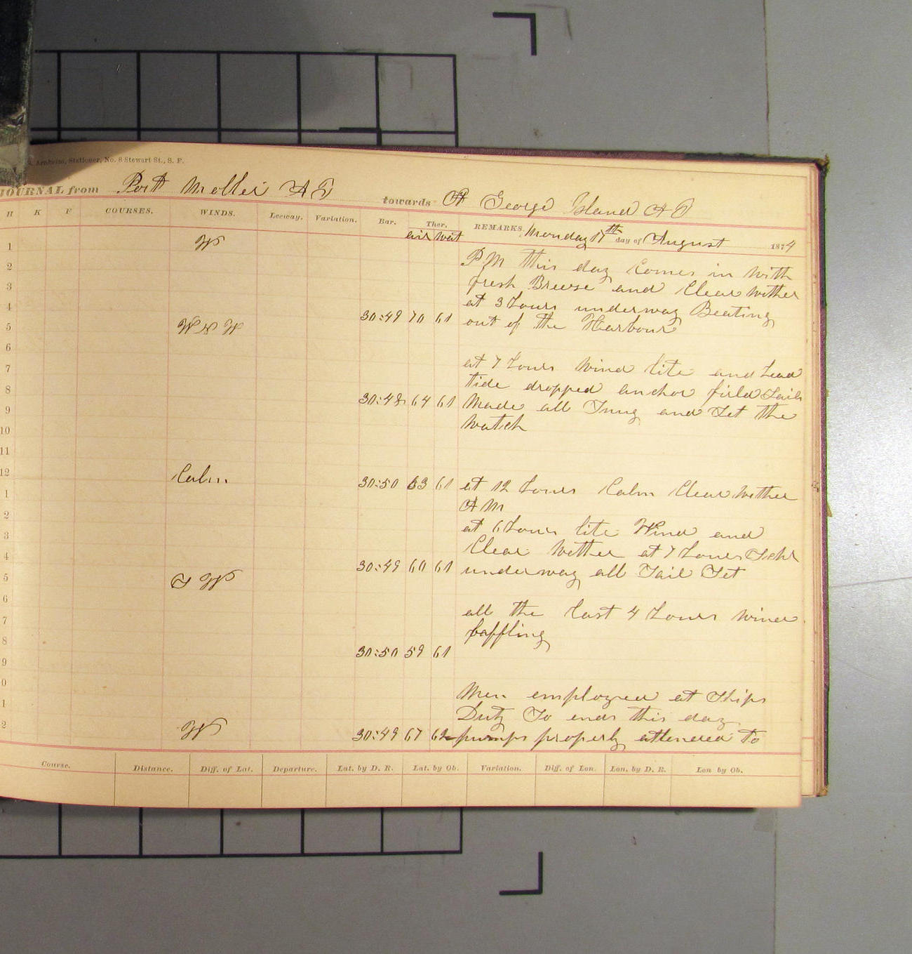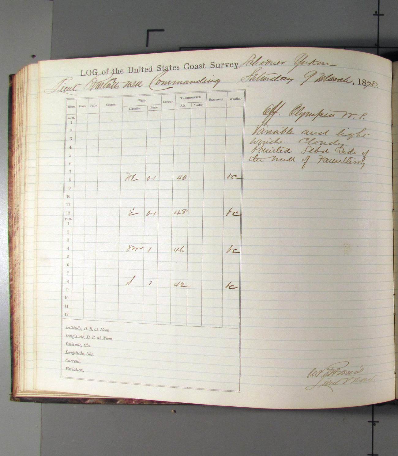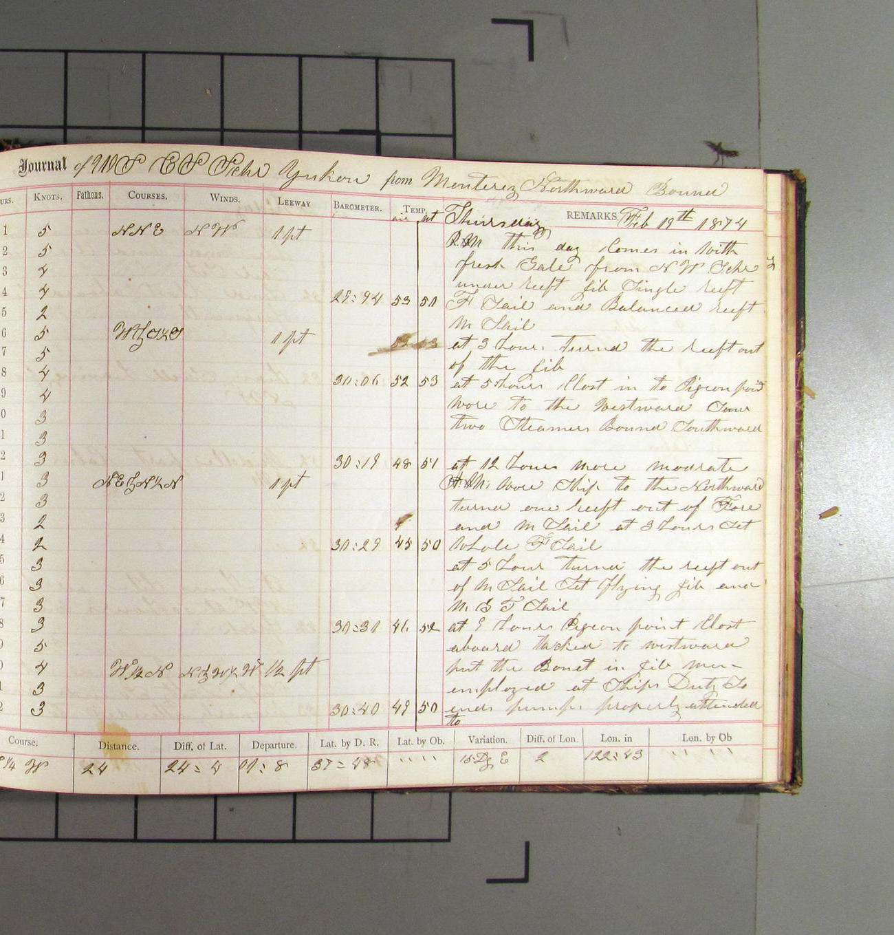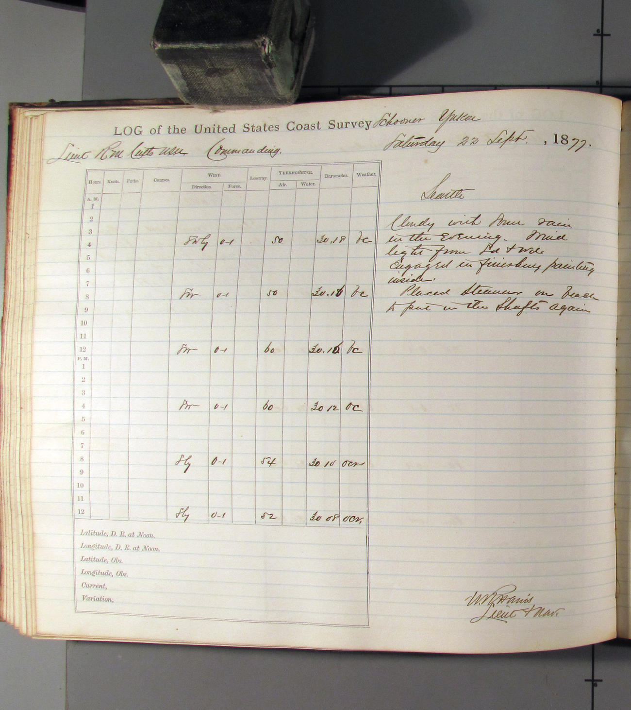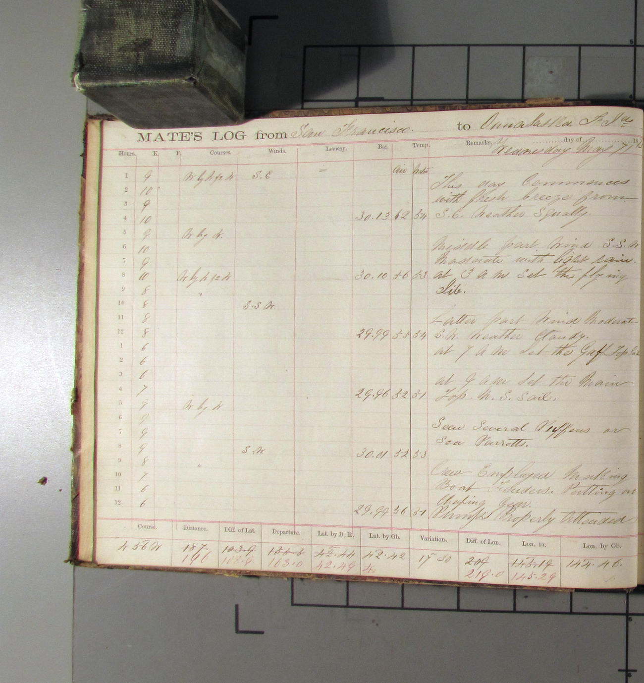 This day commences with light variable airs attended by light rain. Latter part wind fresh NW. Weather clear.