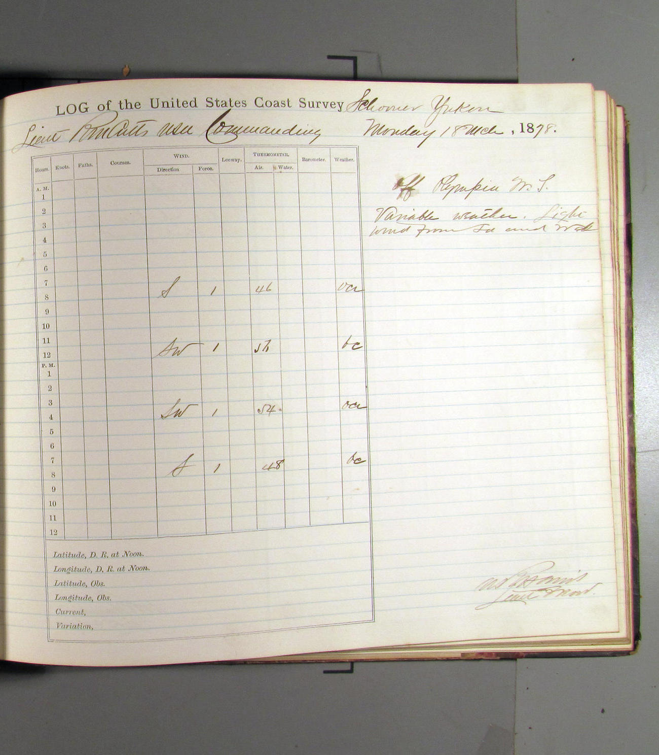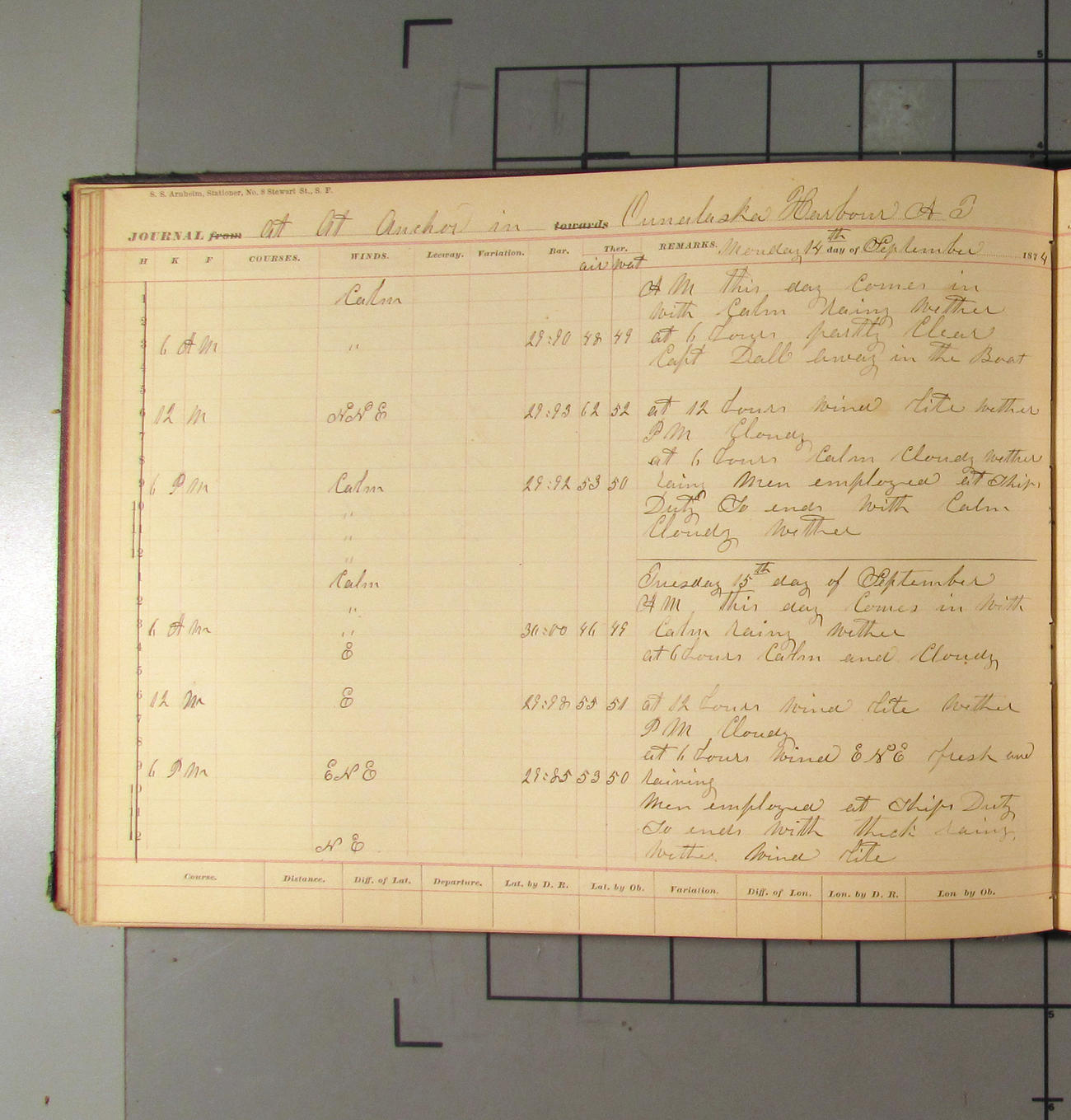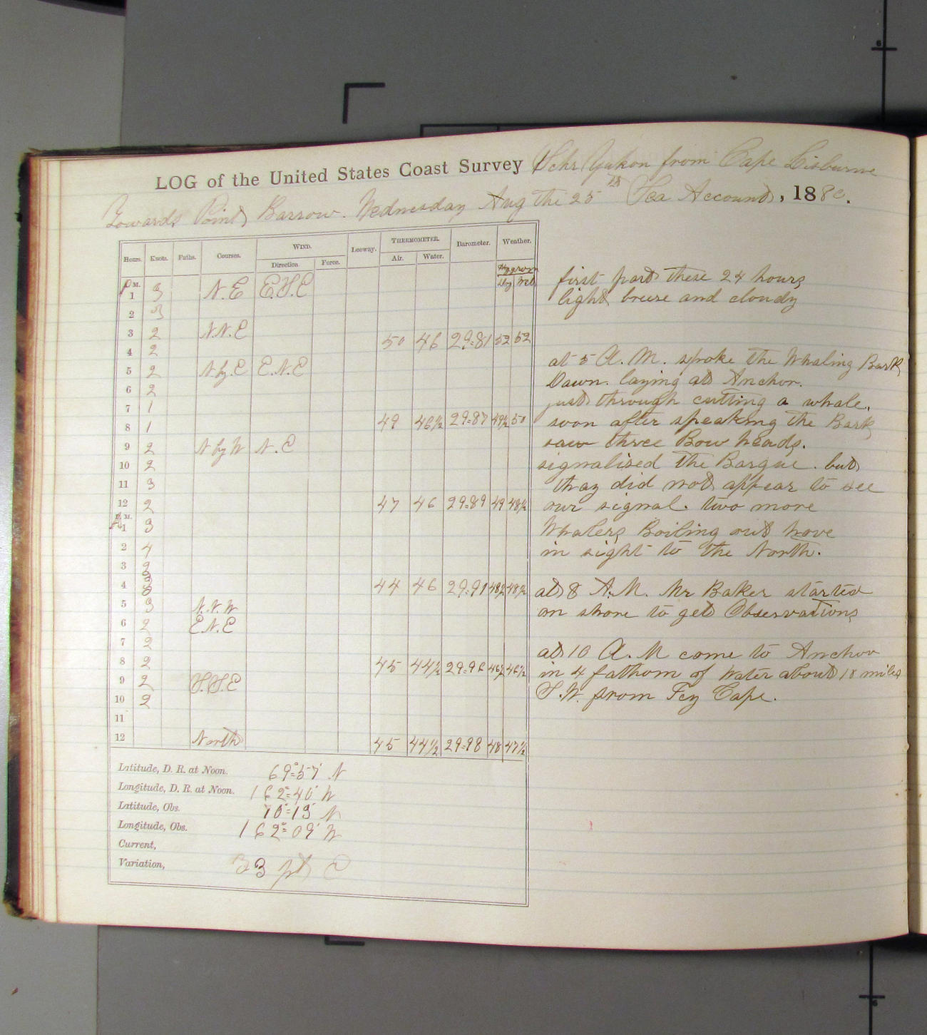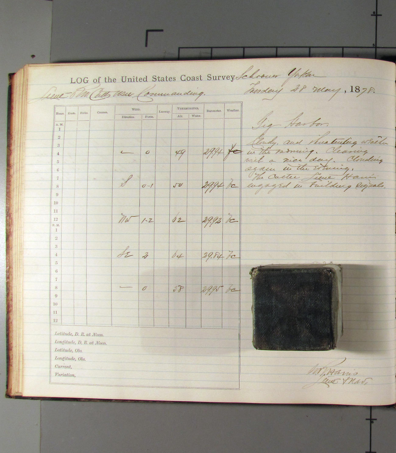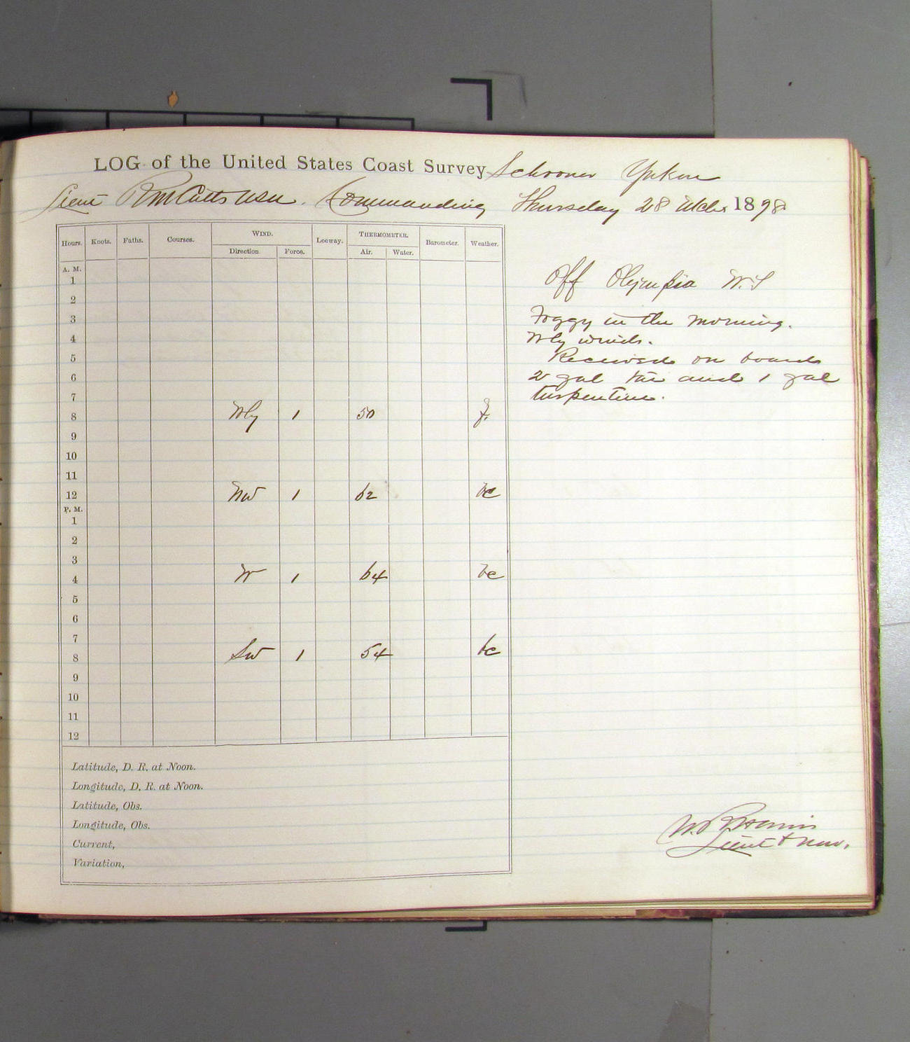 This day commences with light variable airs attended by light rain. Latter part wind fresh NW. Weather clear.