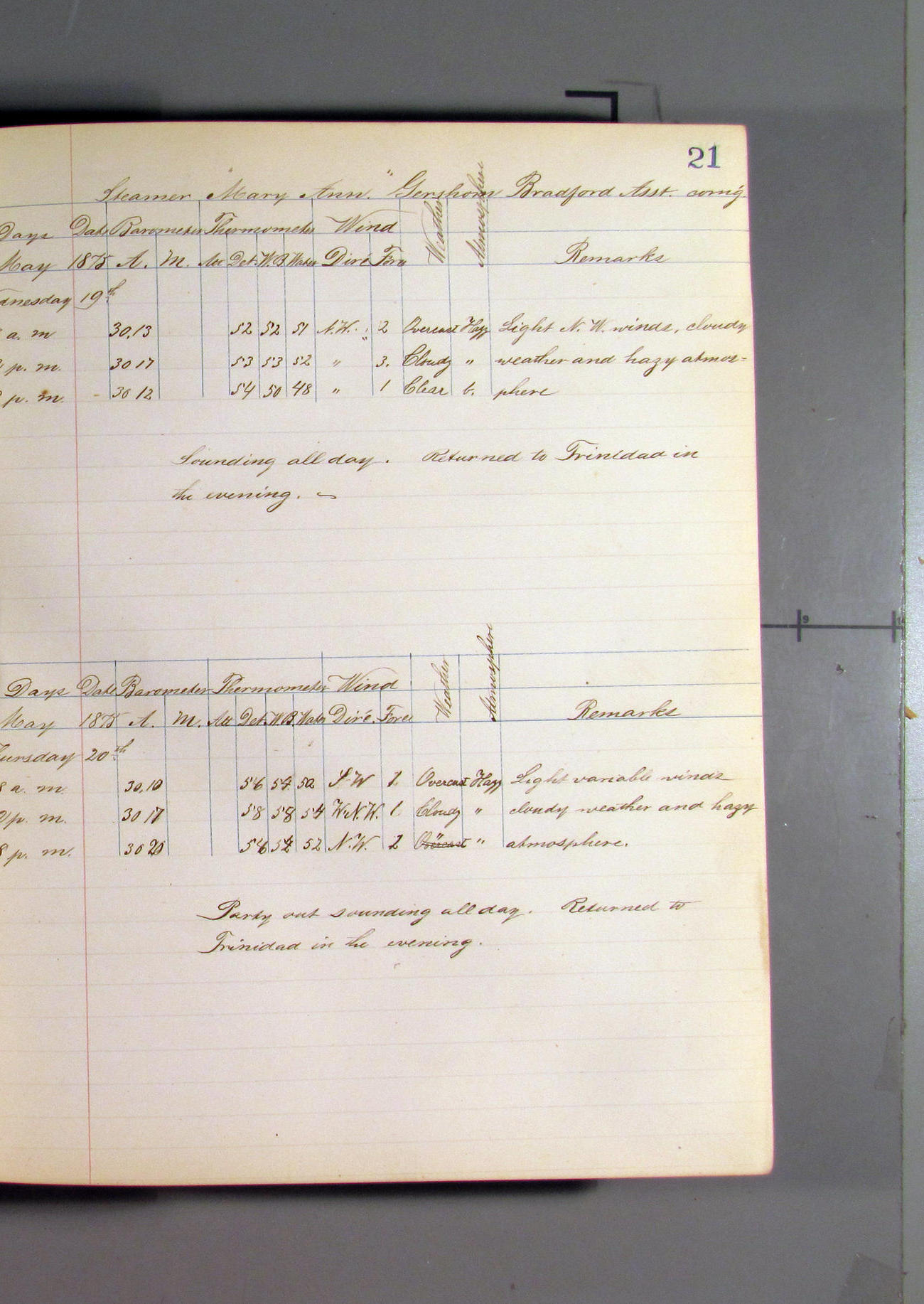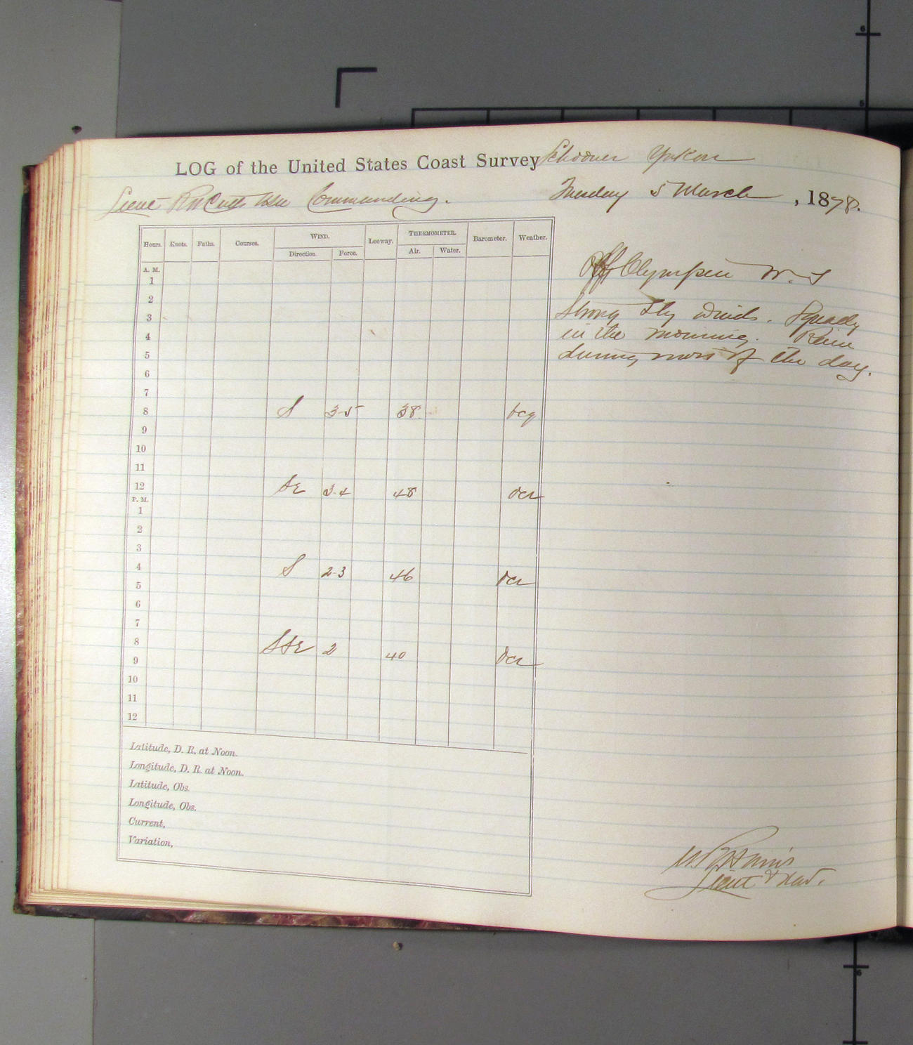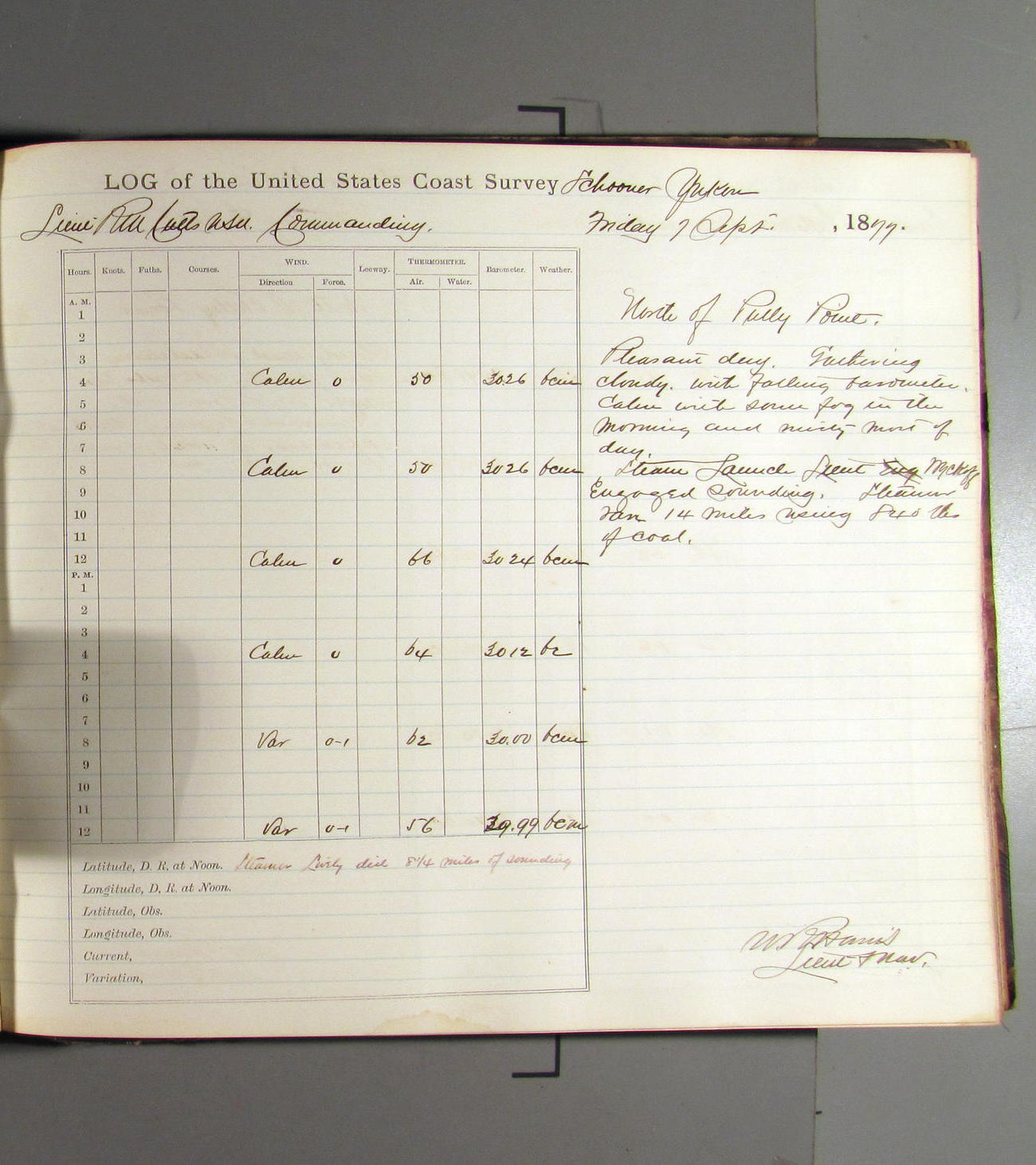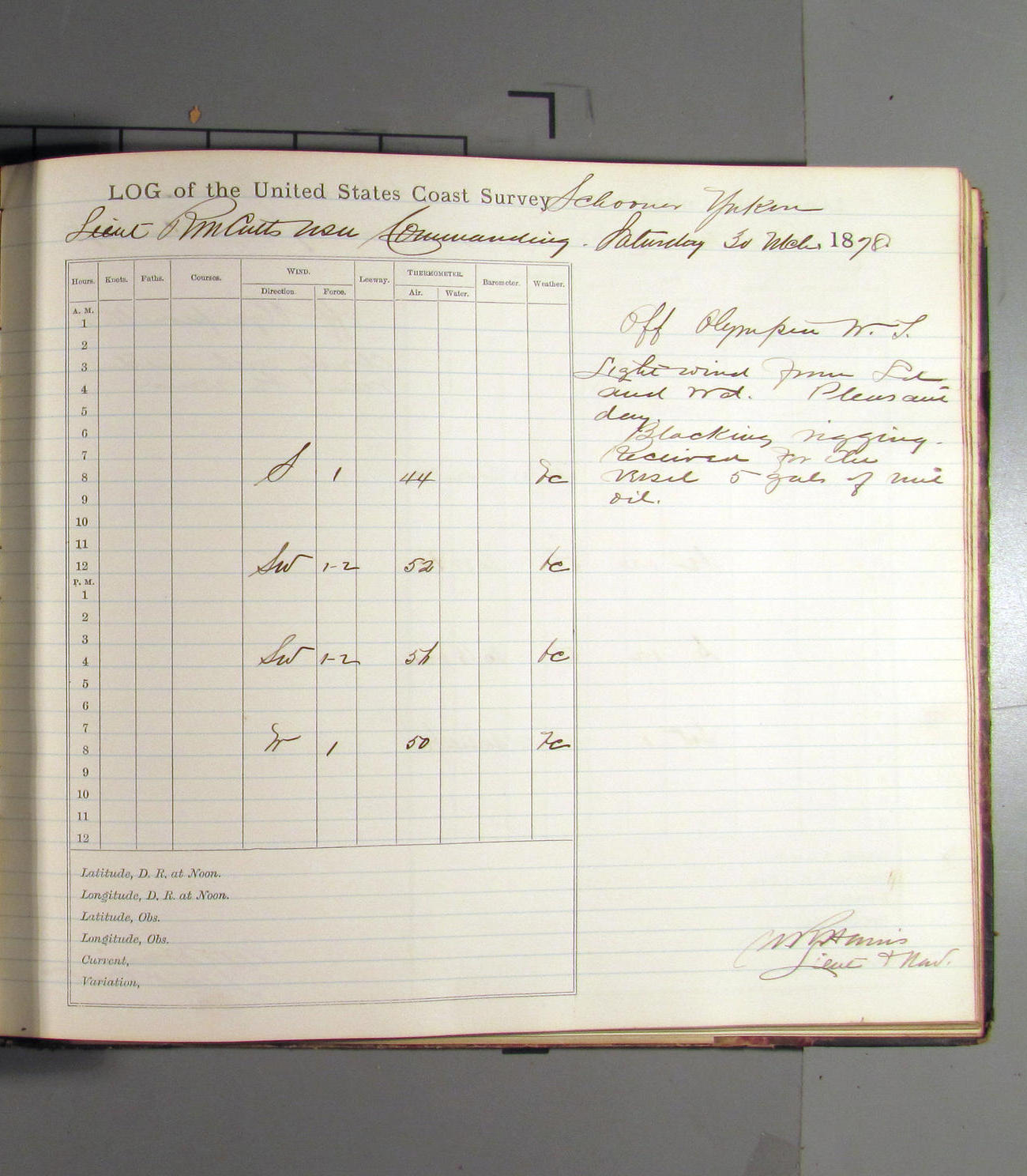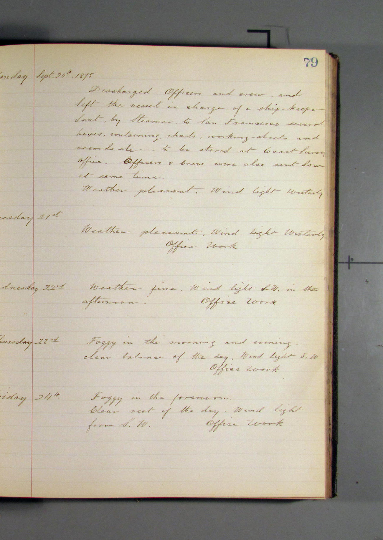 This day commences with light variable airs attended by light rain. Latter part wind fresh NW. Weather clear.