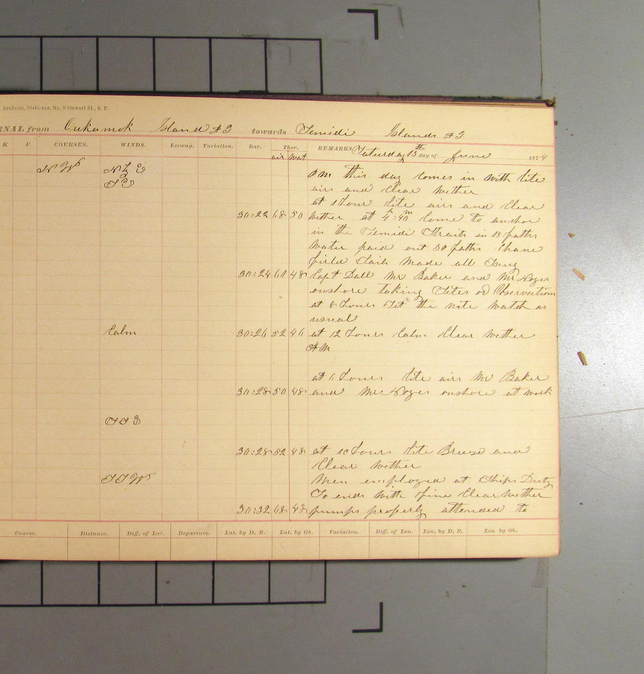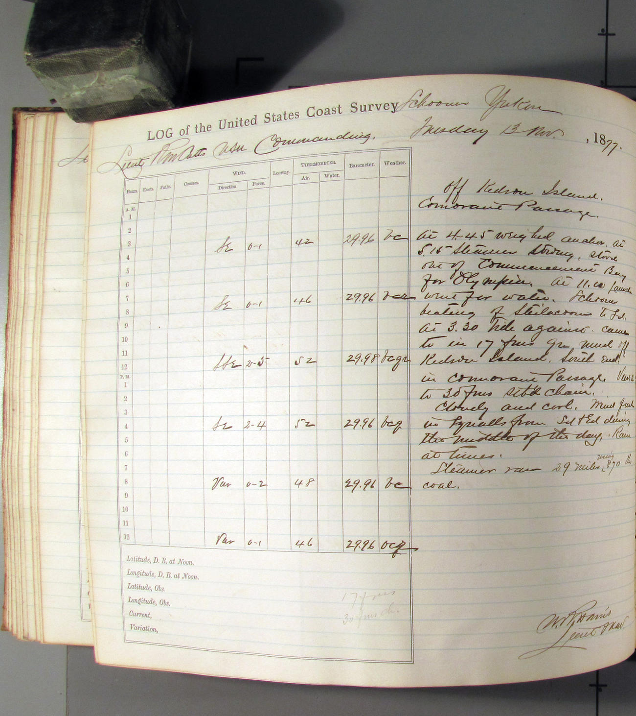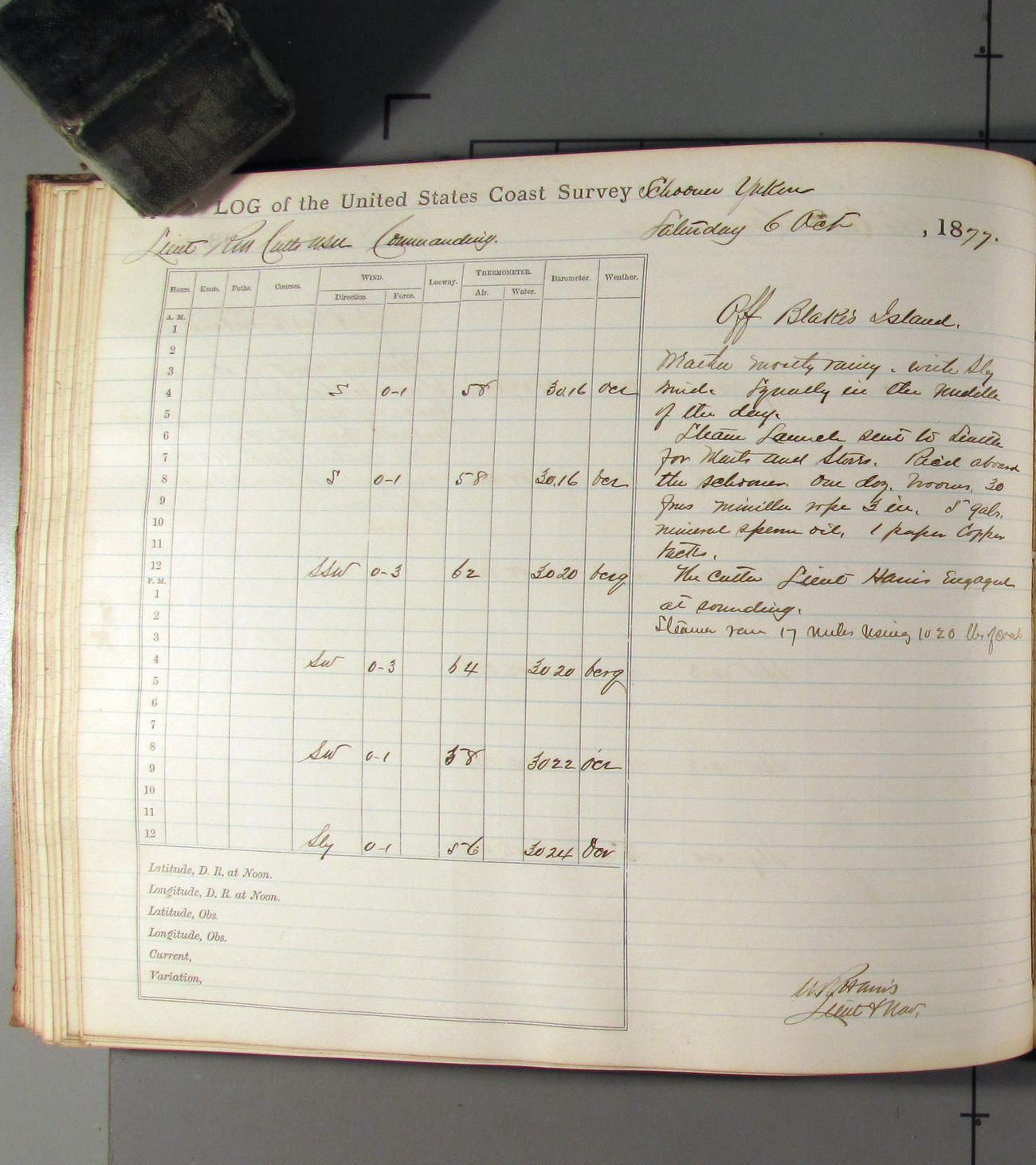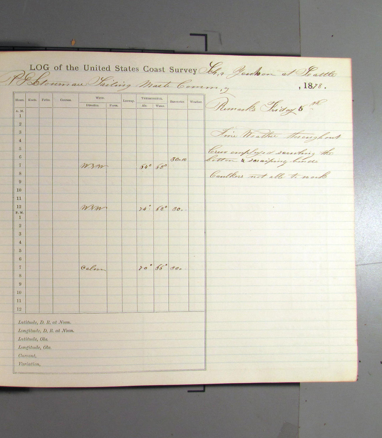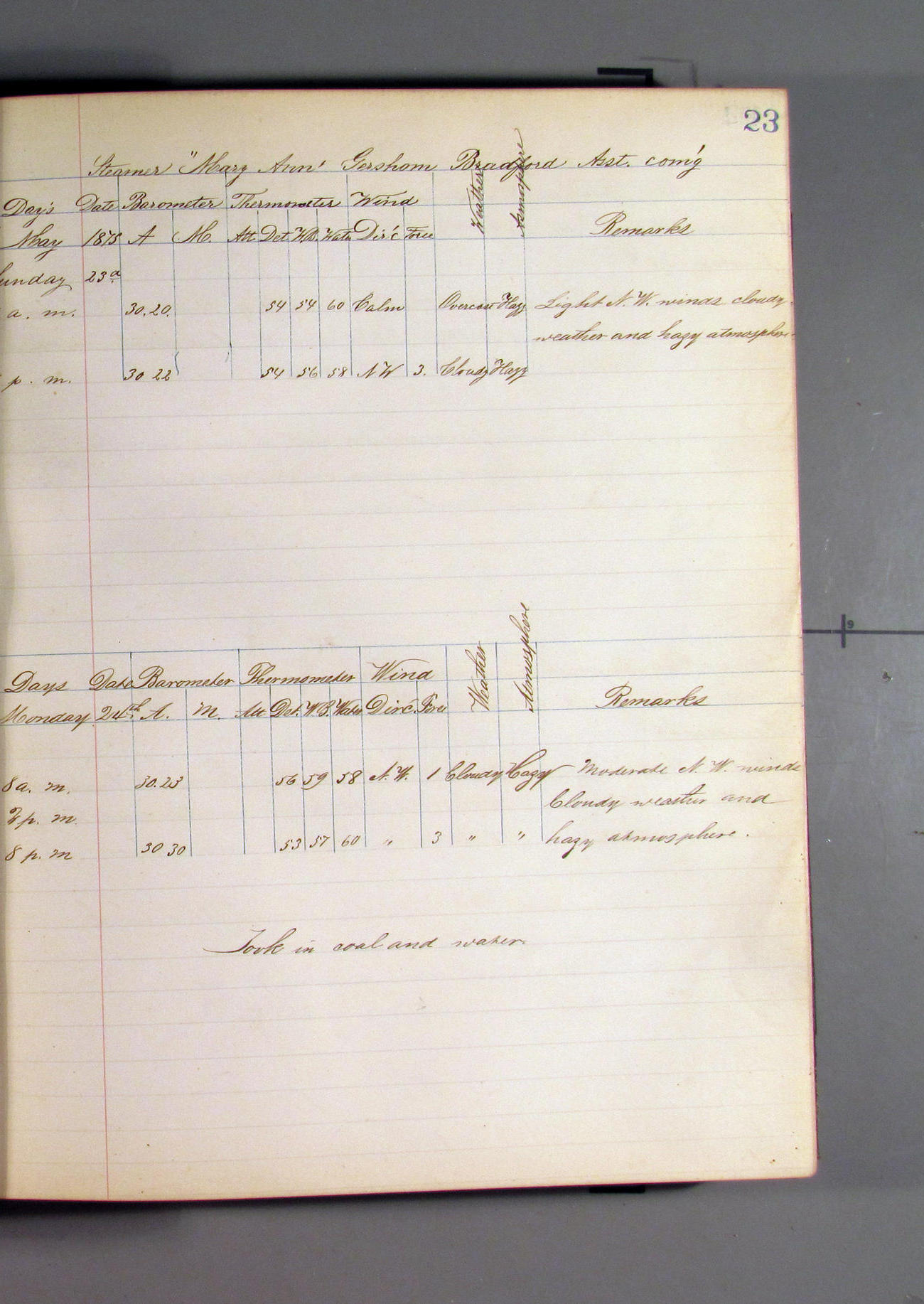 This day commences with light variable airs attended by light rain. Latter part wind fresh NW. Weather clear.