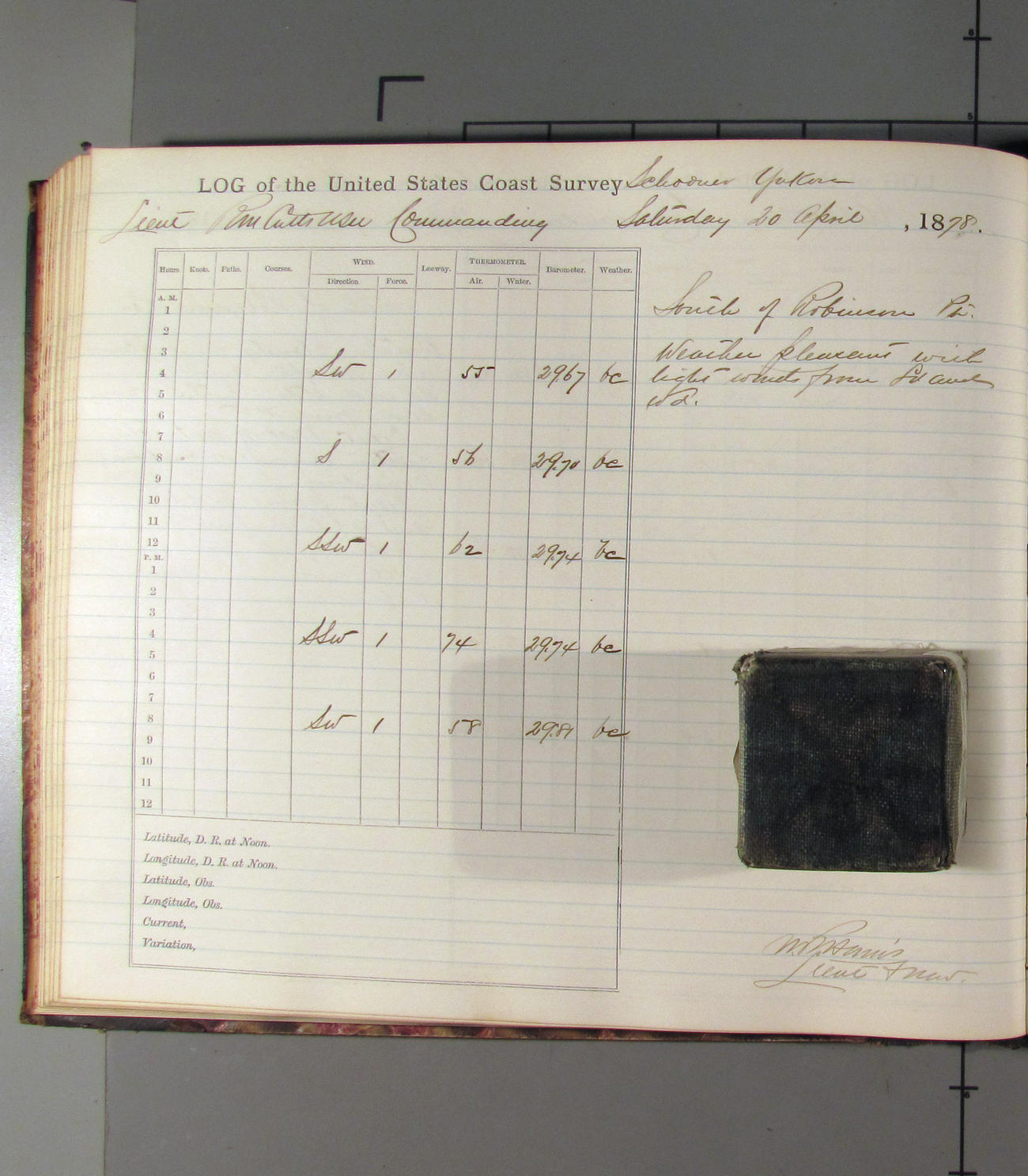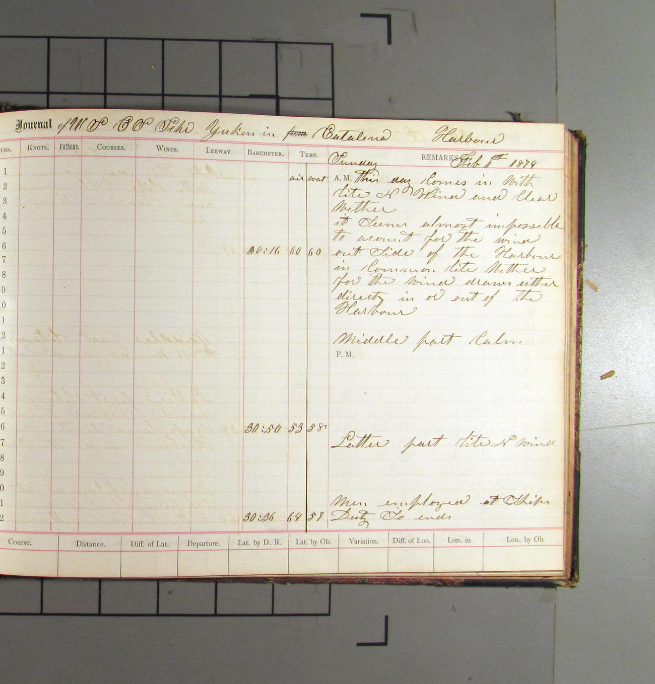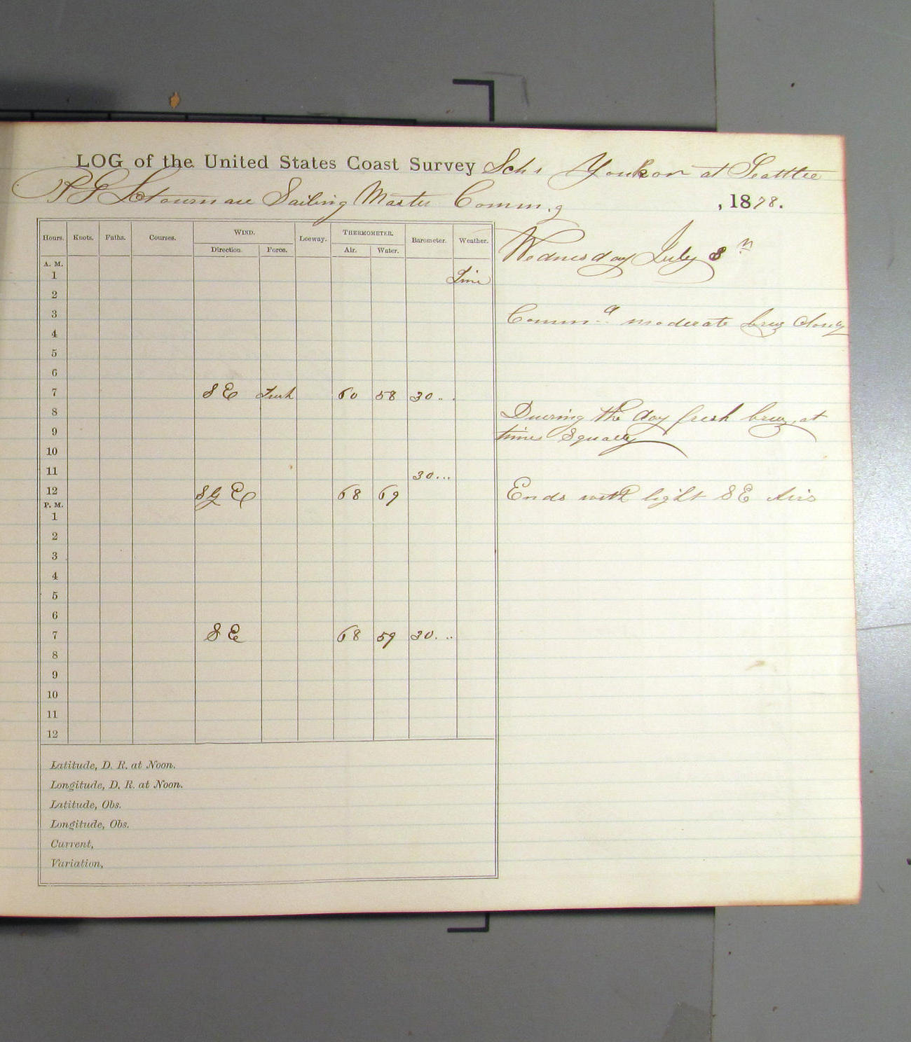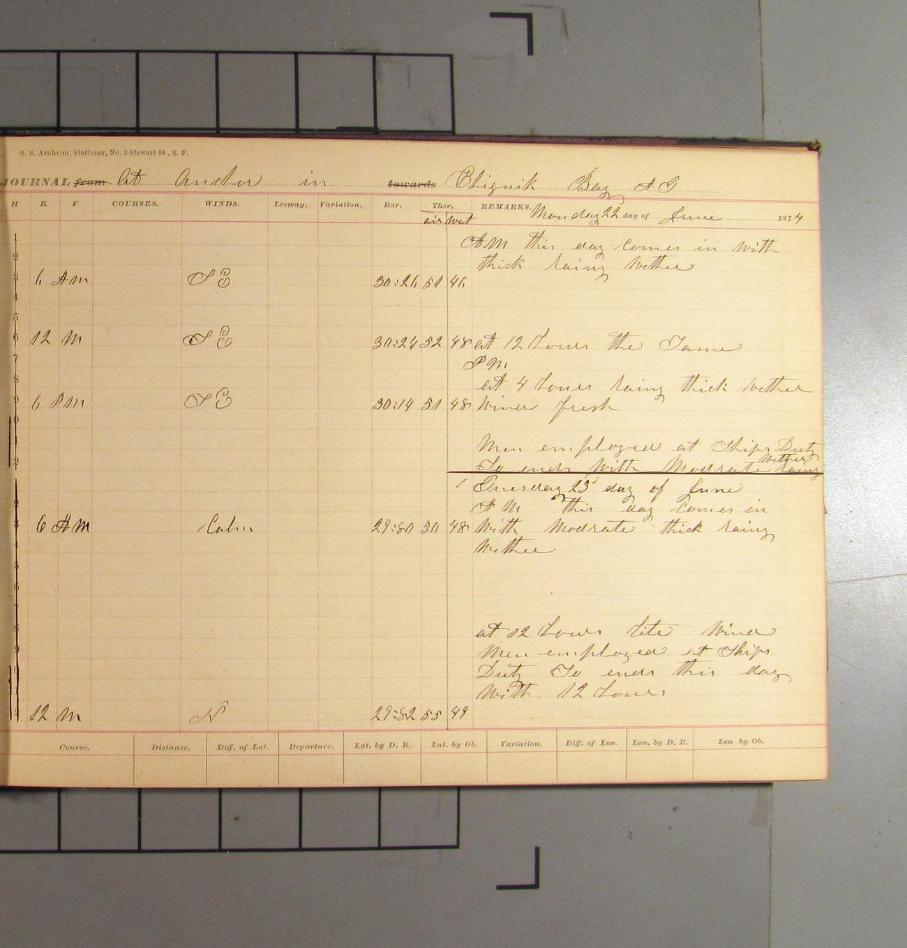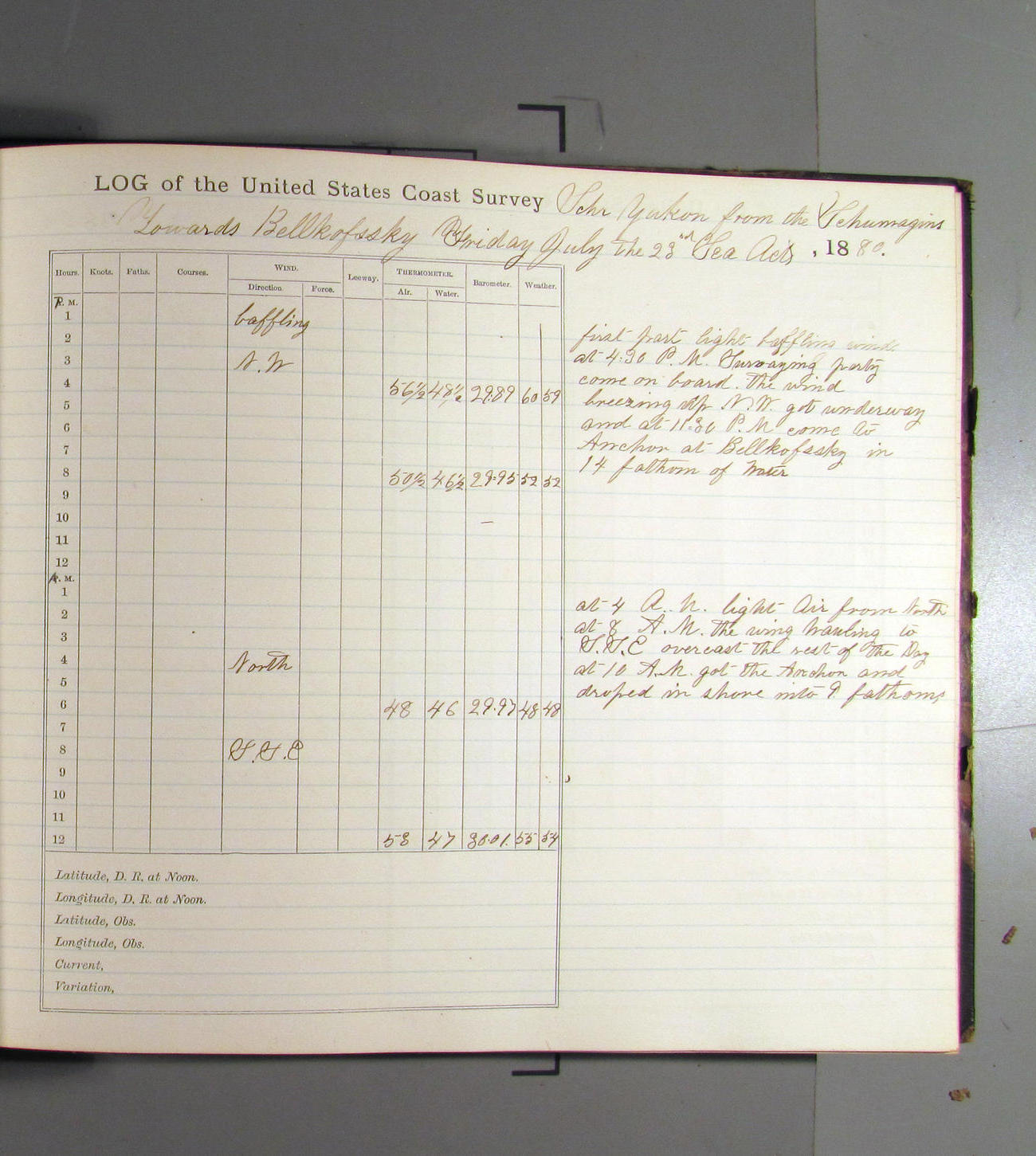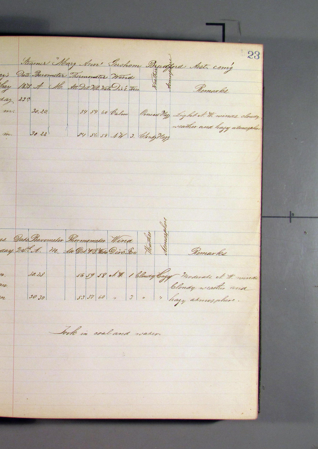 This day commences with light variable airs attended by light rain. Latter part wind fresh NW. Weather clear.