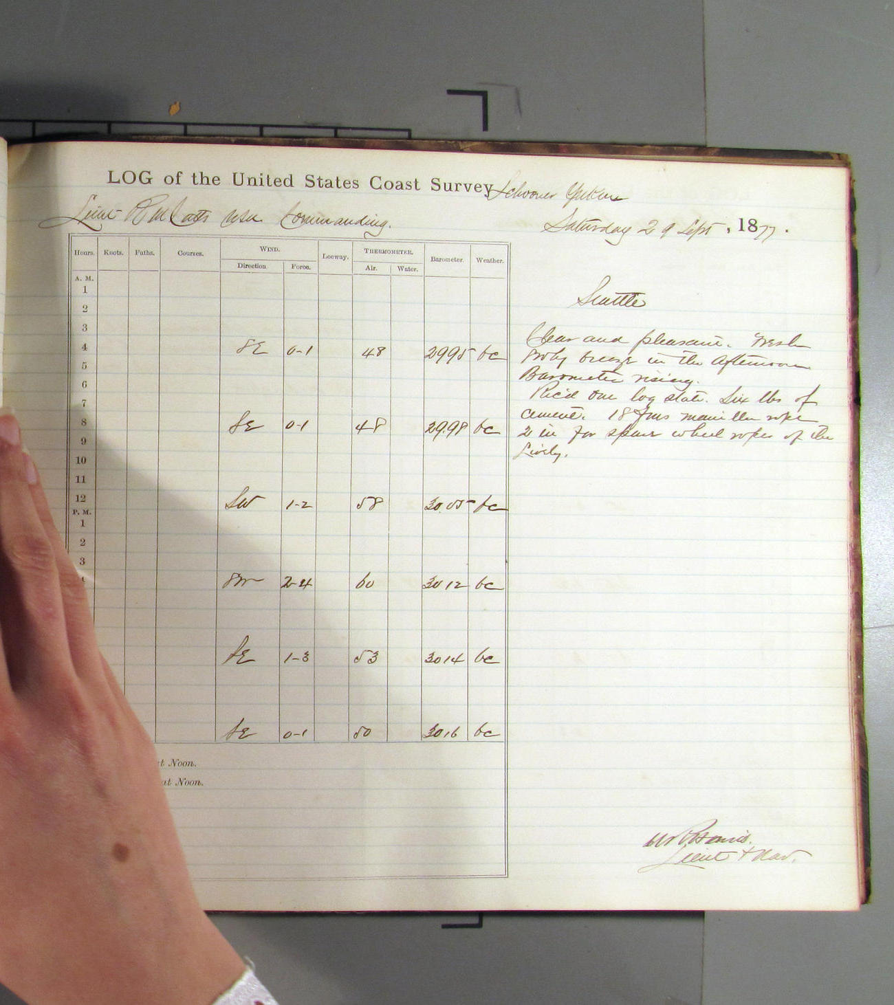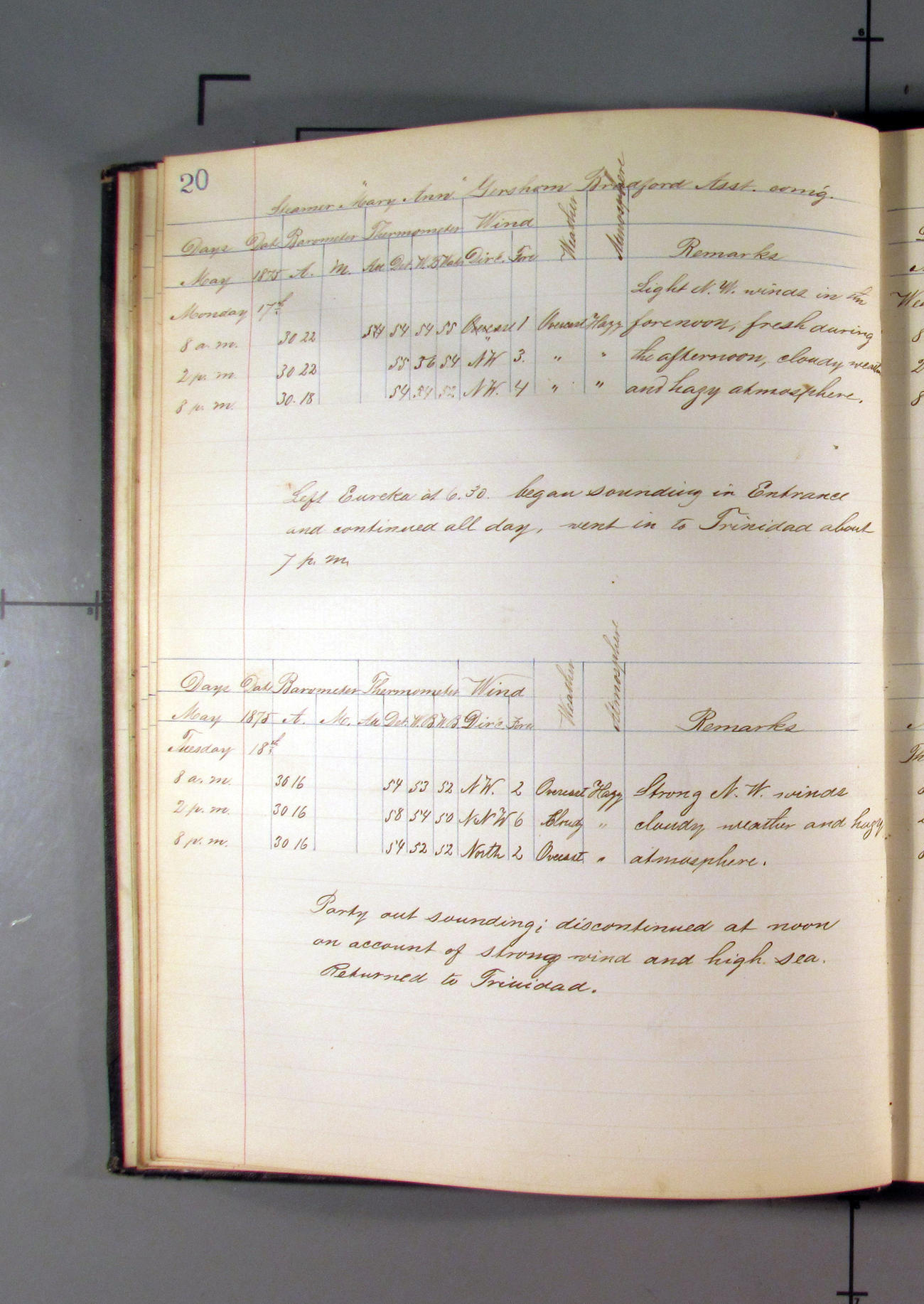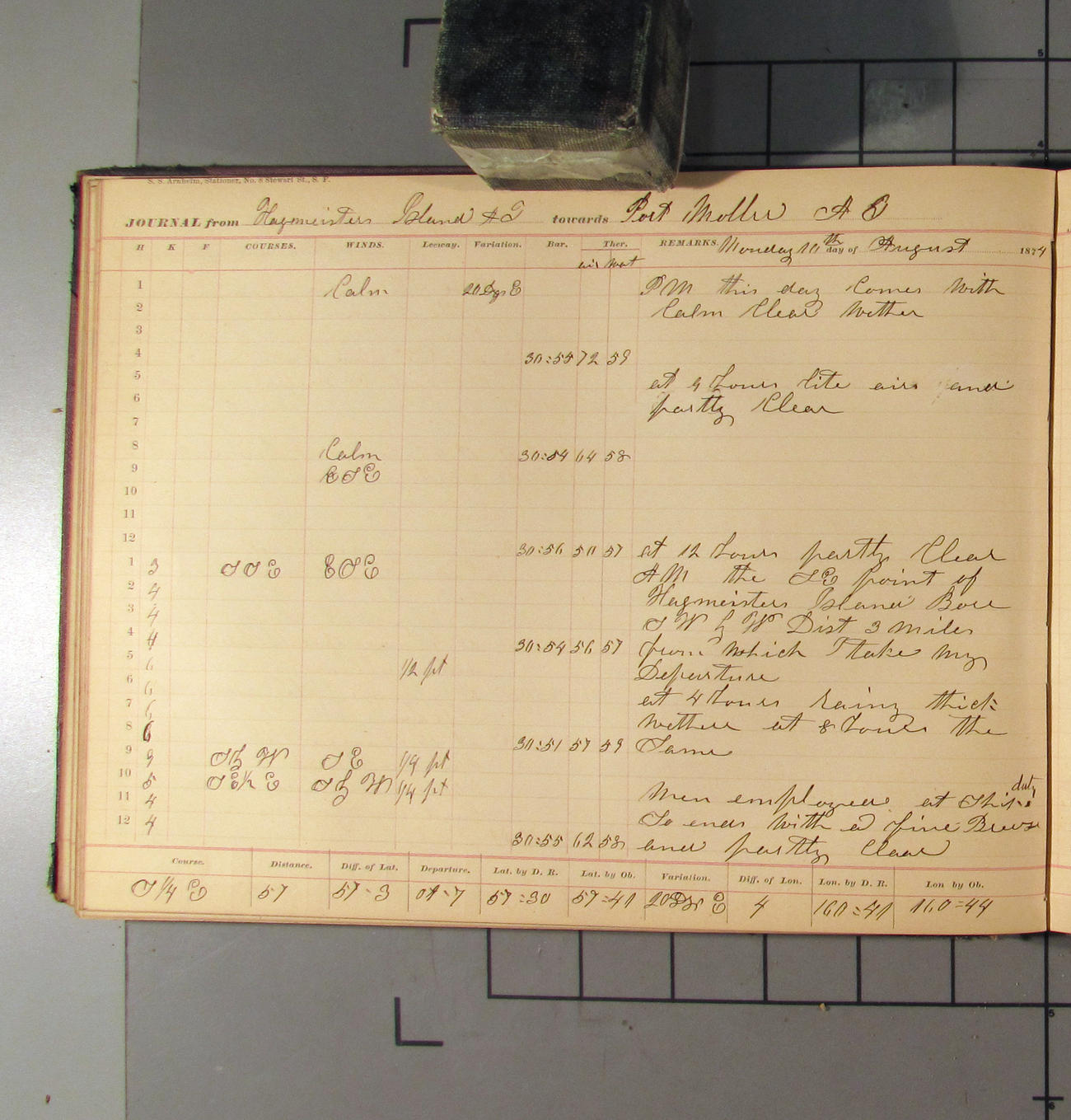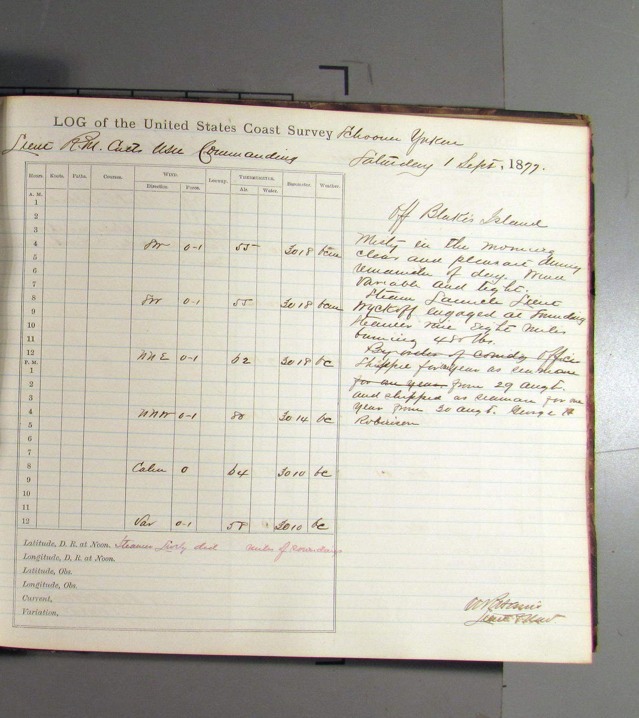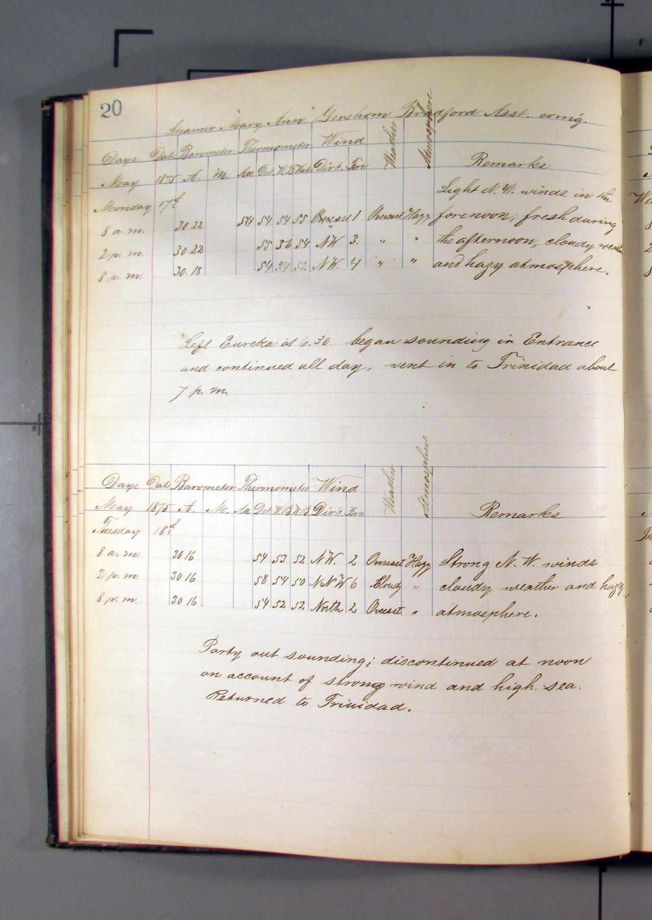 This day commences with light variable airs attended by light rain. Latter part wind fresh NW. Weather clear.