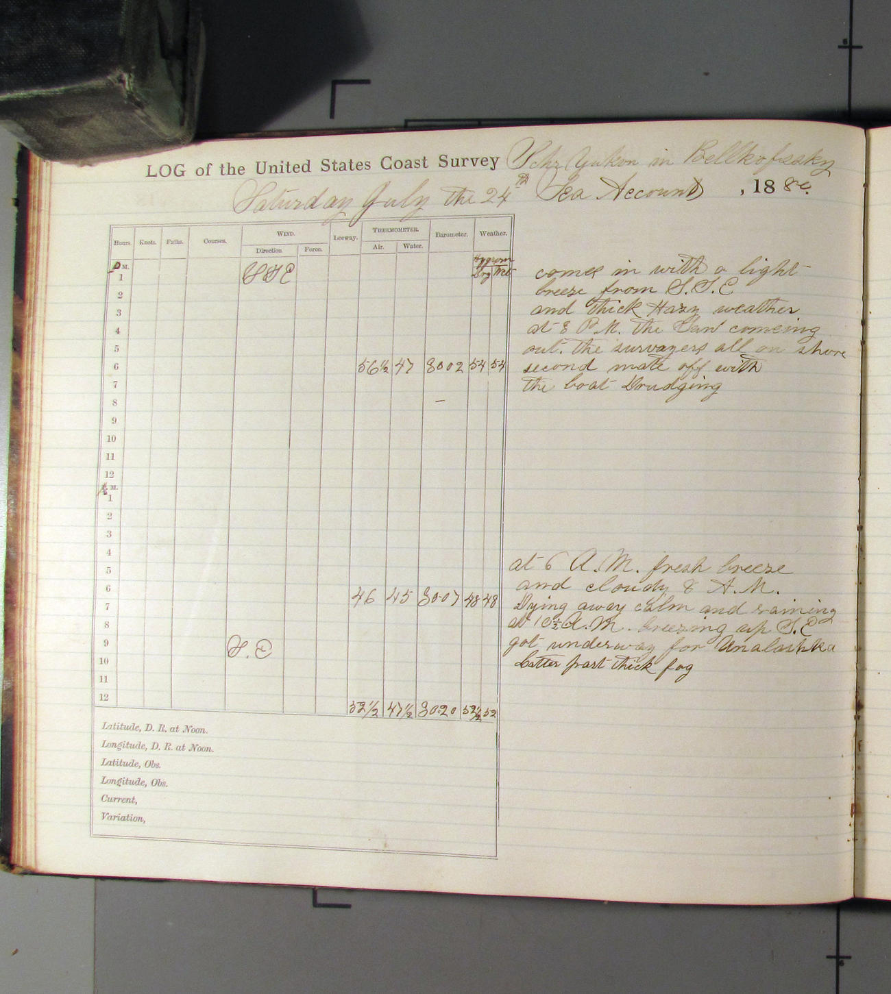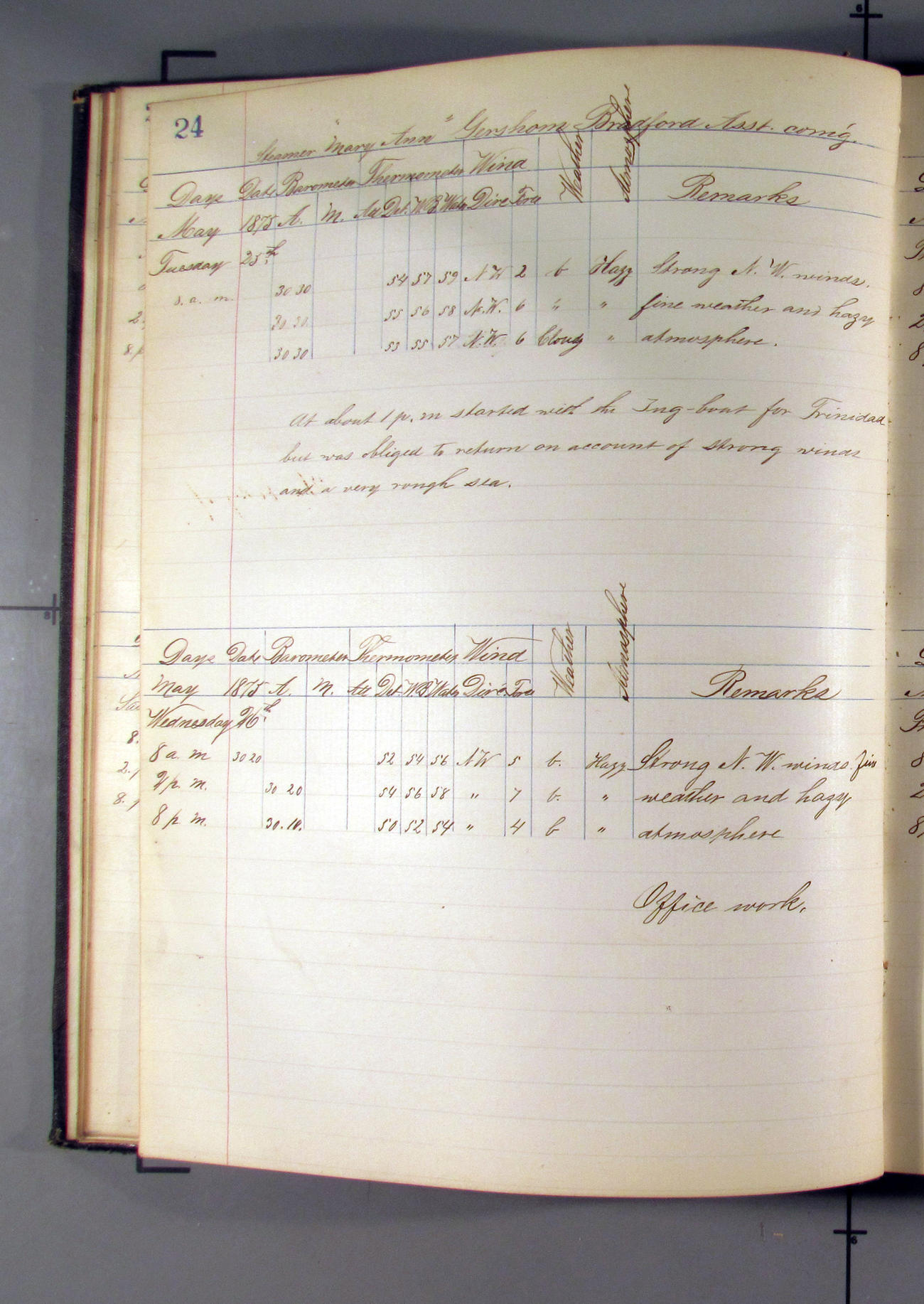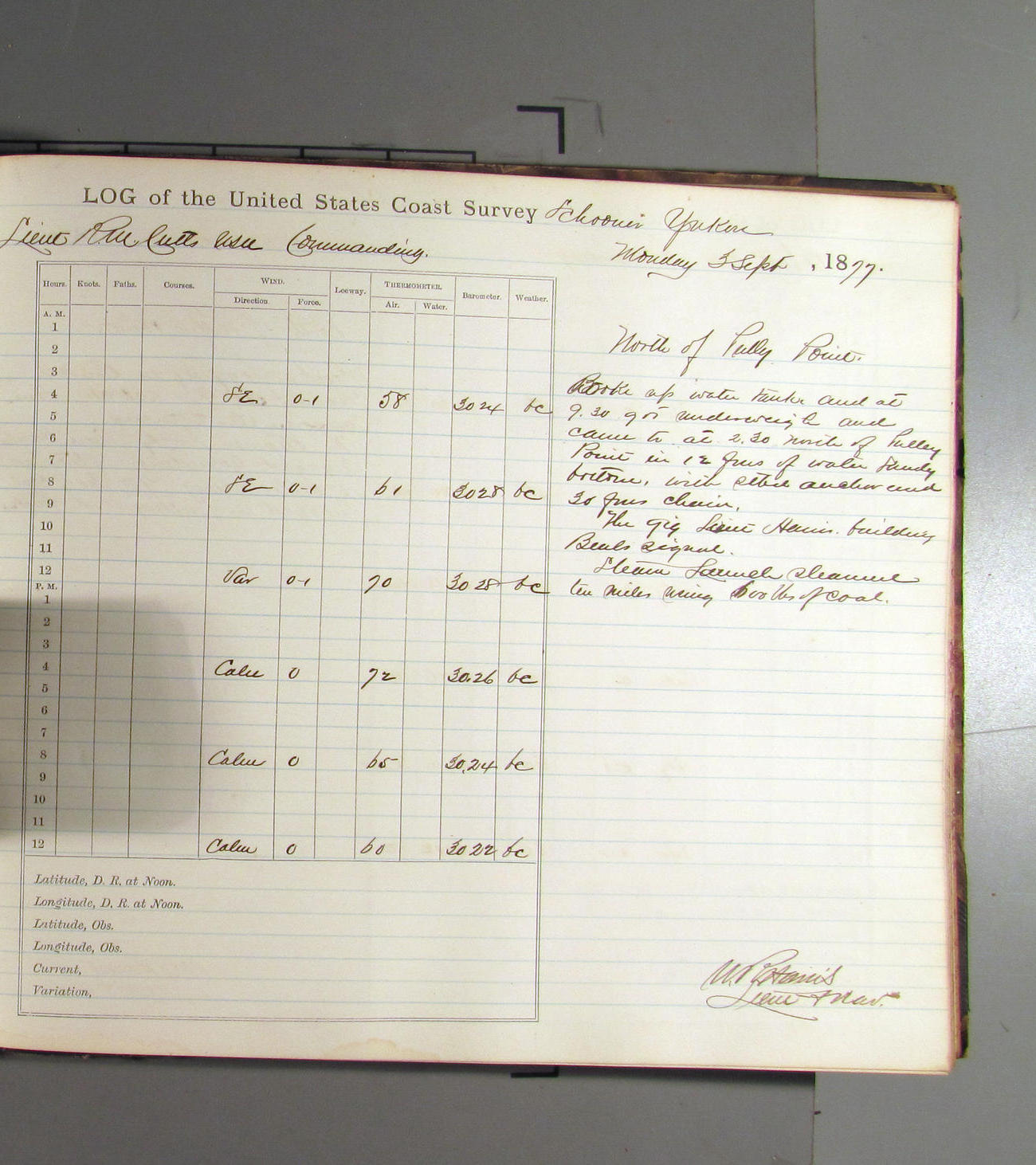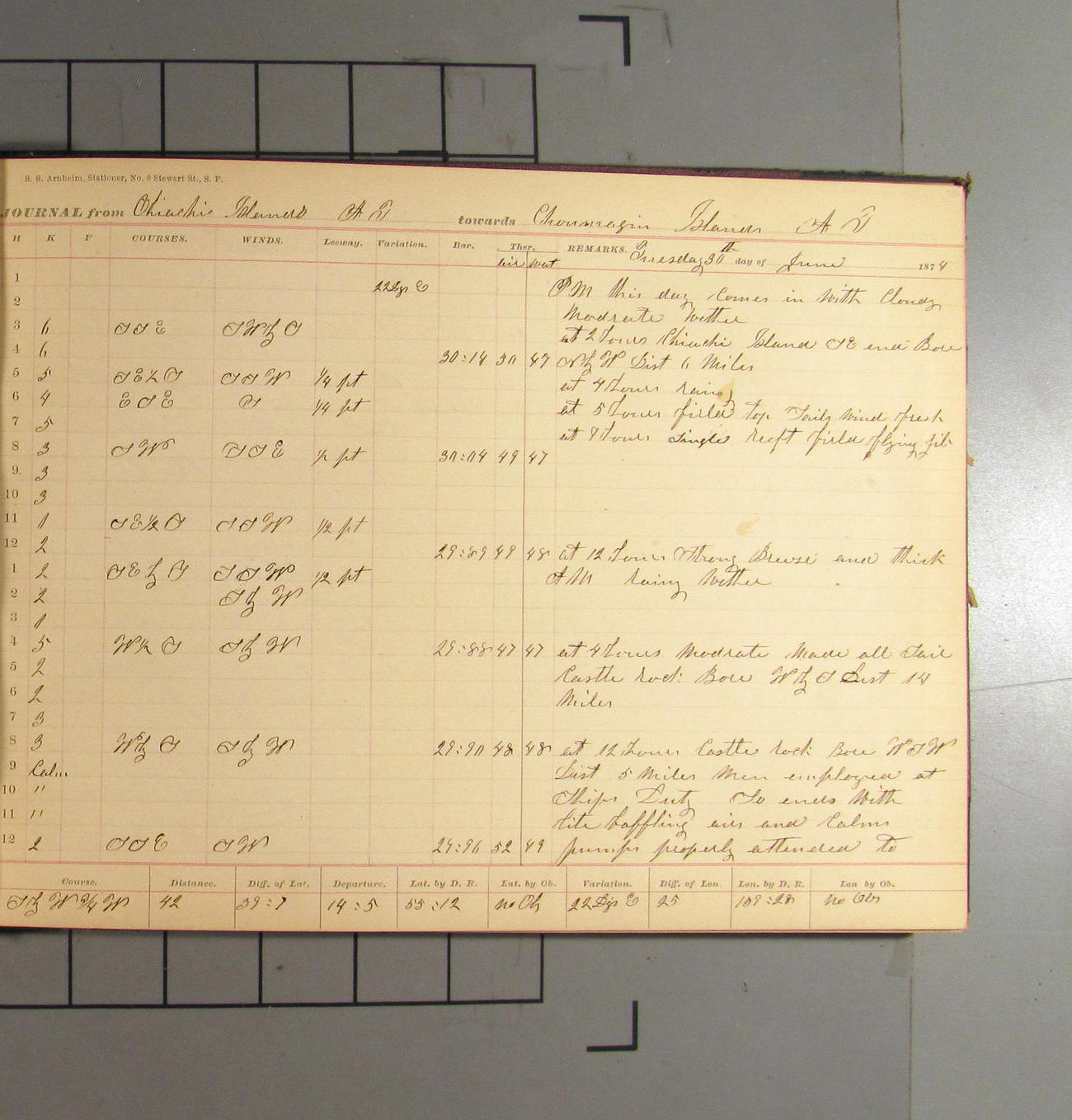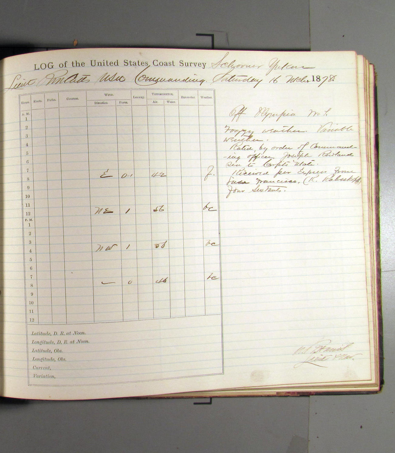 This day commences with light variable airs attended by light rain. Latter part wind fresh NW. Weather clear.