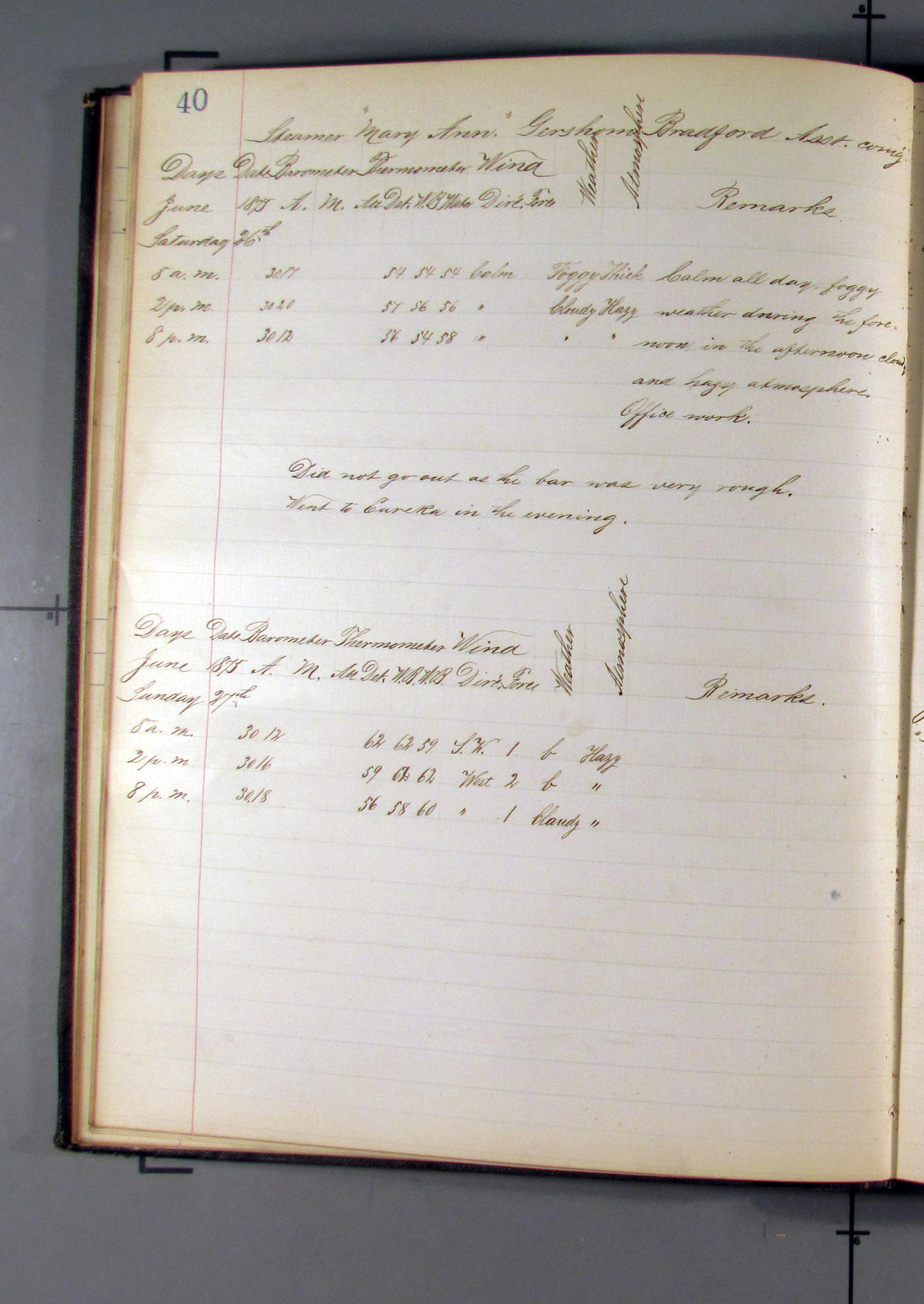 Crossed bar at 5.40pm and came to anchor in 3½ fathoms water in little bay between north and south bluffs.