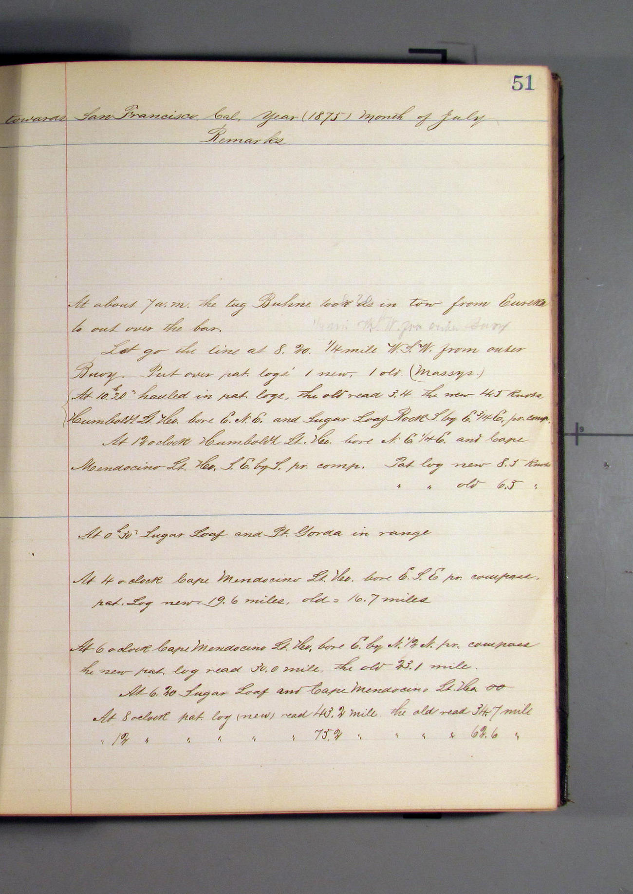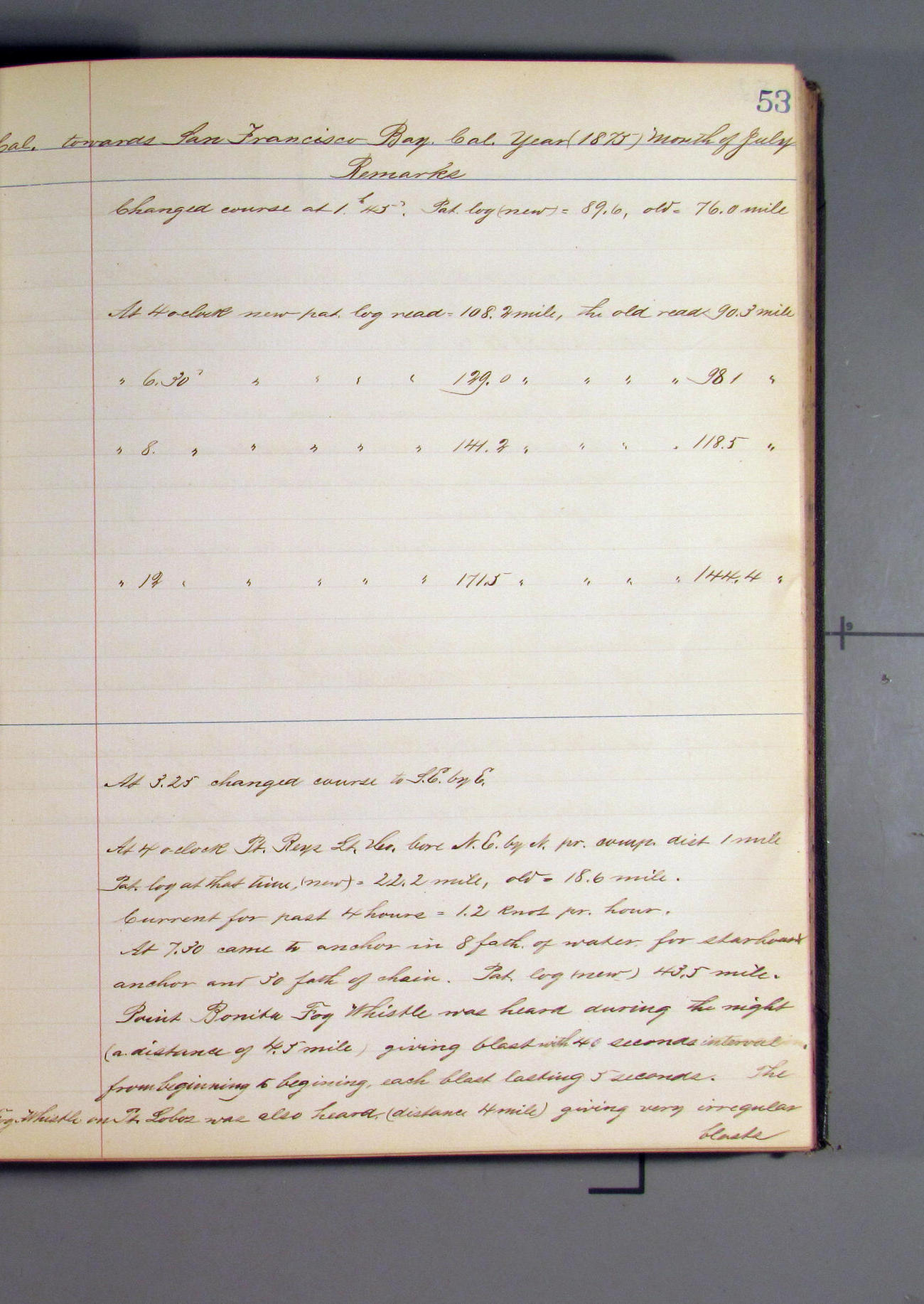 At 7.00pm Point Reyes Light bearing E½S, distant 9 miles.