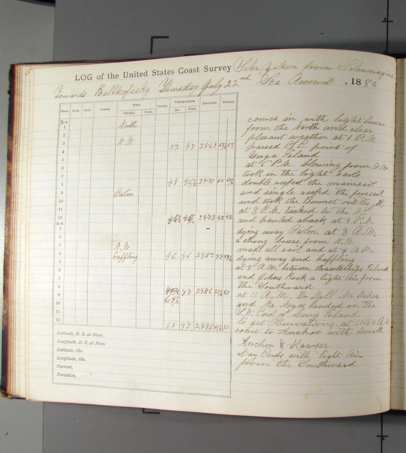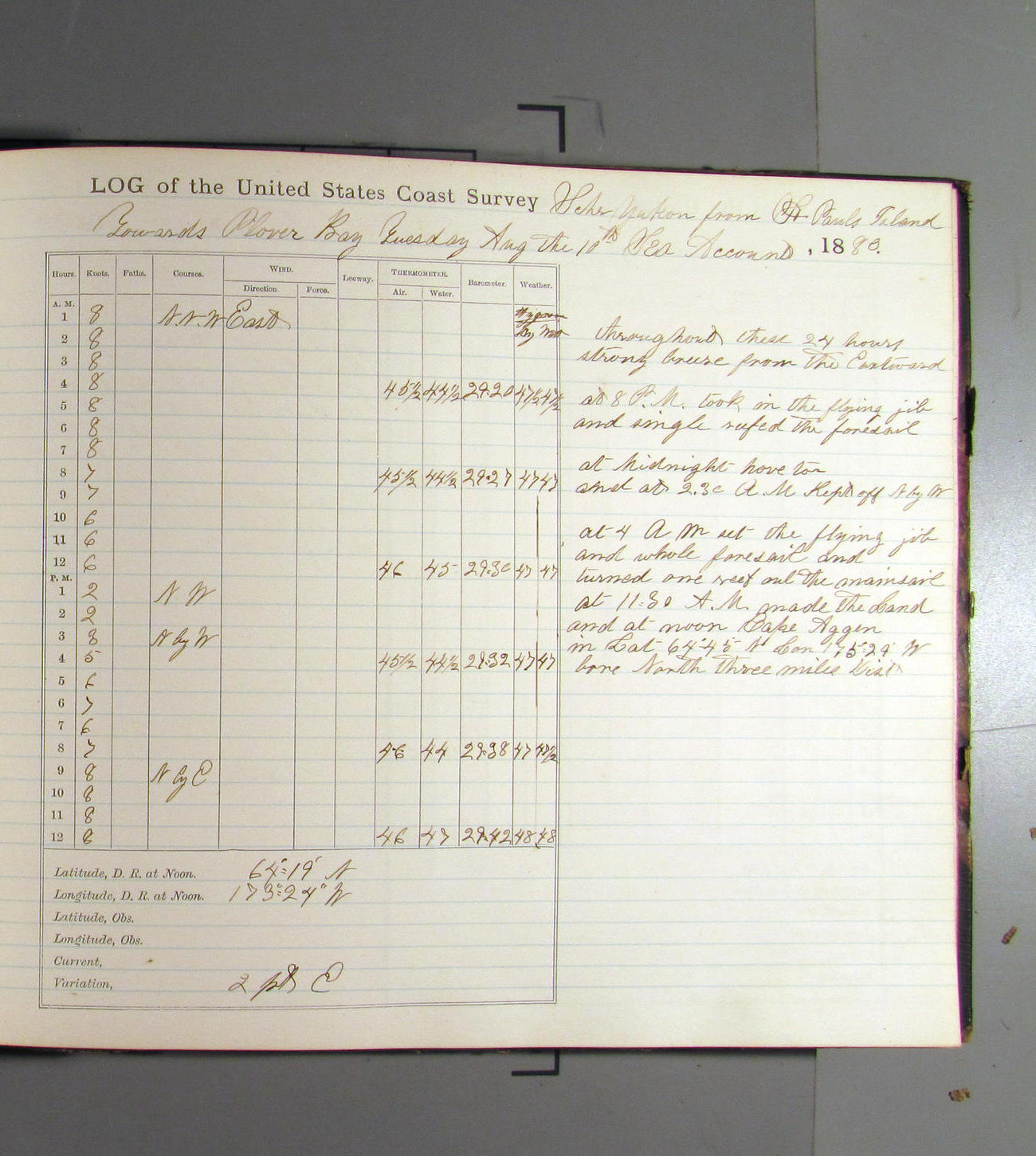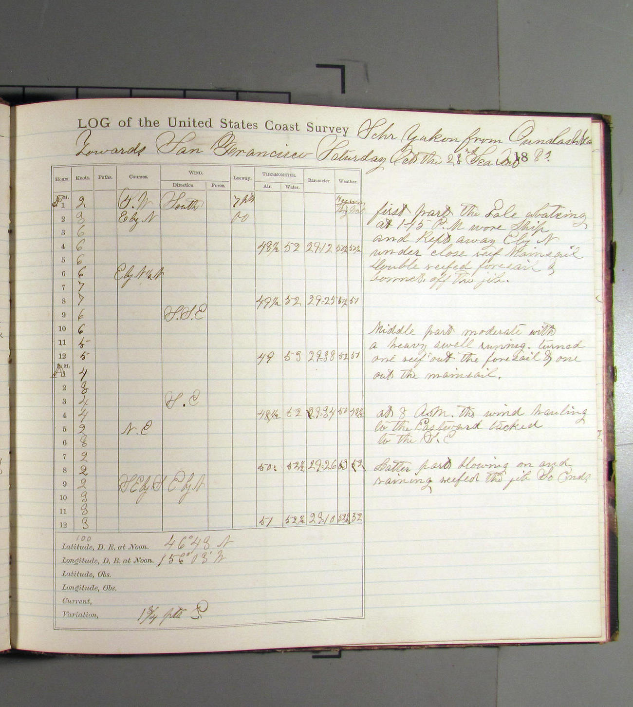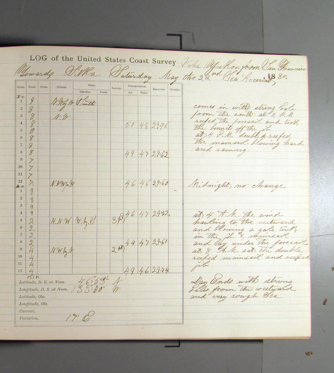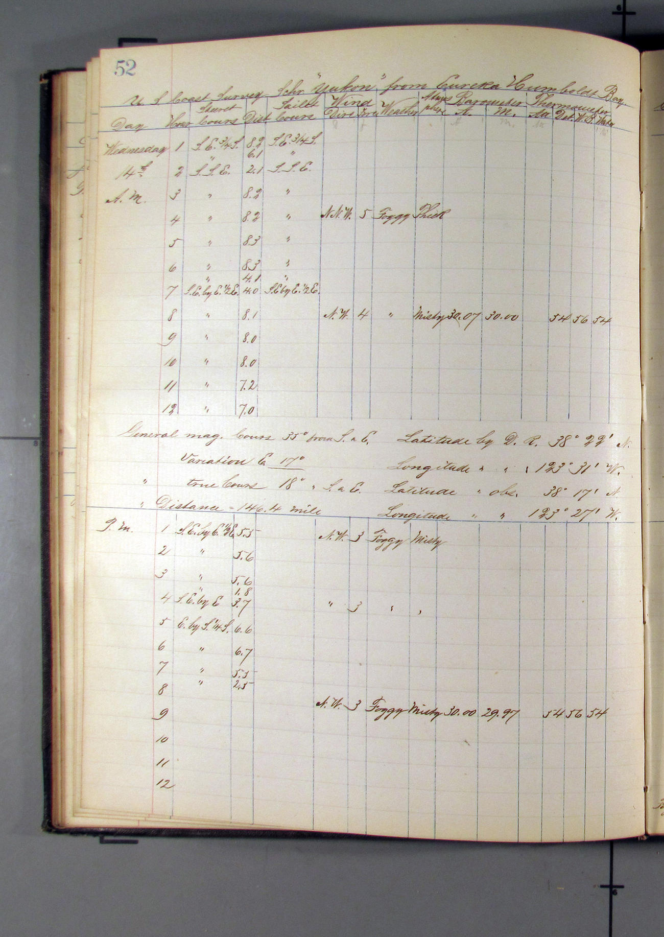 At 7.00pm Cape Arago Light bearing NEbyN½N, distant 14 miles about.