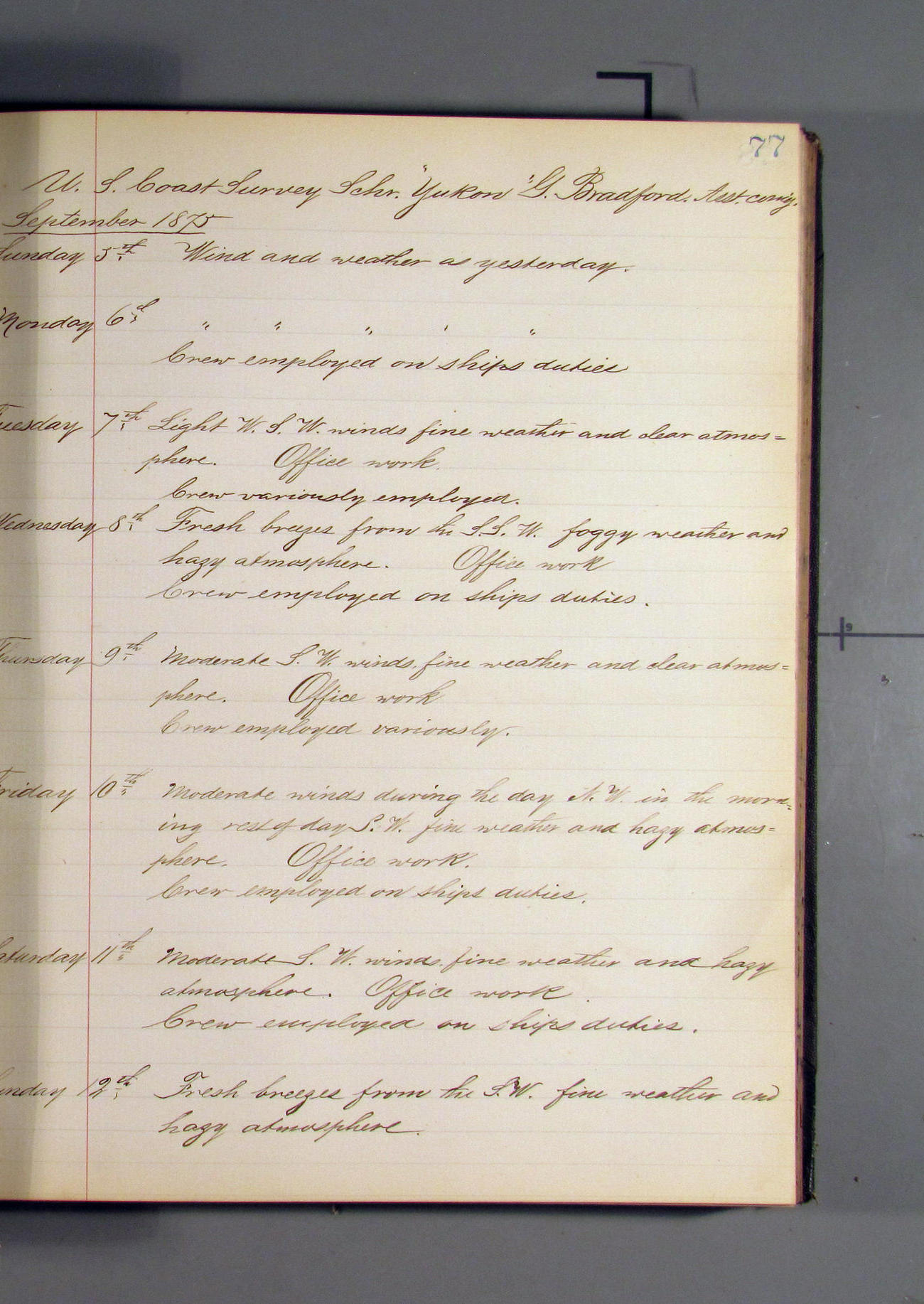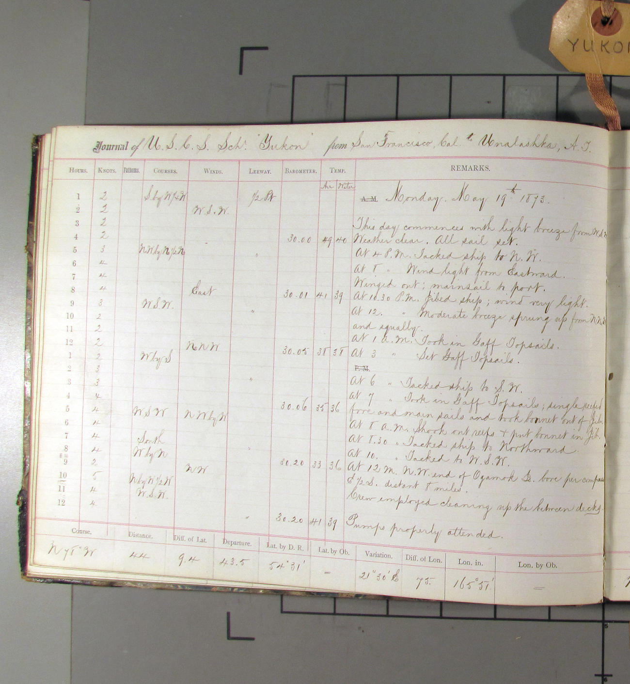 At 1.00am wind WSW. Weather clear. Tacked ship to NW and set fore gaff topsail.