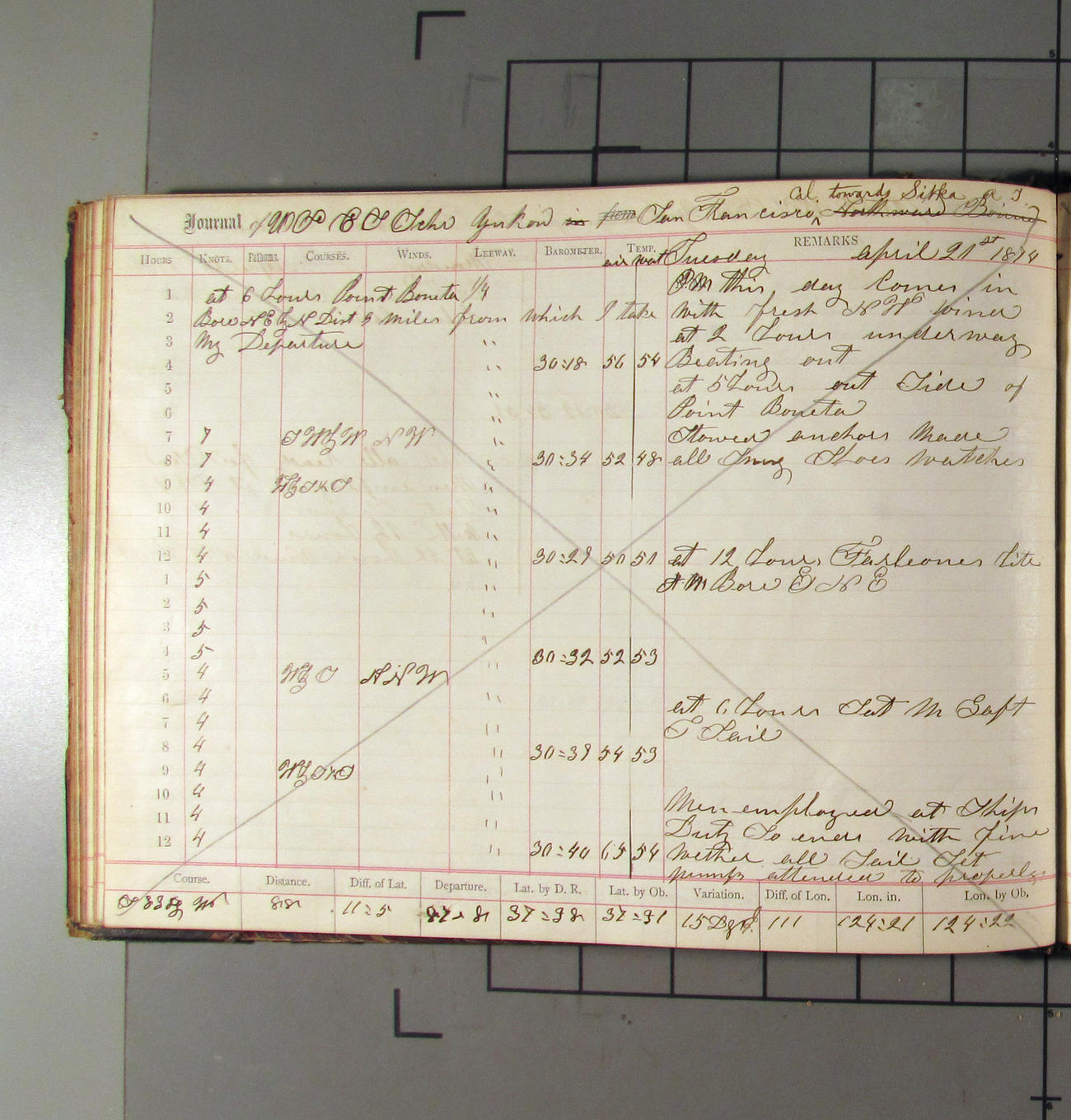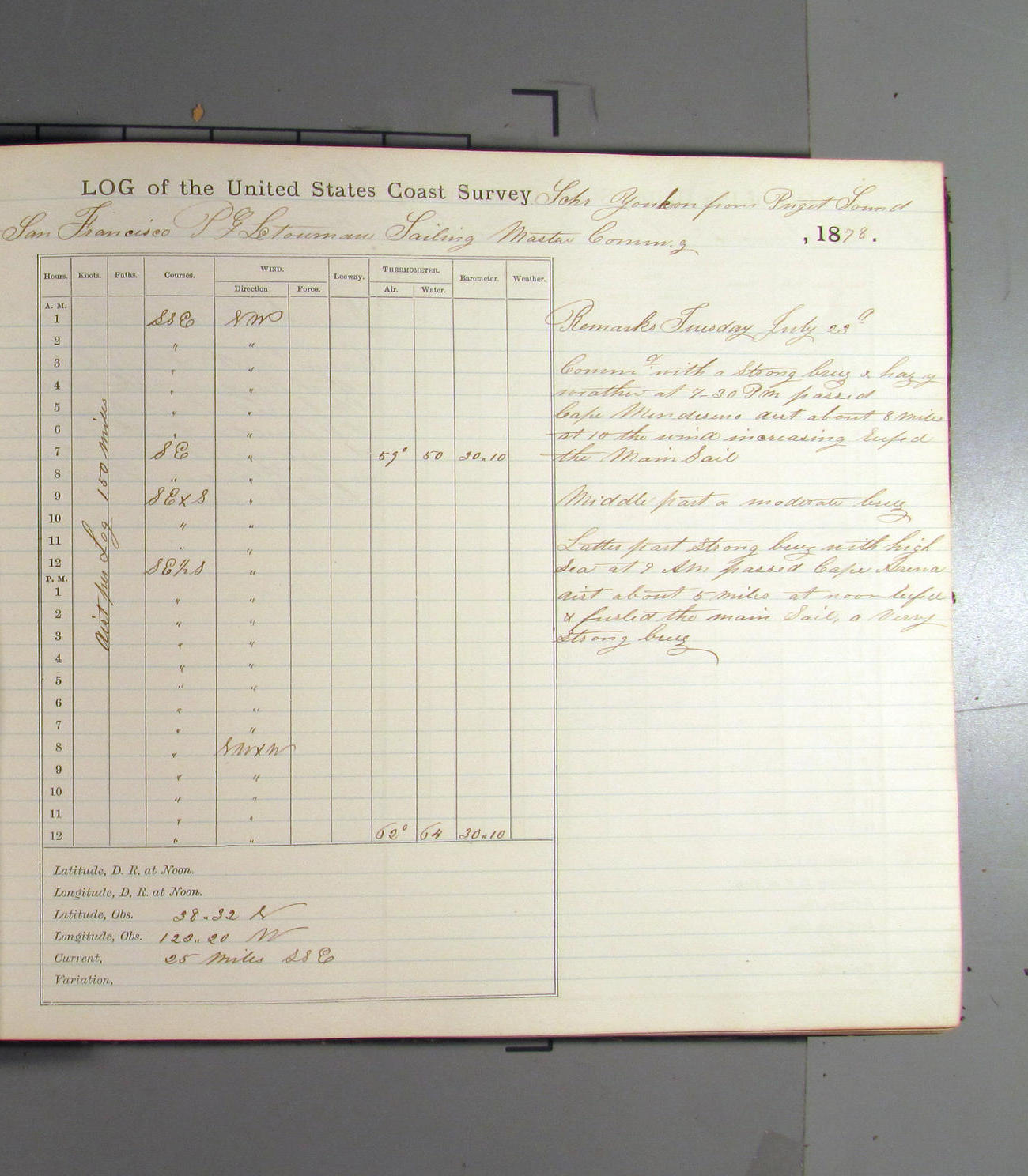 At 10.00pm Cape Blanco Light bearing E, distant 20 miles. Changed course.