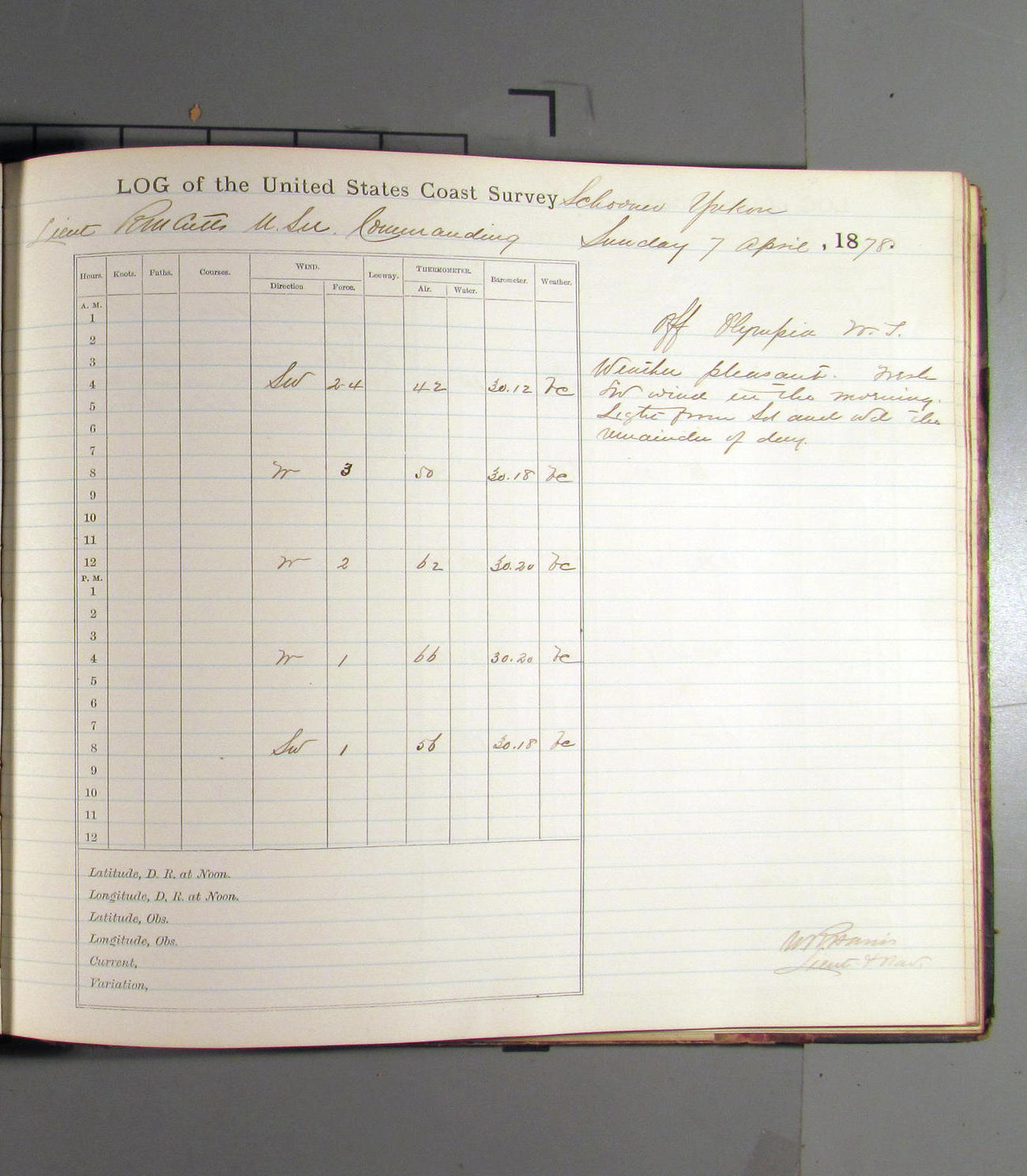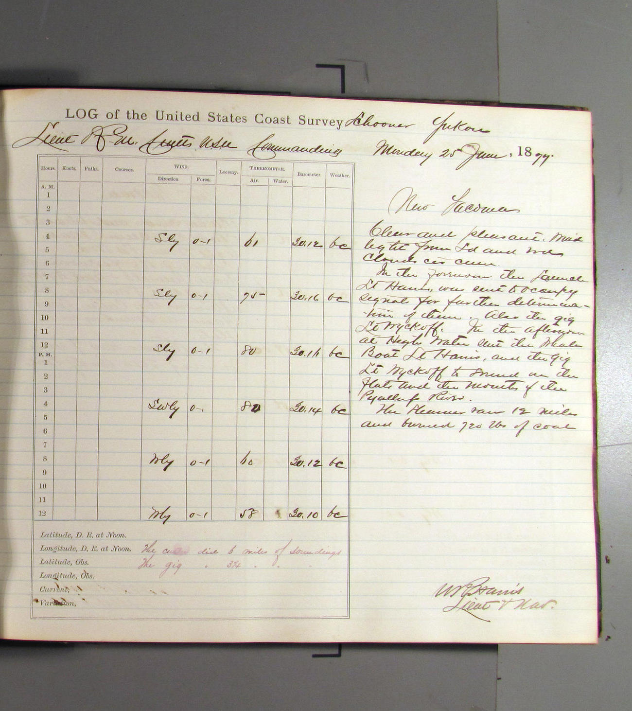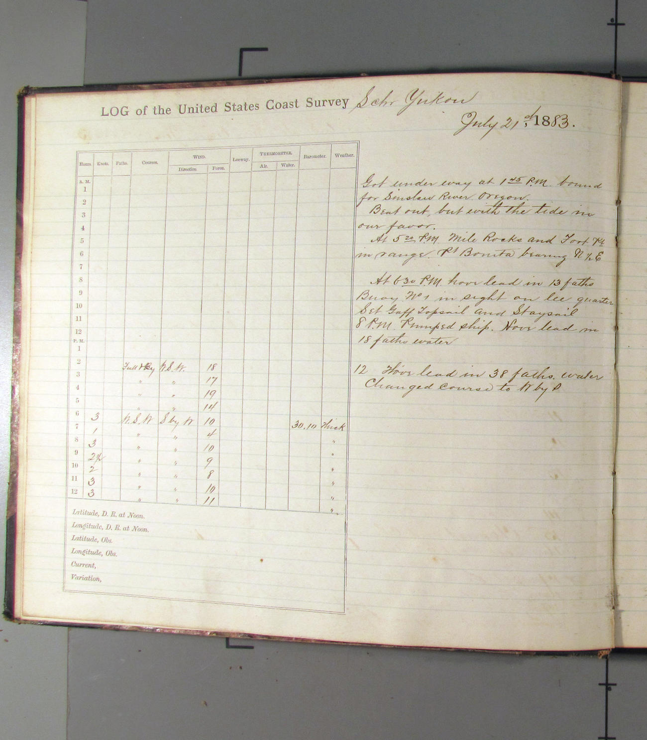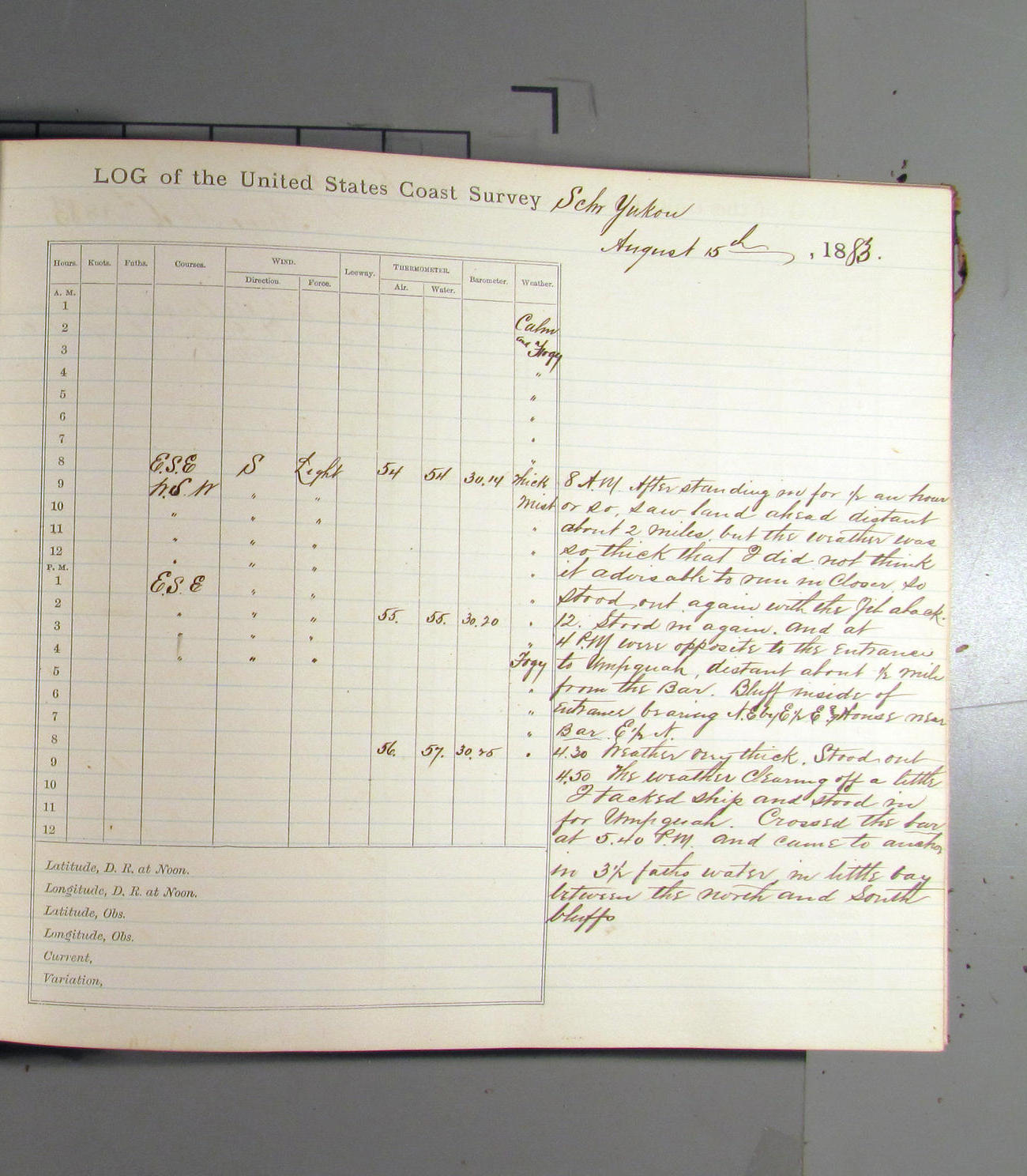 At noon stood in again and at 4.00pm was opposite entrance to Umpquah [Umpqua River], distant about ½ mile from bar.