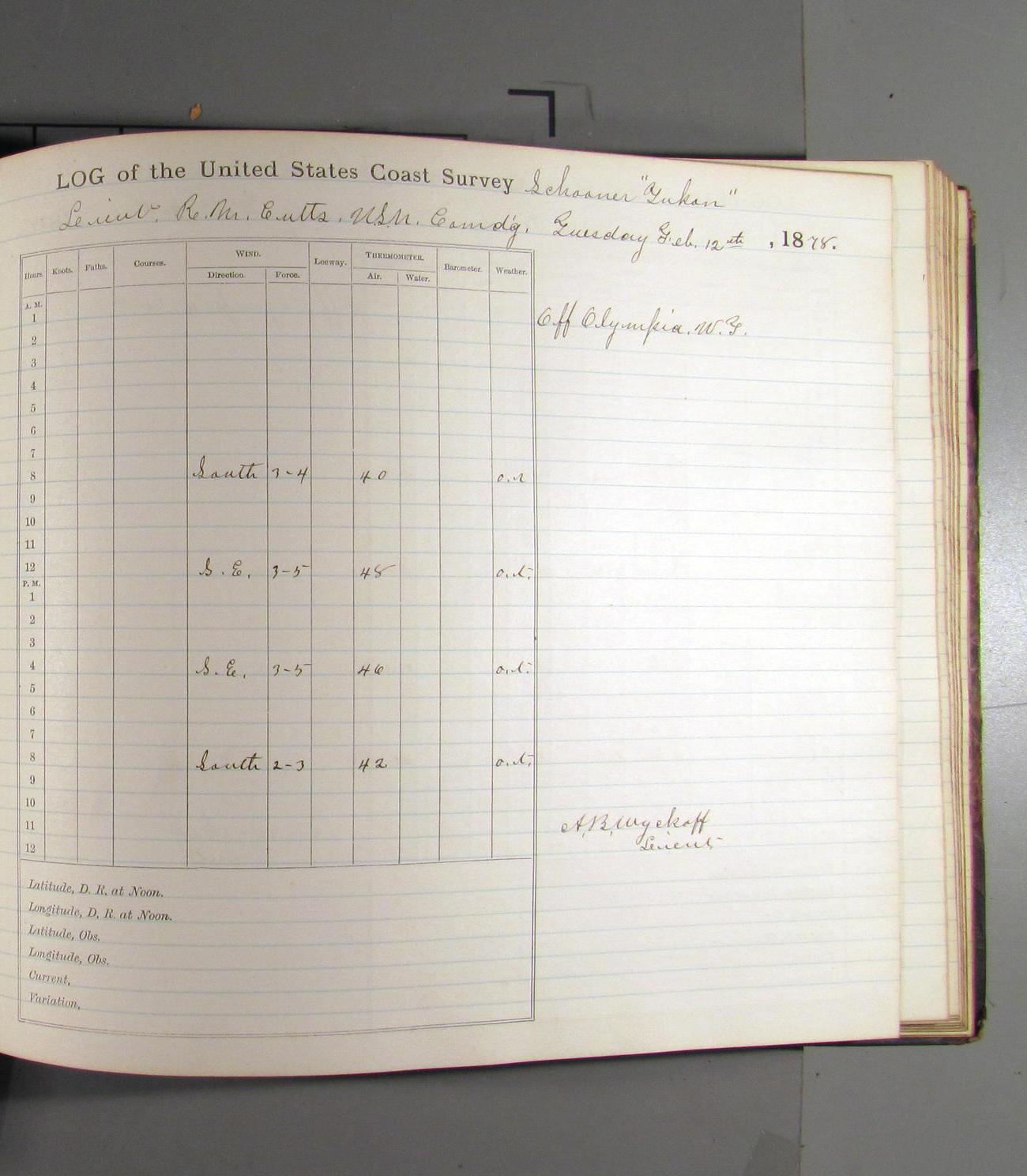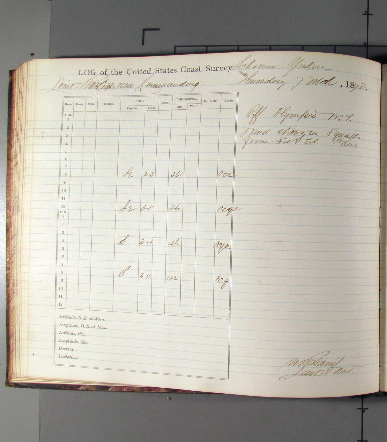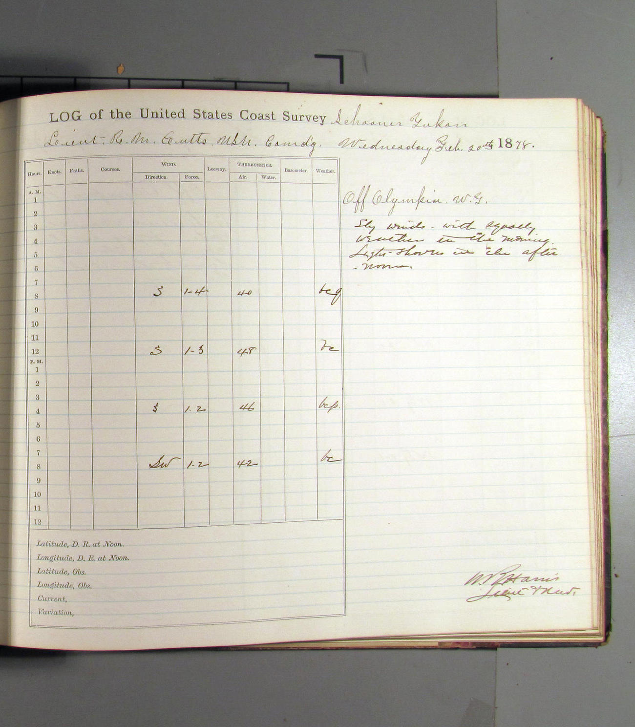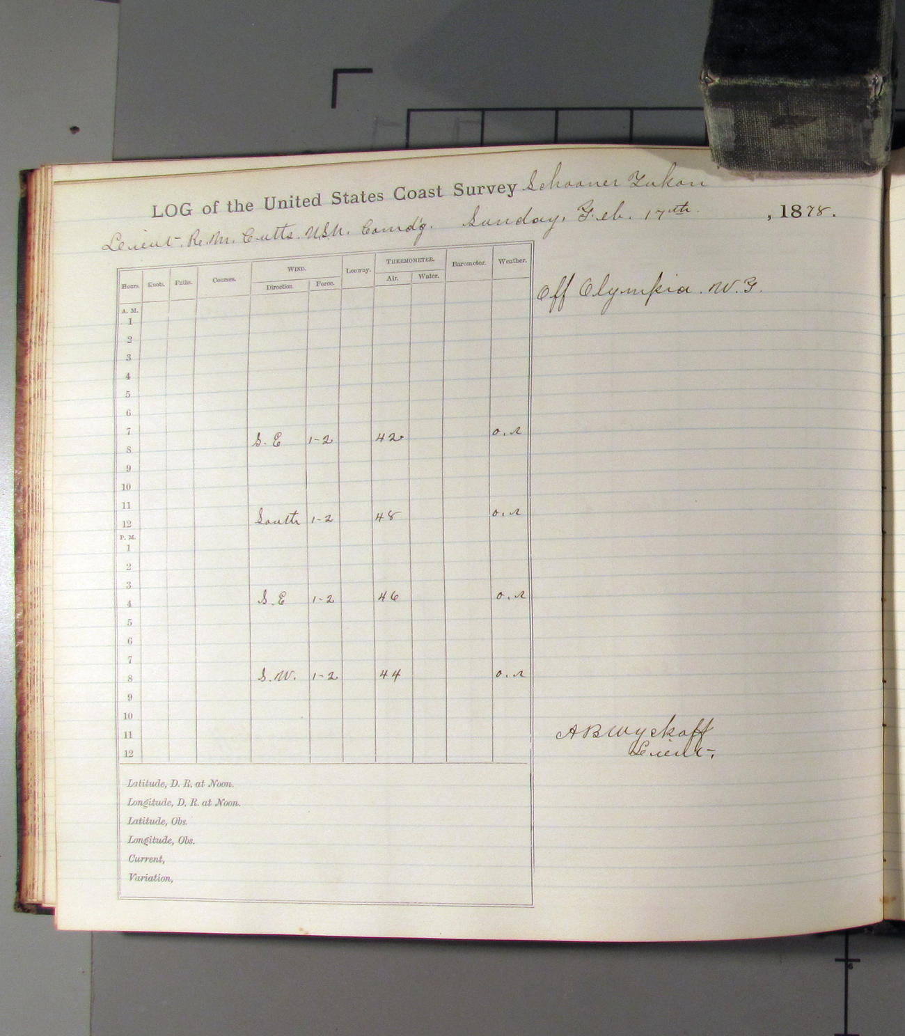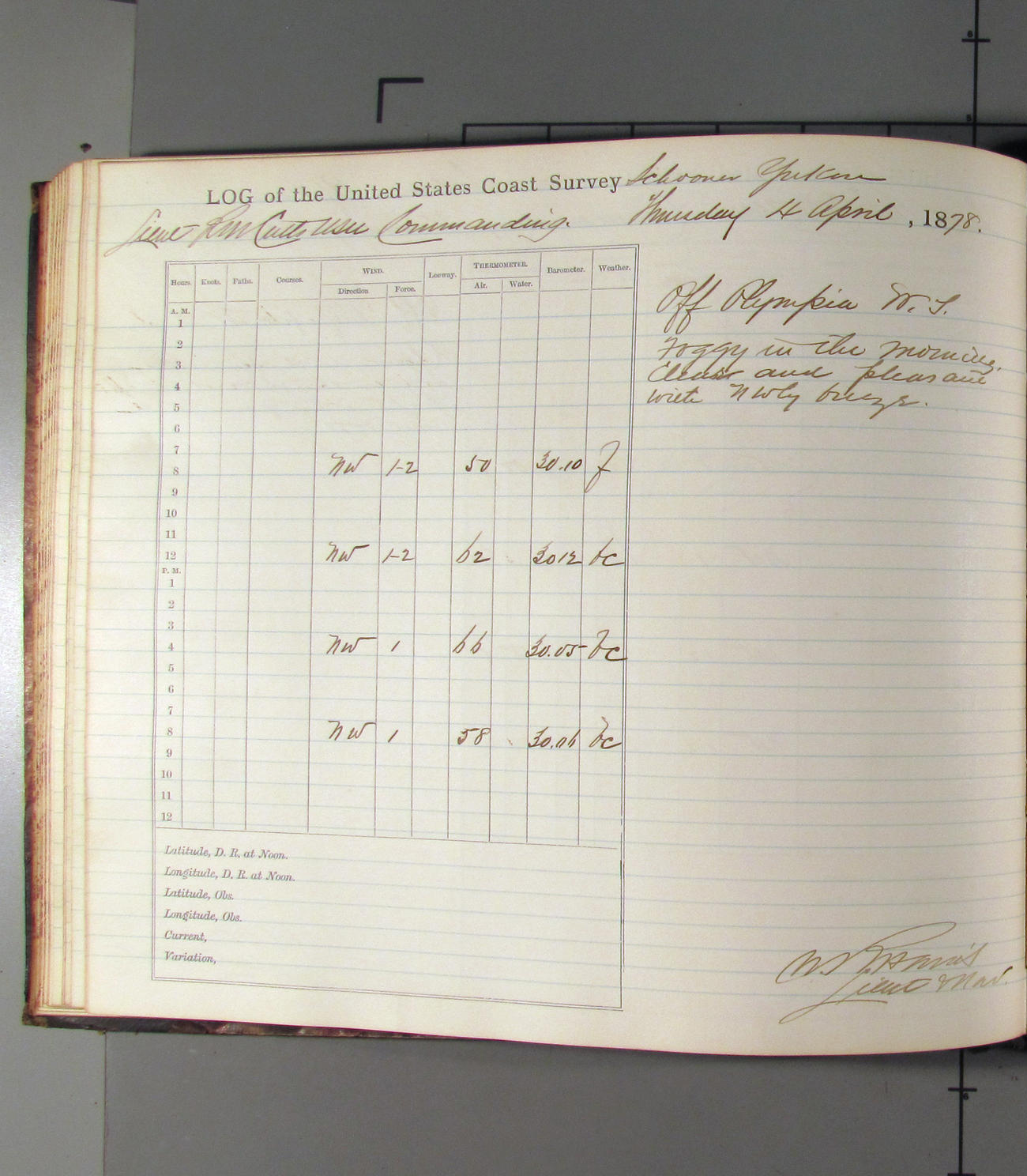 At noon stood in again and at 4.00pm was opposite entrance to Umpquah [Umpqua River], distant about ½ mile from bar.