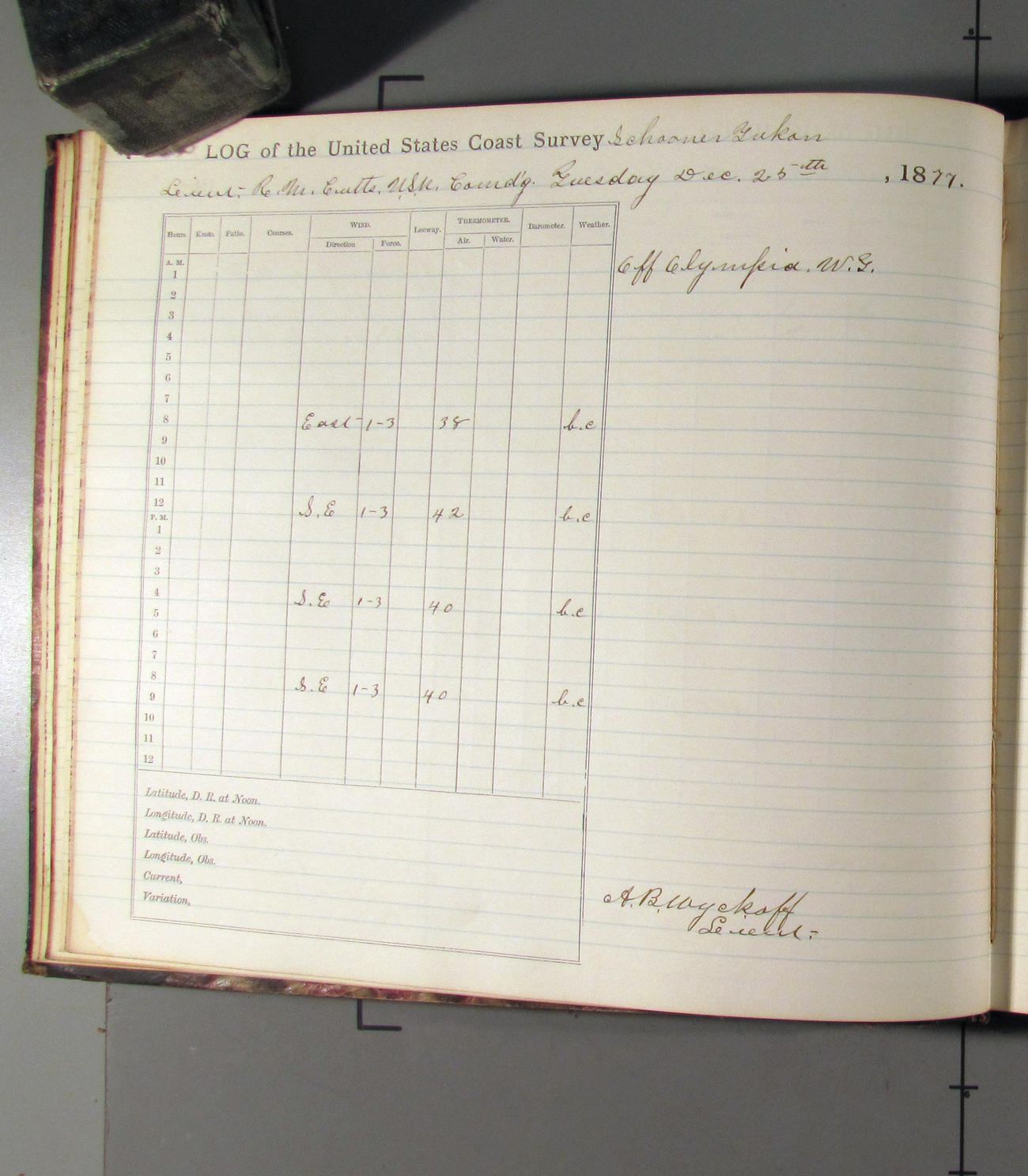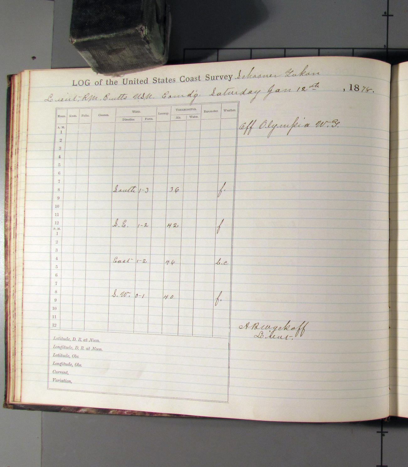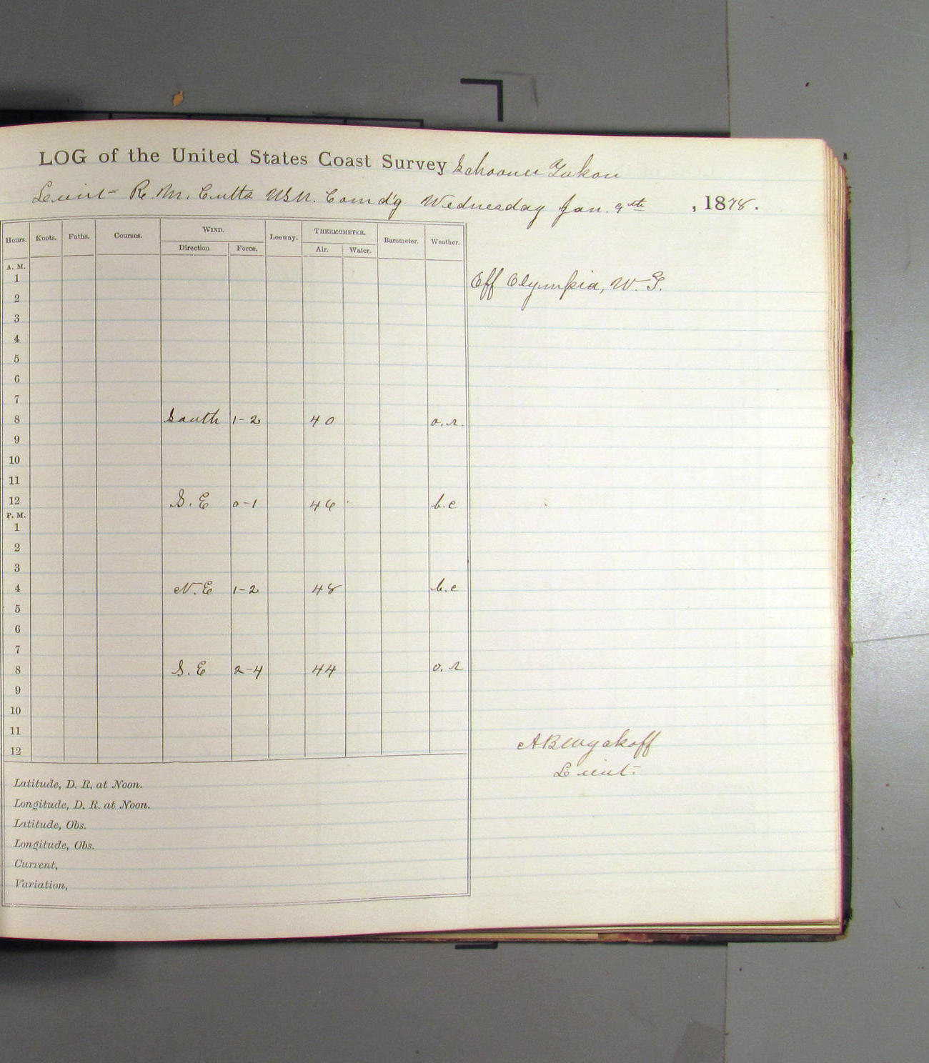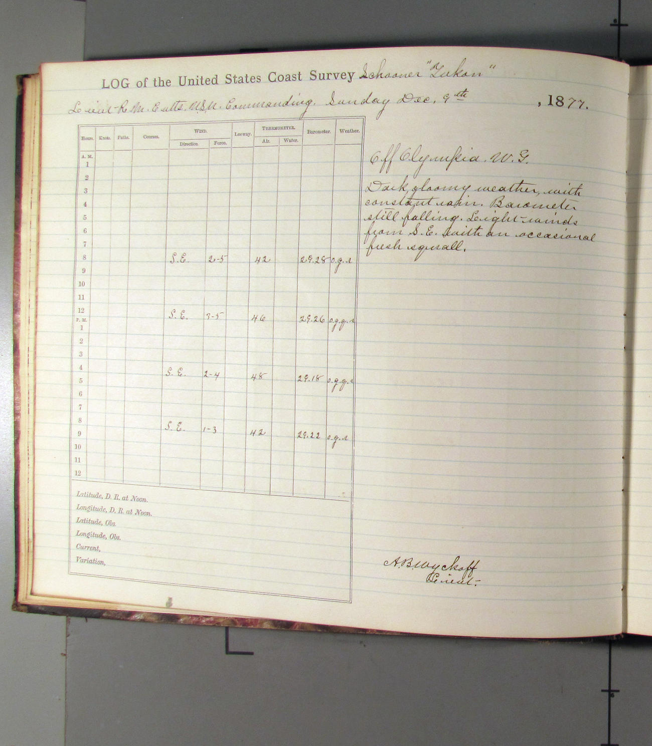 At noon stood in again and at 4.00pm was opposite entrance to Umpquah [Umpqua River], distant about ½ mile from bar.