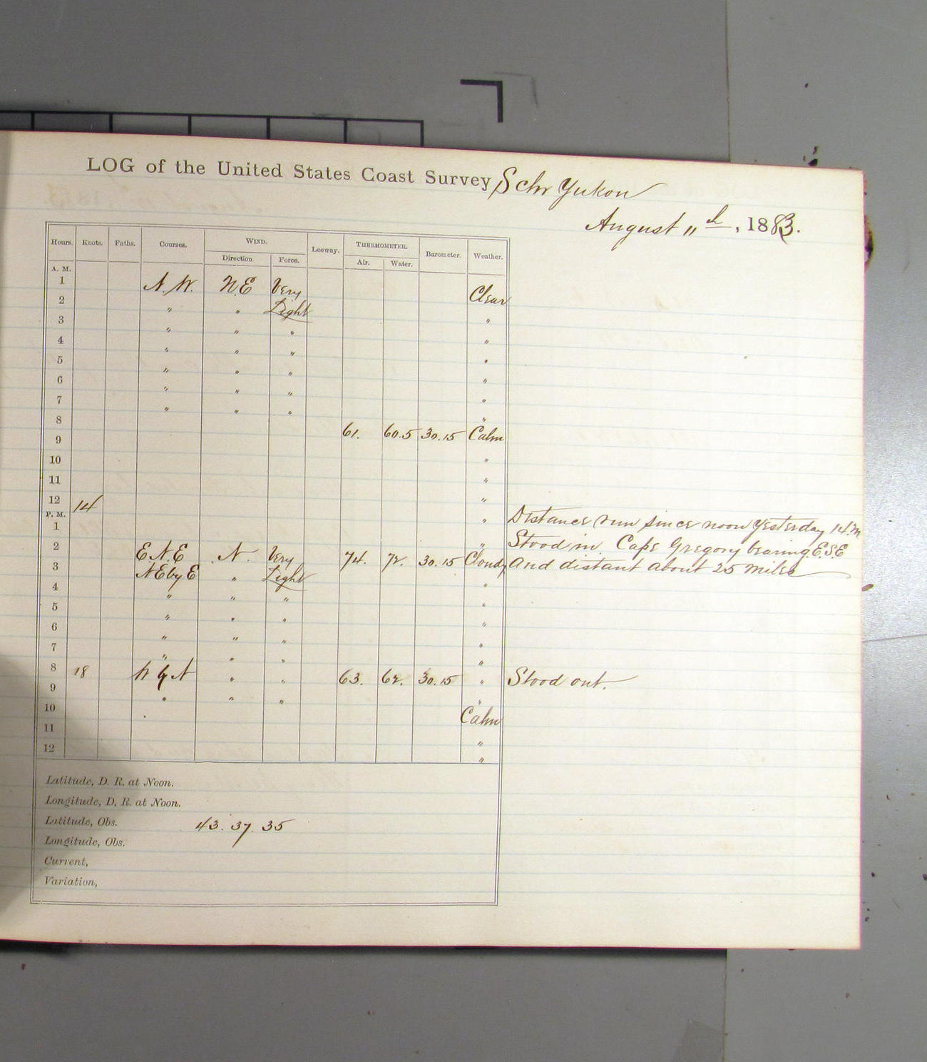 Cape Gregory bearing SEbyE, distance 22 miles; Umpquah [Umpqua] bearing NE½E, distant 20 miles.
