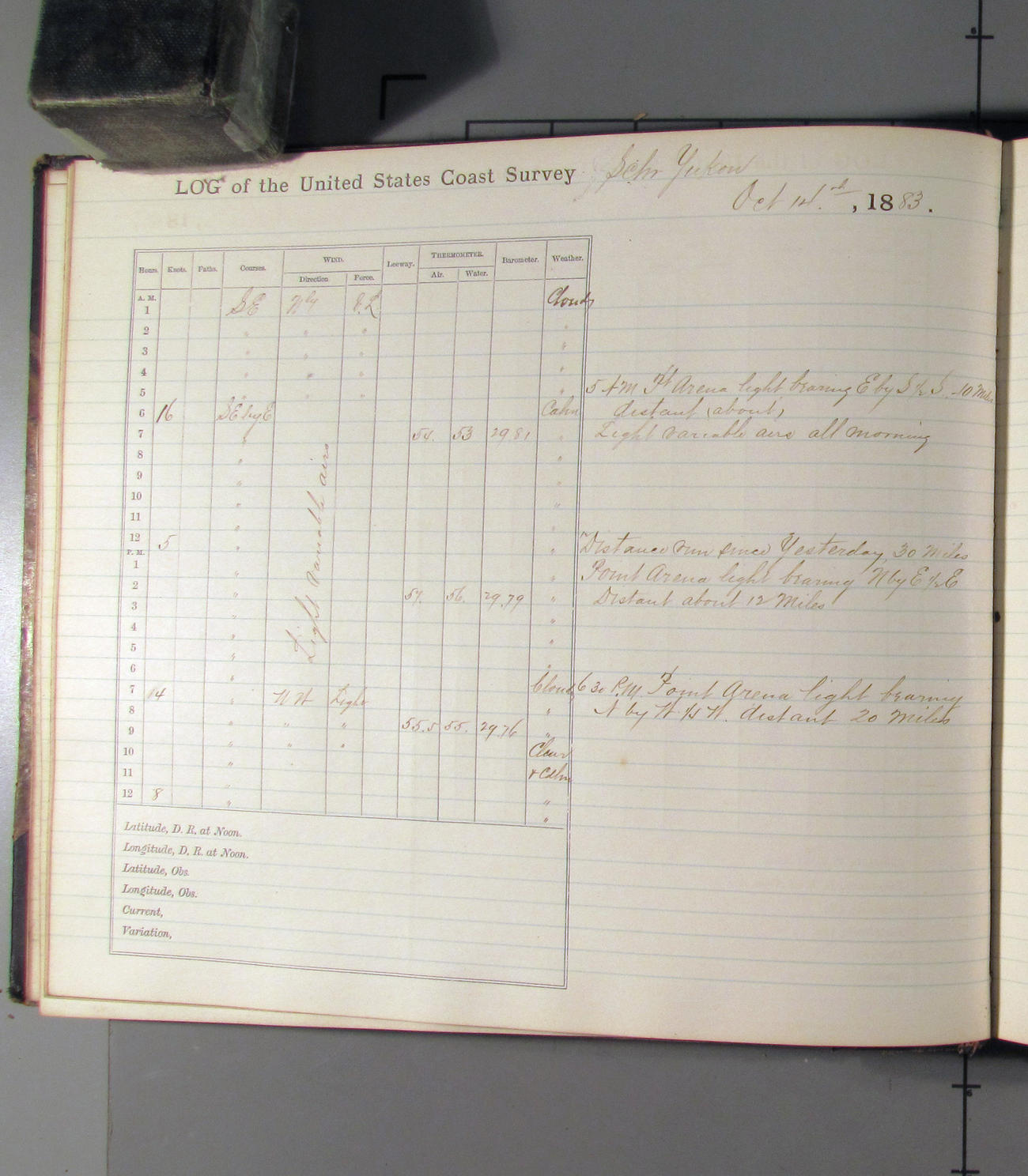 At 6.30pm Point Arena Light bearing NbyW½W, distant 20 miles.