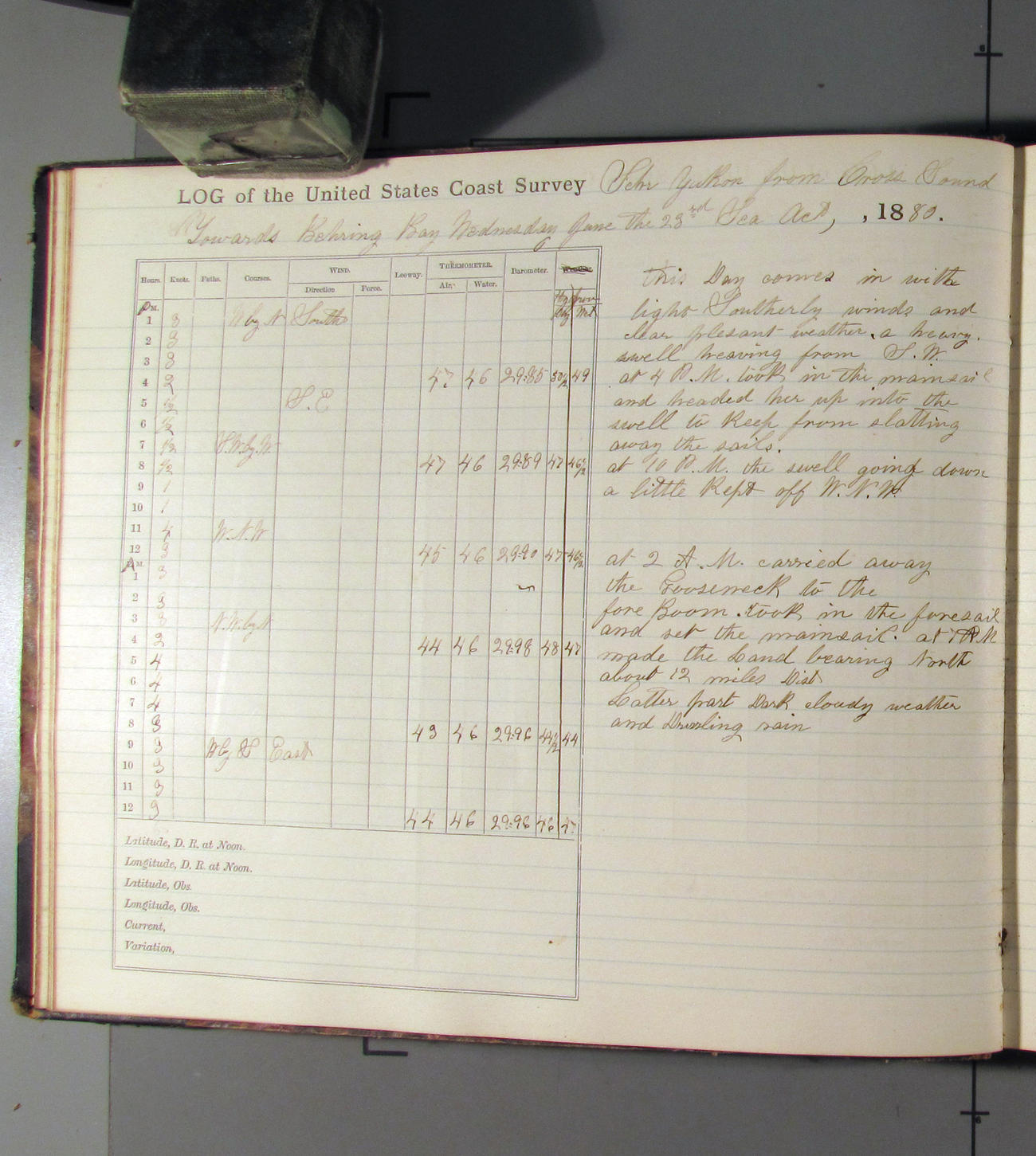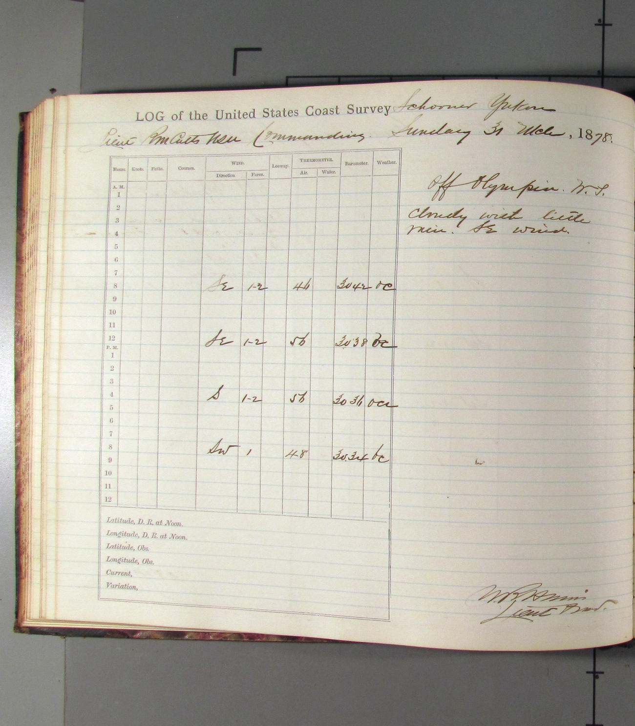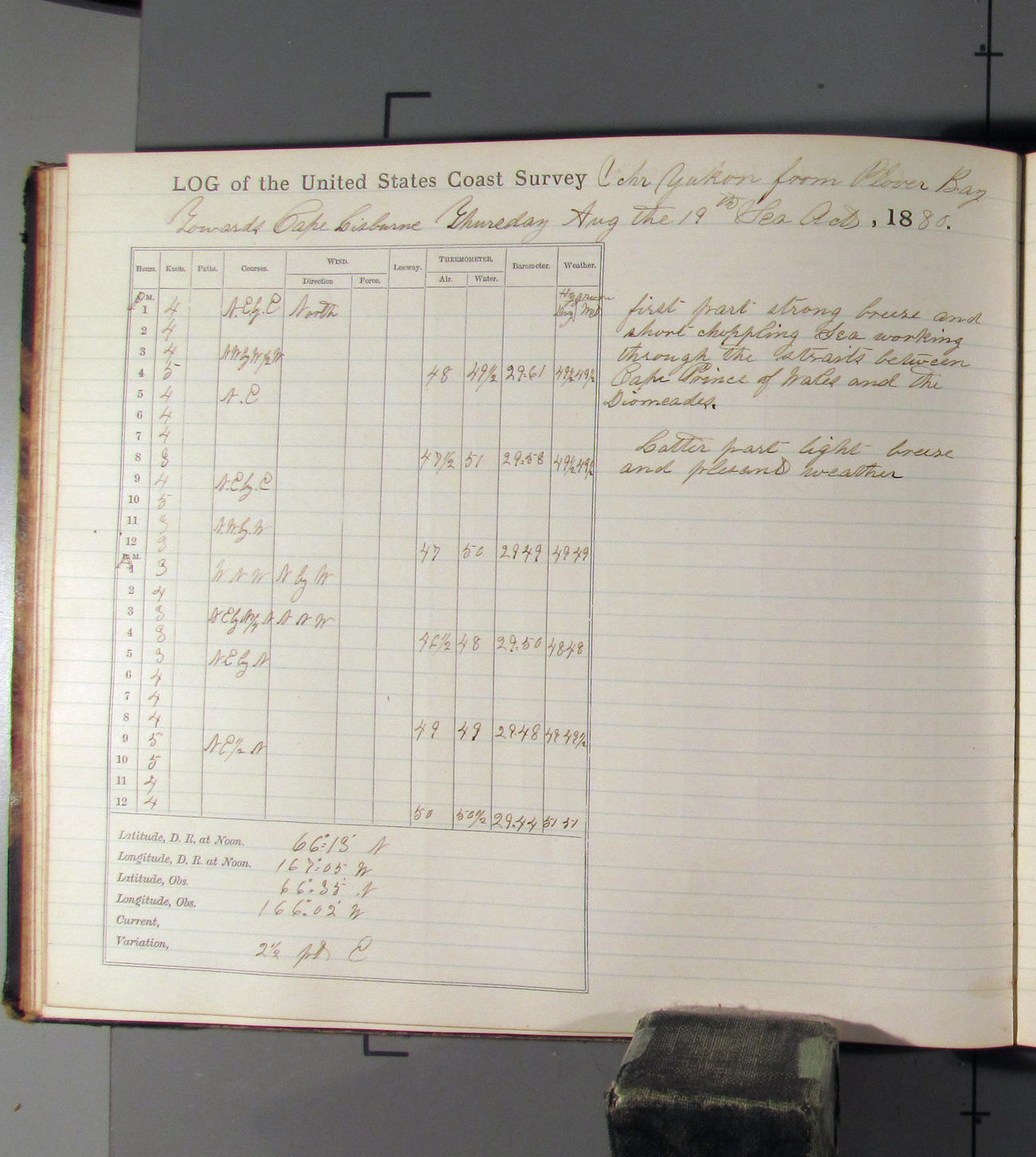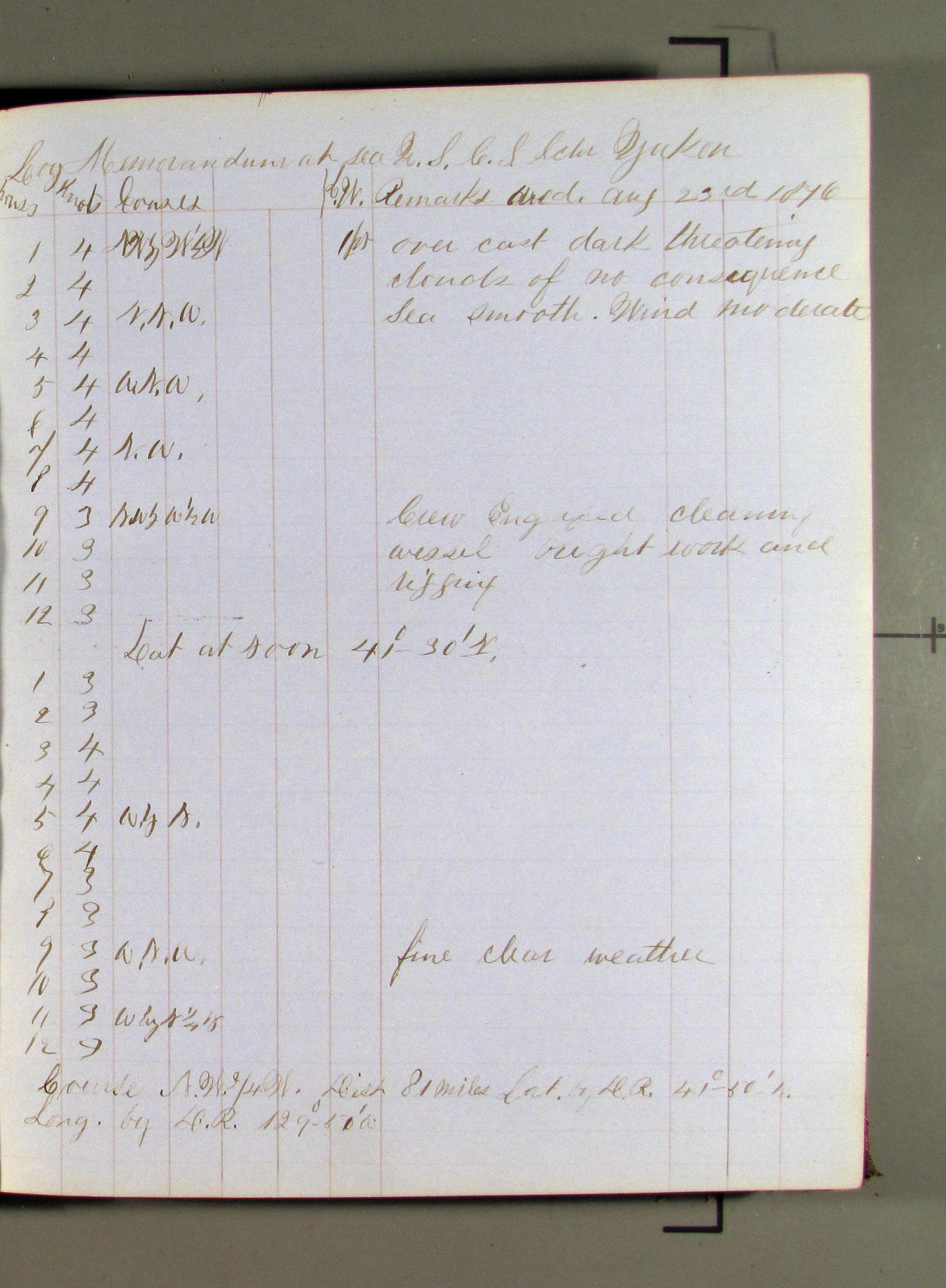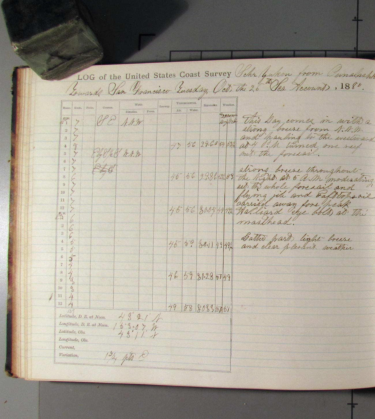 This day commences with moderate breeze from NWbyN. Weather cloudy.