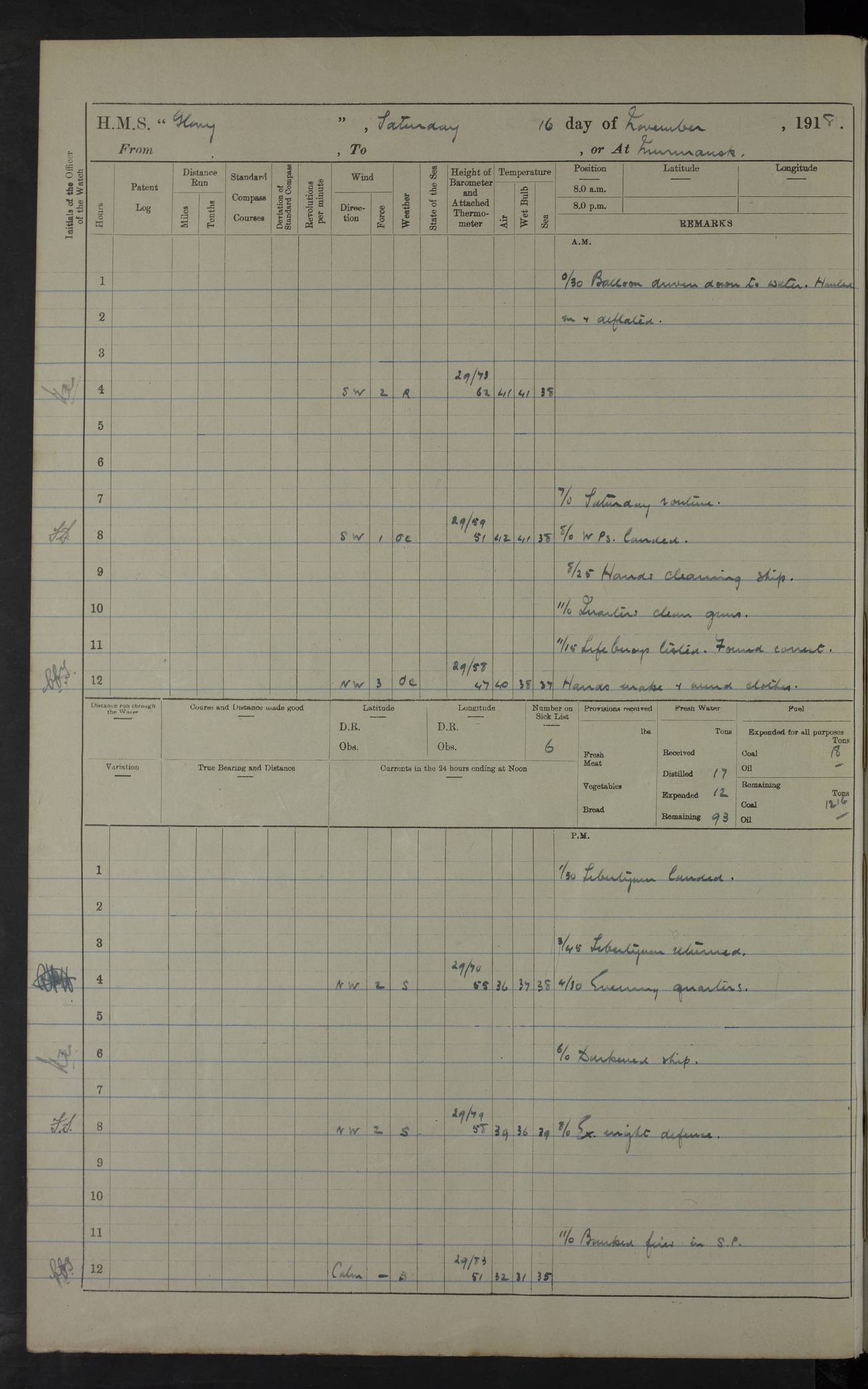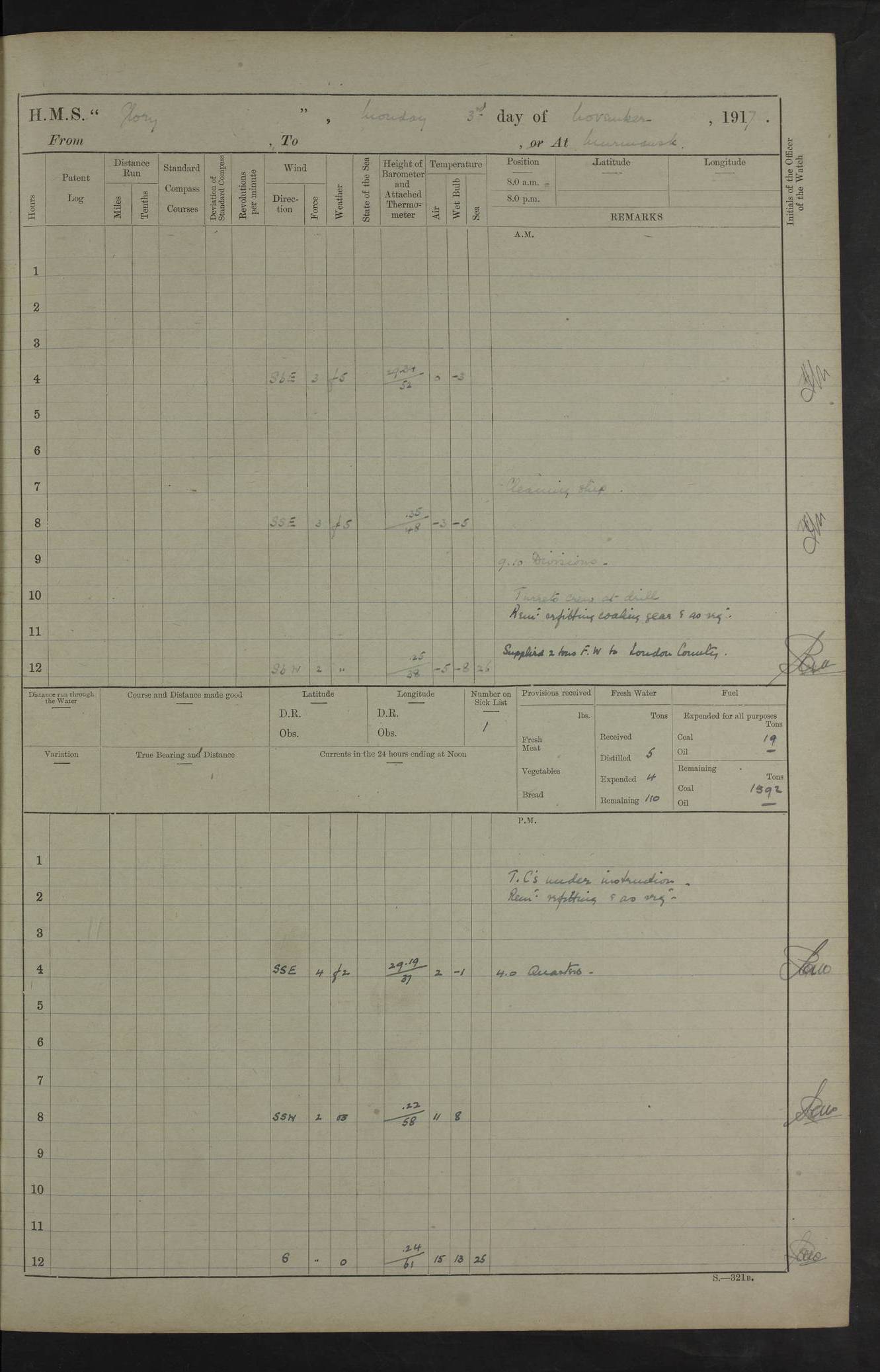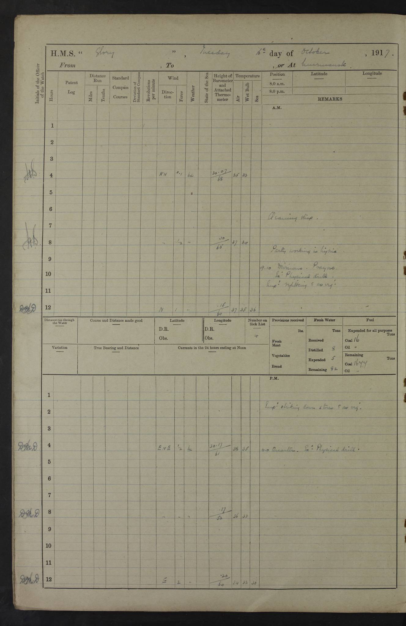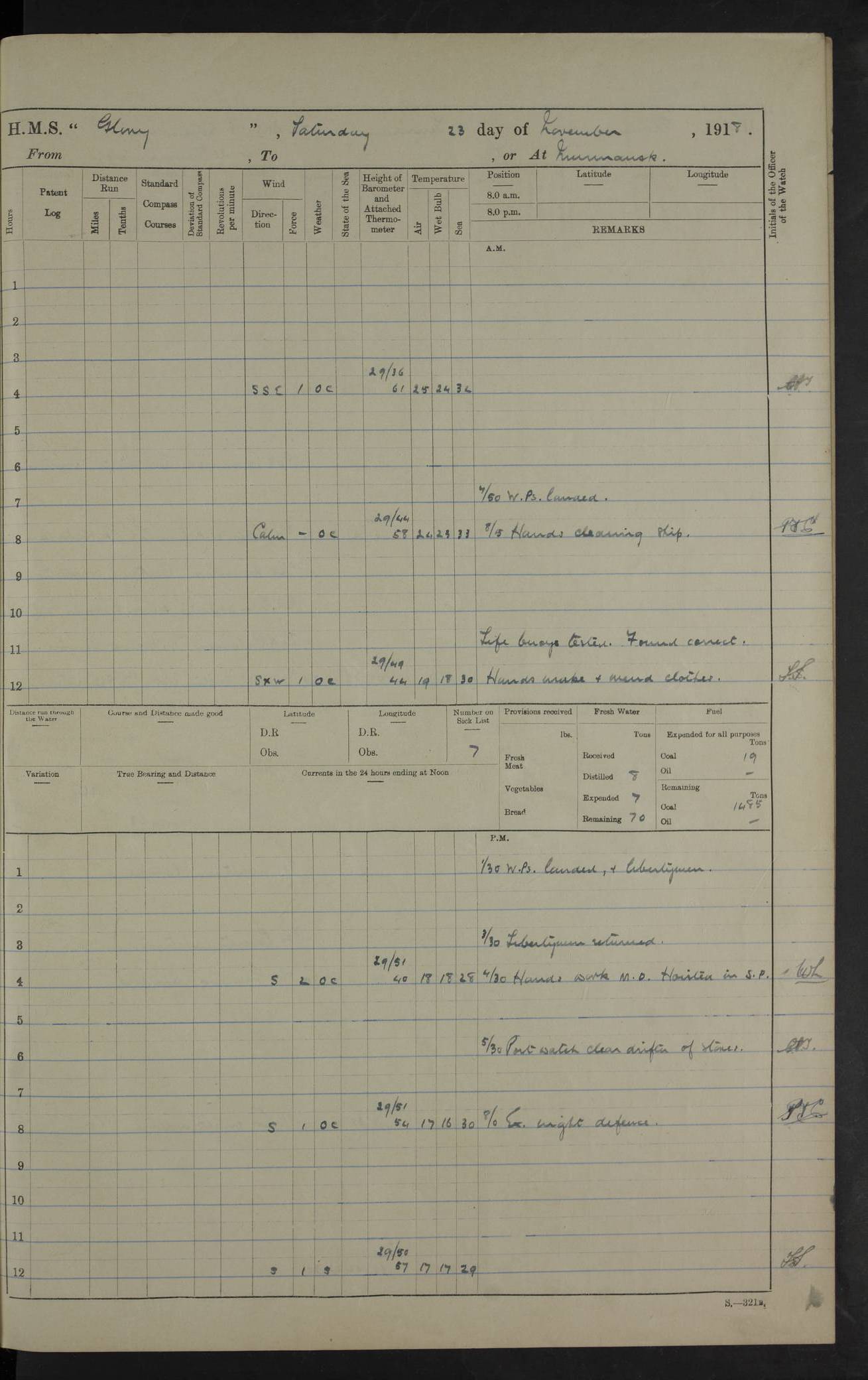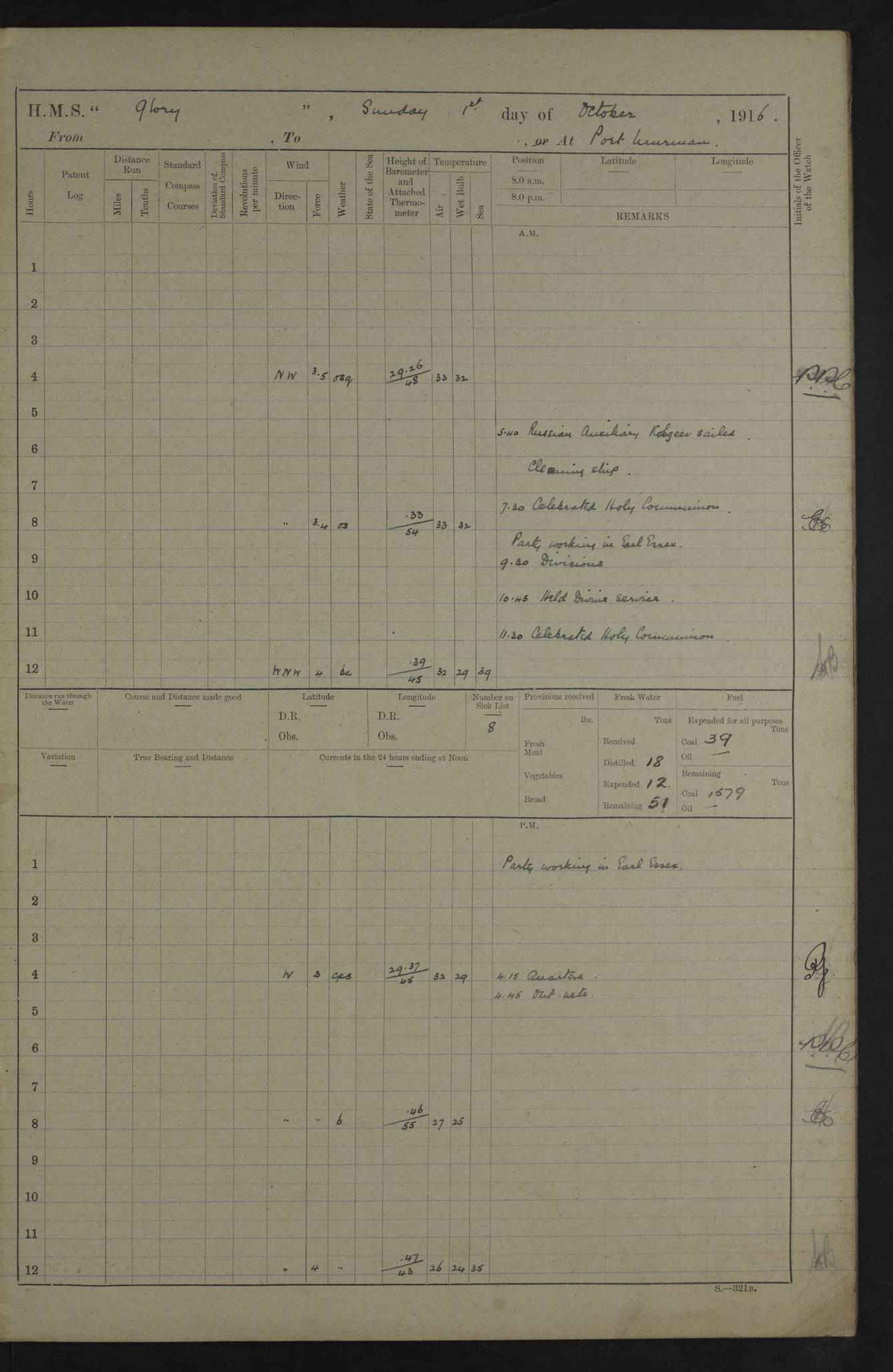 LOGS FOR OCTOBER 1916 For the period covered by the remainder of these logs (1 October, 1916 to 31 December 1918), HMS Glory was based at Murmansk, northern Russia. The city had a variety of names in the early 20th Century – including, Port Murman, Romanov and Murmansk. The location will be given in these pages as Murmansk, the modern name. A history of Murmansk’s names is available at http://en.wikipedia.org/wiki/Murmansk . 4f961482a2fc8e2def0011c7: (http://s3.amazonaws.com/oldweather/ADM53-43026/ADM 53-43026-001_0.jpg) This log is to be kept in a cover in future 4f961482a2fc8e2def0011c8: (http://s3.amazonaws.com/oldweather/ADM53-43026/ADM 53-43026-001_1.jpg) 4f961482a2fc8e2def0011c9: (http://s3.amazonaws.com/oldweather/ADM53-43026/ADM 53-43026-002_0.jpg) 4f961483a2fc8e2def0011ca: (http://s3.amazonaws.com/oldweather/ADM53-43026/ADM 53-43026-002_1.jpg) 4f961483a2fc8e2def0011cb: (http://s3.amazonaws.com/oldweather/ADM53-43026/ADM 53-43026-003_0.jpg) 4f961483a2fc8e2def0011cc: (http://s3.amazonaws.com/oldweather/ADM53-43026/ADM 53-43026-003_1.jpg) 1 October 1916 Murmansk Lat 69.03, Long 33.05 5.40am: Russian auxiliary Kolgiev sailed. Information regarding this vessel (or similar name) has not been found. 7.30am: Celebrated Holy Communion. am: Party working in Earl Essex. Earl Essex was a hired trawler of 225 grt, built, in 1914. Sourced from F.J. Dittmar & J.J. Colledge (1972) – British warships 1914–1919, Ian Allan. 10.45am: Held Divine Service. 11.30am: Celebrated Holy Communion. 4.45pm: Out nets. 4f961484a2fc8e2def0011cd: (http://s3.amazonaws.com/oldweather/ADM53-43026/ADM 53-43026-004_0.jpg) 2 October 1916 Murmansk Lat 69.03, Long 33.05 am: Party working in Earl Essex. 11.30am: Paid quarterly settlement. 6.15pm: Kolgiev arrived. 4f961484a2fc8e2def0011ce: (http://s3.amazonaws.com/oldweather/ADM53-43026/ADM 53-43026-004_1.jpg) 3 October 1916 Murmansk Lat 69.03, Long 33.05 Number on sick list: 9 9.20am: Aft port nets. 11.30am: Russian TBs Goorovoi and Plasteevyi(?) arrived. The first of these TBs is possibly ‘Grosovoi’, built at Le Havre around 1900. Her fate is unclear. The name of the second vessel is possibly incorrect, but no near match has been found. 1.30pm: Out port nets. 4f961484a2fc8e2def0011cf: (http://s3.amazonaws.com/oldweather/ADM53-43026/ADM 53-43026-005_0.jpg) 4 October 1916 Murmansk Lat 69.03, Long 33.05 8.30am: Salvator - broad pendant of Commodore T.W. Kemp arrived. Salvator (ex–Katoomba) was a hired yacht of 684 tons gross, built in 1903. She served as the Heliopolis in WW2. Details at WW1NavyBritishShips-Dittmar4AP.htm . 9.25am: Aft port nets. 11.05am: HE the Minister of Marine visited ship. 11.30am: Out port nets. 11.50am: Russian auxiliary Gotowsci(?) arrived. 12 noon: Kolgiev sailed. pm: HM Tug Blackcock arrived. Blackcock was a hired patrol tug, built in 1886 and wrecked on 18 January, 1918, in the White Sea. Sourced from F.J. Dittmar & J.J. Colledge (1972) – British warships 1914–1919, Ian Allan. 6.50pm: Kolgiev arrived. 4f961485a2fc8e2def0011d0: (http://s3.amazonaws.com/oldweather/ADM53-43026/ADM 53-43026-005_1.jpg) 5 October 1916 Murmansk Lat 69.03, Long 33.05 10.35am: Kolgiev sailed. 1.05pm: Salvator sailed. pm: Read Warrant No. 5. 4f961485a2fc8e2def0011d1: (http://s3.amazonaws.com/oldweather/ADM53-43026/ADM 53-43026-006_0.jpg) 6 October 1916 Murmansk Lat 69.03, Long 33.05 pm: 5 tons of water supplied to Blackcock. 3.30pm: Action. 3.45pm: Secure. Russian T.B's Grosovoi and Plasteevyi sailed. 4f961485a2fc8e2def0011d2: (http://s3.amazonaws.com/oldweather/ADM53-43026/ADM 53-43026-006_1.jpg) 7 October 1916 Murmansk Lat 69.03, Long 33.05 am: Party coaling trawler. am: Tested life buoys – correct. 4f961486a2fc8e2def0011d3: (http://s3.amazonaws.com/oldweather/ADM53-43026/ADM 53-43026-007_0.jpg) 8 October 1916 Murmansk Lat 69.03, Long 33.05 6.45am: Party working in collier. 7.30am: Celebrated Holy Communion. 10.45am: Held Divine service. 5.45pm: Held Divine Service. 4f961486a2fc8e2def0011d4: (http://s3.amazonaws.com/oldweather/ADM53-43026/ADM 53-43026-007_1.jpg) 9 October 1916 Murmansk Lat 69.03, Long 33.05 Number on sick list: 9 am: Exercised fire stations. am: 2nd pinnace patrolling. pm: Landed marines for drill. 4f961486a2fc8e2def0011d5: (http://s3.amazonaws.com/oldweather/ADM53-43026/ADM 53-43026-008_0.jpg) 10 October 1916 Murmansk Lat 69.03, Long 33.05 am: Steam pinnace patrolling. 1.55pm: Kolgiev arrived. 4f961487a2fc8e2def0011d6: (http://s3.amazonaws.com/oldweather/ADM53-43026/ADM 53-43026-008_1.jpg) 11 October 1916 Murmansk Lat 69.03, Long 33.05 am: Party working on boom defence. am: MT and QD men aired bedding. am: Marines at drill. 1.50pm: Kolgiev sailed. 3.15pm: British tug Racia (lighter ES 23 in tow) arrived. Racia was a hired screw tug of 410 grt, built in 1894 and sold on 23 June, 1920. Sourced from F.J. Dittmar & J.J. Colledge (1972) – British warships 1914–1919, Ian Allan. 4f961487a2fc8e2def0011d7: (http://s3.amazonaws.com/oldweather/ADM53-43026/ADM 53-43026-009_0.jpg) 12 October 1916 Murmansk Lat 69.03, Long 33.05 Number on sick list: 6 am: Party working on boom defence. am: Steam pinnace patrolling. pm: Make and mend clothes. 4.15pm: Read warrant No. 6. 6.00pm: Imperator Nicolas arrived. A vessel with this name has not been traced. 4f961487a2fc8e2def0011d8: (http://s3.amazonaws.com/oldweathe/ADM53-43026/ADM 53-43026-009_1.jpg) 13 October 1916 Murmansk Lat 69.03, Long 33.05 am: Steam pinnace patrolling. am: Party working on boom defence. am: Found foc’sle awning and side screens damaged by rats. 4f961488a2fc8e2def0011d9: (http://s3.amazonaws.com/oldweather/ADM53-43026/ADM 53-43026-010_0.jpg) 14 August 1916 (probably should read October) Murmansk Lat 69.03, Long 33.05 Number on sick list: 7 6.45am: Racia (floating crane in tow) sailed. am: Party working on boom defence. am: Tested life buoys – correct. 3.00pm: Vindictive arrived. HMS Vindictive was a protected cruiser of the Arrogant class, launched in 1897 at Chatham Dockyar