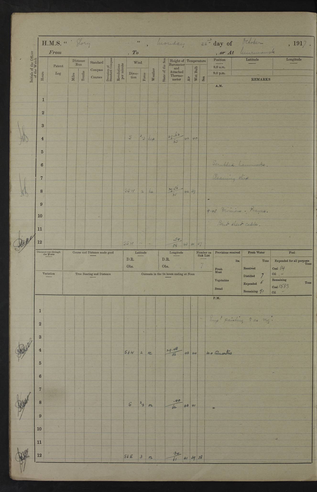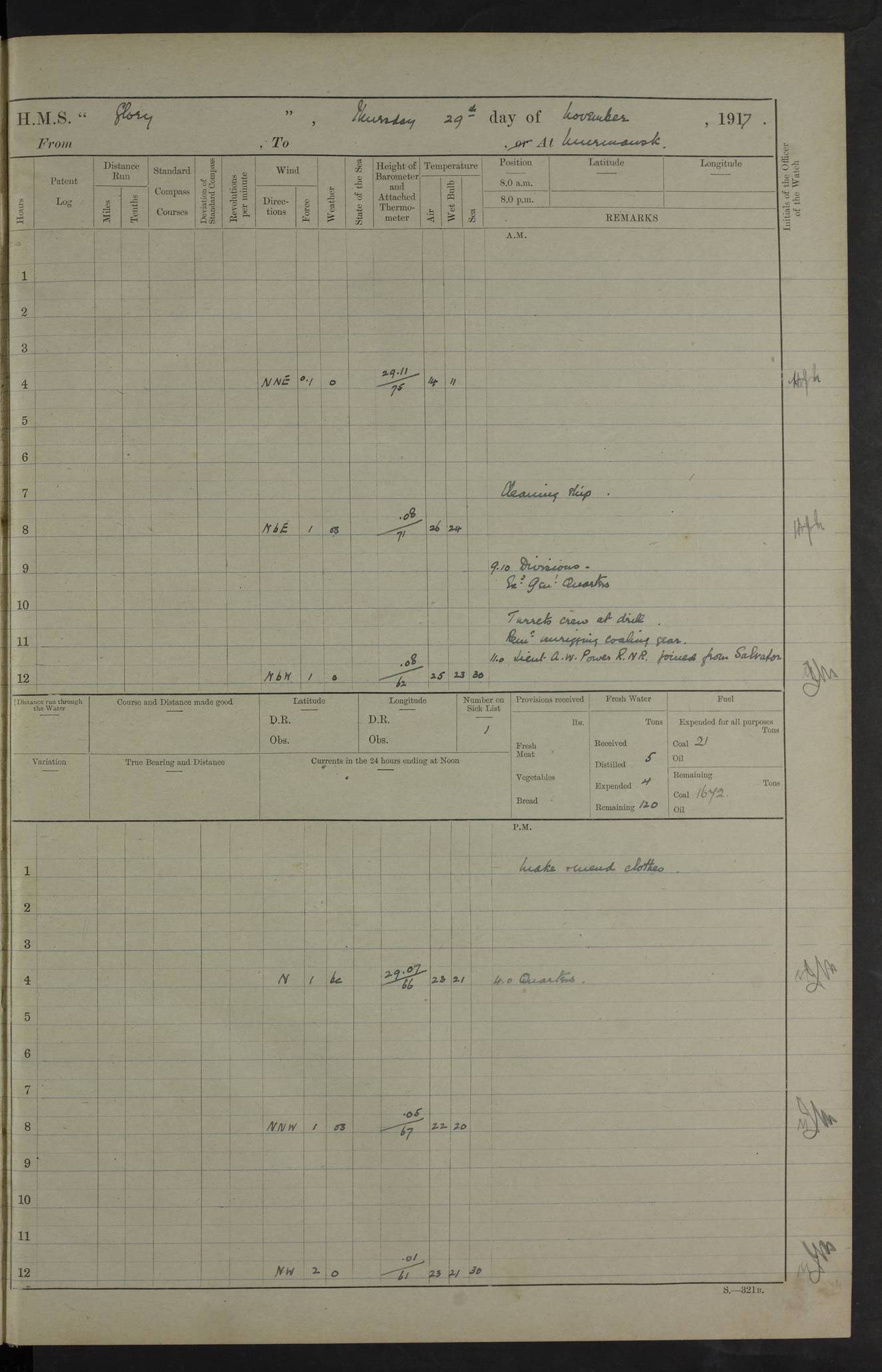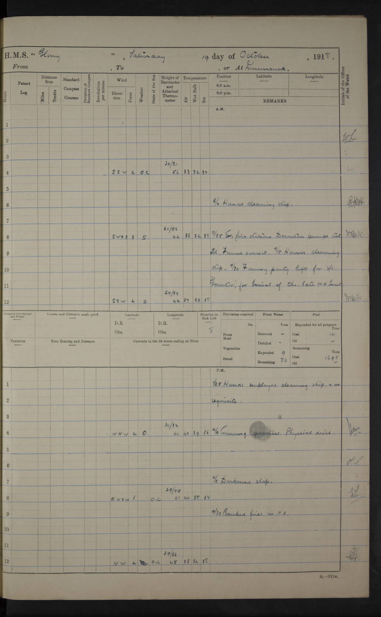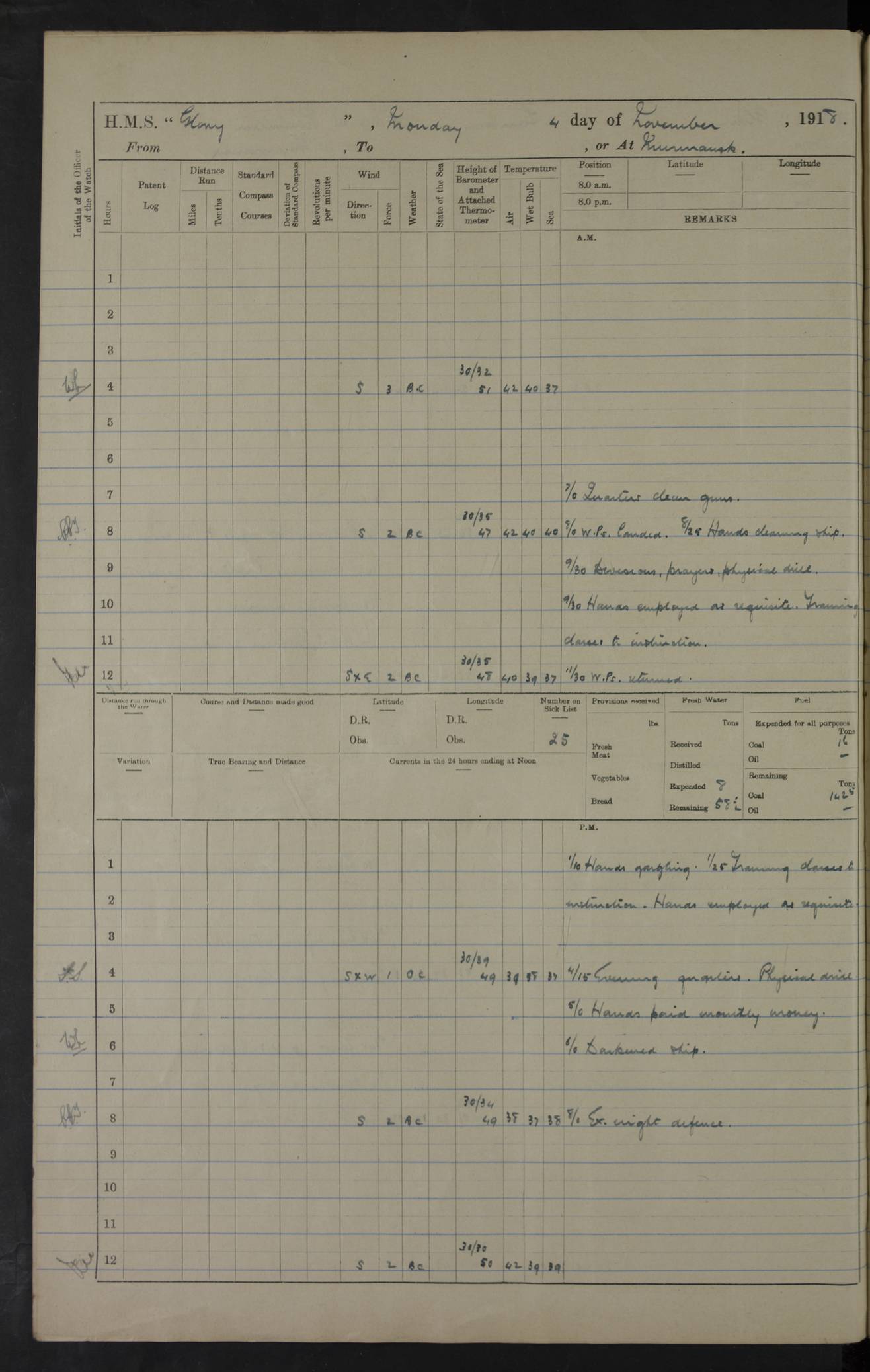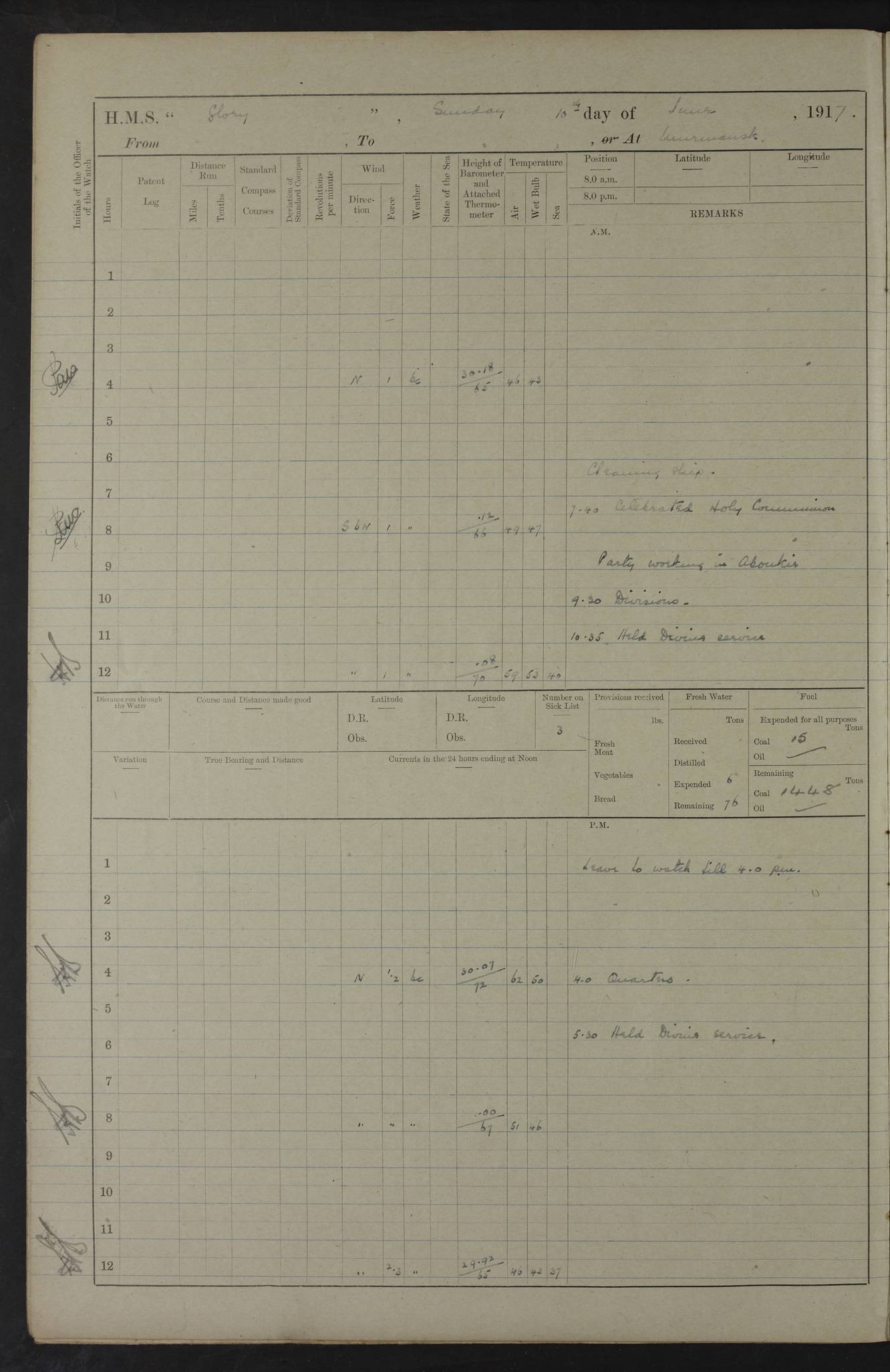 LOGS FOR OCTOBER 1916 For the period covered by the remainder of these logs (1 October, 1916 to 31 December 1918), HMS Glory was based at Murmansk, northern Russia. The city had a variety of names in the early 20th Century – including, Port Murman, Romanov and Murmansk. The location will be given in these pages as Murmansk, the modern name. A history of Murmansk’s names is available at http://en.wikipedia.org/wiki/Murmansk . 4f961482a2fc8e2def0011c7: (http://s3.amazonaws.com/oldweather/ADM53-43026/ADM 53-43026-001_0.jpg) This log is to be kept in a cover in future 4f961482a2fc8e2def0011c8: (http://s3.amazonaws.com/oldweather/ADM53-43026/ADM 53-43026-001_1.jpg) 4f961482a2fc8e2def0011c9: (http://s3.amazonaws.com/oldweather/ADM53-43026/ADM 53-43026-002_0.jpg) 4f961483a2fc8e2def0011ca: (http://s3.amazonaws.com/oldweather/ADM53-43026/ADM 53-43026-002_1.jpg) 4f961483a2fc8e2def0011cb: (http://s3.amazonaws.com/oldweather/ADM53-43026/ADM 53-43026-003_0.jpg) 4f961483a2fc8e2def0011cc: (http://s3.amazonaws.com/oldweather/ADM53-43026/ADM 53-43026-003_1.jpg) 1 October 1916 Murmansk Lat 69.03, Long 33.05 5.40am: Russian auxiliary Kolgiev sailed. Information regarding this vessel (or similar name) has not been found. 7.30am: Celebrated Holy Communion. am: Party working in Earl Essex. Earl Essex was a hired trawler of 225 grt, built, in 1914. Sourced from F.J. Dittmar & J.J. Colledge (1972) – British warships 1914–1919, Ian Allan. 10.45am: Held Divine Service. 11.30am: Celebrated Holy Communion. 4.45pm: Out nets. 4f961484a2fc8e2def0011cd: (http://s3.amazonaws.com/oldweather/ADM53-43026/ADM 53-43026-004_0.jpg) 2 October 1916 Murmansk Lat 69.03, Long 33.05 am: Party working in Earl Essex. 11.30am: Paid quarterly settlement. 6.15pm: Kolgiev arrived. 4f961484a2fc8e2def0011ce: (http://s3.amazonaws.com/oldweather/ADM53-43026/ADM 53-43026-004_1.jpg) 3 October 1916 Murmansk Lat 69.03, Long 33.05 Number on sick list: 9 9.20am: Aft port nets. 11.30am: Russian TBs Goorovoi and Plasteevyi(?) arrived. The first of these TBs is possibly ‘Grosovoi’, built at Le Havre around 1900. Her fate is unclear. The name of the second vessel is possibly incorrect, but no near match has been found. 1.30pm: Out port nets. 4f961484a2fc8e2def0011cf: (http://s3.amazonaws.com/oldweather/ADM53-43026/ADM 53-43026-005_0.jpg) 4 October 1916 Murmansk Lat 69.03, Long 33.05 8.30am: Salvator - broad pendant of Commodore T.W. Kemp arrived. Salvator (ex–Katoomba) was a hired yacht of 684 tons gross, built in 1903. She served as the Heliopolis in WW2. Details at WW1NavyBritishShips-Dittmar4AP.htm . 9.25am: Aft port nets. 11.05am: HE the Minister of Marine visited ship. 11.30am: Out port nets. 11.50am: Russian auxiliary Gotowsci(?) arrived. 12 noon: Kolgiev sailed. pm: HM Tug Blackcock arrived. Blackcock was a hired patrol tug, built in 1886 and wrecked on 18 January, 1918, in the White Sea. Sourced from F.J. Dittmar & J.J. Colledge (1972) – British warships 1914–1919, Ian Allan. 6.50pm: Kolgiev arrived. 4f961485a2fc8e2def0011d0: (http://s3.amazonaws.com/oldweather/ADM53-43026/ADM 53-43026-005_1.jpg) 5 October 1916 Murmansk Lat 69.03, Long 33.05 10.35am: Kolgiev sailed. 1.05pm: Salvator sailed. pm: Read Warrant No. 5. 4f961485a2fc8e2def0011d1: (http://s3.amazonaws.com/oldweather/ADM53-43026/ADM 53-43026-006_0.jpg) 6 October 1916 Murmansk Lat 69.03, Long 33.05 pm: 5 tons of water supplied to Blackcock. 3.30pm: Action. 3.45pm: Secure. Russian T.B's Grosovoi and Plasteevyi sailed. 4f961485a2fc8e2def0011d2: (http://s3.amazonaws.com/oldweather/ADM53-43026/ADM 53-43026-006_1.jpg) 7 October 1916 Murmansk Lat 69.03, Long 33.05 am: Party coaling trawler. am: Tested life buoys – correct. 4f961486a2fc8e2def0011d3: (http://s3.amazonaws.com/oldweather/ADM53-43026/ADM 53-43026-007_0.jpg) 8 October 1916 Murmansk Lat 69.03, Long 33.05 6.45am: Party working in collier. 7.30am: Celebrated Holy Communion. 10.45am: Held Divine service. 5.45pm: Held Divine Service. 4f961486a2fc8e2def0011d4: (http://s3.amazonaws.com/oldweather/ADM53-43026/ADM 53-43026-007_1.jpg) 9 October 1916 Murmansk Lat 69.03, Long 33.05 Number on sick list: 9 am: Exercised fire stations. am: 2nd pinnace patrolling. pm: Landed marines for drill. 4f961486a2fc8e2def0011d5: (http://s3.amazonaws.com/oldweather/ADM53-43026/ADM 53-43026-008_0.jpg) 10 October 1916 Murmansk Lat 69.03, Long 33.05 am: Steam pinnace patrolling. 1.55pm: Kolgiev arrived. 4f961487a2fc8e2def0011d6: (http://s3.amazonaws.com/oldweather/ADM53-43026/ADM 53-43026-008_1.jpg) 11 October 1916 Murmansk Lat 69.03, Long 33.05 am: Party working on boom defence. am: MT and QD men aired bedding. am: Marines at drill. 1.50pm: Kolgiev sailed. 3.15pm: British tug Racia (lighter ES 23 in tow) arrived. Racia was a hired screw tug of 410 grt, built in 1894 and sold on 23 June, 1920. Sourced from F.J. Dittmar & J.J. Colledge (1972) – British warships 1914–1919, Ian Allan. 4f961487a2fc8e2def0011d7: (http://s3.amazonaws.com/oldweather/ADM53-43026/ADM 53-43026-009_0.jpg) 12 October 1916 Murmansk Lat 69.03, Long 33.05 Number on sick list: 6 am: Party working on boom defence. am: Steam pinnace patrolling. pm: Make and mend clothes. 4.15pm: Read warrant No. 6. 6.00pm: Imperator Nicolas arrived. A vessel with this name has not been traced. 4f961487a2fc8e2def0011d8: (http://s3.amazonaws.com/oldweathe/ADM53-43026/ADM 53-43026-009_1.jpg) 13 October 1916 Murmansk Lat 69.03, Long 33.05 am: Steam pinnace patrolling. am: Party working on boom defence. am: Found foc’sle awning and side screens damaged by rats. 4f961488a2fc8e2def0011d9: (http://s3.amazonaws.com/oldweather/ADM53-43026/ADM 53-43026-010_0.jpg) 14 August 1916 (probably should read October) Murmansk Lat 69.03, Long 33.05 Number on sick list: 7 6.45am: Racia (floating crane in tow) sailed. am: Party working on boom defence. am: Tested life buoys – correct. 3.00pm: Vindictive arrived. HMS Vindictive was a protected cruiser of the Arrogant class, launched in 1897 at Chatham Dockyar