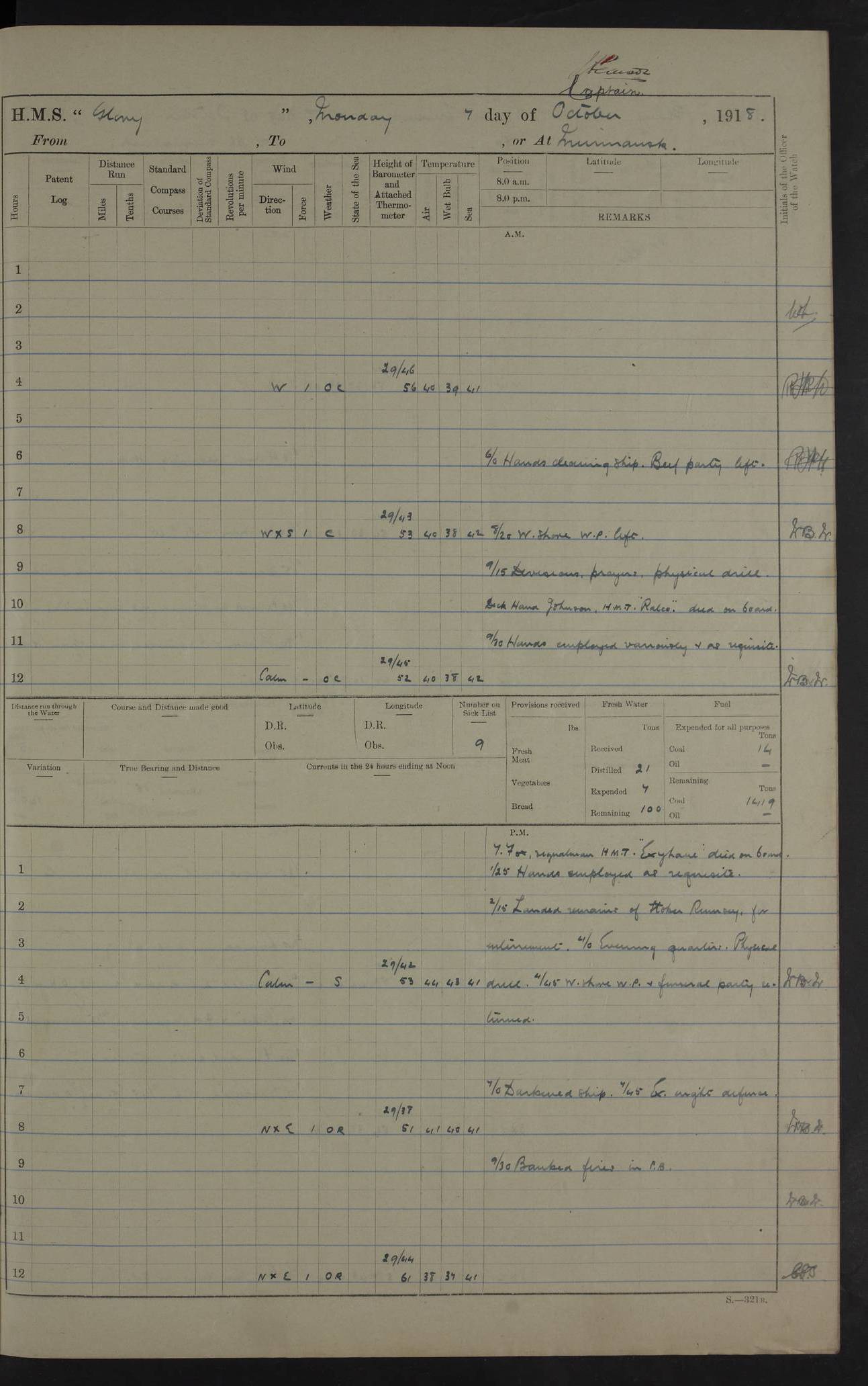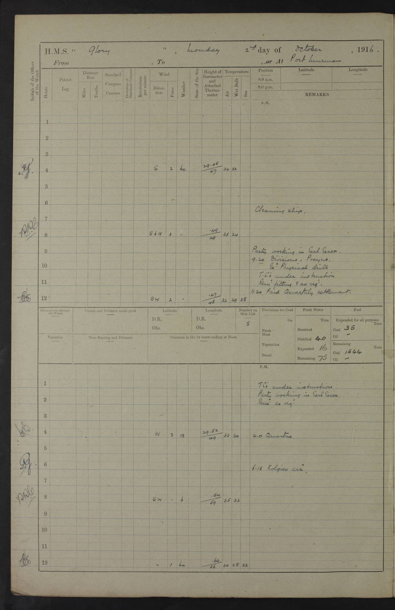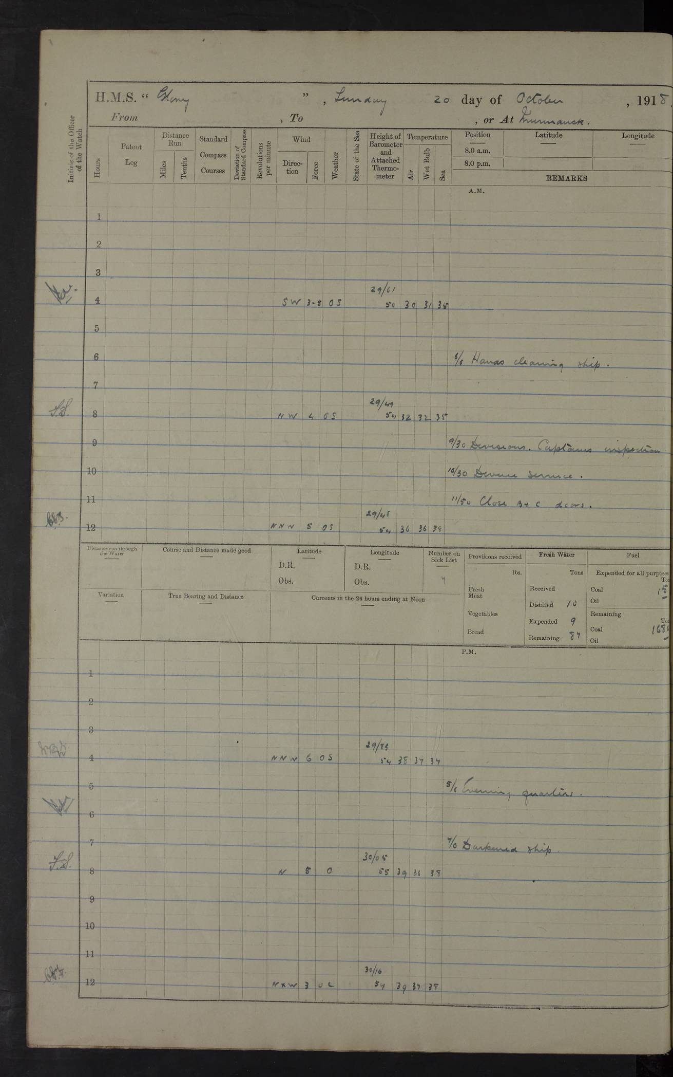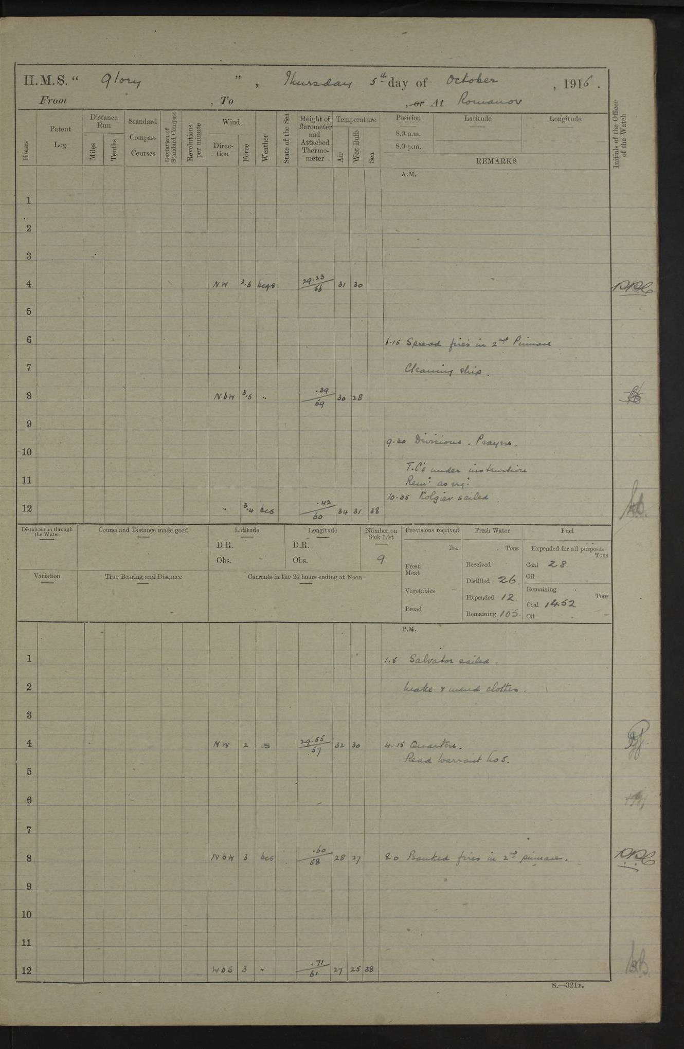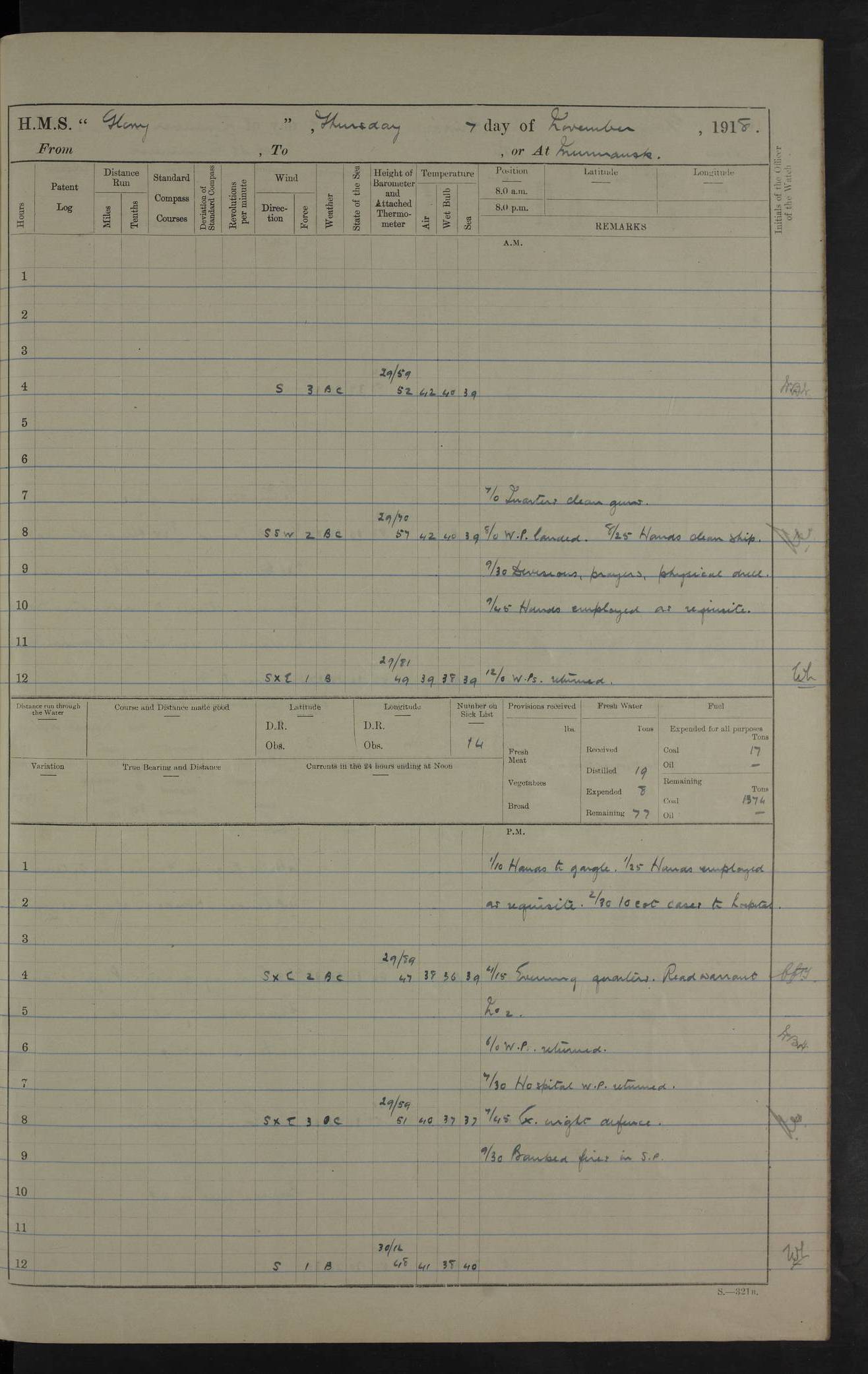 LOGS FOR OCTOBER 1916 For the period covered by the remainder of these logs (1 October, 1916 to 31 December 1918), HMS Glory was based at Murmansk, northern Russia. The city had a variety of names in the early 20th Century – including, Port Murman, Romanov and Murmansk. The location will be given in these pages as Murmansk, the modern name. A history of Murmansk’s names is available at http://en.wikipedia.org/wiki/Murmansk . 4f961482a2fc8e2def0011c7: (http://s3.amazonaws.com/oldweather/ADM53-43026/ADM 53-43026-001_0.jpg) This log is to be kept in a cover in future 4f961482a2fc8e2def0011c8: (http://s3.amazonaws.com/oldweather/ADM53-43026/ADM 53-43026-001_1.jpg) 4f961482a2fc8e2def0011c9: (http://s3.amazonaws.com/oldweather/ADM53-43026/ADM 53-43026-002_0.jpg) 4f961483a2fc8e2def0011ca: (http://s3.amazonaws.com/oldweather/ADM53-43026/ADM 53-43026-002_1.jpg) 4f961483a2fc8e2def0011cb: (http://s3.amazonaws.com/oldweather/ADM53-43026/ADM 53-43026-003_0.jpg) 4f961483a2fc8e2def0011cc: (http://s3.amazonaws.com/oldweather/ADM53-43026/ADM 53-43026-003_1.jpg) 1 October 1916 Murmansk Lat 69.03, Long 33.05 5.40am: Russian auxiliary Kolgiev sailed. Information regarding this vessel (or similar name) has not been found. 7.30am: Celebrated Holy Communion. am: Party working in Earl Essex. Earl Essex was a hired trawler of 225 grt, built, in 1914. Sourced from F.J. Dittmar & J.J. Colledge (1972) – British warships 1914–1919, Ian Allan. 10.45am: Held Divine Service. 11.30am: Celebrated Holy Communion. 4.45pm: Out nets. 4f961484a2fc8e2def0011cd: (http://s3.amazonaws.com/oldweather/ADM53-43026/ADM 53-43026-004_0.jpg) 2 October 1916 Murmansk Lat 69.03, Long 33.05 am: Party working in Earl Essex. 11.30am: Paid quarterly settlement. 6.15pm: Kolgiev arrived. 4f961484a2fc8e2def0011ce: (http://s3.amazonaws.com/oldweather/ADM53-43026/ADM 53-43026-004_1.jpg) 3 October 1916 Murmansk Lat 69.03, Long 33.05 Number on sick list: 9 9.20am: Aft port nets. 11.30am: Russian TBs Goorovoi and Plasteevyi(?) arrived. The first of these TBs is possibly ‘Grosovoi’, built at Le Havre around 1900. Her fate is unclear. The name of the second vessel is possibly incorrect, but no near match has been found. 1.30pm: Out port nets. 4f961484a2fc8e2def0011cf: (http://s3.amazonaws.com/oldweather/ADM53-43026/ADM 53-43026-005_0.jpg) 4 October 1916 Murmansk Lat 69.03, Long 33.05 8.30am: Salvator - broad pendant of Commodore T.W. Kemp arrived. Salvator (ex–Katoomba) was a hired yacht of 684 tons gross, built in 1903. She served as the Heliopolis in WW2. Details at WW1NavyBritishShips-Dittmar4AP.htm . 9.25am: Aft port nets. 11.05am: HE the Minister of Marine visited ship. 11.30am: Out port nets. 11.50am: Russian auxiliary Gotowsci(?) arrived. 12 noon: Kolgiev sailed. pm: HM Tug Blackcock arrived. Blackcock was a hired patrol tug, built in 1886 and wrecked on 18 January, 1918, in the White Sea. Sourced from F.J. Dittmar & J.J. Colledge (1972) – British warships 1914–1919, Ian Allan. 6.50pm: Kolgiev arrived. 4f961485a2fc8e2def0011d0: (http://s3.amazonaws.com/oldweather/ADM53-43026/ADM 53-43026-005_1.jpg) 5 October 1916 Murmansk Lat 69.03, Long 33.05 10.35am: Kolgiev sailed. 1.05pm: Salvator sailed. pm: Read Warrant No. 5. 4f961485a2fc8e2def0011d1: (http://s3.amazonaws.com/oldweather/ADM53-43026/ADM 53-43026-006_0.jpg) 6 October 1916 Murmansk Lat 69.03, Long 33.05 pm: 5 tons of water supplied to Blackcock. 3.30pm: Action. 3.45pm: Secure. Russian T.B's Grosovoi and Plasteevyi sailed. 4f961485a2fc8e2def0011d2: (http://s3.amazonaws.com/oldweather/ADM53-43026/ADM 53-43026-006_1.jpg) 7 October 1916 Murmansk Lat 69.03, Long 33.05 am: Party coaling trawler. am: Tested life buoys – correct. 4f961486a2fc8e2def0011d3: (http://s3.amazonaws.com/oldweather/ADM53-43026/ADM 53-43026-007_0.jpg) 8 October 1916 Murmansk Lat 69.03, Long 33.05 6.45am: Party working in collier. 7.30am: Celebrated Holy Communion. 10.45am: Held Divine service. 5.45pm: Held Divine Service. 4f961486a2fc8e2def0011d4: (http://s3.amazonaws.com/oldweather/ADM53-43026/ADM 53-43026-007_1.jpg) 9 October 1916 Murmansk Lat 69.03, Long 33.05 Number on sick list: 9 am: Exercised fire stations. am: 2nd pinnace patrolling. pm: Landed marines for drill. 4f961486a2fc8e2def0011d5: (http://s3.amazonaws.com/oldweather/ADM53-43026/ADM 53-43026-008_0.jpg) 10 October 1916 Murmansk Lat 69.03, Long 33.05 am: Steam pinnace patrolling. 1.55pm: Kolgiev arrived. 4f961487a2fc8e2def0011d6: (http://s3.amazonaws.com/oldweather/ADM53-43026/ADM 53-43026-008_1.jpg) 11 October 1916 Murmansk Lat 69.03, Long 33.05 am: Party working on boom defence. am: MT and QD men aired bedding. am: Marines at drill. 1.50pm: Kolgiev sailed. 3.15pm: British tug Racia (lighter ES 23 in tow) arrived. Racia was a hired screw tug of 410 grt, built in 1894 and sold on 23 June, 1920. Sourced from F.J. Dittmar & J.J. Colledge (1972) – British warships 1914–1919, Ian Allan. 4f961487a2fc8e2def0011d7: (http://s3.amazonaws.com/oldweather/ADM53-43026/ADM 53-43026-009_0.jpg) 12 October 1916 Murmansk Lat 69.03, Long 33.05 Number on sick list: 6 am: Party working on boom defence. am: Steam pinnace patrolling. pm: Make and mend clothes. 4.15pm: Read warrant No. 6. 6.00pm: Imperator Nicolas arrived. A vessel with this name has not been traced. 4f961487a2fc8e2def0011d8: (http://s3.amazonaws.com/oldweathe/ADM53-43026/ADM 53-43026-009_1.jpg) 13 October 1916 Murmansk Lat 69.03, Long 33.05 am: Steam pinnace patrolling. am: Party working on boom defence. am: Found foc’sle awning and side screens damaged by rats. 4f961488a2fc8e2def0011d9: (http://s3.amazonaws.com/oldweather/ADM53-43026/ADM 53-43026-010_0.jpg) 14 August 1916 (probably should read October) Murmansk Lat 69.03, Long 33.05 Number on sick list: 7 6.45am: Racia (floating crane in tow) sailed. am: Party working on boom defence. am: Tested life buoys – correct. 3.00pm: Vindictive arrived. HMS Vindictive was a protected cruiser of the Arrogant class, launched in 1897 at Chatham Dockyar