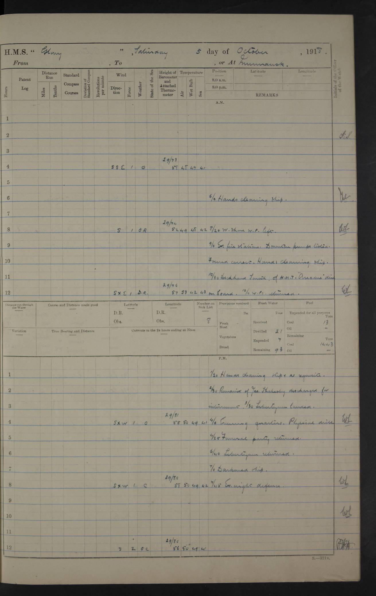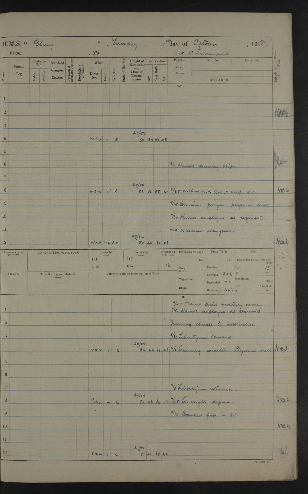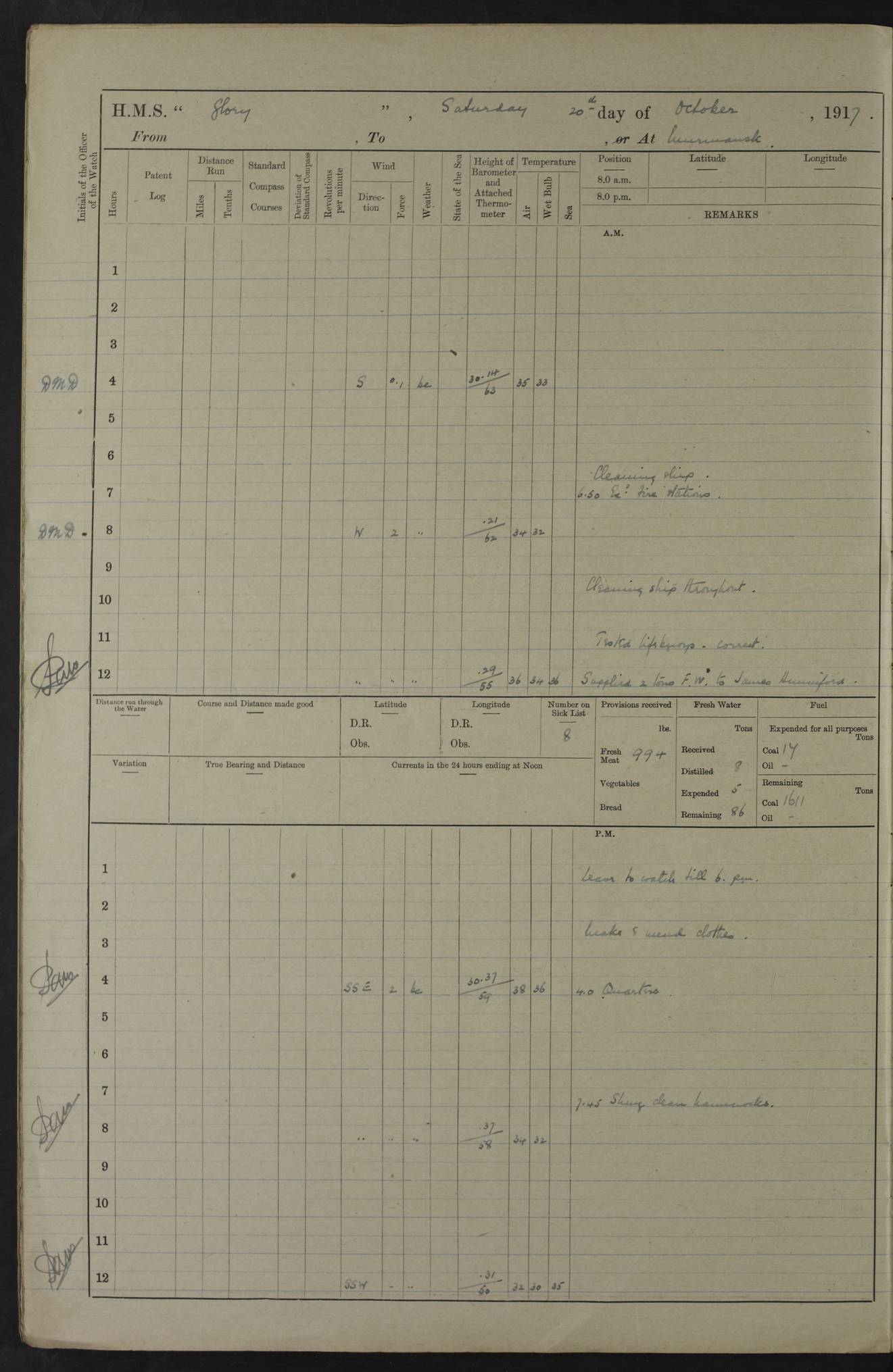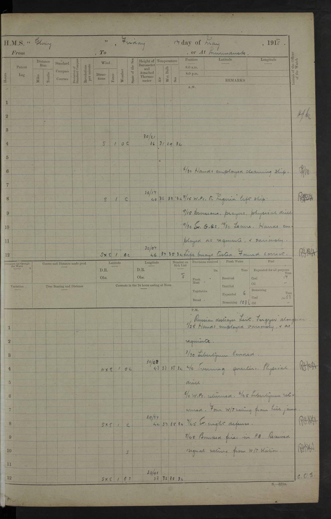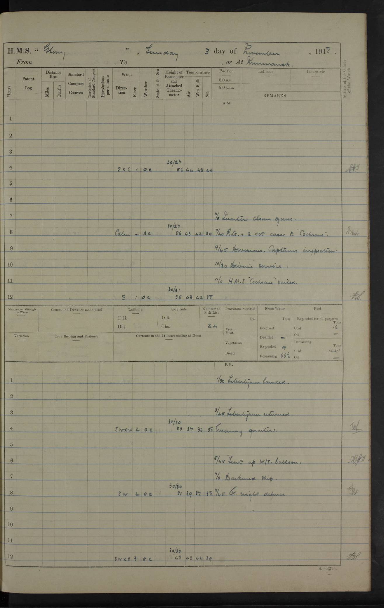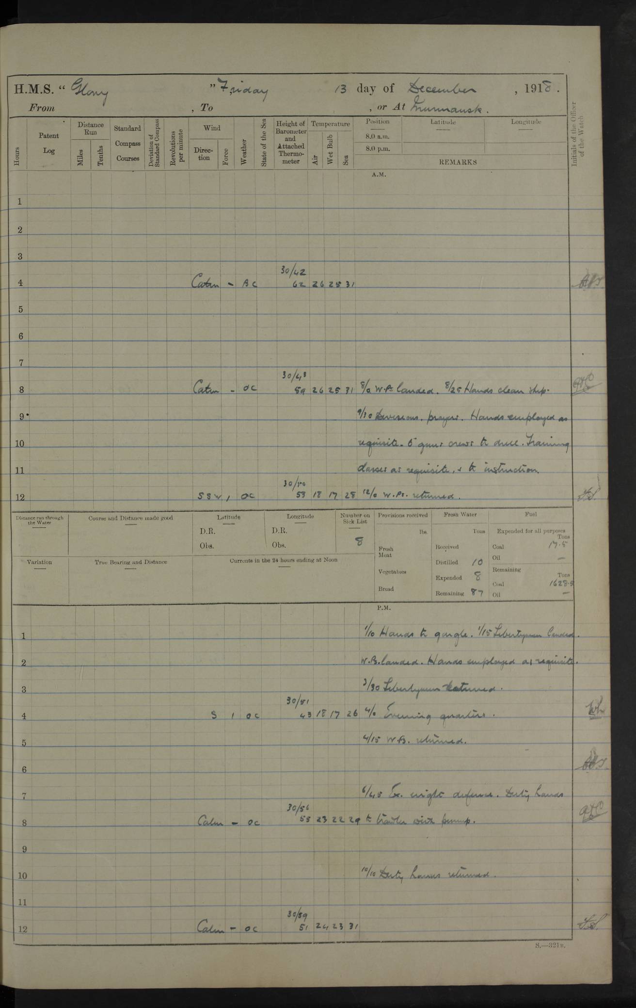 LOGS FOR OCTOBER 1916 For the period covered by the remainder of these logs (1 October, 1916 to 31 December 1918), HMS Glory was based at Murmansk, northern Russia. The city had a variety of names in the early 20th Century – including, Port Murman, Romanov and Murmansk. The location will be given in these pages as Murmansk, the modern name. A history of Murmansk’s names is available at http://en.wikipedia.org/wiki/Murmansk . 4f961482a2fc8e2def0011c7: (http://s3.amazonaws.com/oldweather/ADM53-43026/ADM 53-43026-001_0.jpg) This log is to be kept in a cover in future 4f961482a2fc8e2def0011c8: (http://s3.amazonaws.com/oldweather/ADM53-43026/ADM 53-43026-001_1.jpg) 4f961482a2fc8e2def0011c9: (http://s3.amazonaws.com/oldweather/ADM53-43026/ADM 53-43026-002_0.jpg) 4f961483a2fc8e2def0011ca: (http://s3.amazonaws.com/oldweather/ADM53-43026/ADM 53-43026-002_1.jpg) 4f961483a2fc8e2def0011cb: (http://s3.amazonaws.com/oldweather/ADM53-43026/ADM 53-43026-003_0.jpg) 4f961483a2fc8e2def0011cc: (http://s3.amazonaws.com/oldweather/ADM53-43026/ADM 53-43026-003_1.jpg) 1 October 1916 Murmansk Lat 69.03, Long 33.05 5.40am: Russian auxiliary Kolgiev sailed. Information regarding this vessel (or similar name) has not been found. 7.30am: Celebrated Holy Communion. am: Party working in Earl Essex. Earl Essex was a hired trawler of 225 grt, built, in 1914. Sourced from F.J. Dittmar & J.J. Colledge (1972) – British warships 1914–1919, Ian Allan. 10.45am: Held Divine Service. 11.30am: Celebrated Holy Communion. 4.45pm: Out nets. 4f961484a2fc8e2def0011cd: (http://s3.amazonaws.com/oldweather/ADM53-43026/ADM 53-43026-004_0.jpg) 2 October 1916 Murmansk Lat 69.03, Long 33.05 am: Party working in Earl Essex. 11.30am: Paid quarterly settlement. 6.15pm: Kolgiev arrived. 4f961484a2fc8e2def0011ce: (http://s3.amazonaws.com/oldweather/ADM53-43026/ADM 53-43026-004_1.jpg) 3 October 1916 Murmansk Lat 69.03, Long 33.05 Number on sick list: 9 9.20am: Aft port nets. 11.30am: Russian TBs Goorovoi and Plasteevyi(?) arrived. The first of these TBs is possibly ‘Grosovoi’, built at Le Havre around 1900. Her fate is unclear. The name of the second vessel is possibly incorrect, but no near match has been found. 1.30pm: Out port nets. 4f961484a2fc8e2def0011cf: (http://s3.amazonaws.com/oldweather/ADM53-43026/ADM 53-43026-005_0.jpg) 4 October 1916 Murmansk Lat 69.03, Long 33.05 8.30am: Salvator - broad pendant of Commodore T.W. Kemp arrived. Salvator (ex–Katoomba) was a hired yacht of 684 tons gross, built in 1903. She served as the Heliopolis in WW2. Details at WW1NavyBritishShips-Dittmar4AP.htm . 9.25am: Aft port nets. 11.05am: HE the Minister of Marine visited ship. 11.30am: Out port nets. 11.50am: Russian auxiliary Gotowsci(?) arrived. 12 noon: Kolgiev sailed. pm: HM Tug Blackcock arrived. Blackcock was a hired patrol tug, built in 1886 and wrecked on 18 January, 1918, in the White Sea. Sourced from F.J. Dittmar & J.J. Colledge (1972) – British warships 1914–1919, Ian Allan. 6.50pm: Kolgiev arrived. 4f961485a2fc8e2def0011d0: (http://s3.amazonaws.com/oldweather/ADM53-43026/ADM 53-43026-005_1.jpg) 5 October 1916 Murmansk Lat 69.03, Long 33.05 10.35am: Kolgiev sailed. 1.05pm: Salvator sailed. pm: Read Warrant No. 5. 4f961485a2fc8e2def0011d1: (http://s3.amazonaws.com/oldweather/ADM53-43026/ADM 53-43026-006_0.jpg) 6 October 1916 Murmansk Lat 69.03, Long 33.05 pm: 5 tons of water supplied to Blackcock. 3.30pm: Action. 3.45pm: Secure. Russian T.B's Grosovoi and Plasteevyi sailed. 4f961485a2fc8e2def0011d2: (http://s3.amazonaws.com/oldweather/ADM53-43026/ADM 53-43026-006_1.jpg) 7 October 1916 Murmansk Lat 69.03, Long 33.05 am: Party coaling trawler. am: Tested life buoys – correct. 4f961486a2fc8e2def0011d3: (http://s3.amazonaws.com/oldweather/ADM53-43026/ADM 53-43026-007_0.jpg) 8 October 1916 Murmansk Lat 69.03, Long 33.05 6.45am: Party working in collier. 7.30am: Celebrated Holy Communion. 10.45am: Held Divine service. 5.45pm: Held Divine Service. 4f961486a2fc8e2def0011d4: (http://s3.amazonaws.com/oldweather/ADM53-43026/ADM 53-43026-007_1.jpg) 9 October 1916 Murmansk Lat 69.03, Long 33.05 Number on sick list: 9 am: Exercised fire stations. am: 2nd pinnace patrolling. pm: Landed marines for drill. 4f961486a2fc8e2def0011d5: (http://s3.amazonaws.com/oldweather/ADM53-43026/ADM 53-43026-008_0.jpg) 10 October 1916 Murmansk Lat 69.03, Long 33.05 am: Steam pinnace patrolling. 1.55pm: Kolgiev arrived. 4f961487a2fc8e2def0011d6: (http://s3.amazonaws.com/oldweather/ADM53-43026/ADM 53-43026-008_1.jpg) 11 October 1916 Murmansk Lat 69.03, Long 33.05 am: Party working on boom defence. am: MT and QD men aired bedding. am: Marines at drill. 1.50pm: Kolgiev sailed. 3.15pm: British tug Racia (lighter ES 23 in tow) arrived. Racia was a hired screw tug of 410 grt, built in 1894 and sold on 23 June, 1920. Sourced from F.J. Dittmar & J.J. Colledge (1972) – British warships 1914–1919, Ian Allan. 4f961487a2fc8e2def0011d7: (http://s3.amazonaws.com/oldweather/ADM53-43026/ADM 53-43026-009_0.jpg) 12 October 1916 Murmansk Lat 69.03, Long 33.05 Number on sick list: 6 am: Party working on boom defence. am: Steam pinnace patrolling. pm: Make and mend clothes. 4.15pm: Read warrant No. 6. 6.00pm: Imperator Nicolas arrived. A vessel with this name has not been traced. 4f961487a2fc8e2def0011d8: (http://s3.amazonaws.com/oldweathe/ADM53-43026/ADM 53-43026-009_1.jpg) 13 October 1916 Murmansk Lat 69.03, Long 33.05 am: Steam pinnace patrolling. am: Party working on boom defence. am: Found foc’sle awning and side screens damaged by rats. 4f961488a2fc8e2def0011d9: (http://s3.amazonaws.com/oldweather/ADM53-43026/ADM 53-43026-010_0.jpg) 14 August 1916 (probably should read October) Murmansk Lat 69.03, Long 33.05 Number on sick list: 7 6.45am: Racia (floating crane in tow) sailed. am: Party working on boom defence. am: Tested life buoys – correct. 3.00pm: Vindictive arrived. HMS Vindictive was a protected cruiser of the Arrogant class, launched in 1897 at Chatham Dockyar