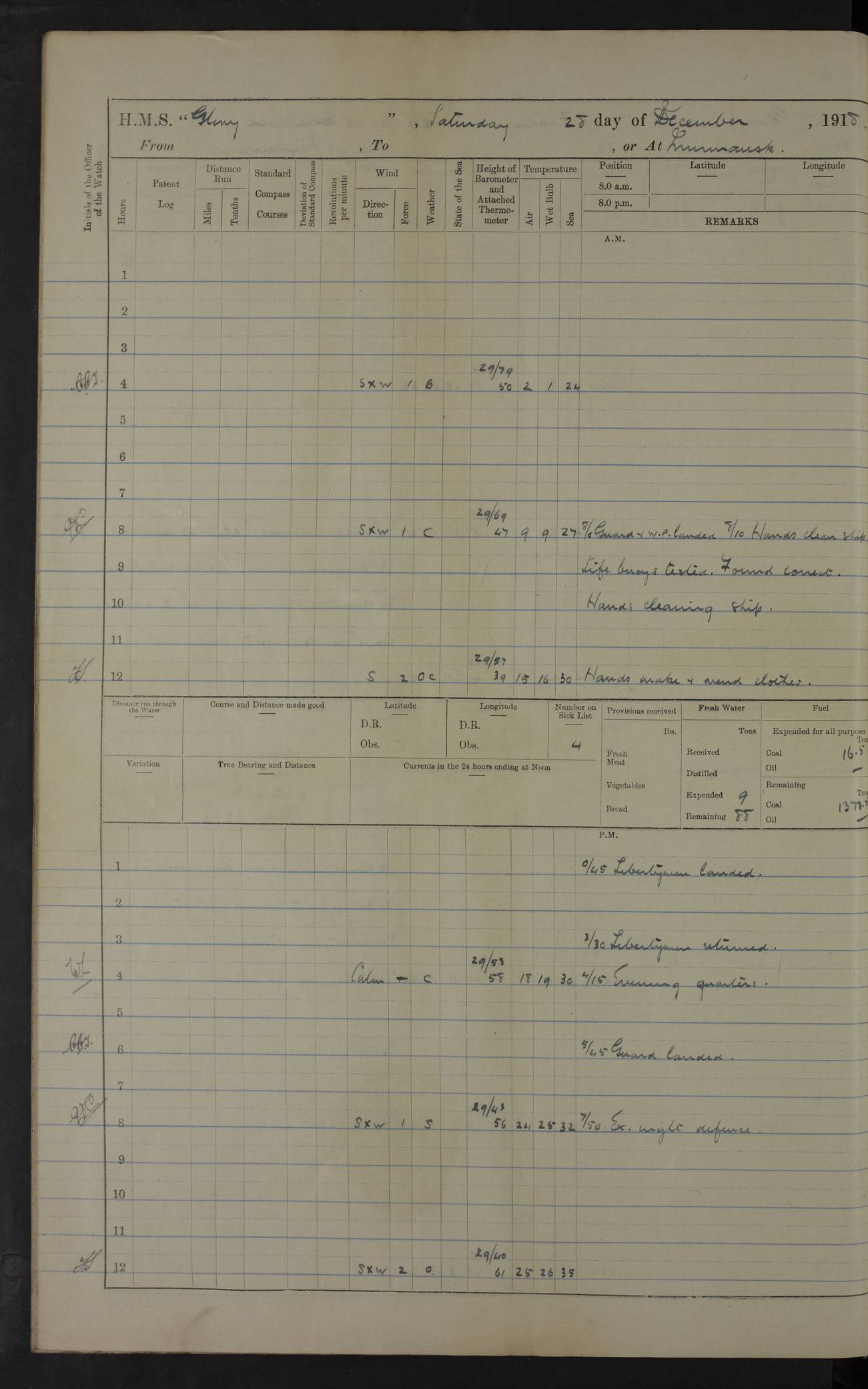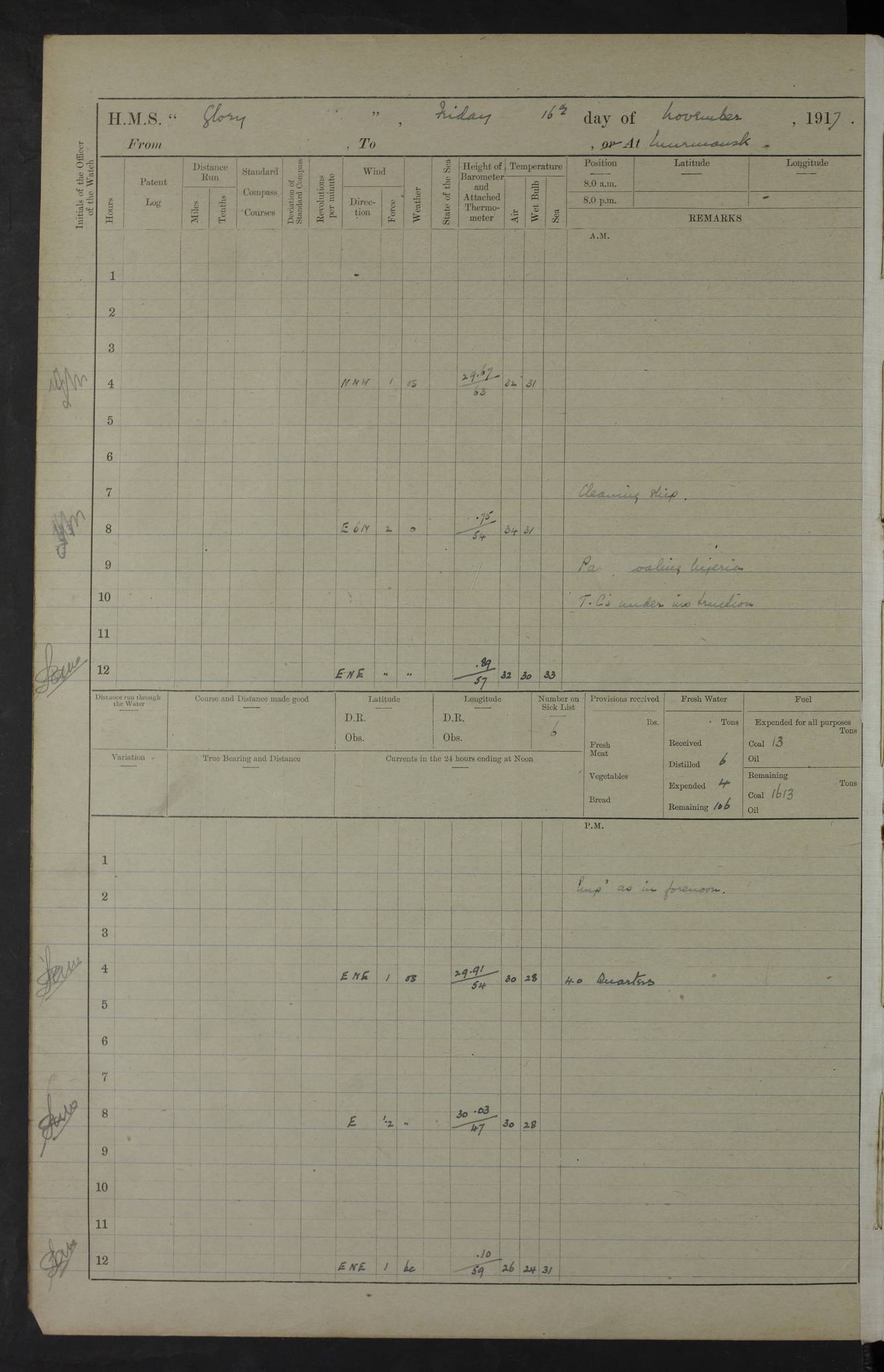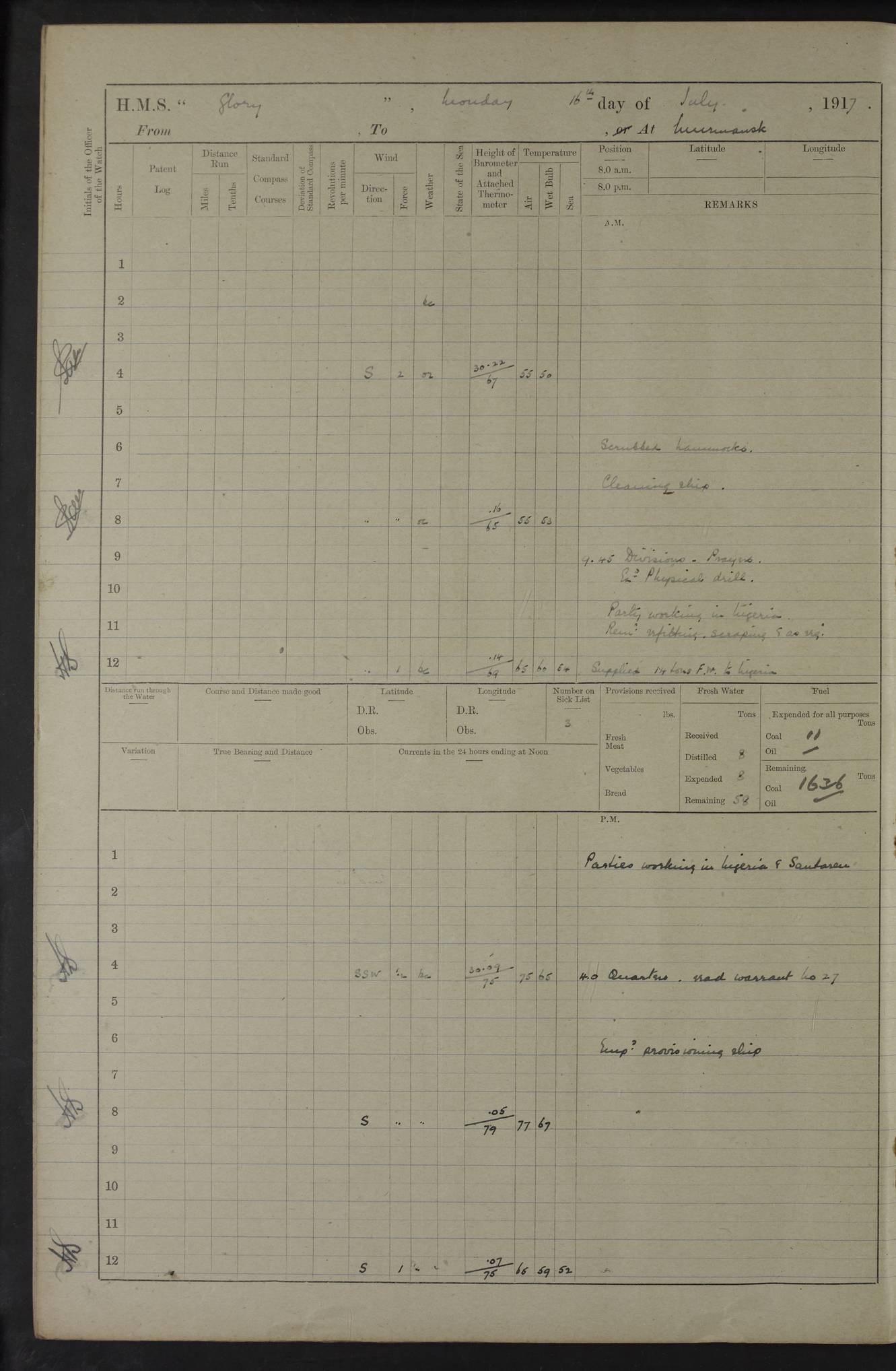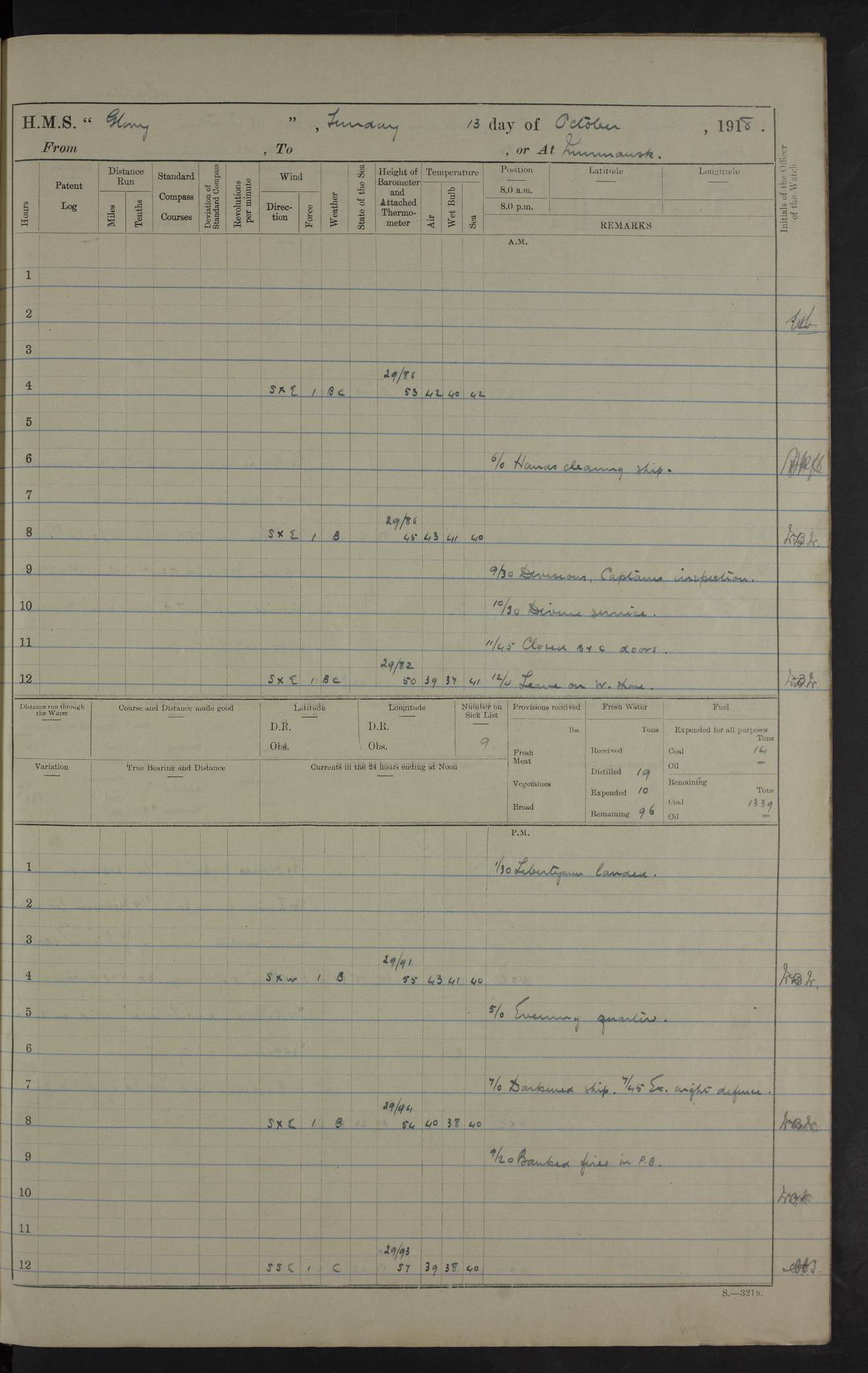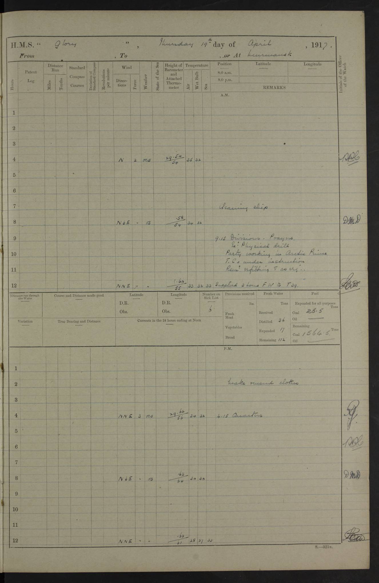 LOGS FOR OCTOBER 1916 For the period covered by the remainder of these logs (1 October, 1916 to 31 December 1918), HMS Glory was based at Murmansk, northern Russia. The city had a variety of names in the early 20th Century – including, Port Murman, Romanov and Murmansk. The location will be given in these pages as Murmansk, the modern name. A history of Murmansk’s names is available at http://en.wikipedia.org/wiki/Murmansk . 4f961482a2fc8e2def0011c7: (http://s3.amazonaws.com/oldweather/ADM53-43026/ADM 53-43026-001_0.jpg) This log is to be kept in a cover in future 4f961482a2fc8e2def0011c8: (http://s3.amazonaws.com/oldweather/ADM53-43026/ADM 53-43026-001_1.jpg) 4f961482a2fc8e2def0011c9: (http://s3.amazonaws.com/oldweather/ADM53-43026/ADM 53-43026-002_0.jpg) 4f961483a2fc8e2def0011ca: (http://s3.amazonaws.com/oldweather/ADM53-43026/ADM 53-43026-002_1.jpg) 4f961483a2fc8e2def0011cb: (http://s3.amazonaws.com/oldweather/ADM53-43026/ADM 53-43026-003_0.jpg) 4f961483a2fc8e2def0011cc: (http://s3.amazonaws.com/oldweather/ADM53-43026/ADM 53-43026-003_1.jpg) 1 October 1916 Murmansk Lat 69.03, Long 33.05 5.40am: Russian auxiliary Kolgiev sailed. Information regarding this vessel (or similar name) has not been found. 7.30am: Celebrated Holy Communion. am: Party working in Earl Essex. Earl Essex was a hired trawler of 225 grt, built, in 1914. Sourced from F.J. Dittmar & J.J. Colledge (1972) – British warships 1914–1919, Ian Allan. 10.45am: Held Divine Service. 11.30am: Celebrated Holy Communion. 4.45pm: Out nets. 4f961484a2fc8e2def0011cd: (http://s3.amazonaws.com/oldweather/ADM53-43026/ADM 53-43026-004_0.jpg) 2 October 1916 Murmansk Lat 69.03, Long 33.05 am: Party working in Earl Essex. 11.30am: Paid quarterly settlement. 6.15pm: Kolgiev arrived. 4f961484a2fc8e2def0011ce: (http://s3.amazonaws.com/oldweather/ADM53-43026/ADM 53-43026-004_1.jpg) 3 October 1916 Murmansk Lat 69.03, Long 33.05 Number on sick list: 9 9.20am: Aft port nets. 11.30am: Russian TBs Goorovoi and Plasteevyi(?) arrived. The first of these TBs is possibly ‘Grosovoi’, built at Le Havre around 1900. Her fate is unclear. The name of the second vessel is possibly incorrect, but no near match has been found. 1.30pm: Out port nets. 4f961484a2fc8e2def0011cf: (http://s3.amazonaws.com/oldweather/ADM53-43026/ADM 53-43026-005_0.jpg) 4 October 1916 Murmansk Lat 69.03, Long 33.05 8.30am: Salvator - broad pendant of Commodore T.W. Kemp arrived. Salvator (ex–Katoomba) was a hired yacht of 684 tons gross, built in 1903. She served as the Heliopolis in WW2. Details at WW1NavyBritishShips-Dittmar4AP.htm . 9.25am: Aft port nets. 11.05am: HE the Minister of Marine visited ship. 11.30am: Out port nets. 11.50am: Russian auxiliary Gotowsci(?) arrived. 12 noon: Kolgiev sailed. pm: HM Tug Blackcock arrived. Blackcock was a hired patrol tug, built in 1886 and wrecked on 18 January, 1918, in the White Sea. Sourced from F.J. Dittmar & J.J. Colledge (1972) – British warships 1914–1919, Ian Allan. 6.50pm: Kolgiev arrived. 4f961485a2fc8e2def0011d0: (http://s3.amazonaws.com/oldweather/ADM53-43026/ADM 53-43026-005_1.jpg) 5 October 1916 Murmansk Lat 69.03, Long 33.05 10.35am: Kolgiev sailed. 1.05pm: Salvator sailed. pm: Read Warrant No. 5. 4f961485a2fc8e2def0011d1: (http://s3.amazonaws.com/oldweather/ADM53-43026/ADM 53-43026-006_0.jpg) 6 October 1916 Murmansk Lat 69.03, Long 33.05 pm: 5 tons of water supplied to Blackcock. 3.30pm: Action. 3.45pm: Secure. Russian T.B's Grosovoi and Plasteevyi sailed. 4f961485a2fc8e2def0011d2: (http://s3.amazonaws.com/oldweather/ADM53-43026/ADM 53-43026-006_1.jpg) 7 October 1916 Murmansk Lat 69.03, Long 33.05 am: Party coaling trawler. am: Tested life buoys – correct. 4f961486a2fc8e2def0011d3: (http://s3.amazonaws.com/oldweather/ADM53-43026/ADM 53-43026-007_0.jpg) 8 October 1916 Murmansk Lat 69.03, Long 33.05 6.45am: Party working in collier. 7.30am: Celebrated Holy Communion. 10.45am: Held Divine service. 5.45pm: Held Divine Service. 4f961486a2fc8e2def0011d4: (http://s3.amazonaws.com/oldweather/ADM53-43026/ADM 53-43026-007_1.jpg) 9 October 1916 Murmansk Lat 69.03, Long 33.05 Number on sick list: 9 am: Exercised fire stations. am: 2nd pinnace patrolling. pm: Landed marines for drill. 4f961486a2fc8e2def0011d5: (http://s3.amazonaws.com/oldweather/ADM53-43026/ADM 53-43026-008_0.jpg) 10 October 1916 Murmansk Lat 69.03, Long 33.05 am: Steam pinnace patrolling. 1.55pm: Kolgiev arrived. 4f961487a2fc8e2def0011d6: (http://s3.amazonaws.com/oldweather/ADM53-43026/ADM 53-43026-008_1.jpg) 11 October 1916 Murmansk Lat 69.03, Long 33.05 am: Party working on boom defence. am: MT and QD men aired bedding. am: Marines at drill. 1.50pm: Kolgiev sailed. 3.15pm: British tug Racia (lighter ES 23 in tow) arrived. Racia was a hired screw tug of 410 grt, built in 1894 and sold on 23 June, 1920. Sourced from F.J. Dittmar & J.J. Colledge (1972) – British warships 1914–1919, Ian Allan. 4f961487a2fc8e2def0011d7: (http://s3.amazonaws.com/oldweather/ADM53-43026/ADM 53-43026-009_0.jpg) 12 October 1916 Murmansk Lat 69.03, Long 33.05 Number on sick list: 6 am: Party working on boom defence. am: Steam pinnace patrolling. pm: Make and mend clothes. 4.15pm: Read warrant No. 6. 6.00pm: Imperator Nicolas arrived. A vessel with this name has not been traced. 4f961487a2fc8e2def0011d8: (http://s3.amazonaws.com/oldweathe/ADM53-43026/ADM 53-43026-009_1.jpg) 13 October 1916 Murmansk Lat 69.03, Long 33.05 am: Steam pinnace patrolling. am: Party working on boom defence. am: Found foc’sle awning and side screens damaged by rats. 4f961488a2fc8e2def0011d9: (http://s3.amazonaws.com/oldweather/ADM53-43026/ADM 53-43026-010_0.jpg) 14 August 1916 (probably should read October) Murmansk Lat 69.03, Long 33.05 Number on sick list: 7 6.45am: Racia (floating crane in tow) sailed. am: Party working on boom defence. am: Tested life buoys – correct. 3.00pm: Vindictive arrived. HMS Vindictive was a protected cruiser of the Arrogant class, launched in 1897 at Chatham Dockyar