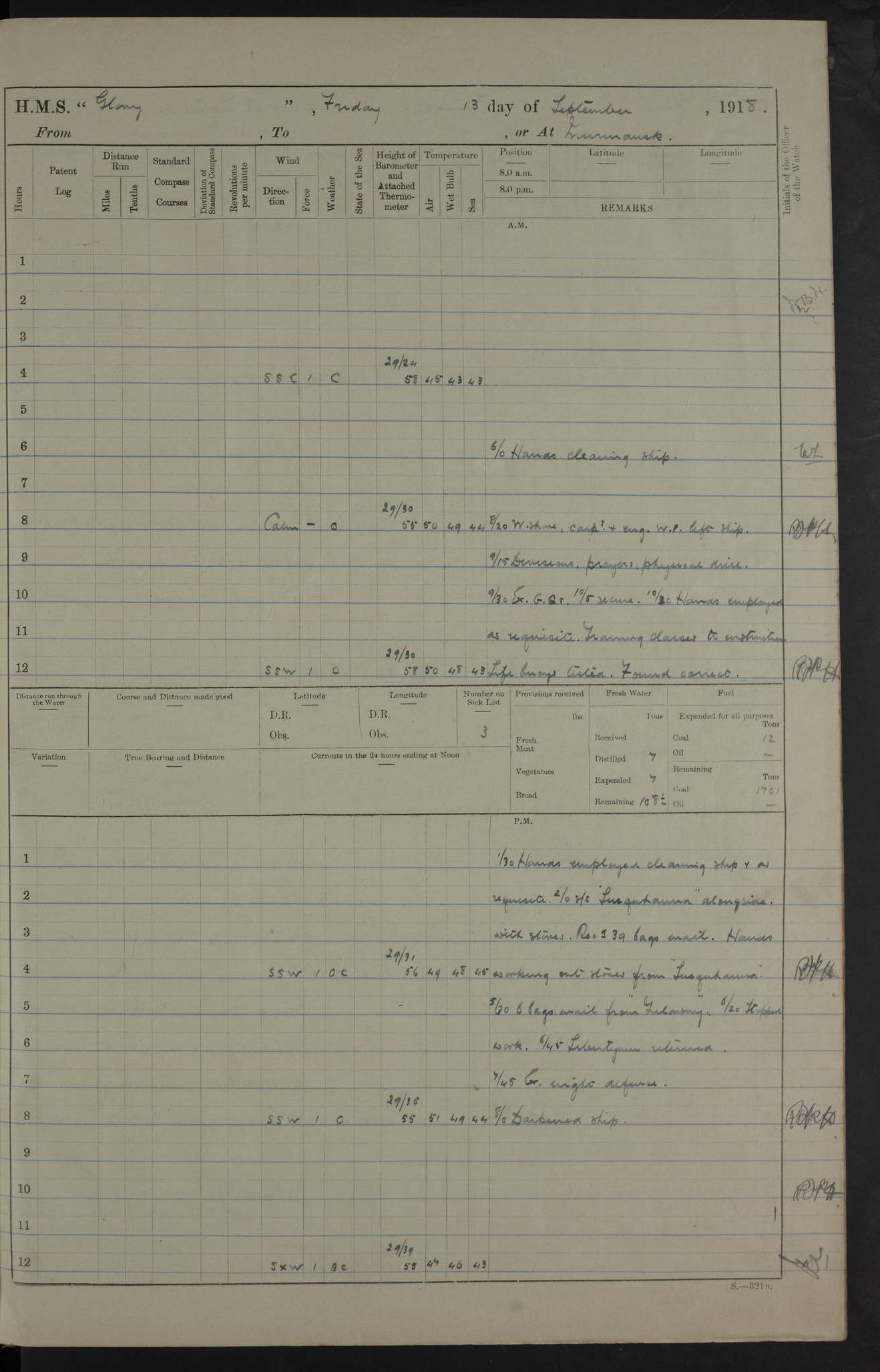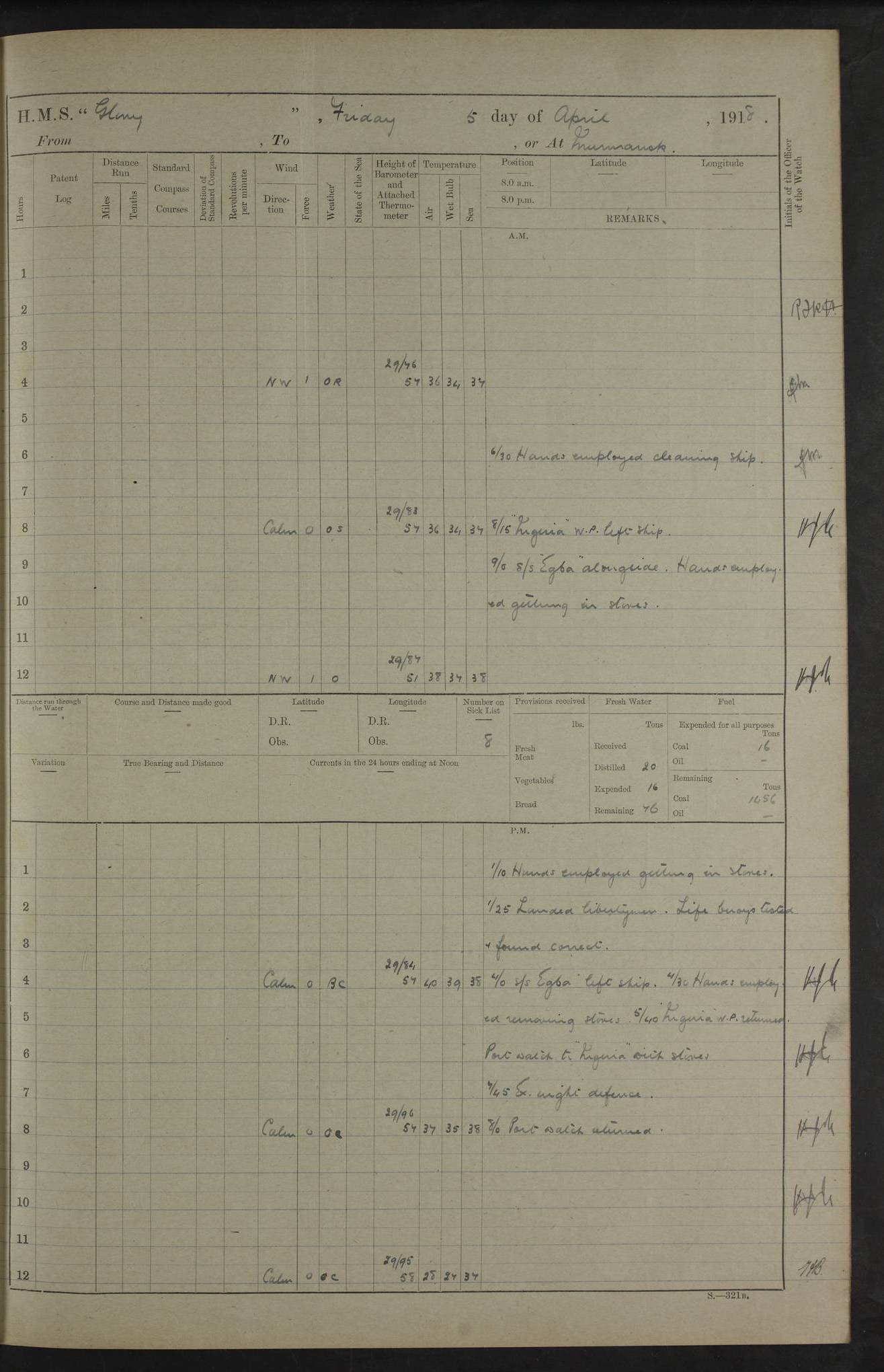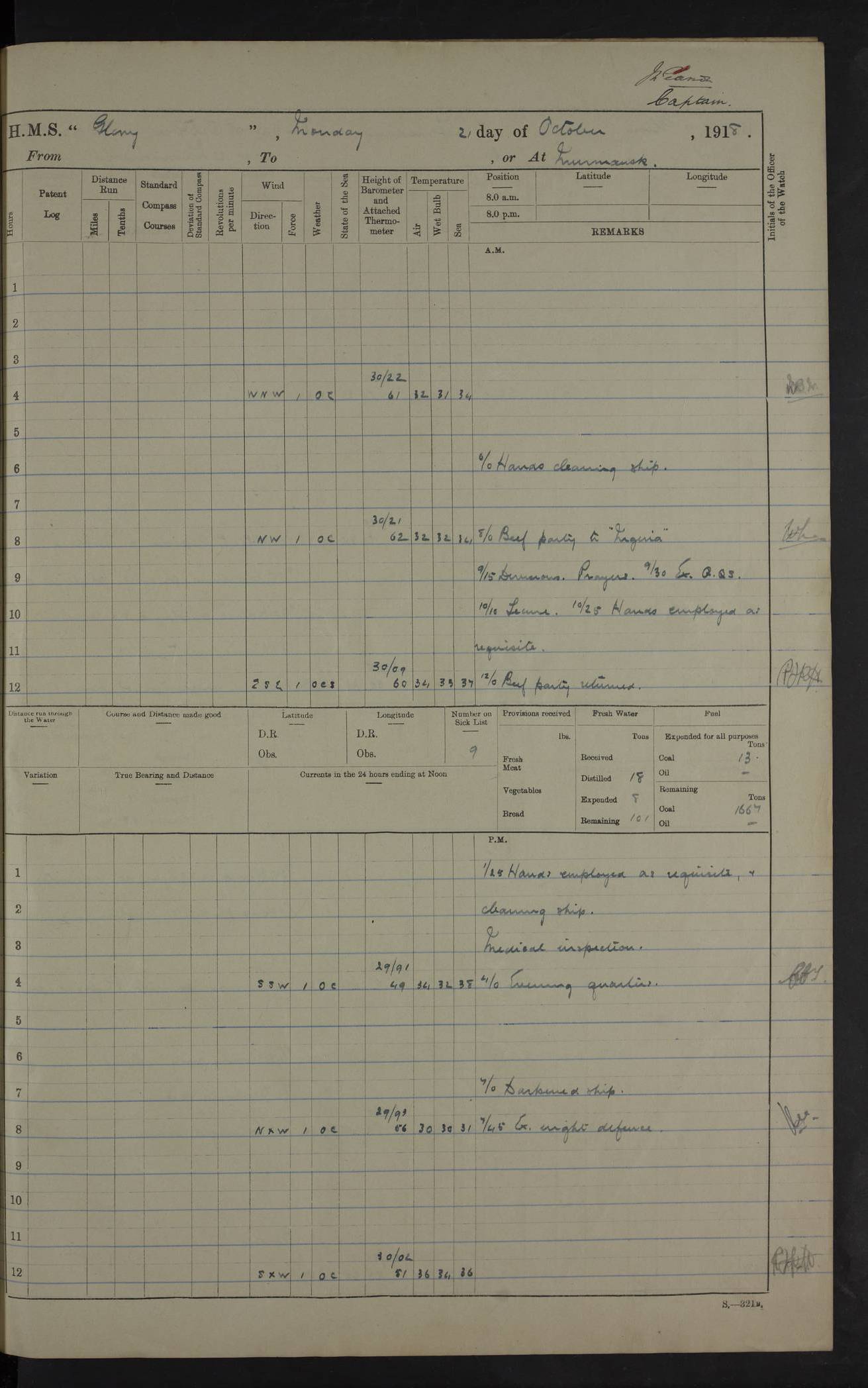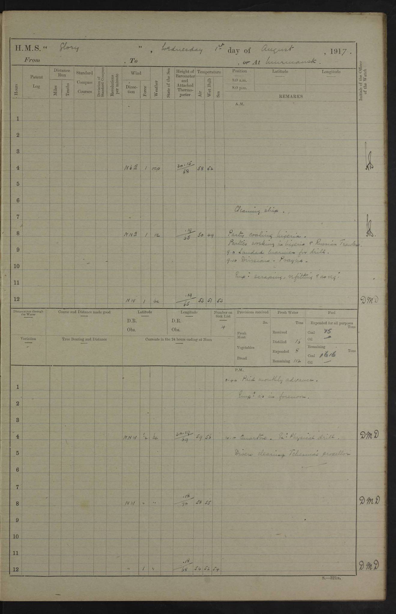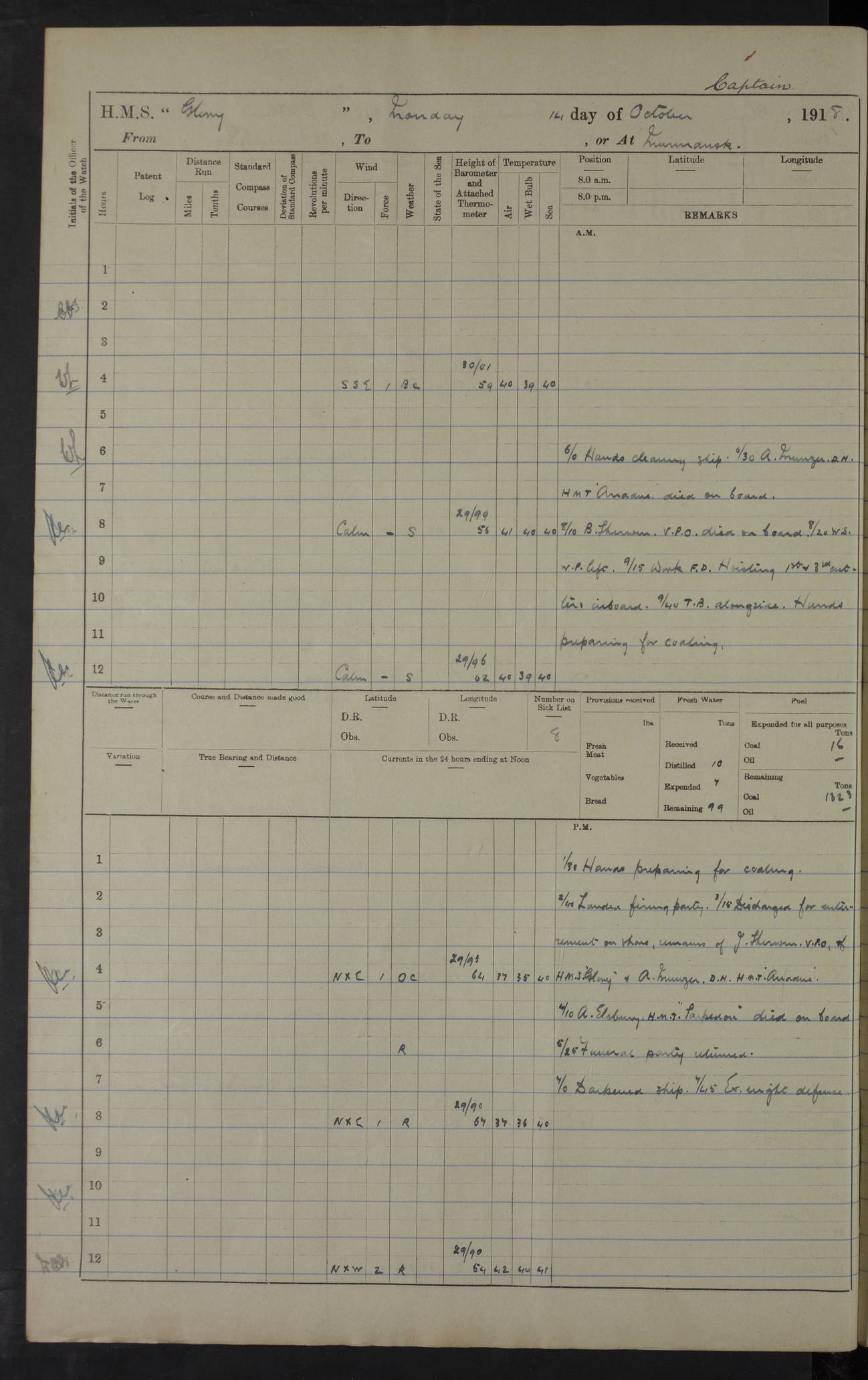 LOGS FOR OCTOBER 1916 For the period covered by the remainder of these logs (1 October, 1916 to 31 December 1918), HMS Glory was based at Murmansk, northern Russia. The city had a variety of names in the early 20th Century – including, Port Murman, Romanov and Murmansk. The location will be given in these pages as Murmansk, the modern name. A history of Murmansk’s names is available at http://en.wikipedia.org/wiki/Murmansk . 4f961482a2fc8e2def0011c7: (http://s3.amazonaws.com/oldweather/ADM53-43026/ADM 53-43026-001_0.jpg) This log is to be kept in a cover in future 4f961482a2fc8e2def0011c8: (http://s3.amazonaws.com/oldweather/ADM53-43026/ADM 53-43026-001_1.jpg) 4f961482a2fc8e2def0011c9: (http://s3.amazonaws.com/oldweather/ADM53-43026/ADM 53-43026-002_0.jpg) 4f961483a2fc8e2def0011ca: (http://s3.amazonaws.com/oldweather/ADM53-43026/ADM 53-43026-002_1.jpg) 4f961483a2fc8e2def0011cb: (http://s3.amazonaws.com/oldweather/ADM53-43026/ADM 53-43026-003_0.jpg) 4f961483a2fc8e2def0011cc: (http://s3.amazonaws.com/oldweather/ADM53-43026/ADM 53-43026-003_1.jpg) 1 October 1916 Murmansk Lat 69.03, Long 33.05 5.40am: Russian auxiliary Kolgiev sailed. Information regarding this vessel (or similar name) has not been found. 7.30am: Celebrated Holy Communion. am: Party working in Earl Essex. Earl Essex was a hired trawler of 225 grt, built, in 1914. Sourced from F.J. Dittmar & J.J. Colledge (1972) – British warships 1914–1919, Ian Allan. 10.45am: Held Divine Service. 11.30am: Celebrated Holy Communion. 4.45pm: Out nets. 4f961484a2fc8e2def0011cd: (http://s3.amazonaws.com/oldweather/ADM53-43026/ADM 53-43026-004_0.jpg) 2 October 1916 Murmansk Lat 69.03, Long 33.05 am: Party working in Earl Essex. 11.30am: Paid quarterly settlement. 6.15pm: Kolgiev arrived. 4f961484a2fc8e2def0011ce: (http://s3.amazonaws.com/oldweather/ADM53-43026/ADM 53-43026-004_1.jpg) 3 October 1916 Murmansk Lat 69.03, Long 33.05 Number on sick list: 9 9.20am: Aft port nets. 11.30am: Russian TBs Goorovoi and Plasteevyi(?) arrived. The first of these TBs is possibly ‘Grosovoi’, built at Le Havre around 1900. Her fate is unclear. The name of the second vessel is possibly incorrect, but no near match has been found. 1.30pm: Out port nets. 4f961484a2fc8e2def0011cf: (http://s3.amazonaws.com/oldweather/ADM53-43026/ADM 53-43026-005_0.jpg) 4 October 1916 Murmansk Lat 69.03, Long 33.05 8.30am: Salvator - broad pendant of Commodore T.W. Kemp arrived. Salvator (ex–Katoomba) was a hired yacht of 684 tons gross, built in 1903. She served as the Heliopolis in WW2. Details at WW1NavyBritishShips-Dittmar4AP.htm . 9.25am: Aft port nets. 11.05am: HE the Minister of Marine visited ship. 11.30am: Out port nets. 11.50am: Russian auxiliary Gotowsci(?) arrived. 12 noon: Kolgiev sailed. pm: HM Tug Blackcock arrived. Blackcock was a hired patrol tug, built in 1886 and wrecked on 18 January, 1918, in the White Sea. Sourced from F.J. Dittmar & J.J. Colledge (1972) – British warships 1914–1919, Ian Allan. 6.50pm: Kolgiev arrived. 4f961485a2fc8e2def0011d0: (http://s3.amazonaws.com/oldweather/ADM53-43026/ADM 53-43026-005_1.jpg) 5 October 1916 Murmansk Lat 69.03, Long 33.05 10.35am: Kolgiev sailed. 1.05pm: Salvator sailed. pm: Read Warrant No. 5. 4f961485a2fc8e2def0011d1: (http://s3.amazonaws.com/oldweather/ADM53-43026/ADM 53-43026-006_0.jpg) 6 October 1916 Murmansk Lat 69.03, Long 33.05 pm: 5 tons of water supplied to Blackcock. 3.30pm: Action. 3.45pm: Secure. Russian T.B's Grosovoi and Plasteevyi sailed. 4f961485a2fc8e2def0011d2: (http://s3.amazonaws.com/oldweather/ADM53-43026/ADM 53-43026-006_1.jpg) 7 October 1916 Murmansk Lat 69.03, Long 33.05 am: Party coaling trawler. am: Tested life buoys – correct. 4f961486a2fc8e2def0011d3: (http://s3.amazonaws.com/oldweather/ADM53-43026/ADM 53-43026-007_0.jpg) 8 October 1916 Murmansk Lat 69.03, Long 33.05 6.45am: Party working in collier. 7.30am: Celebrated Holy Communion. 10.45am: Held Divine service. 5.45pm: Held Divine Service. 4f961486a2fc8e2def0011d4: (http://s3.amazonaws.com/oldweather/ADM53-43026/ADM 53-43026-007_1.jpg) 9 October 1916 Murmansk Lat 69.03, Long 33.05 Number on sick list: 9 am: Exercised fire stations. am: 2nd pinnace patrolling. pm: Landed marines for drill. 4f961486a2fc8e2def0011d5: (http://s3.amazonaws.com/oldweather/ADM53-43026/ADM 53-43026-008_0.jpg) 10 October 1916 Murmansk Lat 69.03, Long 33.05 am: Steam pinnace patrolling. 1.55pm: Kolgiev arrived. 4f961487a2fc8e2def0011d6: (http://s3.amazonaws.com/oldweather/ADM53-43026/ADM 53-43026-008_1.jpg) 11 October 1916 Murmansk Lat 69.03, Long 33.05 am: Party working on boom defence. am: MT and QD men aired bedding. am: Marines at drill. 1.50pm: Kolgiev sailed. 3.15pm: British tug Racia (lighter ES 23 in tow) arrived. Racia was a hired screw tug of 410 grt, built in 1894 and sold on 23 June, 1920. Sourced from F.J. Dittmar & J.J. Colledge (1972) – British warships 1914–1919, Ian Allan. 4f961487a2fc8e2def0011d7: (http://s3.amazonaws.com/oldweather/ADM53-43026/ADM 53-43026-009_0.jpg) 12 October 1916 Murmansk Lat 69.03, Long 33.05 Number on sick list: 6 am: Party working on boom defence. am: Steam pinnace patrolling. pm: Make and mend clothes. 4.15pm: Read warrant No. 6. 6.00pm: Imperator Nicolas arrived. A vessel with this name has not been traced. 4f961487a2fc8e2def0011d8: (http://s3.amazonaws.com/oldweathe/ADM53-43026/ADM 53-43026-009_1.jpg) 13 October 1916 Murmansk Lat 69.03, Long 33.05 am: Steam pinnace patrolling. am: Party working on boom defence. am: Found foc’sle awning and side screens damaged by rats. 4f961488a2fc8e2def0011d9: (http://s3.amazonaws.com/oldweather/ADM53-43026/ADM 53-43026-010_0.jpg) 14 August 1916 (probably should read October) Murmansk Lat 69.03, Long 33.05 Number on sick list: 7 6.45am: Racia (floating crane in tow) sailed. am: Party working on boom defence. am: Tested life buoys – correct. 3.00pm: Vindictive arrived. HMS Vindictive was a protected cruiser of the Arrogant class, launched in 1897 at Chatham Dockyar