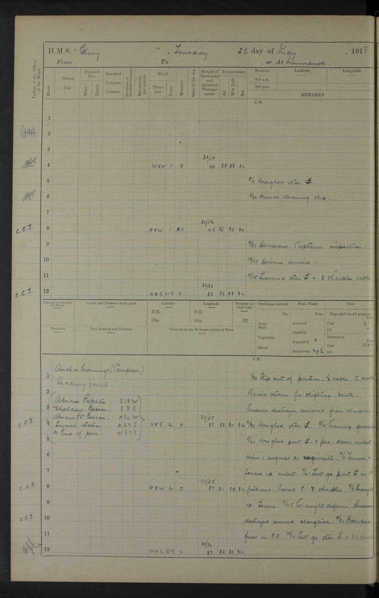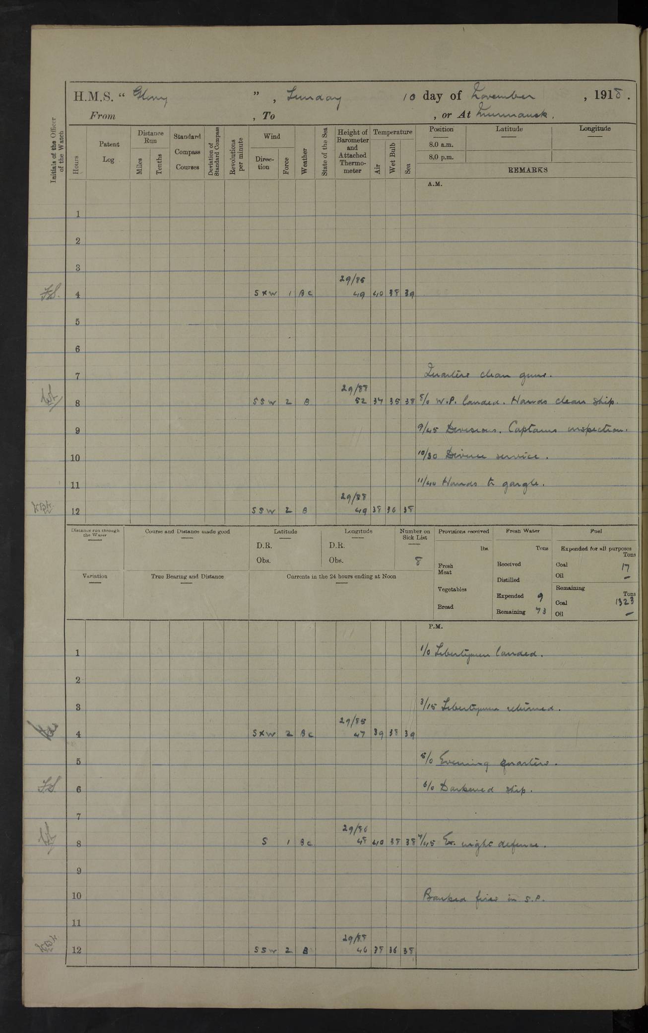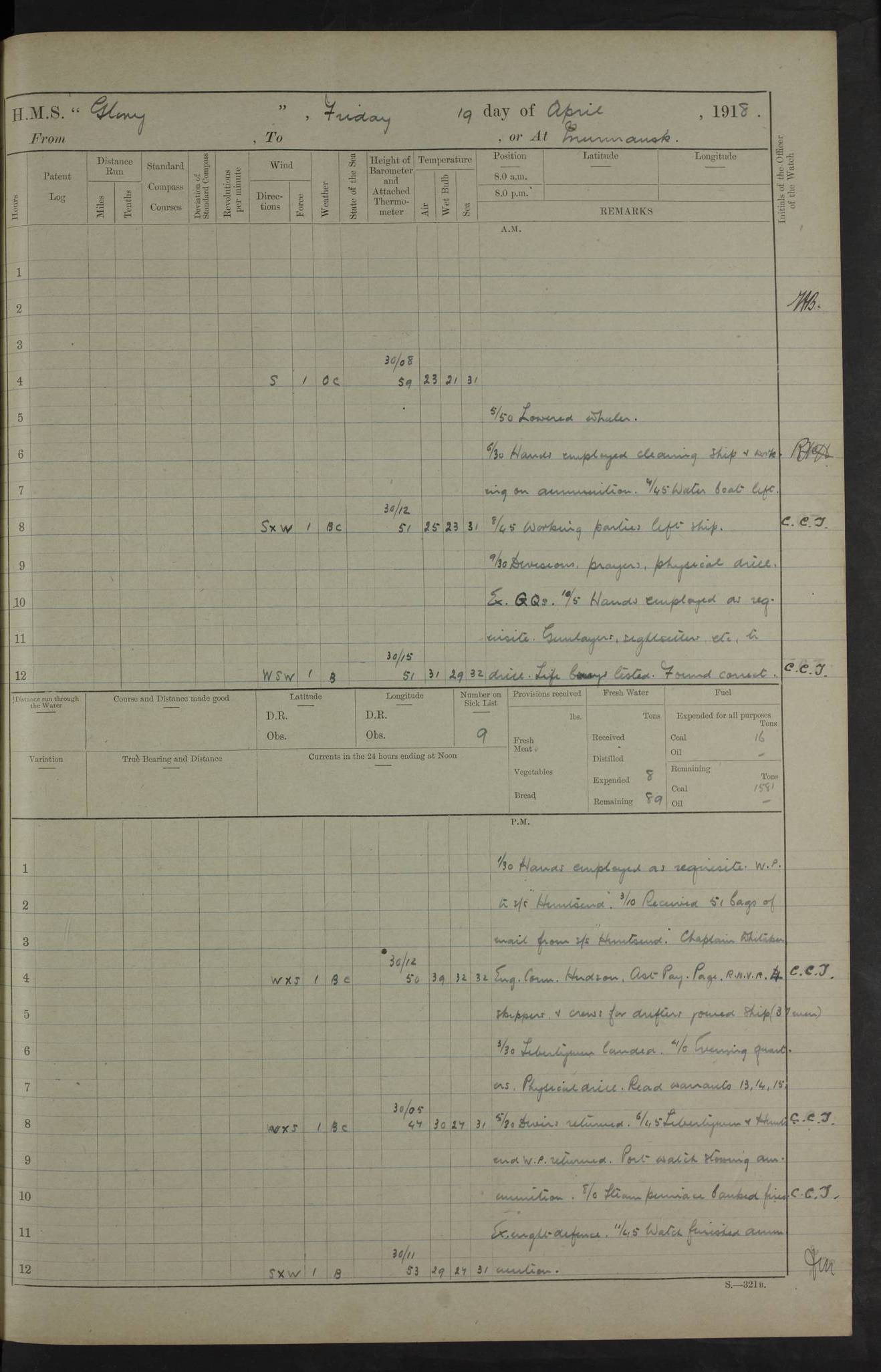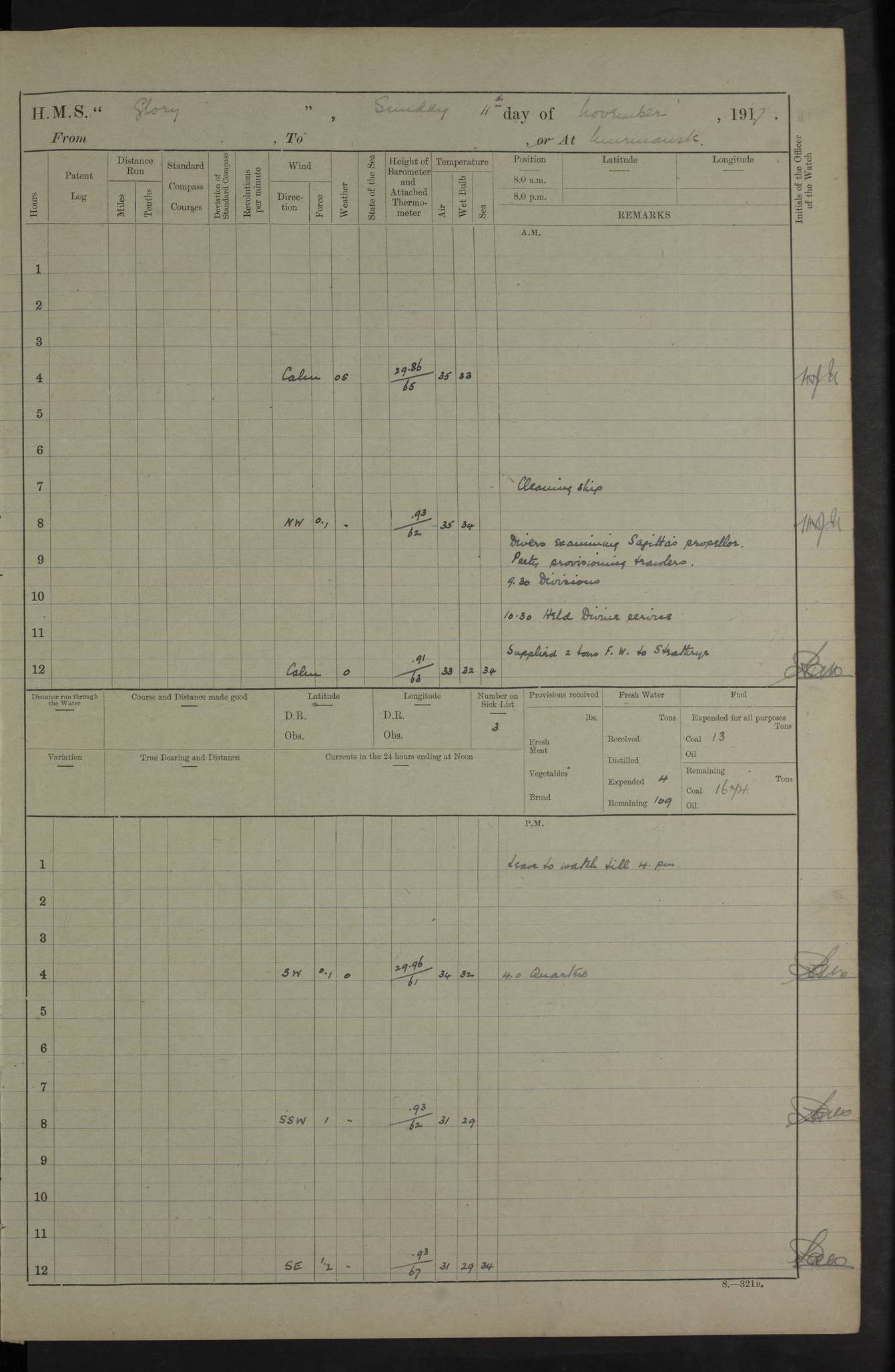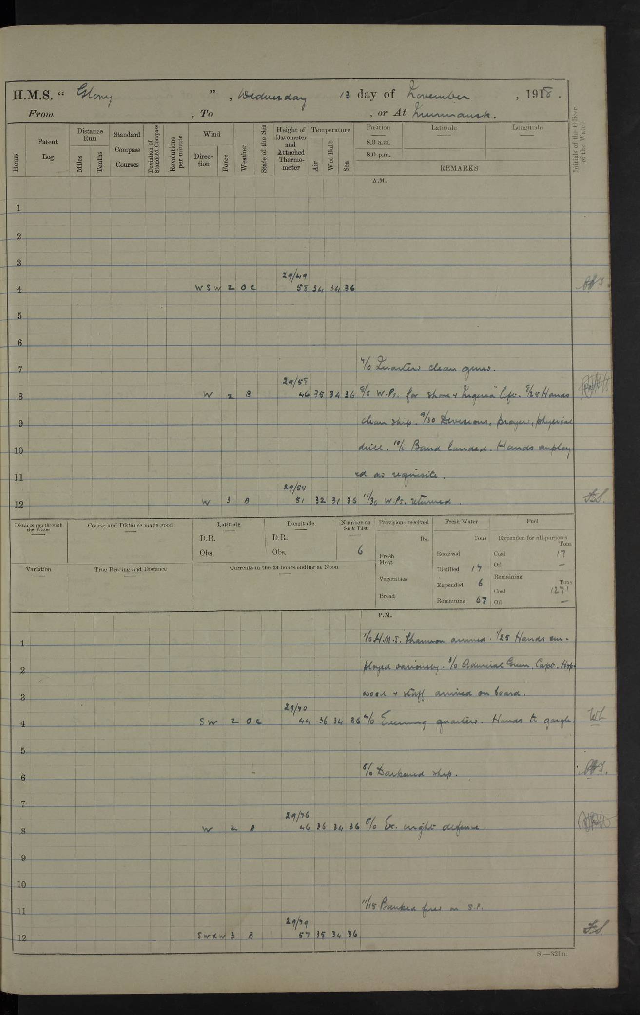 LOGS FOR OCTOBER 1916 For the period covered by the remainder of these logs (1 October, 1916 to 31 December 1918), HMS Glory was based at Murmansk, northern Russia. The city had a variety of names in the early 20th Century – including, Port Murman, Romanov and Murmansk. The location will be given in these pages as Murmansk, the modern name. A history of Murmansk’s names is available at http://en.wikipedia.org/wiki/Murmansk . 4f961482a2fc8e2def0011c7: (http://s3.amazonaws.com/oldweather/ADM53-43026/ADM 53-43026-001_0.jpg) This log is to be kept in a cover in future 4f961482a2fc8e2def0011c8: (http://s3.amazonaws.com/oldweather/ADM53-43026/ADM 53-43026-001_1.jpg) 4f961482a2fc8e2def0011c9: (http://s3.amazonaws.com/oldweather/ADM53-43026/ADM 53-43026-002_0.jpg) 4f961483a2fc8e2def0011ca: (http://s3.amazonaws.com/oldweather/ADM53-43026/ADM 53-43026-002_1.jpg) 4f961483a2fc8e2def0011cb: (http://s3.amazonaws.com/oldweather/ADM53-43026/ADM 53-43026-003_0.jpg) 4f961483a2fc8e2def0011cc: (http://s3.amazonaws.com/oldweather/ADM53-43026/ADM 53-43026-003_1.jpg) 1 October 1916 Murmansk Lat 69.03, Long 33.05 5.40am: Russian auxiliary Kolgiev sailed. Information regarding this vessel (or similar name) has not been found. 7.30am: Celebrated Holy Communion. am: Party working in Earl Essex. Earl Essex was a hired trawler of 225 grt, built, in 1914. Sourced from F.J. Dittmar & J.J. Colledge (1972) – British warships 1914–1919, Ian Allan. 10.45am: Held Divine Service. 11.30am: Celebrated Holy Communion. 4.45pm: Out nets. 4f961484a2fc8e2def0011cd: (http://s3.amazonaws.com/oldweather/ADM53-43026/ADM 53-43026-004_0.jpg) 2 October 1916 Murmansk Lat 69.03, Long 33.05 am: Party working in Earl Essex. 11.30am: Paid quarterly settlement. 6.15pm: Kolgiev arrived. 4f961484a2fc8e2def0011ce: (http://s3.amazonaws.com/oldweather/ADM53-43026/ADM 53-43026-004_1.jpg) 3 October 1916 Murmansk Lat 69.03, Long 33.05 Number on sick list: 9 9.20am: Aft port nets. 11.30am: Russian TBs Goorovoi and Plasteevyi(?) arrived. The first of these TBs is possibly ‘Grosovoi’, built at Le Havre around 1900. Her fate is unclear. The name of the second vessel is possibly incorrect, but no near match has been found. 1.30pm: Out port nets. 4f961484a2fc8e2def0011cf: (http://s3.amazonaws.com/oldweather/ADM53-43026/ADM 53-43026-005_0.jpg) 4 October 1916 Murmansk Lat 69.03, Long 33.05 8.30am: Salvator - broad pendant of Commodore T.W. Kemp arrived. Salvator (ex–Katoomba) was a hired yacht of 684 tons gross, built in 1903. She served as the Heliopolis in WW2. Details at WW1NavyBritishShips-Dittmar4AP.htm . 9.25am: Aft port nets. 11.05am: HE the Minister of Marine visited ship. 11.30am: Out port nets. 11.50am: Russian auxiliary Gotowsci(?) arrived. 12 noon: Kolgiev sailed. pm: HM Tug Blackcock arrived. Blackcock was a hired patrol tug, built in 1886 and wrecked on 18 January, 1918, in the White Sea. Sourced from F.J. Dittmar & J.J. Colledge (1972) – British warships 1914–1919, Ian Allan. 6.50pm: Kolgiev arrived. 4f961485a2fc8e2def0011d0: (http://s3.amazonaws.com/oldweather/ADM53-43026/ADM 53-43026-005_1.jpg) 5 October 1916 Murmansk Lat 69.03, Long 33.05 10.35am: Kolgiev sailed. 1.05pm: Salvator sailed. pm: Read Warrant No. 5. 4f961485a2fc8e2def0011d1: (http://s3.amazonaws.com/oldweather/ADM53-43026/ADM 53-43026-006_0.jpg) 6 October 1916 Murmansk Lat 69.03, Long 33.05 pm: 5 tons of water supplied to Blackcock. 3.30pm: Action. 3.45pm: Secure. Russian T.B's Grosovoi and Plasteevyi sailed. 4f961485a2fc8e2def0011d2: (http://s3.amazonaws.com/oldweather/ADM53-43026/ADM 53-43026-006_1.jpg) 7 October 1916 Murmansk Lat 69.03, Long 33.05 am: Party coaling trawler. am: Tested life buoys – correct. 4f961486a2fc8e2def0011d3: (http://s3.amazonaws.com/oldweather/ADM53-43026/ADM 53-43026-007_0.jpg) 8 October 1916 Murmansk Lat 69.03, Long 33.05 6.45am: Party working in collier. 7.30am: Celebrated Holy Communion. 10.45am: Held Divine service. 5.45pm: Held Divine Service. 4f961486a2fc8e2def0011d4: (http://s3.amazonaws.com/oldweather/ADM53-43026/ADM 53-43026-007_1.jpg) 9 October 1916 Murmansk Lat 69.03, Long 33.05 Number on sick list: 9 am: Exercised fire stations. am: 2nd pinnace patrolling. pm: Landed marines for drill. 4f961486a2fc8e2def0011d5: (http://s3.amazonaws.com/oldweather/ADM53-43026/ADM 53-43026-008_0.jpg) 10 October 1916 Murmansk Lat 69.03, Long 33.05 am: Steam pinnace patrolling. 1.55pm: Kolgiev arrived. 4f961487a2fc8e2def0011d6: (http://s3.amazonaws.com/oldweather/ADM53-43026/ADM 53-43026-008_1.jpg) 11 October 1916 Murmansk Lat 69.03, Long 33.05 am: Party working on boom defence. am: MT and QD men aired bedding. am: Marines at drill. 1.50pm: Kolgiev sailed. 3.15pm: British tug Racia (lighter ES 23 in tow) arrived. Racia was a hired screw tug of 410 grt, built in 1894 and sold on 23 June, 1920. Sourced from F.J. Dittmar & J.J. Colledge (1972) – British warships 1914–1919, Ian Allan. 4f961487a2fc8e2def0011d7: (http://s3.amazonaws.com/oldweather/ADM53-43026/ADM 53-43026-009_0.jpg) 12 October 1916 Murmansk Lat 69.03, Long 33.05 Number on sick list: 6 am: Party working on boom defence. am: Steam pinnace patrolling. pm: Make and mend clothes. 4.15pm: Read warrant No. 6. 6.00pm: Imperator Nicolas arrived. A vessel with this name has not been traced. 4f961487a2fc8e2def0011d8: (http://s3.amazonaws.com/oldweathe/ADM53-43026/ADM 53-43026-009_1.jpg) 13 October 1916 Murmansk Lat 69.03, Long 33.05 am: Steam pinnace patrolling. am: Party working on boom defence. am: Found foc’sle awning and side screens damaged by rats. 4f961488a2fc8e2def0011d9: (http://s3.amazonaws.com/oldweather/ADM53-43026/ADM 53-43026-010_0.jpg) 14 August 1916 (probably should read October) Murmansk Lat 69.03, Long 33.05 Number on sick list: 7 6.45am: Racia (floating crane in tow) sailed. am: Party working on boom defence. am: Tested life buoys – correct. 3.00pm: Vindictive arrived. HMS Vindictive was a protected cruiser of the Arrogant class, launched in 1897 at Chatham Dockyar