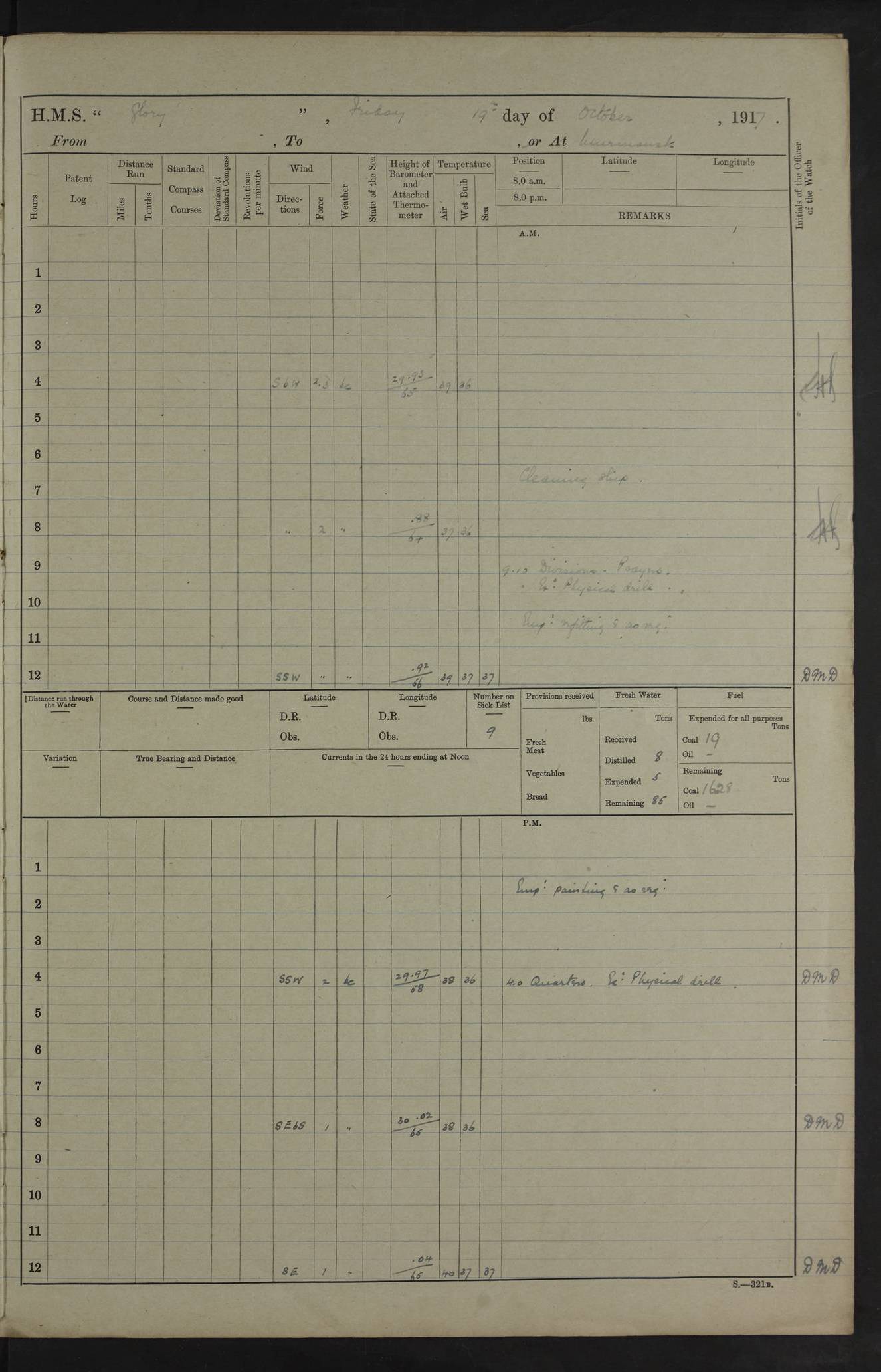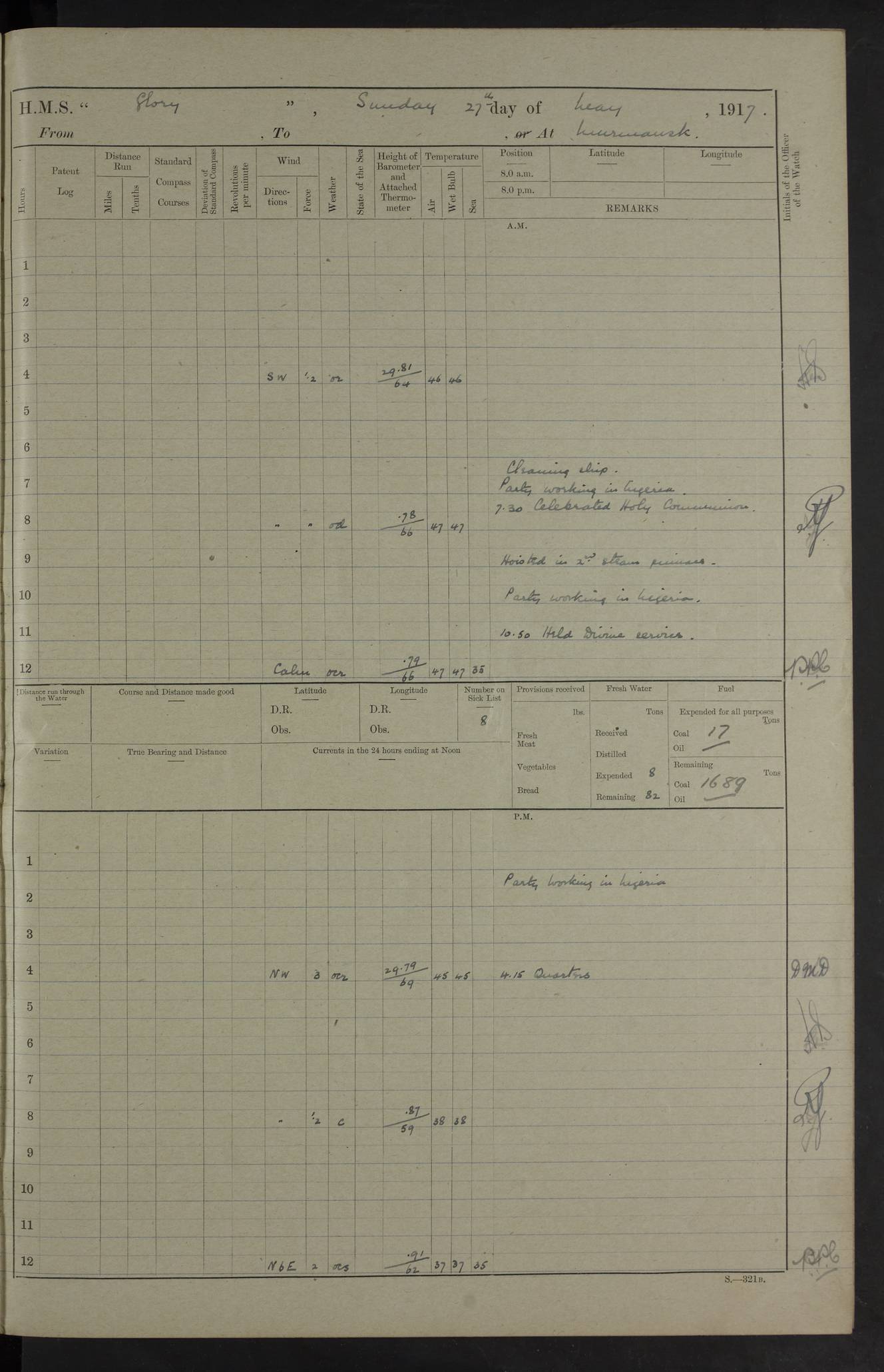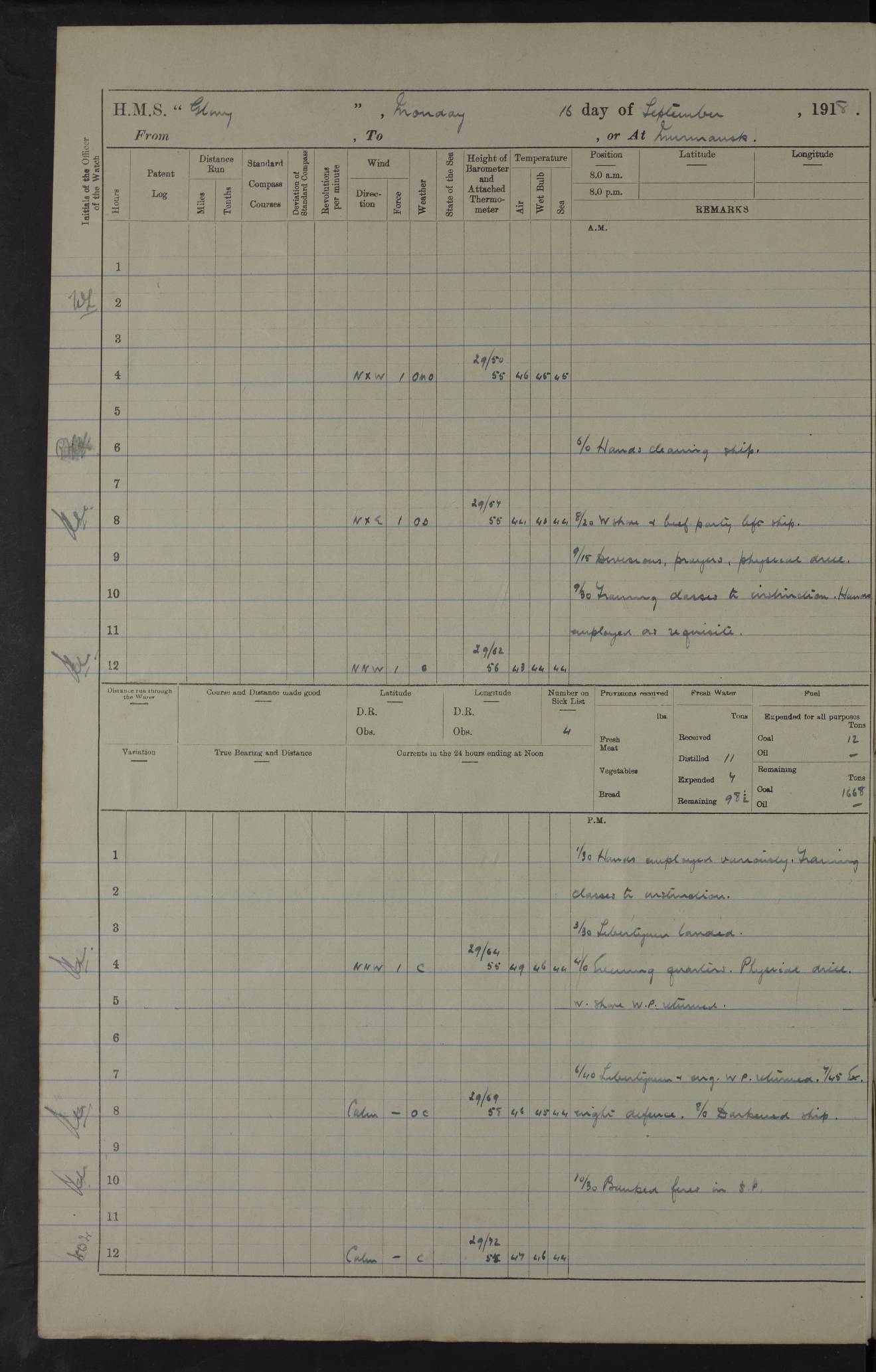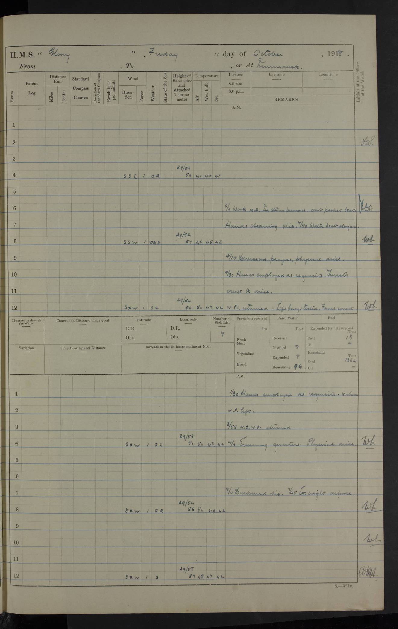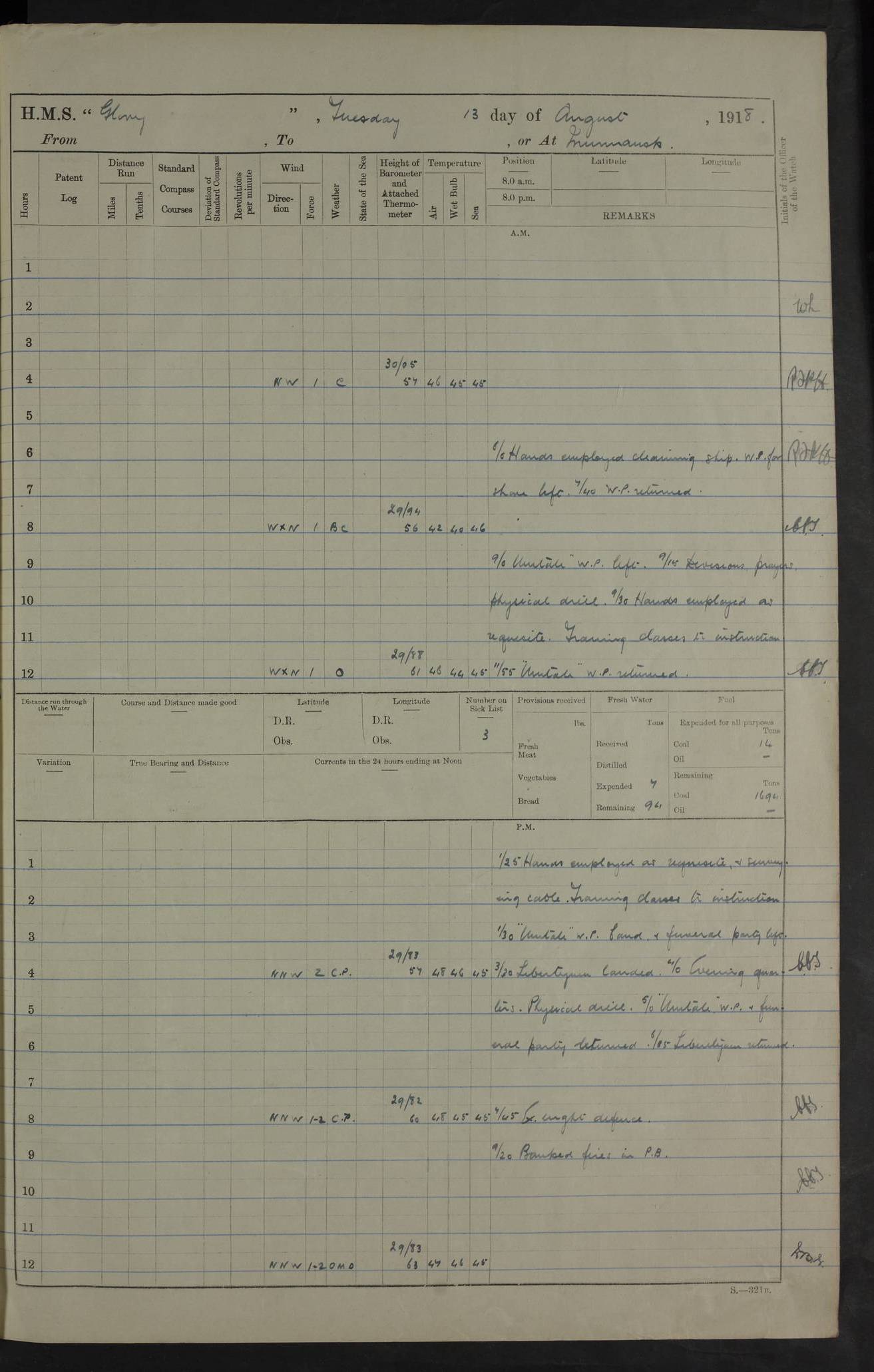 LOGS FOR OCTOBER 1916 For the period covered by the remainder of these logs (1 October, 1916 to 31 December 1918), HMS Glory was based at Murmansk, northern Russia. The city had a variety of names in the early 20th Century – including, Port Murman, Romanov and Murmansk. The location will be given in these pages as Murmansk, the modern name. A history of Murmansk’s names is available at http://en.wikipedia.org/wiki/Murmansk . 4f961482a2fc8e2def0011c7: (http://s3.amazonaws.com/oldweather/ADM53-43026/ADM 53-43026-001_0.jpg) This log is to be kept in a cover in future 4f961482a2fc8e2def0011c8: (http://s3.amazonaws.com/oldweather/ADM53-43026/ADM 53-43026-001_1.jpg) 4f961482a2fc8e2def0011c9: (http://s3.amazonaws.com/oldweather/ADM53-43026/ADM 53-43026-002_0.jpg) 4f961483a2fc8e2def0011ca: (http://s3.amazonaws.com/oldweather/ADM53-43026/ADM 53-43026-002_1.jpg) 4f961483a2fc8e2def0011cb: (http://s3.amazonaws.com/oldweather/ADM53-43026/ADM 53-43026-003_0.jpg) 4f961483a2fc8e2def0011cc: (http://s3.amazonaws.com/oldweather/ADM53-43026/ADM 53-43026-003_1.jpg) 1 October 1916 Murmansk Lat 69.03, Long 33.05 5.40am: Russian auxiliary Kolgiev sailed. Information regarding this vessel (or similar name) has not been found. 7.30am: Celebrated Holy Communion. am: Party working in Earl Essex. Earl Essex was a hired trawler of 225 grt, built, in 1914. Sourced from F.J. Dittmar & J.J. Colledge (1972) – British warships 1914–1919, Ian Allan. 10.45am: Held Divine Service. 11.30am: Celebrated Holy Communion. 4.45pm: Out nets. 4f961484a2fc8e2def0011cd: (http://s3.amazonaws.com/oldweather/ADM53-43026/ADM 53-43026-004_0.jpg) 2 October 1916 Murmansk Lat 69.03, Long 33.05 am: Party working in Earl Essex. 11.30am: Paid quarterly settlement. 6.15pm: Kolgiev arrived. 4f961484a2fc8e2def0011ce: (http://s3.amazonaws.com/oldweather/ADM53-43026/ADM 53-43026-004_1.jpg) 3 October 1916 Murmansk Lat 69.03, Long 33.05 Number on sick list: 9 9.20am: Aft port nets. 11.30am: Russian TBs Goorovoi and Plasteevyi(?) arrived. The first of these TBs is possibly ‘Grosovoi’, built at Le Havre around 1900. Her fate is unclear. The name of the second vessel is possibly incorrect, but no near match has been found. 1.30pm: Out port nets. 4f961484a2fc8e2def0011cf: (http://s3.amazonaws.com/oldweather/ADM53-43026/ADM 53-43026-005_0.jpg) 4 October 1916 Murmansk Lat 69.03, Long 33.05 8.30am: Salvator - broad pendant of Commodore T.W. Kemp arrived. Salvator (ex–Katoomba) was a hired yacht of 684 tons gross, built in 1903. She served as the Heliopolis in WW2. Details at WW1NavyBritishShips-Dittmar4AP.htm . 9.25am: Aft port nets. 11.05am: HE the Minister of Marine visited ship. 11.30am: Out port nets. 11.50am: Russian auxiliary Gotowsci(?) arrived. 12 noon: Kolgiev sailed. pm: HM Tug Blackcock arrived. Blackcock was a hired patrol tug, built in 1886 and wrecked on 18 January, 1918, in the White Sea. Sourced from F.J. Dittmar & J.J. Colledge (1972) – British warships 1914–1919, Ian Allan. 6.50pm: Kolgiev arrived. 4f961485a2fc8e2def0011d0: (http://s3.amazonaws.com/oldweather/ADM53-43026/ADM 53-43026-005_1.jpg) 5 October 1916 Murmansk Lat 69.03, Long 33.05 10.35am: Kolgiev sailed. 1.05pm: Salvator sailed. pm: Read Warrant No. 5. 4f961485a2fc8e2def0011d1: (http://s3.amazonaws.com/oldweather/ADM53-43026/ADM 53-43026-006_0.jpg) 6 October 1916 Murmansk Lat 69.03, Long 33.05 pm: 5 tons of water supplied to Blackcock. 3.30pm: Action. 3.45pm: Secure. Russian T.B's Grosovoi and Plasteevyi sailed. 4f961485a2fc8e2def0011d2: (http://s3.amazonaws.com/oldweather/ADM53-43026/ADM 53-43026-006_1.jpg) 7 October 1916 Murmansk Lat 69.03, Long 33.05 am: Party coaling trawler. am: Tested life buoys – correct. 4f961486a2fc8e2def0011d3: (http://s3.amazonaws.com/oldweather/ADM53-43026/ADM 53-43026-007_0.jpg) 8 October 1916 Murmansk Lat 69.03, Long 33.05 6.45am: Party working in collier. 7.30am: Celebrated Holy Communion. 10.45am: Held Divine service. 5.45pm: Held Divine Service. 4f961486a2fc8e2def0011d4: (http://s3.amazonaws.com/oldweather/ADM53-43026/ADM 53-43026-007_1.jpg) 9 October 1916 Murmansk Lat 69.03, Long 33.05 Number on sick list: 9 am: Exercised fire stations. am: 2nd pinnace patrolling. pm: Landed marines for drill. 4f961486a2fc8e2def0011d5: (http://s3.amazonaws.com/oldweather/ADM53-43026/ADM 53-43026-008_0.jpg) 10 October 1916 Murmansk Lat 69.03, Long 33.05 am: Steam pinnace patrolling. 1.55pm: Kolgiev arrived. 4f961487a2fc8e2def0011d6: (http://s3.amazonaws.com/oldweather/ADM53-43026/ADM 53-43026-008_1.jpg) 11 October 1916 Murmansk Lat 69.03, Long 33.05 am: Party working on boom defence. am: MT and QD men aired bedding. am: Marines at drill. 1.50pm: Kolgiev sailed. 3.15pm: British tug Racia (lighter ES 23 in tow) arrived. Racia was a hired screw tug of 410 grt, built in 1894 and sold on 23 June, 1920. Sourced from F.J. Dittmar & J.J. Colledge (1972) – British warships 1914–1919, Ian Allan. 4f961487a2fc8e2def0011d7: (http://s3.amazonaws.com/oldweather/ADM53-43026/ADM 53-43026-009_0.jpg) 12 October 1916 Murmansk Lat 69.03, Long 33.05 Number on sick list: 6 am: Party working on boom defence. am: Steam pinnace patrolling. pm: Make and mend clothes. 4.15pm: Read warrant No. 6. 6.00pm: Imperator Nicolas arrived. A vessel with this name has not been traced. 4f961487a2fc8e2def0011d8: (http://s3.amazonaws.com/oldweathe/ADM53-43026/ADM 53-43026-009_1.jpg) 13 October 1916 Murmansk Lat 69.03, Long 33.05 am: Steam pinnace patrolling. am: Party working on boom defence. am: Found foc’sle awning and side screens damaged by rats. 4f961488a2fc8e2def0011d9: (http://s3.amazonaws.com/oldweather/ADM53-43026/ADM 53-43026-010_0.jpg) 14 August 1916 (probably should read October) Murmansk Lat 69.03, Long 33.05 Number on sick list: 7 6.45am: Racia (floating crane in tow) sailed. am: Party working on boom defence. am: Tested life buoys – correct. 3.00pm: Vindictive arrived. HMS Vindictive was a protected cruiser of the Arrogant class, launched in 1897 at Chatham Dockyar