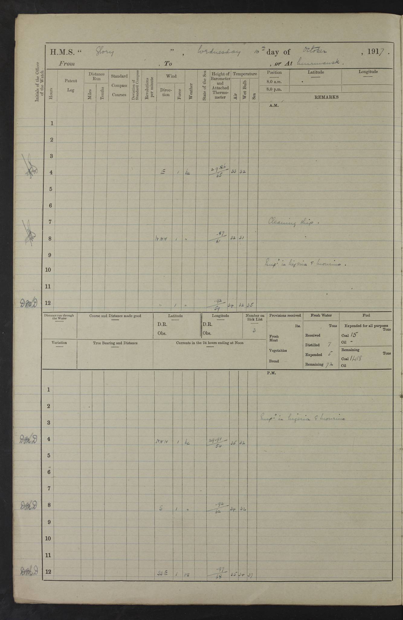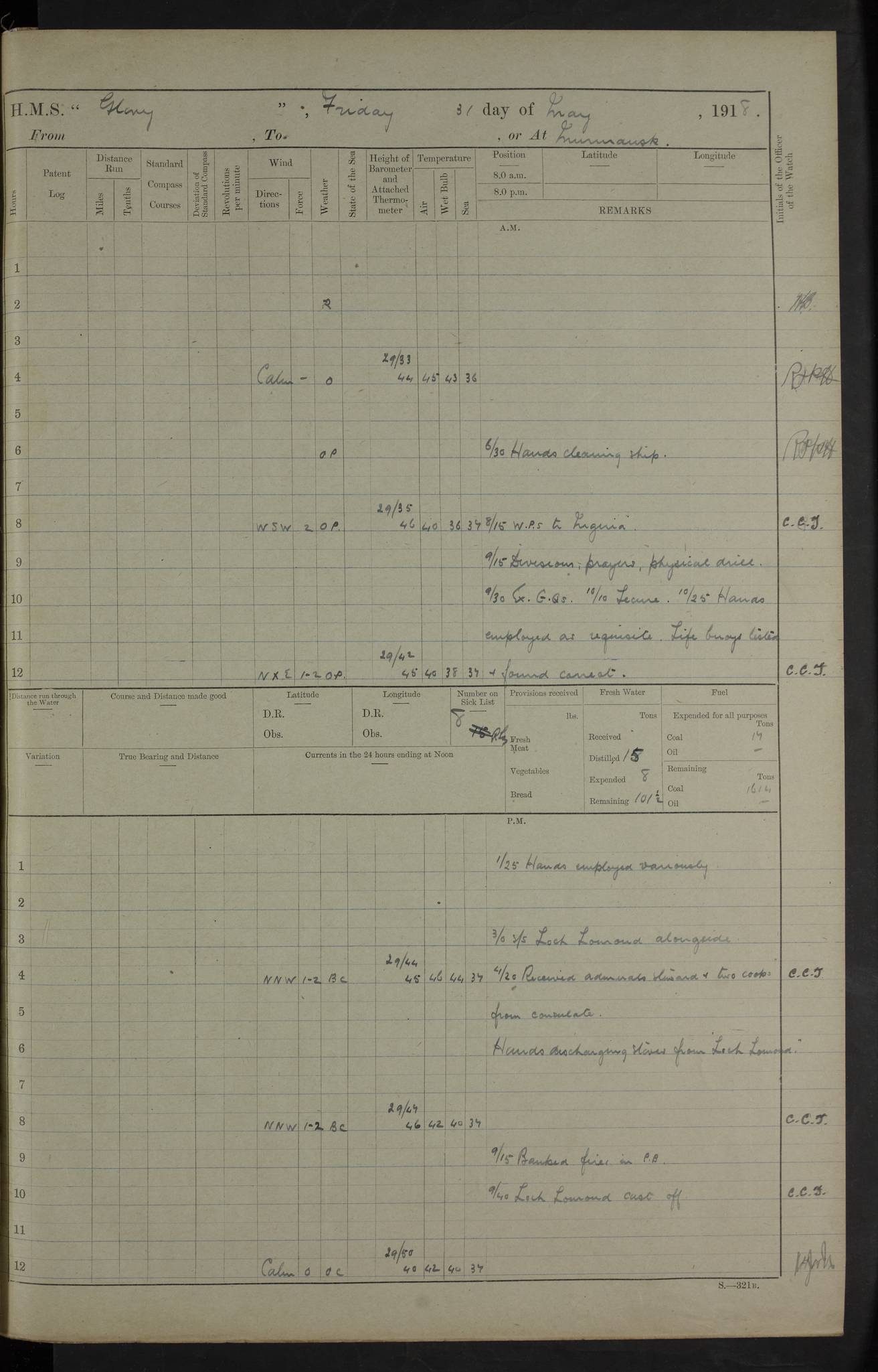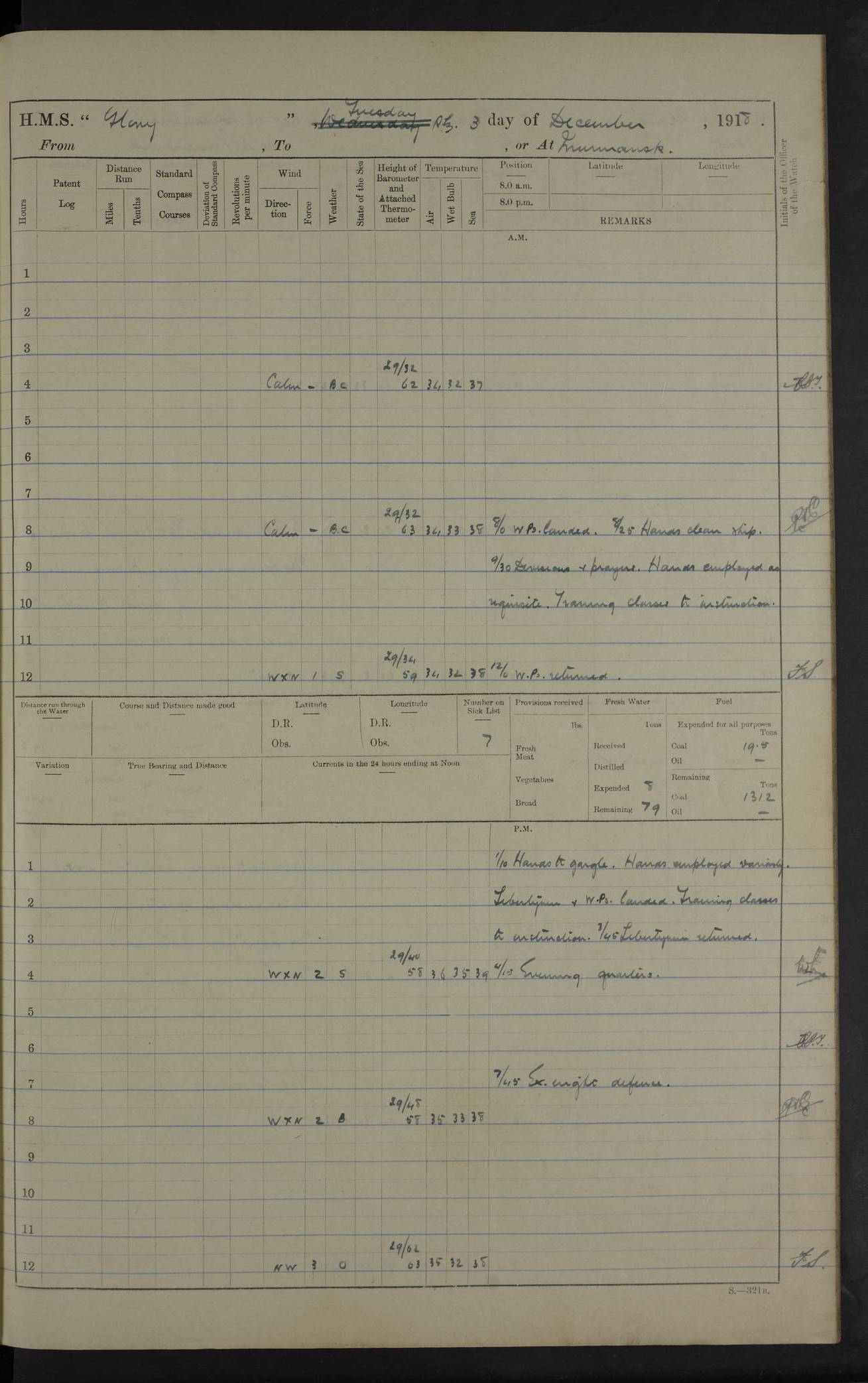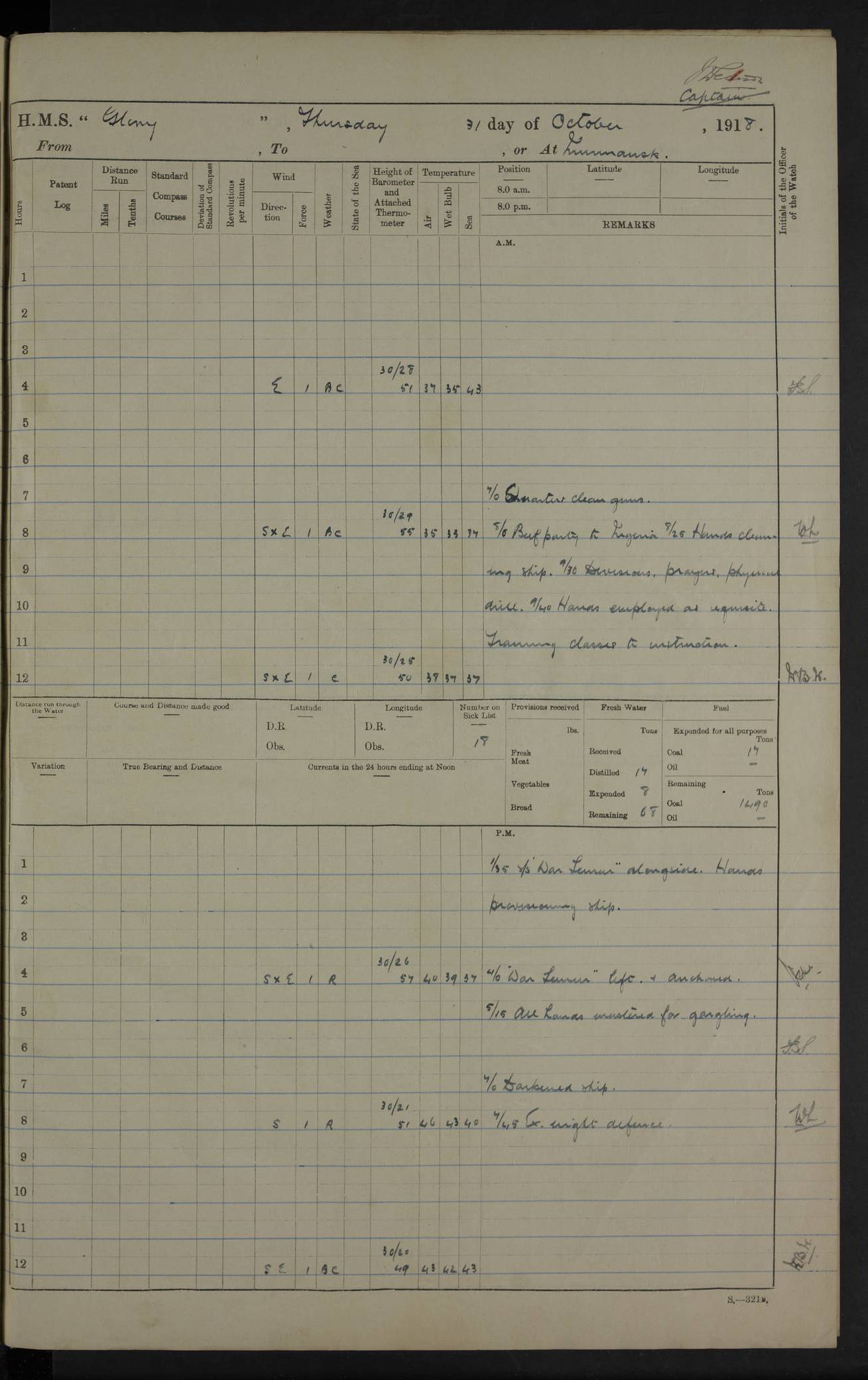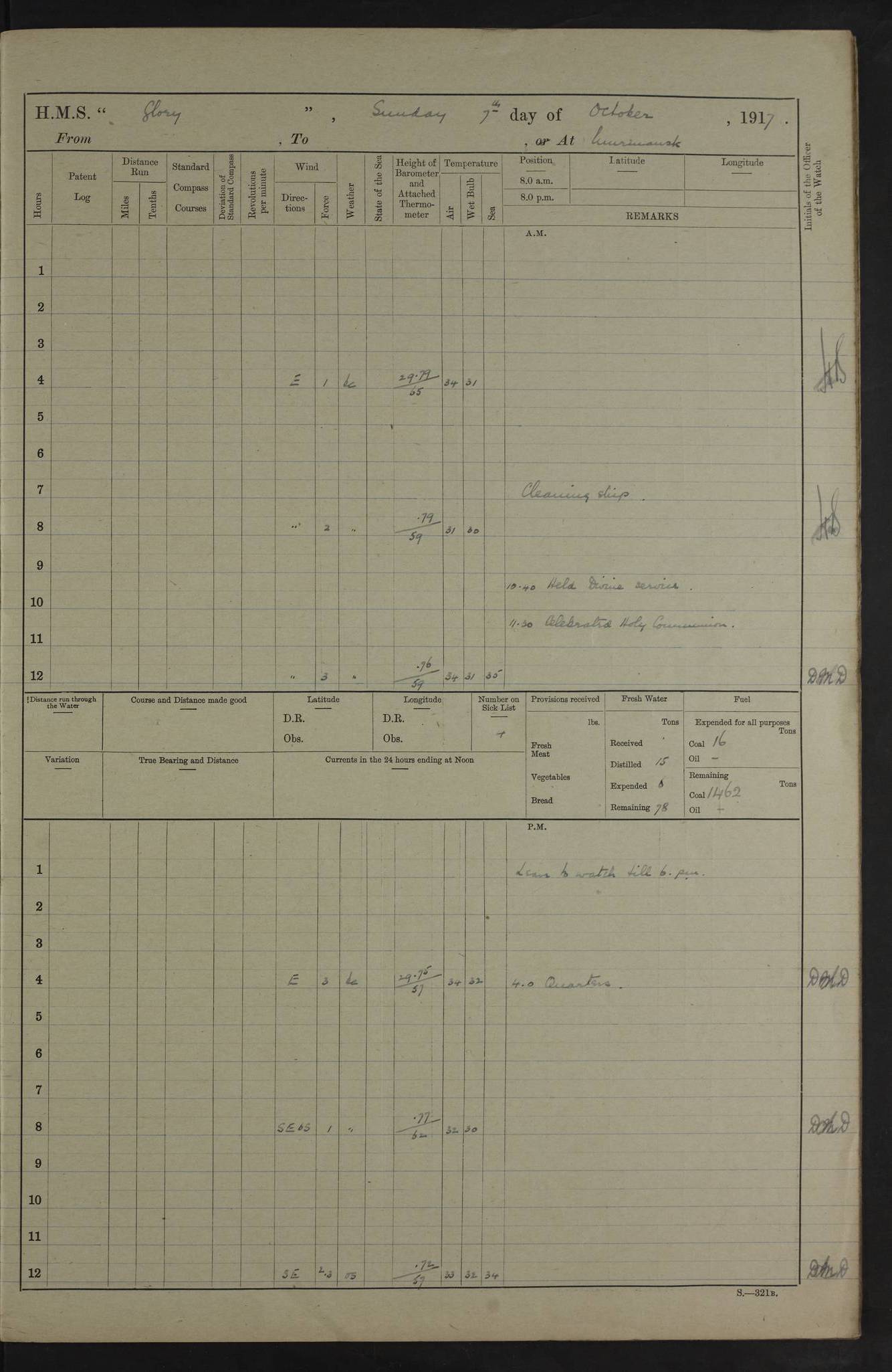 LOGS FOR OCTOBER 1916 For the period covered by the remainder of these logs (1 October, 1916 to 31 December 1918), HMS Glory was based at Murmansk, northern Russia. The city had a variety of names in the early 20th Century – including, Port Murman, Romanov and Murmansk. The location will be given in these pages as Murmansk, the modern name. A history of Murmansk’s names is available at http://en.wikipedia.org/wiki/Murmansk . 4f961482a2fc8e2def0011c7: (http://s3.amazonaws.com/oldweather/ADM53-43026/ADM 53-43026-001_0.jpg) This log is to be kept in a cover in future 4f961482a2fc8e2def0011c8: (http://s3.amazonaws.com/oldweather/ADM53-43026/ADM 53-43026-001_1.jpg) 4f961482a2fc8e2def0011c9: (http://s3.amazonaws.com/oldweather/ADM53-43026/ADM 53-43026-002_0.jpg) 4f961483a2fc8e2def0011ca: (http://s3.amazonaws.com/oldweather/ADM53-43026/ADM 53-43026-002_1.jpg) 4f961483a2fc8e2def0011cb: (http://s3.amazonaws.com/oldweather/ADM53-43026/ADM 53-43026-003_0.jpg) 4f961483a2fc8e2def0011cc: (http://s3.amazonaws.com/oldweather/ADM53-43026/ADM 53-43026-003_1.jpg) 1 October 1916 Murmansk Lat 69.03, Long 33.05 5.40am: Russian auxiliary Kolgiev sailed. Information regarding this vessel (or similar name) has not been found. 7.30am: Celebrated Holy Communion. am: Party working in Earl Essex. Earl Essex was a hired trawler of 225 grt, built, in 1914. Sourced from F.J. Dittmar & J.J. Colledge (1972) – British warships 1914–1919, Ian Allan. 10.45am: Held Divine Service. 11.30am: Celebrated Holy Communion. 4.45pm: Out nets. 4f961484a2fc8e2def0011cd: (http://s3.amazonaws.com/oldweather/ADM53-43026/ADM 53-43026-004_0.jpg) 2 October 1916 Murmansk Lat 69.03, Long 33.05 am: Party working in Earl Essex. 11.30am: Paid quarterly settlement. 6.15pm: Kolgiev arrived. 4f961484a2fc8e2def0011ce: (http://s3.amazonaws.com/oldweather/ADM53-43026/ADM 53-43026-004_1.jpg) 3 October 1916 Murmansk Lat 69.03, Long 33.05 Number on sick list: 9 9.20am: Aft port nets. 11.30am: Russian TBs Goorovoi and Plasteevyi(?) arrived. The first of these TBs is possibly ‘Grosovoi’, built at Le Havre around 1900. Her fate is unclear. The name of the second vessel is possibly incorrect, but no near match has been found. 1.30pm: Out port nets. 4f961484a2fc8e2def0011cf: (http://s3.amazonaws.com/oldweather/ADM53-43026/ADM 53-43026-005_0.jpg) 4 October 1916 Murmansk Lat 69.03, Long 33.05 8.30am: Salvator - broad pendant of Commodore T.W. Kemp arrived. Salvator (ex–Katoomba) was a hired yacht of 684 tons gross, built in 1903. She served as the Heliopolis in WW2. Details at WW1NavyBritishShips-Dittmar4AP.htm . 9.25am: Aft port nets. 11.05am: HE the Minister of Marine visited ship. 11.30am: Out port nets. 11.50am: Russian auxiliary Gotowsci(?) arrived. 12 noon: Kolgiev sailed. pm: HM Tug Blackcock arrived. Blackcock was a hired patrol tug, built in 1886 and wrecked on 18 January, 1918, in the White Sea. Sourced from F.J. Dittmar & J.J. Colledge (1972) – British warships 1914–1919, Ian Allan. 6.50pm: Kolgiev arrived. 4f961485a2fc8e2def0011d0: (http://s3.amazonaws.com/oldweather/ADM53-43026/ADM 53-43026-005_1.jpg) 5 October 1916 Murmansk Lat 69.03, Long 33.05 10.35am: Kolgiev sailed. 1.05pm: Salvator sailed. pm: Read Warrant No. 5. 4f961485a2fc8e2def0011d1: (http://s3.amazonaws.com/oldweather/ADM53-43026/ADM 53-43026-006_0.jpg) 6 October 1916 Murmansk Lat 69.03, Long 33.05 pm: 5 tons of water supplied to Blackcock. 3.30pm: Action. 3.45pm: Secure. Russian T.B's Grosovoi and Plasteevyi sailed. 4f961485a2fc8e2def0011d2: (http://s3.amazonaws.com/oldweather/ADM53-43026/ADM 53-43026-006_1.jpg) 7 October 1916 Murmansk Lat 69.03, Long 33.05 am: Party coaling trawler. am: Tested life buoys – correct. 4f961486a2fc8e2def0011d3: (http://s3.amazonaws.com/oldweather/ADM53-43026/ADM 53-43026-007_0.jpg) 8 October 1916 Murmansk Lat 69.03, Long 33.05 6.45am: Party working in collier. 7.30am: Celebrated Holy Communion. 10.45am: Held Divine service. 5.45pm: Held Divine Service. 4f961486a2fc8e2def0011d4: (http://s3.amazonaws.com/oldweather/ADM53-43026/ADM 53-43026-007_1.jpg) 9 October 1916 Murmansk Lat 69.03, Long 33.05 Number on sick list: 9 am: Exercised fire stations. am: 2nd pinnace patrolling. pm: Landed marines for drill. 4f961486a2fc8e2def0011d5: (http://s3.amazonaws.com/oldweather/ADM53-43026/ADM 53-43026-008_0.jpg) 10 October 1916 Murmansk Lat 69.03, Long 33.05 am: Steam pinnace patrolling. 1.55pm: Kolgiev arrived. 4f961487a2fc8e2def0011d6: (http://s3.amazonaws.com/oldweather/ADM53-43026/ADM 53-43026-008_1.jpg) 11 October 1916 Murmansk Lat 69.03, Long 33.05 am: Party working on boom defence. am: MT and QD men aired bedding. am: Marines at drill. 1.50pm: Kolgiev sailed. 3.15pm: British tug Racia (lighter ES 23 in tow) arrived. Racia was a hired screw tug of 410 grt, built in 1894 and sold on 23 June, 1920. Sourced from F.J. Dittmar & J.J. Colledge (1972) – British warships 1914–1919, Ian Allan. 4f961487a2fc8e2def0011d7: (http://s3.amazonaws.com/oldweather/ADM53-43026/ADM 53-43026-009_0.jpg) 12 October 1916 Murmansk Lat 69.03, Long 33.05 Number on sick list: 6 am: Party working on boom defence. am: Steam pinnace patrolling. pm: Make and mend clothes. 4.15pm: Read warrant No. 6. 6.00pm: Imperator Nicolas arrived. A vessel with this name has not been traced. 4f961487a2fc8e2def0011d8: (http://s3.amazonaws.com/oldweathe/ADM53-43026/ADM 53-43026-009_1.jpg) 13 October 1916 Murmansk Lat 69.03, Long 33.05 am: Steam pinnace patrolling. am: Party working on boom defence. am: Found foc’sle awning and side screens damaged by rats. 4f961488a2fc8e2def0011d9: (http://s3.amazonaws.com/oldweather/ADM53-43026/ADM 53-43026-010_0.jpg) 14 August 1916 (probably should read October) Murmansk Lat 69.03, Long 33.05 Number on sick list: 7 6.45am: Racia (floating crane in tow) sailed. am: Party working on boom defence. am: Tested life buoys – correct. 3.00pm: Vindictive arrived. HMS Vindictive was a protected cruiser of the Arrogant class, launched in 1897 at Chatham Dockyar