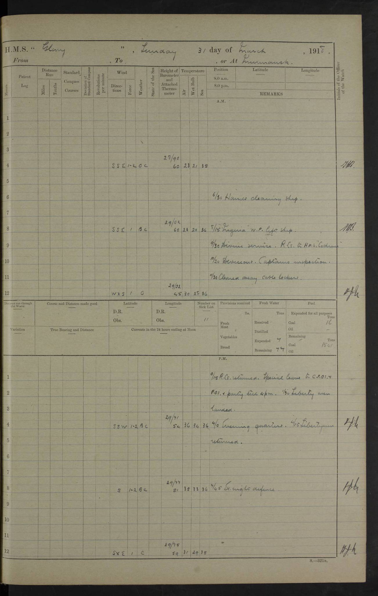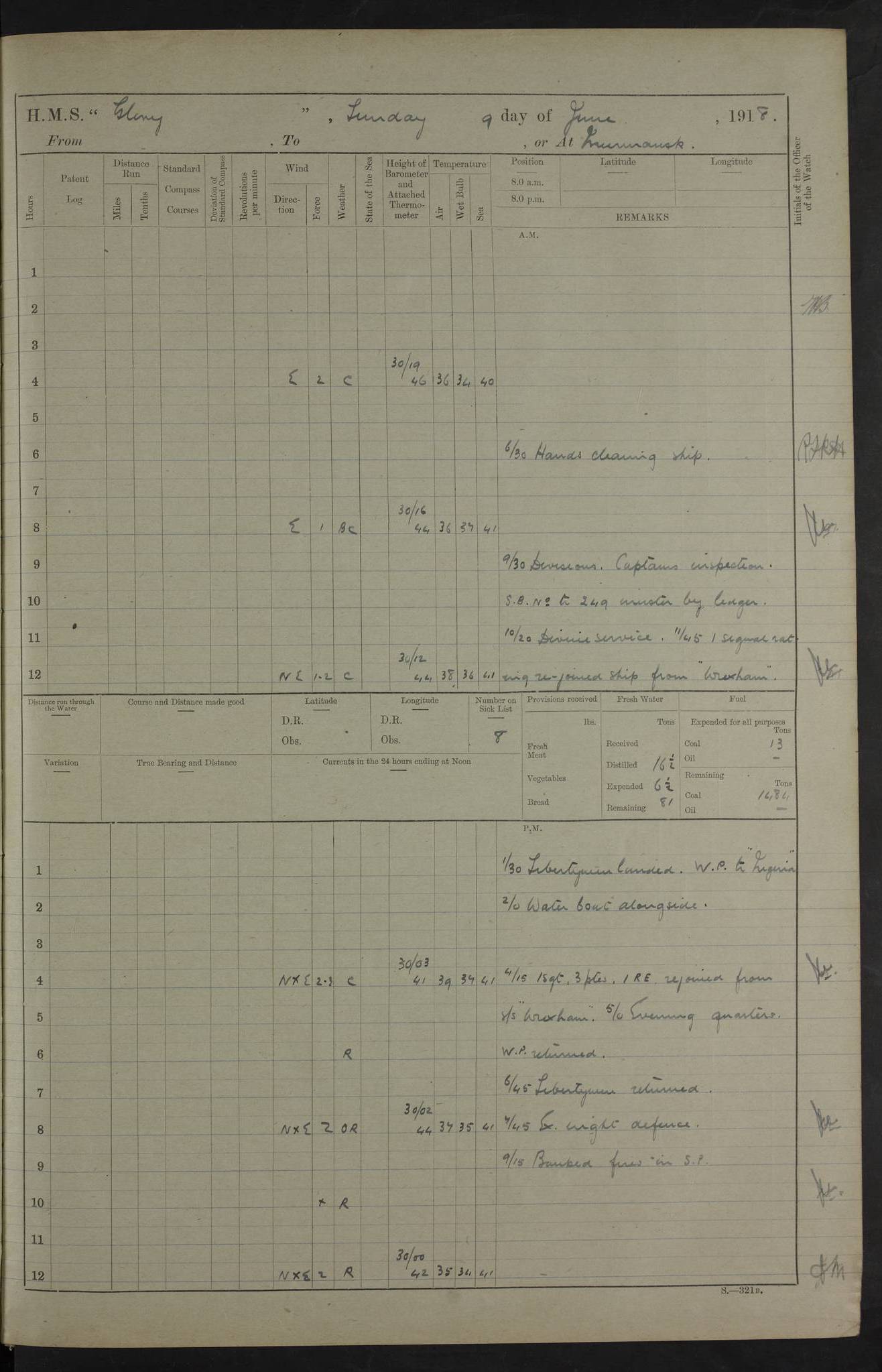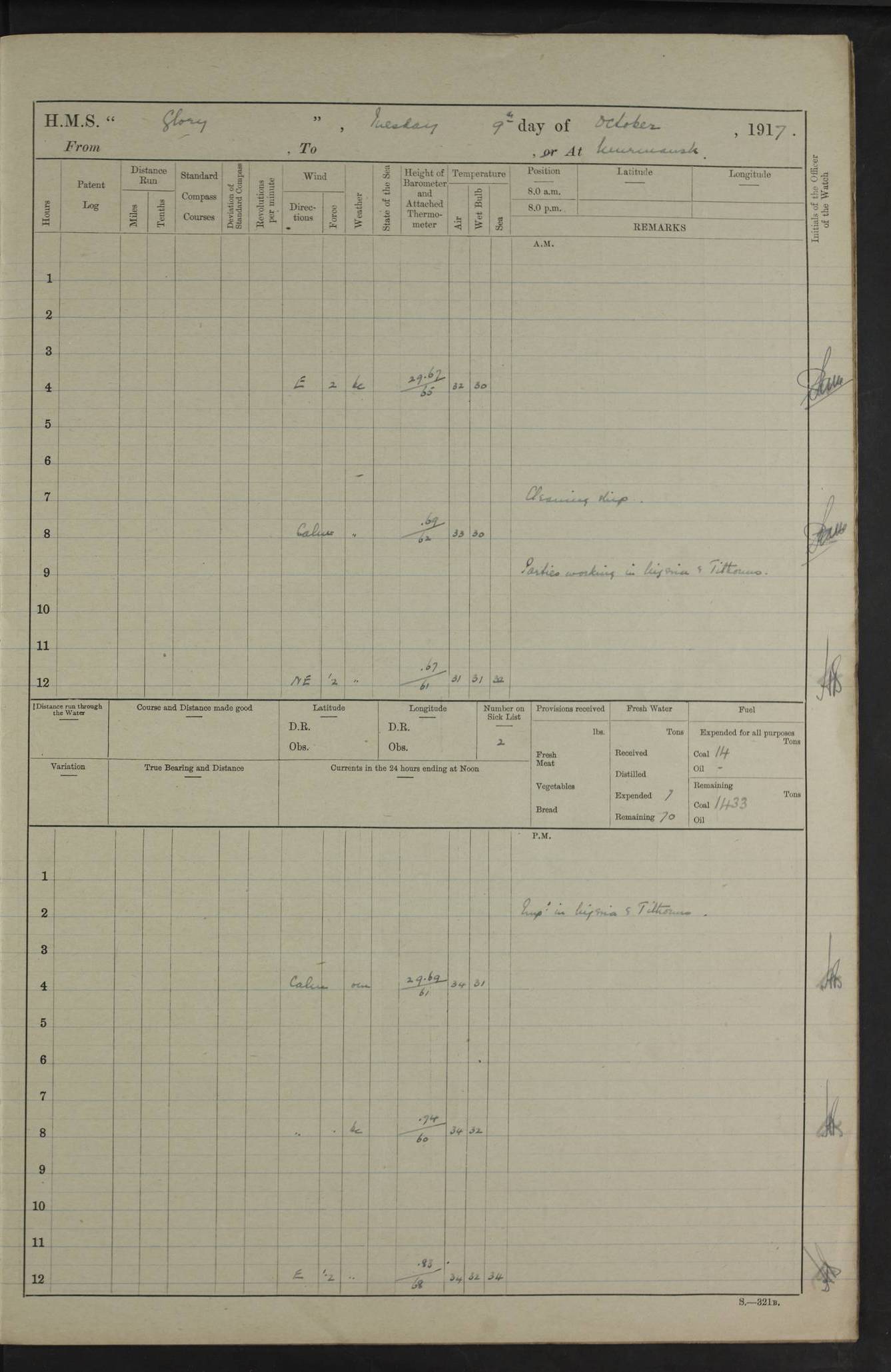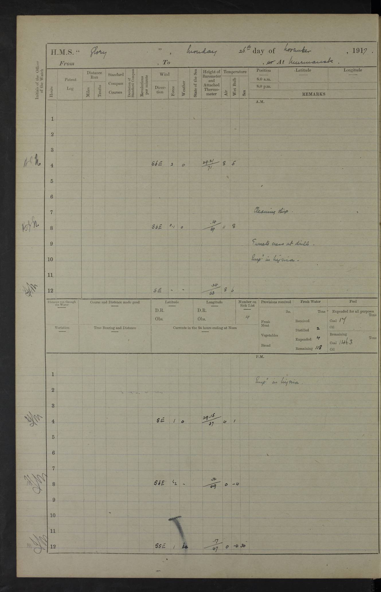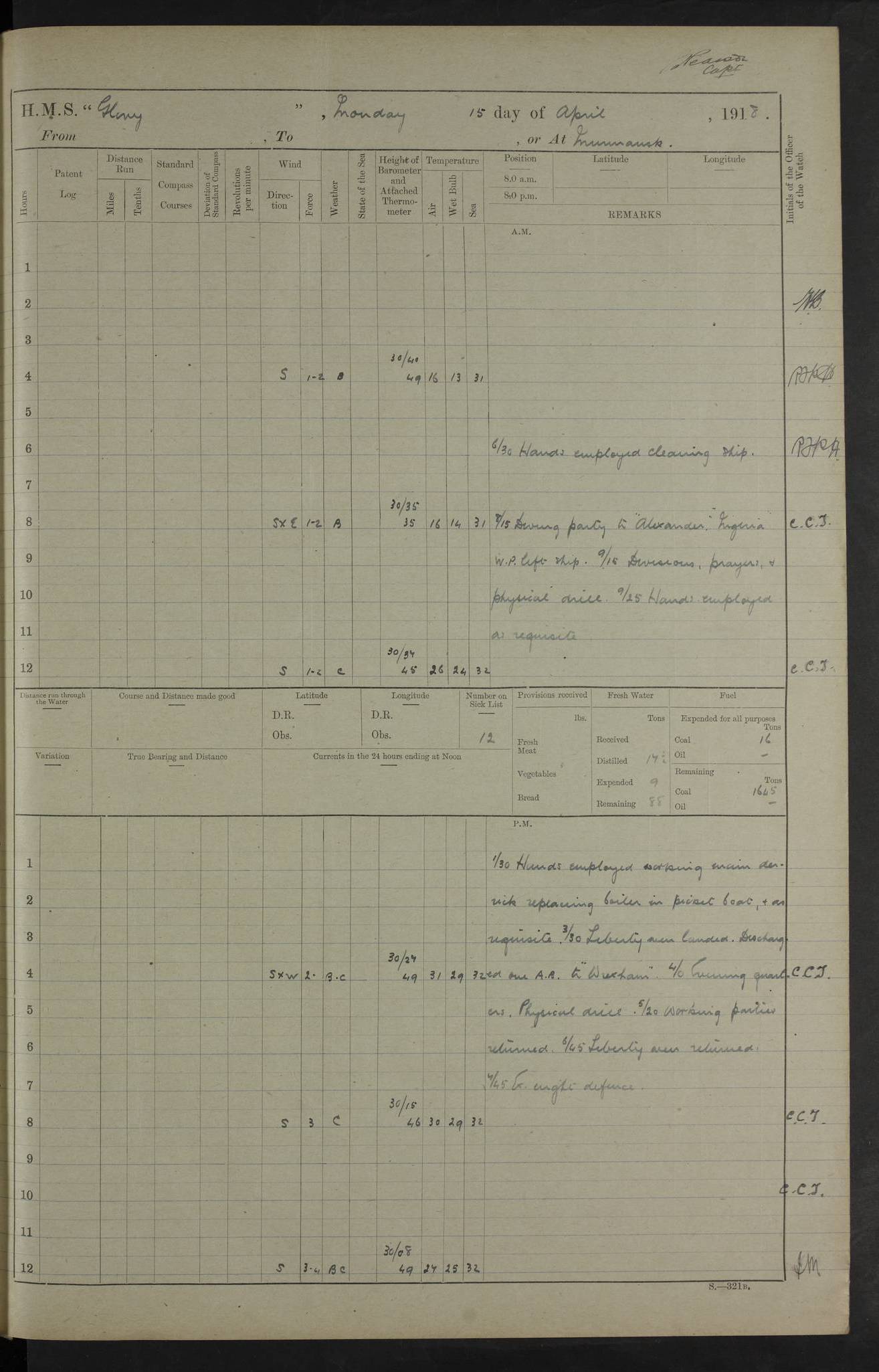 LOGS FOR OCTOBER 1916 For the period covered by the remainder of these logs (1 October, 1916 to 31 December 1918), HMS Glory was based at Murmansk, northern Russia. The city had a variety of names in the early 20th Century – including, Port Murman, Romanov and Murmansk. The location will be given in these pages as Murmansk, the modern name. A history of Murmansk’s names is available at http://en.wikipedia.org/wiki/Murmansk . 4f961482a2fc8e2def0011c7: (http://s3.amazonaws.com/oldweather/ADM53-43026/ADM 53-43026-001_0.jpg) This log is to be kept in a cover in future 4f961482a2fc8e2def0011c8: (http://s3.amazonaws.com/oldweather/ADM53-43026/ADM 53-43026-001_1.jpg) 4f961482a2fc8e2def0011c9: (http://s3.amazonaws.com/oldweather/ADM53-43026/ADM 53-43026-002_0.jpg) 4f961483a2fc8e2def0011ca: (http://s3.amazonaws.com/oldweather/ADM53-43026/ADM 53-43026-002_1.jpg) 4f961483a2fc8e2def0011cb: (http://s3.amazonaws.com/oldweather/ADM53-43026/ADM 53-43026-003_0.jpg) 4f961483a2fc8e2def0011cc: (http://s3.amazonaws.com/oldweather/ADM53-43026/ADM 53-43026-003_1.jpg) 1 October 1916 Murmansk Lat 69.03, Long 33.05 5.40am: Russian auxiliary Kolgiev sailed. Information regarding this vessel (or similar name) has not been found. 7.30am: Celebrated Holy Communion. am: Party working in Earl Essex. Earl Essex was a hired trawler of 225 grt, built, in 1914. Sourced from F.J. Dittmar & J.J. Colledge (1972) – British warships 1914–1919, Ian Allan. 10.45am: Held Divine Service. 11.30am: Celebrated Holy Communion. 4.45pm: Out nets. 4f961484a2fc8e2def0011cd: (http://s3.amazonaws.com/oldweather/ADM53-43026/ADM 53-43026-004_0.jpg) 2 October 1916 Murmansk Lat 69.03, Long 33.05 am: Party working in Earl Essex. 11.30am: Paid quarterly settlement. 6.15pm: Kolgiev arrived. 4f961484a2fc8e2def0011ce: (http://s3.amazonaws.com/oldweather/ADM53-43026/ADM 53-43026-004_1.jpg) 3 October 1916 Murmansk Lat 69.03, Long 33.05 Number on sick list: 9 9.20am: Aft port nets. 11.30am: Russian TBs Goorovoi and Plasteevyi(?) arrived. The first of these TBs is possibly ‘Grosovoi’, built at Le Havre around 1900. Her fate is unclear. The name of the second vessel is possibly incorrect, but no near match has been found. 1.30pm: Out port nets. 4f961484a2fc8e2def0011cf: (http://s3.amazonaws.com/oldweather/ADM53-43026/ADM 53-43026-005_0.jpg) 4 October 1916 Murmansk Lat 69.03, Long 33.05 8.30am: Salvator - broad pendant of Commodore T.W. Kemp arrived. Salvator (ex–Katoomba) was a hired yacht of 684 tons gross, built in 1903. She served as the Heliopolis in WW2. Details at WW1NavyBritishShips-Dittmar4AP.htm . 9.25am: Aft port nets. 11.05am: HE the Minister of Marine visited ship. 11.30am: Out port nets. 11.50am: Russian auxiliary Gotowsci(?) arrived. 12 noon: Kolgiev sailed. pm: HM Tug Blackcock arrived. Blackcock was a hired patrol tug, built in 1886 and wrecked on 18 January, 1918, in the White Sea. Sourced from F.J. Dittmar & J.J. Colledge (1972) – British warships 1914–1919, Ian Allan. 6.50pm: Kolgiev arrived. 4f961485a2fc8e2def0011d0: (http://s3.amazonaws.com/oldweather/ADM53-43026/ADM 53-43026-005_1.jpg) 5 October 1916 Murmansk Lat 69.03, Long 33.05 10.35am: Kolgiev sailed. 1.05pm: Salvator sailed. pm: Read Warrant No. 5. 4f961485a2fc8e2def0011d1: (http://s3.amazonaws.com/oldweather/ADM53-43026/ADM 53-43026-006_0.jpg) 6 October 1916 Murmansk Lat 69.03, Long 33.05 pm: 5 tons of water supplied to Blackcock. 3.30pm: Action. 3.45pm: Secure. Russian T.B's Grosovoi and Plasteevyi sailed. 4f961485a2fc8e2def0011d2: (http://s3.amazonaws.com/oldweather/ADM53-43026/ADM 53-43026-006_1.jpg) 7 October 1916 Murmansk Lat 69.03, Long 33.05 am: Party coaling trawler. am: Tested life buoys – correct. 4f961486a2fc8e2def0011d3: (http://s3.amazonaws.com/oldweather/ADM53-43026/ADM 53-43026-007_0.jpg) 8 October 1916 Murmansk Lat 69.03, Long 33.05 6.45am: Party working in collier. 7.30am: Celebrated Holy Communion. 10.45am: Held Divine service. 5.45pm: Held Divine Service. 4f961486a2fc8e2def0011d4: (http://s3.amazonaws.com/oldweather/ADM53-43026/ADM 53-43026-007_1.jpg) 9 October 1916 Murmansk Lat 69.03, Long 33.05 Number on sick list: 9 am: Exercised fire stations. am: 2nd pinnace patrolling. pm: Landed marines for drill. 4f961486a2fc8e2def0011d5: (http://s3.amazonaws.com/oldweather/ADM53-43026/ADM 53-43026-008_0.jpg) 10 October 1916 Murmansk Lat 69.03, Long 33.05 am: Steam pinnace patrolling. 1.55pm: Kolgiev arrived. 4f961487a2fc8e2def0011d6: (http://s3.amazonaws.com/oldweather/ADM53-43026/ADM 53-43026-008_1.jpg) 11 October 1916 Murmansk Lat 69.03, Long 33.05 am: Party working on boom defence. am: MT and QD men aired bedding. am: Marines at drill. 1.50pm: Kolgiev sailed. 3.15pm: British tug Racia (lighter ES 23 in tow) arrived. Racia was a hired screw tug of 410 grt, built in 1894 and sold on 23 June, 1920. Sourced from F.J. Dittmar & J.J. Colledge (1972) – British warships 1914–1919, Ian Allan. 4f961487a2fc8e2def0011d7: (http://s3.amazonaws.com/oldweather/ADM53-43026/ADM 53-43026-009_0.jpg) 12 October 1916 Murmansk Lat 69.03, Long 33.05 Number on sick list: 6 am: Party working on boom defence. am: Steam pinnace patrolling. pm: Make and mend clothes. 4.15pm: Read warrant No. 6. 6.00pm: Imperator Nicolas arrived. A vessel with this name has not been traced. 4f961487a2fc8e2def0011d8: (http://s3.amazonaws.com/oldweathe/ADM53-43026/ADM 53-43026-009_1.jpg) 13 October 1916 Murmansk Lat 69.03, Long 33.05 am: Steam pinnace patrolling. am: Party working on boom defence. am: Found foc’sle awning and side screens damaged by rats. 4f961488a2fc8e2def0011d9: (http://s3.amazonaws.com/oldweather/ADM53-43026/ADM 53-43026-010_0.jpg) 14 August 1916 (probably should read October) Murmansk Lat 69.03, Long 33.05 Number on sick list: 7 6.45am: Racia (floating crane in tow) sailed. am: Party working on boom defence. am: Tested life buoys – correct. 3.00pm: Vindictive arrived. HMS Vindictive was a protected cruiser of the Arrogant class, launched in 1897 at Chatham Dockyar
