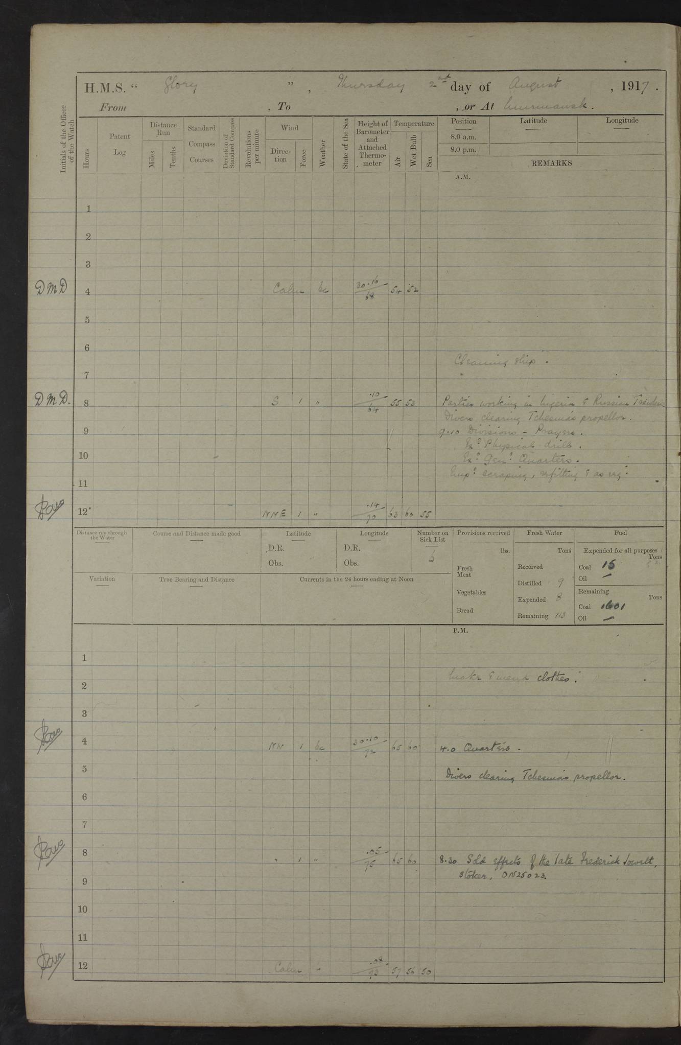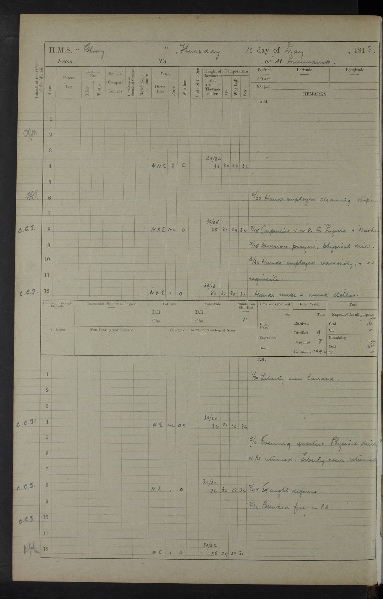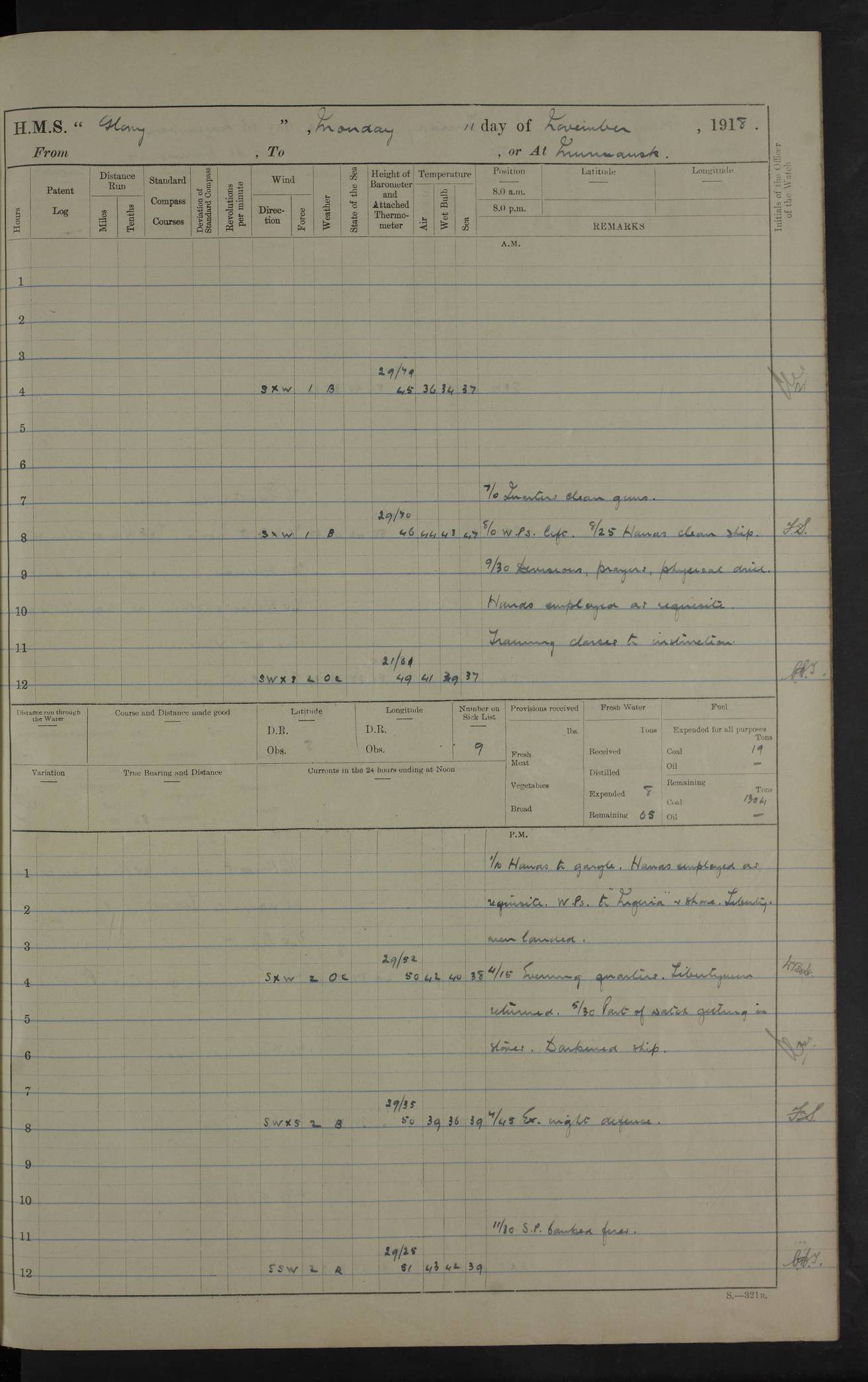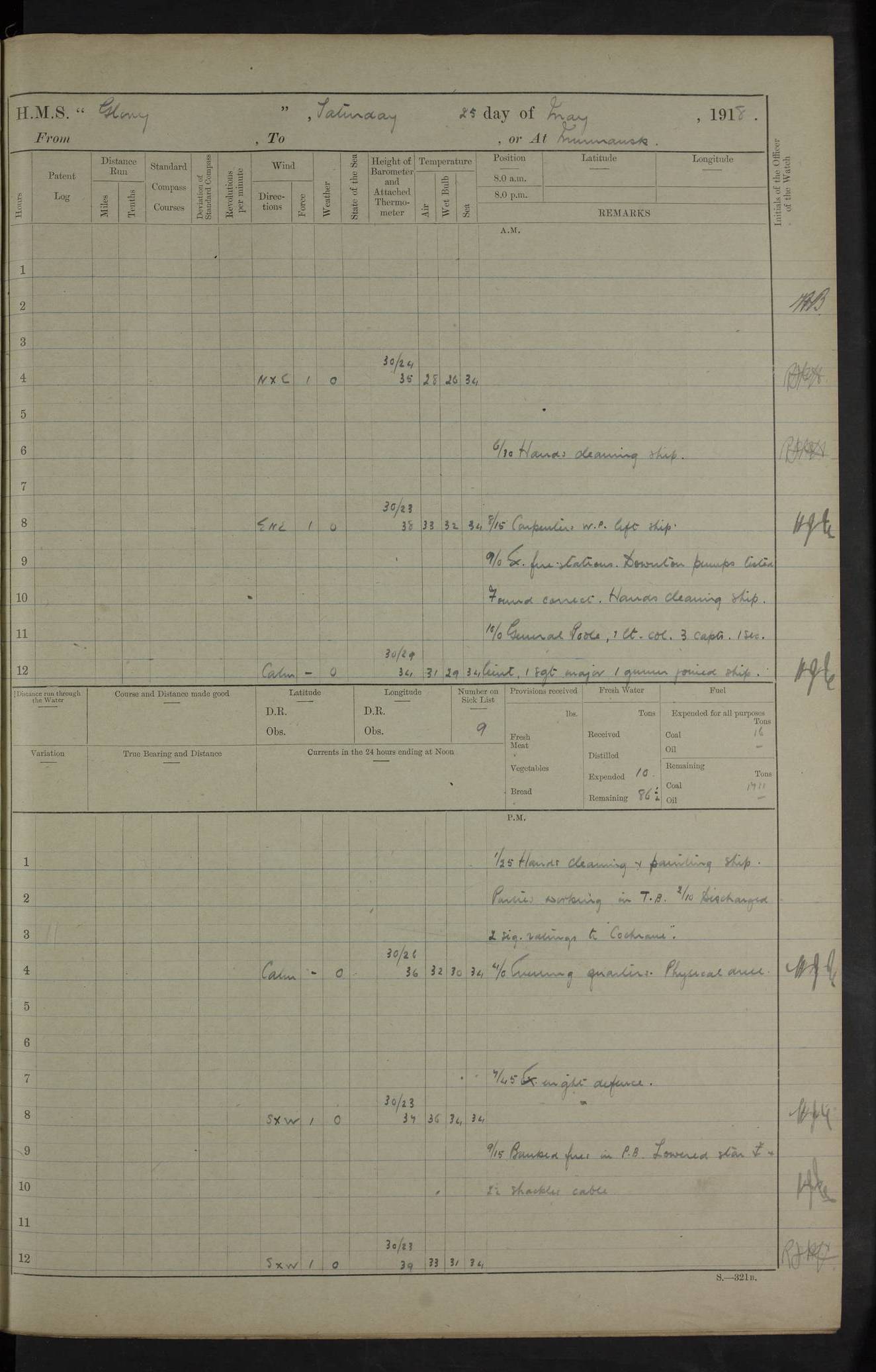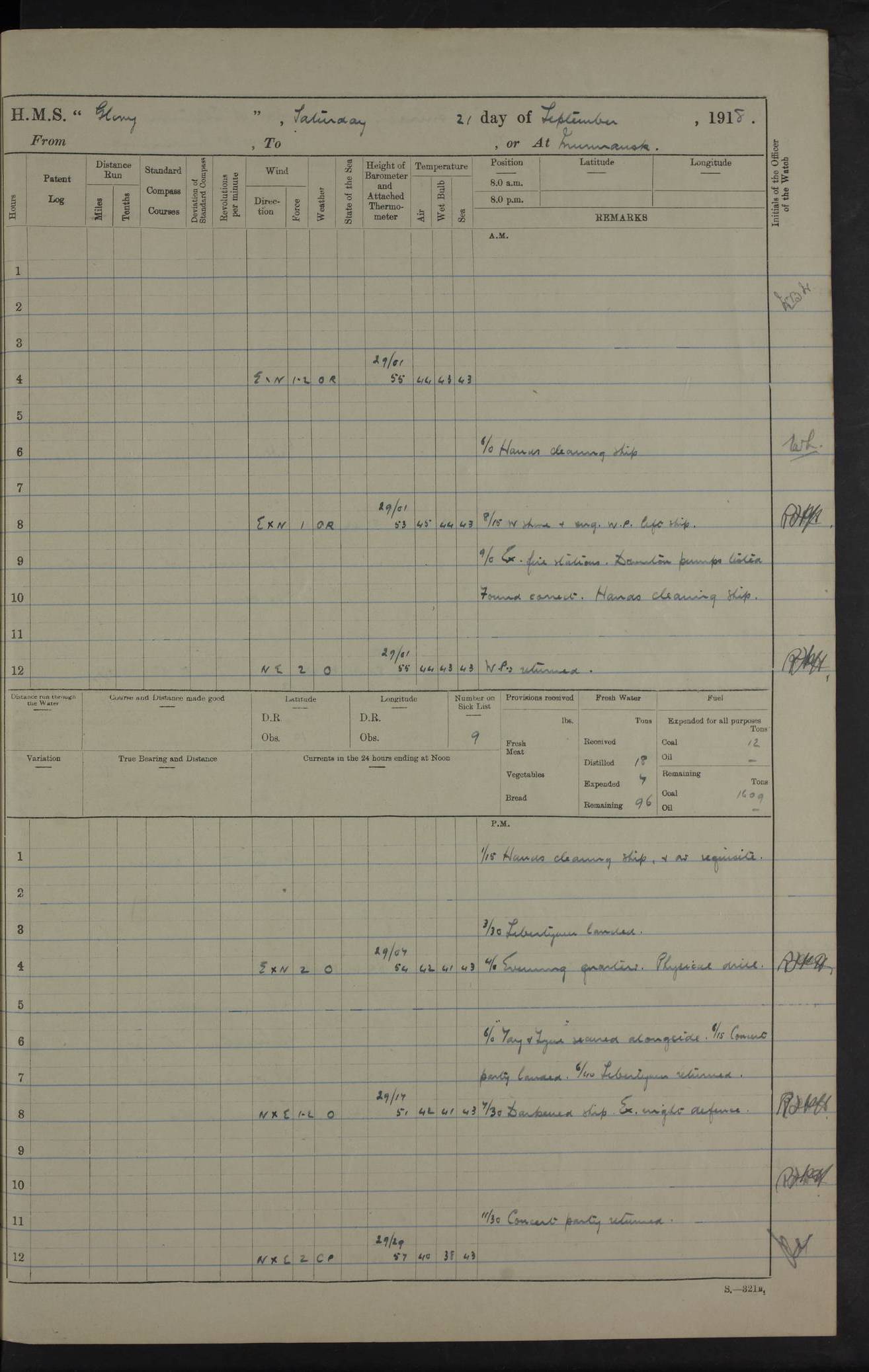 LOGS FOR OCTOBER 1916 For the period covered by the remainder of these logs (1 October, 1916 to 31 December 1918), HMS Glory was based at Murmansk, northern Russia. The city had a variety of names in the early 20th Century – including, Port Murman, Romanov and Murmansk. The location will be given in these pages as Murmansk, the modern name. A history of Murmansk’s names is available at http://en.wikipedia.org/wiki/Murmansk . 4f961482a2fc8e2def0011c7: (http://s3.amazonaws.com/oldweather/ADM53-43026/ADM 53-43026-001_0.jpg) This log is to be kept in a cover in future 4f961482a2fc8e2def0011c8: (http://s3.amazonaws.com/oldweather/ADM53-43026/ADM 53-43026-001_1.jpg) 4f961482a2fc8e2def0011c9: (http://s3.amazonaws.com/oldweather/ADM53-43026/ADM 53-43026-002_0.jpg) 4f961483a2fc8e2def0011ca: (http://s3.amazonaws.com/oldweather/ADM53-43026/ADM 53-43026-002_1.jpg) 4f961483a2fc8e2def0011cb: (http://s3.amazonaws.com/oldweather/ADM53-43026/ADM 53-43026-003_0.jpg) 4f961483a2fc8e2def0011cc: (http://s3.amazonaws.com/oldweather/ADM53-43026/ADM 53-43026-003_1.jpg) 1 October 1916 Murmansk Lat 69.03, Long 33.05 5.40am: Russian auxiliary Kolgiev sailed. Information regarding this vessel (or similar name) has not been found. 7.30am: Celebrated Holy Communion. am: Party working in Earl Essex. Earl Essex was a hired trawler of 225 grt, built, in 1914. Sourced from F.J. Dittmar & J.J. Colledge (1972) – British warships 1914–1919, Ian Allan. 10.45am: Held Divine Service. 11.30am: Celebrated Holy Communion. 4.45pm: Out nets. 4f961484a2fc8e2def0011cd: (http://s3.amazonaws.com/oldweather/ADM53-43026/ADM 53-43026-004_0.jpg) 2 October 1916 Murmansk Lat 69.03, Long 33.05 am: Party working in Earl Essex. 11.30am: Paid quarterly settlement. 6.15pm: Kolgiev arrived. 4f961484a2fc8e2def0011ce: (http://s3.amazonaws.com/oldweather/ADM53-43026/ADM 53-43026-004_1.jpg) 3 October 1916 Murmansk Lat 69.03, Long 33.05 Number on sick list: 9 9.20am: Aft port nets. 11.30am: Russian TBs Goorovoi and Plasteevyi(?) arrived. The first of these TBs is possibly ‘Grosovoi’, built at Le Havre around 1900. Her fate is unclear. The name of the second vessel is possibly incorrect, but no near match has been found. 1.30pm: Out port nets. 4f961484a2fc8e2def0011cf: (http://s3.amazonaws.com/oldweather/ADM53-43026/ADM 53-43026-005_0.jpg) 4 October 1916 Murmansk Lat 69.03, Long 33.05 8.30am: Salvator - broad pendant of Commodore T.W. Kemp arrived. Salvator (ex–Katoomba) was a hired yacht of 684 tons gross, built in 1903. She served as the Heliopolis in WW2. Details at WW1NavyBritishShips-Dittmar4AP.htm . 9.25am: Aft port nets. 11.05am: HE the Minister of Marine visited ship. 11.30am: Out port nets. 11.50am: Russian auxiliary Gotowsci(?) arrived. 12 noon: Kolgiev sailed. pm: HM Tug Blackcock arrived. Blackcock was a hired patrol tug, built in 1886 and wrecked on 18 January, 1918, in the White Sea. Sourced from F.J. Dittmar & J.J. Colledge (1972) – British warships 1914–1919, Ian Allan. 6.50pm: Kolgiev arrived. 4f961485a2fc8e2def0011d0: (http://s3.amazonaws.com/oldweather/ADM53-43026/ADM 53-43026-005_1.jpg) 5 October 1916 Murmansk Lat 69.03, Long 33.05 10.35am: Kolgiev sailed. 1.05pm: Salvator sailed. pm: Read Warrant No. 5. 4f961485a2fc8e2def0011d1: (http://s3.amazonaws.com/oldweather/ADM53-43026/ADM 53-43026-006_0.jpg) 6 October 1916 Murmansk Lat 69.03, Long 33.05 pm: 5 tons of water supplied to Blackcock. 3.30pm: Action. 3.45pm: Secure. Russian T.B's Grosovoi and Plasteevyi sailed. 4f961485a2fc8e2def0011d2: (http://s3.amazonaws.com/oldweather/ADM53-43026/ADM 53-43026-006_1.jpg) 7 October 1916 Murmansk Lat 69.03, Long 33.05 am: Party coaling trawler. am: Tested life buoys – correct. 4f961486a2fc8e2def0011d3: (http://s3.amazonaws.com/oldweather/ADM53-43026/ADM 53-43026-007_0.jpg) 8 October 1916 Murmansk Lat 69.03, Long 33.05 6.45am: Party working in collier. 7.30am: Celebrated Holy Communion. 10.45am: Held Divine service. 5.45pm: Held Divine Service. 4f961486a2fc8e2def0011d4: (http://s3.amazonaws.com/oldweather/ADM53-43026/ADM 53-43026-007_1.jpg) 9 October 1916 Murmansk Lat 69.03, Long 33.05 Number on sick list: 9 am: Exercised fire stations. am: 2nd pinnace patrolling. pm: Landed marines for drill. 4f961486a2fc8e2def0011d5: (http://s3.amazonaws.com/oldweather/ADM53-43026/ADM 53-43026-008_0.jpg) 10 October 1916 Murmansk Lat 69.03, Long 33.05 am: Steam pinnace patrolling. 1.55pm: Kolgiev arrived. 4f961487a2fc8e2def0011d6: (http://s3.amazonaws.com/oldweather/ADM53-43026/ADM 53-43026-008_1.jpg) 11 October 1916 Murmansk Lat 69.03, Long 33.05 am: Party working on boom defence. am: MT and QD men aired bedding. am: Marines at drill. 1.50pm: Kolgiev sailed. 3.15pm: British tug Racia (lighter ES 23 in tow) arrived. Racia was a hired screw tug of 410 grt, built in 1894 and sold on 23 June, 1920. Sourced from F.J. Dittmar & J.J. Colledge (1972) – British warships 1914–1919, Ian Allan. 4f961487a2fc8e2def0011d7: (http://s3.amazonaws.com/oldweather/ADM53-43026/ADM 53-43026-009_0.jpg) 12 October 1916 Murmansk Lat 69.03, Long 33.05 Number on sick list: 6 am: Party working on boom defence. am: Steam pinnace patrolling. pm: Make and mend clothes. 4.15pm: Read warrant No. 6. 6.00pm: Imperator Nicolas arrived. A vessel with this name has not been traced. 4f961487a2fc8e2def0011d8: (http://s3.amazonaws.com/oldweathe/ADM53-43026/ADM 53-43026-009_1.jpg) 13 October 1916 Murmansk Lat 69.03, Long 33.05 am: Steam pinnace patrolling. am: Party working on boom defence. am: Found foc’sle awning and side screens damaged by rats. 4f961488a2fc8e2def0011d9: (http://s3.amazonaws.com/oldweather/ADM53-43026/ADM 53-43026-010_0.jpg) 14 August 1916 (probably should read October) Murmansk Lat 69.03, Long 33.05 Number on sick list: 7 6.45am: Racia (floating crane in tow) sailed. am: Party working on boom defence. am: Tested life buoys – correct. 3.00pm: Vindictive arrived. HMS Vindictive was a protected cruiser of the Arrogant class, launched in 1897 at Chatham Dockyar