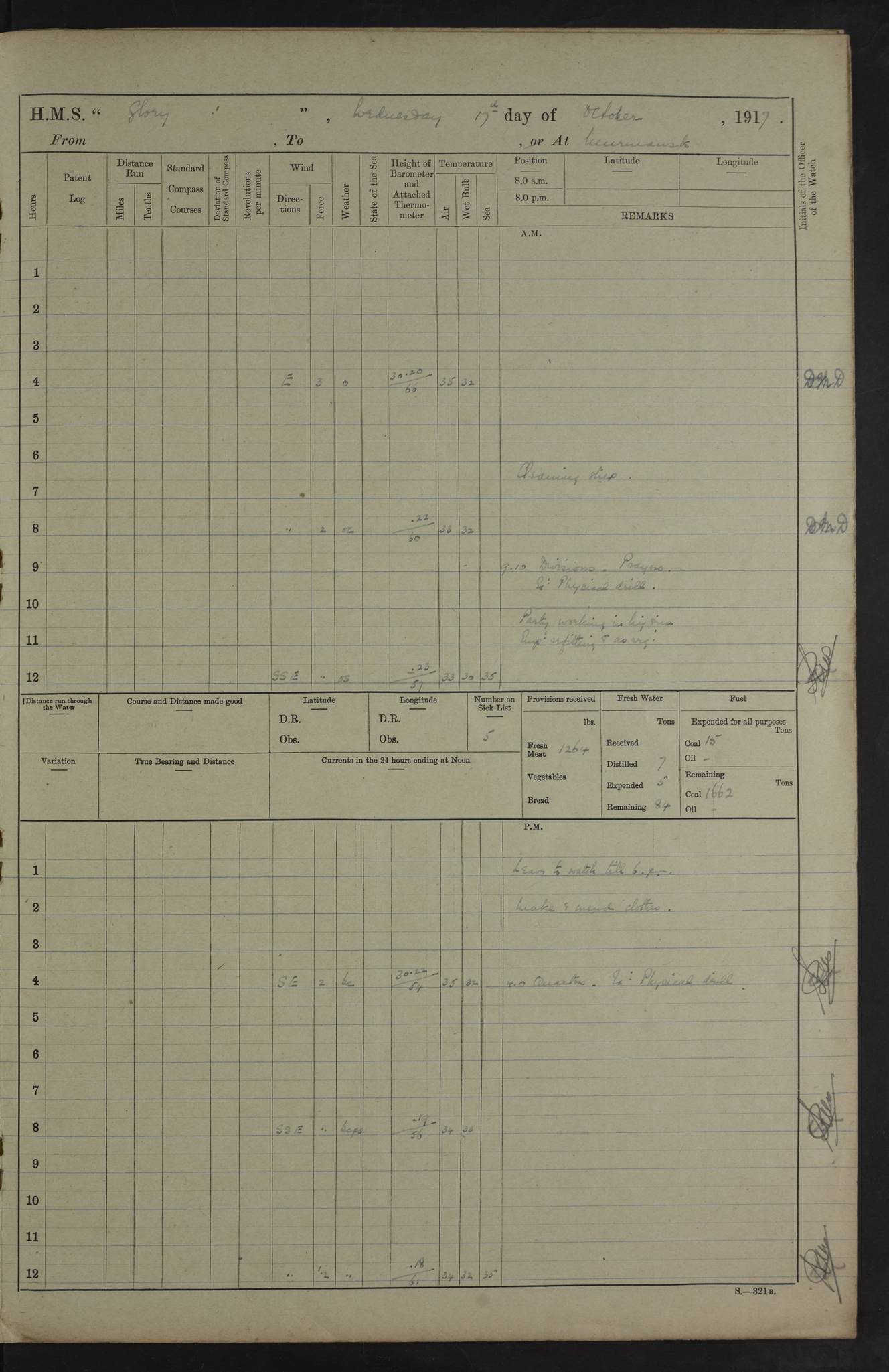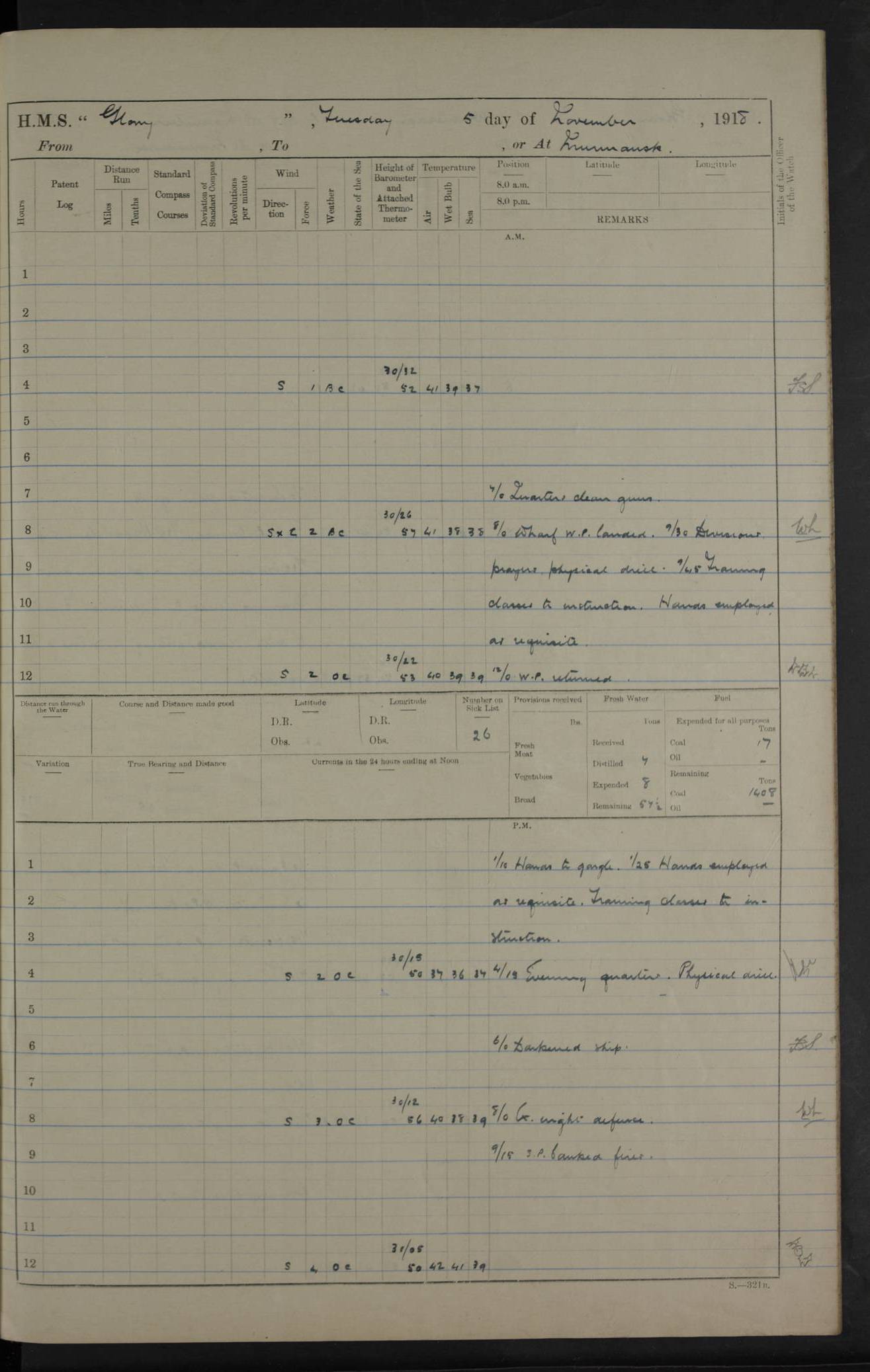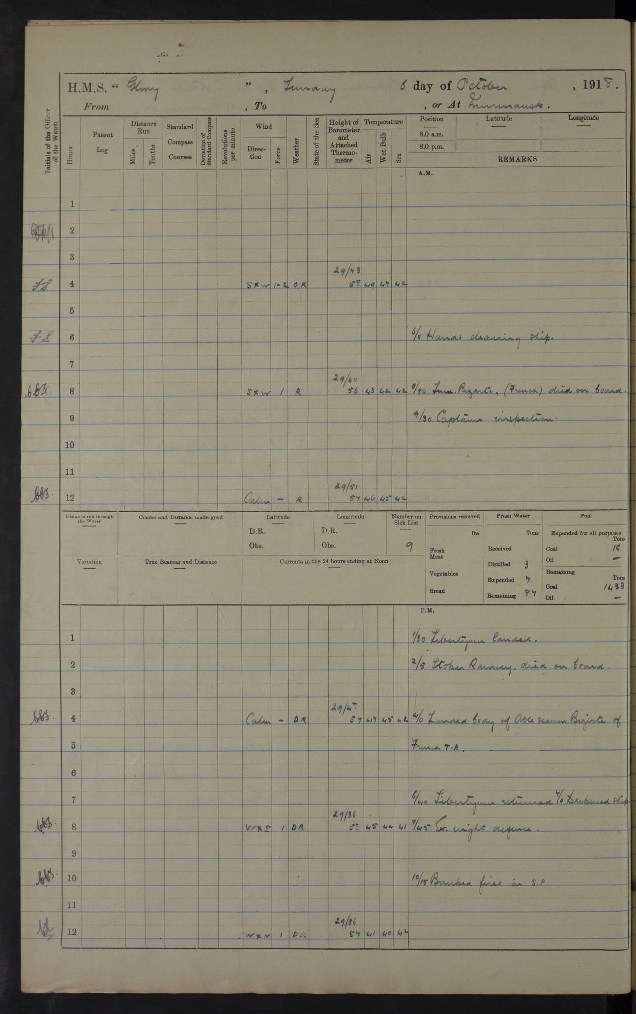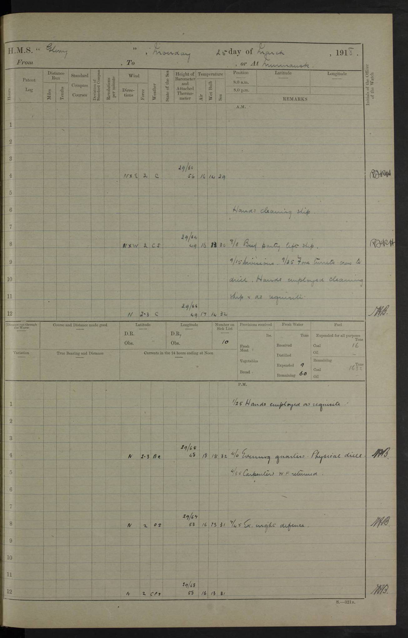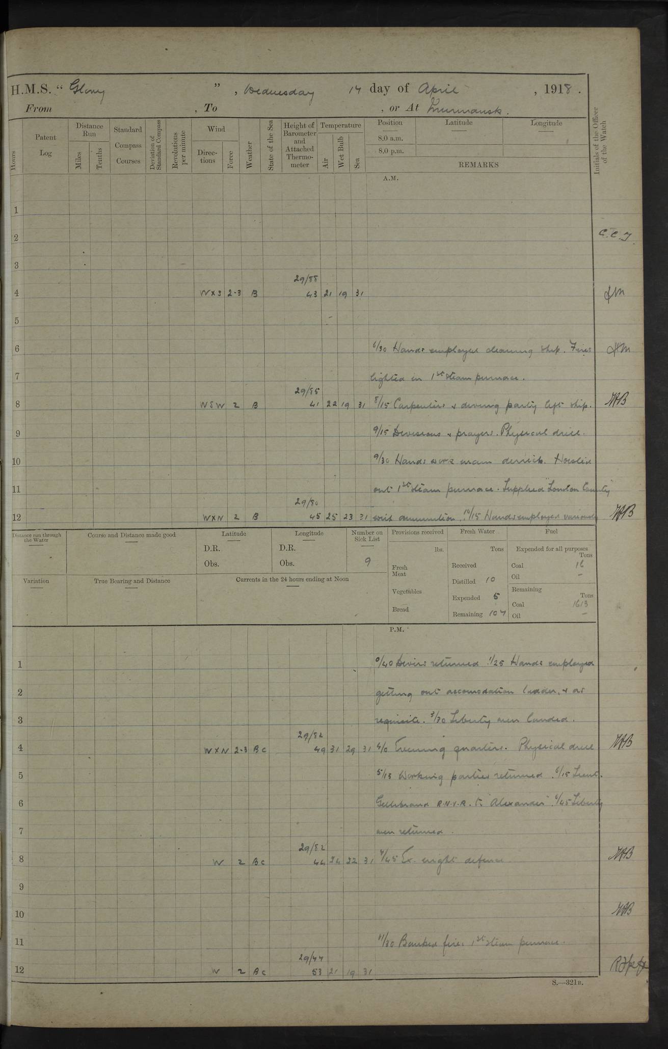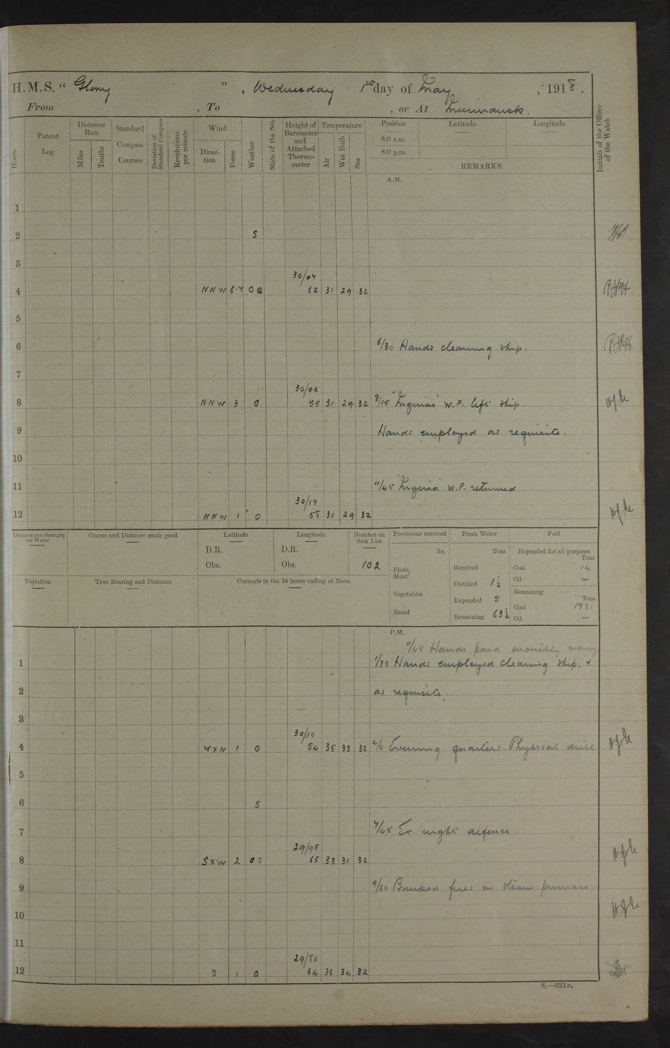 LOGS FOR OCTOBER 1916 For the period covered by the remainder of these logs (1 October, 1916 to 31 December 1918), HMS Glory was based at Murmansk, northern Russia. The city had a variety of names in the early 20th Century – including, Port Murman, Romanov and Murmansk. The location will be given in these pages as Murmansk, the modern name. A history of Murmansk’s names is available at http://en.wikipedia.org/wiki/Murmansk . 4f961482a2fc8e2def0011c7: (http://s3.amazonaws.com/oldweather/ADM53-43026/ADM 53-43026-001_0.jpg) This log is to be kept in a cover in future 4f961482a2fc8e2def0011c8: (http://s3.amazonaws.com/oldweather/ADM53-43026/ADM 53-43026-001_1.jpg) 4f961482a2fc8e2def0011c9: (http://s3.amazonaws.com/oldweather/ADM53-43026/ADM 53-43026-002_0.jpg) 4f961483a2fc8e2def0011ca: (http://s3.amazonaws.com/oldweather/ADM53-43026/ADM 53-43026-002_1.jpg) 4f961483a2fc8e2def0011cb: (http://s3.amazonaws.com/oldweather/ADM53-43026/ADM 53-43026-003_0.jpg) 4f961483a2fc8e2def0011cc: (http://s3.amazonaws.com/oldweather/ADM53-43026/ADM 53-43026-003_1.jpg) 1 October 1916 Murmansk Lat 69.03, Long 33.05 5.40am: Russian auxiliary Kolgiev sailed. Information regarding this vessel (or similar name) has not been found. 7.30am: Celebrated Holy Communion. am: Party working in Earl Essex. Earl Essex was a hired trawler of 225 grt, built, in 1914. Sourced from F.J. Dittmar & J.J. Colledge (1972) – British warships 1914–1919, Ian Allan. 10.45am: Held Divine Service. 11.30am: Celebrated Holy Communion. 4.45pm: Out nets. 4f961484a2fc8e2def0011cd: (http://s3.amazonaws.com/oldweather/ADM53-43026/ADM 53-43026-004_0.jpg) 2 October 1916 Murmansk Lat 69.03, Long 33.05 am: Party working in Earl Essex. 11.30am: Paid quarterly settlement. 6.15pm: Kolgiev arrived. 4f961484a2fc8e2def0011ce: (http://s3.amazonaws.com/oldweather/ADM53-43026/ADM 53-43026-004_1.jpg) 3 October 1916 Murmansk Lat 69.03, Long 33.05 Number on sick list: 9 9.20am: Aft port nets. 11.30am: Russian TBs Goorovoi and Plasteevyi(?) arrived. The first of these TBs is possibly ‘Grosovoi’, built at Le Havre around 1900. Her fate is unclear. The name of the second vessel is possibly incorrect, but no near match has been found. 1.30pm: Out port nets. 4f961484a2fc8e2def0011cf: (http://s3.amazonaws.com/oldweather/ADM53-43026/ADM 53-43026-005_0.jpg) 4 October 1916 Murmansk Lat 69.03, Long 33.05 8.30am: Salvator - broad pendant of Commodore T.W. Kemp arrived. Salvator (ex–Katoomba) was a hired yacht of 684 tons gross, built in 1903. She served as the Heliopolis in WW2. Details at WW1NavyBritishShips-Dittmar4AP.htm . 9.25am: Aft port nets. 11.05am: HE the Minister of Marine visited ship. 11.30am: Out port nets. 11.50am: Russian auxiliary Gotowsci(?) arrived. 12 noon: Kolgiev sailed. pm: HM Tug Blackcock arrived. Blackcock was a hired patrol tug, built in 1886 and wrecked on 18 January, 1918, in the White Sea. Sourced from F.J. Dittmar & J.J. Colledge (1972) – British warships 1914–1919, Ian Allan. 6.50pm: Kolgiev arrived. 4f961485a2fc8e2def0011d0: (http://s3.amazonaws.com/oldweather/ADM53-43026/ADM 53-43026-005_1.jpg) 5 October 1916 Murmansk Lat 69.03, Long 33.05 10.35am: Kolgiev sailed. 1.05pm: Salvator sailed. pm: Read Warrant No. 5. 4f961485a2fc8e2def0011d1: (http://s3.amazonaws.com/oldweather/ADM53-43026/ADM 53-43026-006_0.jpg) 6 October 1916 Murmansk Lat 69.03, Long 33.05 pm: 5 tons of water supplied to Blackcock. 3.30pm: Action. 3.45pm: Secure. Russian T.B's Grosovoi and Plasteevyi sailed. 4f961485a2fc8e2def0011d2: (http://s3.amazonaws.com/oldweather/ADM53-43026/ADM 53-43026-006_1.jpg) 7 October 1916 Murmansk Lat 69.03, Long 33.05 am: Party coaling trawler. am: Tested life buoys – correct. 4f961486a2fc8e2def0011d3: (http://s3.amazonaws.com/oldweather/ADM53-43026/ADM 53-43026-007_0.jpg) 8 October 1916 Murmansk Lat 69.03, Long 33.05 6.45am: Party working in collier. 7.30am: Celebrated Holy Communion. 10.45am: Held Divine service. 5.45pm: Held Divine Service. 4f961486a2fc8e2def0011d4: (http://s3.amazonaws.com/oldweather/ADM53-43026/ADM 53-43026-007_1.jpg) 9 October 1916 Murmansk Lat 69.03, Long 33.05 Number on sick list: 9 am: Exercised fire stations. am: 2nd pinnace patrolling. pm: Landed marines for drill. 4f961486a2fc8e2def0011d5: (http://s3.amazonaws.com/oldweather/ADM53-43026/ADM 53-43026-008_0.jpg) 10 October 1916 Murmansk Lat 69.03, Long 33.05 am: Steam pinnace patrolling. 1.55pm: Kolgiev arrived. 4f961487a2fc8e2def0011d6: (http://s3.amazonaws.com/oldweather/ADM53-43026/ADM 53-43026-008_1.jpg) 11 October 1916 Murmansk Lat 69.03, Long 33.05 am: Party working on boom defence. am: MT and QD men aired bedding. am: Marines at drill. 1.50pm: Kolgiev sailed. 3.15pm: British tug Racia (lighter ES 23 in tow) arrived. Racia was a hired screw tug of 410 grt, built in 1894 and sold on 23 June, 1920. Sourced from F.J. Dittmar & J.J. Colledge (1972) – British warships 1914–1919, Ian Allan. 4f961487a2fc8e2def0011d7: (http://s3.amazonaws.com/oldweather/ADM53-43026/ADM 53-43026-009_0.jpg) 12 October 1916 Murmansk Lat 69.03, Long 33.05 Number on sick list: 6 am: Party working on boom defence. am: Steam pinnace patrolling. pm: Make and mend clothes. 4.15pm: Read warrant No. 6. 6.00pm: Imperator Nicolas arrived. A vessel with this name has not been traced. 4f961487a2fc8e2def0011d8: (http://s3.amazonaws.com/oldweathe/ADM53-43026/ADM 53-43026-009_1.jpg) 13 October 1916 Murmansk Lat 69.03, Long 33.05 am: Steam pinnace patrolling. am: Party working on boom defence. am: Found foc’sle awning and side screens damaged by rats. 4f961488a2fc8e2def0011d9: (http://s3.amazonaws.com/oldweather/ADM53-43026/ADM 53-43026-010_0.jpg) 14 August 1916 (probably should read October) Murmansk Lat 69.03, Long 33.05 Number on sick list: 7 6.45am: Racia (floating crane in tow) sailed. am: Party working on boom defence. am: Tested life buoys – correct. 3.00pm: Vindictive arrived. HMS Vindictive was a protected cruiser of the Arrogant class, launched in 1897 at Chatham Dockyar