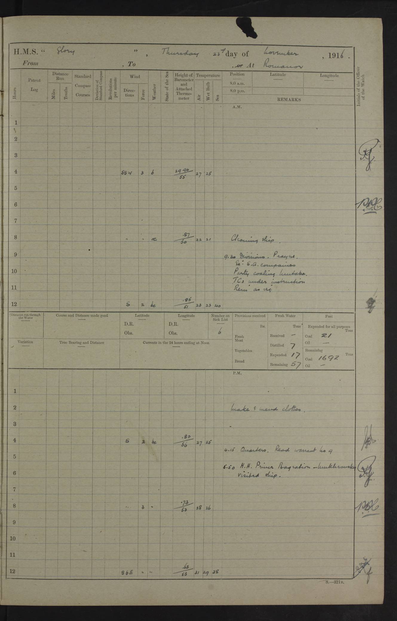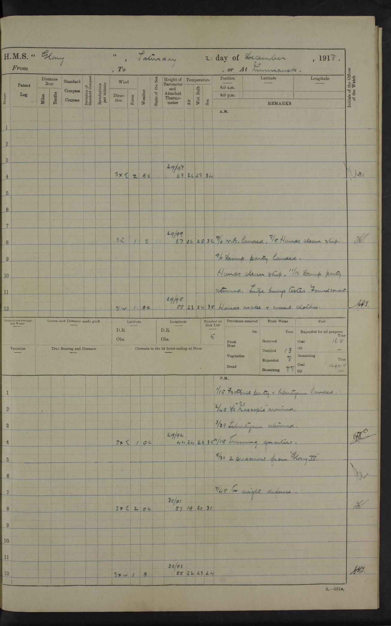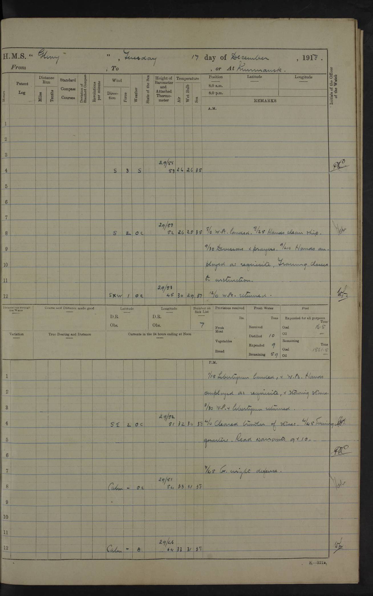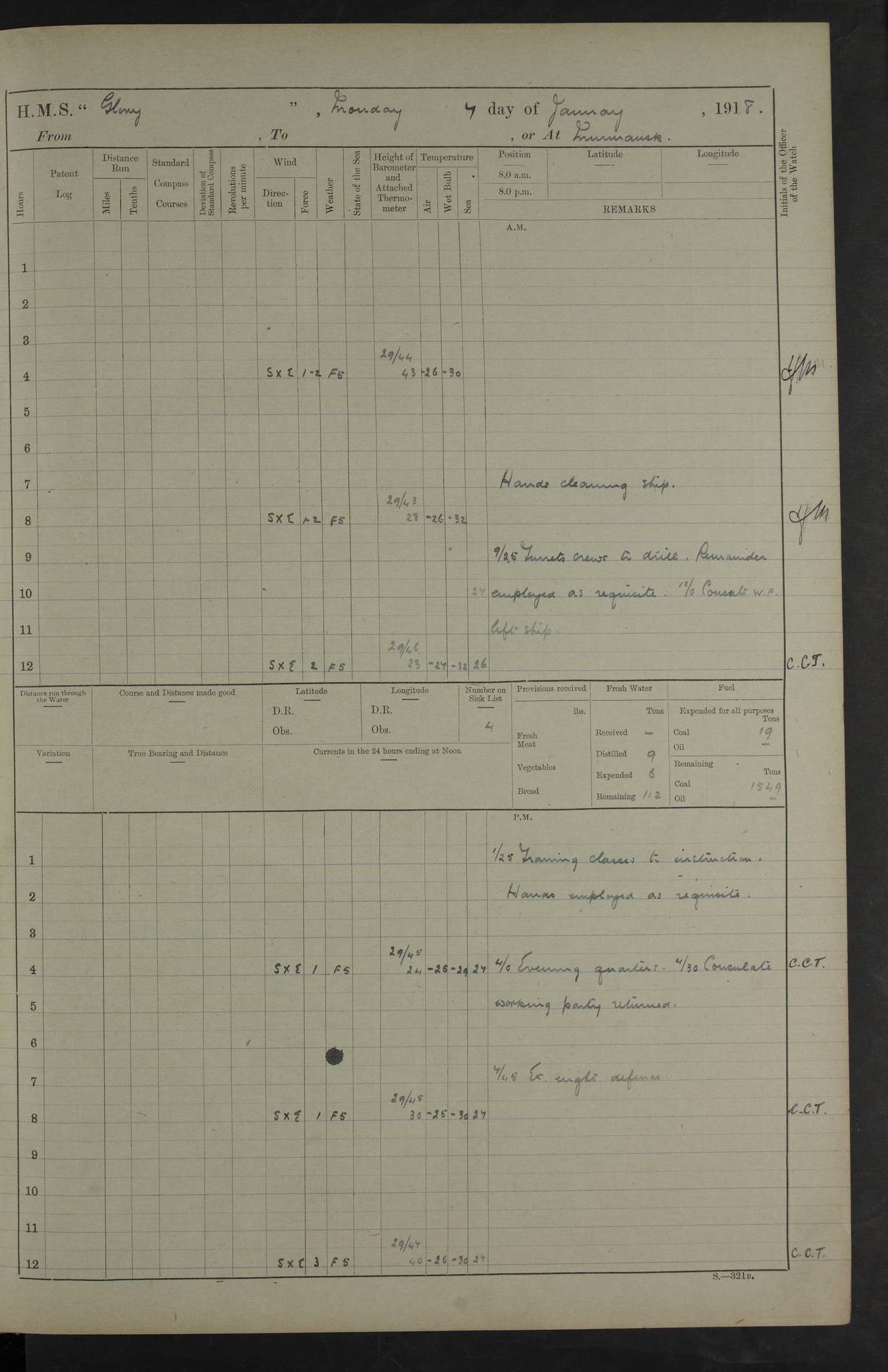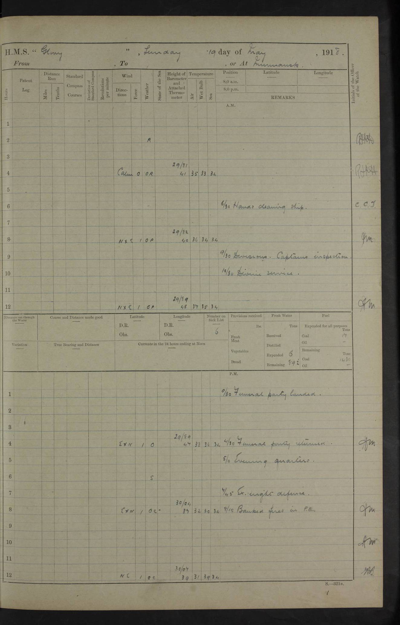 LOGS FOR OCTOBER 1916 For the period covered by the remainder of these logs (1 October, 1916 to 31 December 1918), HMS Glory was based at Murmansk, northern Russia. The city had a variety of names in the early 20th Century – including, Port Murman, Romanov and Murmansk. The location will be given in these pages as Murmansk, the modern name. A history of Murmansk’s names is available at http://en.wikipedia.org/wiki/Murmansk . 4f961482a2fc8e2def0011c7: (http://s3.amazonaws.com/oldweather/ADM53-43026/ADM 53-43026-001_0.jpg) This log is to be kept in a cover in future 4f961482a2fc8e2def0011c8: (http://s3.amazonaws.com/oldweather/ADM53-43026/ADM 53-43026-001_1.jpg) 4f961482a2fc8e2def0011c9: (http://s3.amazonaws.com/oldweather/ADM53-43026/ADM 53-43026-002_0.jpg) 4f961483a2fc8e2def0011ca: (http://s3.amazonaws.com/oldweather/ADM53-43026/ADM 53-43026-002_1.jpg) 4f961483a2fc8e2def0011cb: (http://s3.amazonaws.com/oldweather/ADM53-43026/ADM 53-43026-003_0.jpg) 4f961483a2fc8e2def0011cc: (http://s3.amazonaws.com/oldweather/ADM53-43026/ADM 53-43026-003_1.jpg) 1 October 1916 Murmansk Lat 69.03, Long 33.05 5.40am: Russian auxiliary Kolgiev sailed. Information regarding this vessel (or similar name) has not been found. 7.30am: Celebrated Holy Communion. am: Party working in Earl Essex. Earl Essex was a hired trawler of 225 grt, built, in 1914. Sourced from F.J. Dittmar & J.J. Colledge (1972) – British warships 1914–1919, Ian Allan. 10.45am: Held Divine Service. 11.30am: Celebrated Holy Communion. 4.45pm: Out nets. 4f961484a2fc8e2def0011cd: (http://s3.amazonaws.com/oldweather/ADM53-43026/ADM 53-43026-004_0.jpg) 2 October 1916 Murmansk Lat 69.03, Long 33.05 am: Party working in Earl Essex. 11.30am: Paid quarterly settlement. 6.15pm: Kolgiev arrived. 4f961484a2fc8e2def0011ce: (http://s3.amazonaws.com/oldweather/ADM53-43026/ADM 53-43026-004_1.jpg) 3 October 1916 Murmansk Lat 69.03, Long 33.05 Number on sick list: 9 9.20am: Aft port nets. 11.30am: Russian TBs Goorovoi and Plasteevyi(?) arrived. The first of these TBs is possibly ‘Grosovoi’, built at Le Havre around 1900. Her fate is unclear. The name of the second vessel is possibly incorrect, but no near match has been found. 1.30pm: Out port nets. 4f961484a2fc8e2def0011cf: (http://s3.amazonaws.com/oldweather/ADM53-43026/ADM 53-43026-005_0.jpg) 4 October 1916 Murmansk Lat 69.03, Long 33.05 8.30am: Salvator - broad pendant of Commodore T.W. Kemp arrived. Salvator (ex–Katoomba) was a hired yacht of 684 tons gross, built in 1903. She served as the Heliopolis in WW2. Details at WW1NavyBritishShips-Dittmar4AP.htm . 9.25am: Aft port nets. 11.05am: HE the Minister of Marine visited ship. 11.30am: Out port nets. 11.50am: Russian auxiliary Gotowsci(?) arrived. 12 noon: Kolgiev sailed. pm: HM Tug Blackcock arrived. Blackcock was a hired patrol tug, built in 1886 and wrecked on 18 January, 1918, in the White Sea. Sourced from F.J. Dittmar & J.J. Colledge (1972) – British warships 1914–1919, Ian Allan. 6.50pm: Kolgiev arrived. 4f961485a2fc8e2def0011d0: (http://s3.amazonaws.com/oldweather/ADM53-43026/ADM 53-43026-005_1.jpg) 5 October 1916 Murmansk Lat 69.03, Long 33.05 10.35am: Kolgiev sailed. 1.05pm: Salvator sailed. pm: Read Warrant No. 5. 4f961485a2fc8e2def0011d1: (http://s3.amazonaws.com/oldweather/ADM53-43026/ADM 53-43026-006_0.jpg) 6 October 1916 Murmansk Lat 69.03, Long 33.05 pm: 5 tons of water supplied to Blackcock. 3.30pm: Action. 3.45pm: Secure. Russian T.B's Grosovoi and Plasteevyi sailed. 4f961485a2fc8e2def0011d2: (http://s3.amazonaws.com/oldweather/ADM53-43026/ADM 53-43026-006_1.jpg) 7 October 1916 Murmansk Lat 69.03, Long 33.05 am: Party coaling trawler. am: Tested life buoys – correct. 4f961486a2fc8e2def0011d3: (http://s3.amazonaws.com/oldweather/ADM53-43026/ADM 53-43026-007_0.jpg) 8 October 1916 Murmansk Lat 69.03, Long 33.05 6.45am: Party working in collier. 7.30am: Celebrated Holy Communion. 10.45am: Held Divine service. 5.45pm: Held Divine Service. 4f961486a2fc8e2def0011d4: (http://s3.amazonaws.com/oldweather/ADM53-43026/ADM 53-43026-007_1.jpg) 9 October 1916 Murmansk Lat 69.03, Long 33.05 Number on sick list: 9 am: Exercised fire stations. am: 2nd pinnace patrolling. pm: Landed marines for drill. 4f961486a2fc8e2def0011d5: (http://s3.amazonaws.com/oldweather/ADM53-43026/ADM 53-43026-008_0.jpg) 10 October 1916 Murmansk Lat 69.03, Long 33.05 am: Steam pinnace patrolling. 1.55pm: Kolgiev arrived. 4f961487a2fc8e2def0011d6: (http://s3.amazonaws.com/oldweather/ADM53-43026/ADM 53-43026-008_1.jpg) 11 October 1916 Murmansk Lat 69.03, Long 33.05 am: Party working on boom defence. am: MT and QD men aired bedding. am: Marines at drill. 1.50pm: Kolgiev sailed. 3.15pm: British tug Racia (lighter ES 23 in tow) arrived. Racia was a hired screw tug of 410 grt, built in 1894 and sold on 23 June, 1920. Sourced from F.J. Dittmar & J.J. Colledge (1972) – British warships 1914–1919, Ian Allan. 4f961487a2fc8e2def0011d7: (http://s3.amazonaws.com/oldweather/ADM53-43026/ADM 53-43026-009_0.jpg) 12 October 1916 Murmansk Lat 69.03, Long 33.05 Number on sick list: 6 am: Party working on boom defence. am: Steam pinnace patrolling. pm: Make and mend clothes. 4.15pm: Read warrant No. 6. 6.00pm: Imperator Nicolas arrived. A vessel with this name has not been traced. 4f961487a2fc8e2def0011d8: (http://s3.amazonaws.com/oldweathe/ADM53-43026/ADM 53-43026-009_1.jpg) 13 October 1916 Murmansk Lat 69.03, Long 33.05 am: Steam pinnace patrolling. am: Party working on boom defence. am: Found foc’sle awning and side screens damaged by rats. 4f961488a2fc8e2def0011d9: (http://s3.amazonaws.com/oldweather/ADM53-43026/ADM 53-43026-010_0.jpg) 14 August 1916 (probably should read October) Murmansk Lat 69.03, Long 33.05 Number on sick list: 7 6.45am: Racia (floating crane in tow) sailed. am: Party working on boom defence. am: Tested life buoys – correct. 3.00pm: Vindictive arrived. HMS Vindictive was a protected cruiser of the Arrogant class, launched in 1897 at Chatham Dockyar