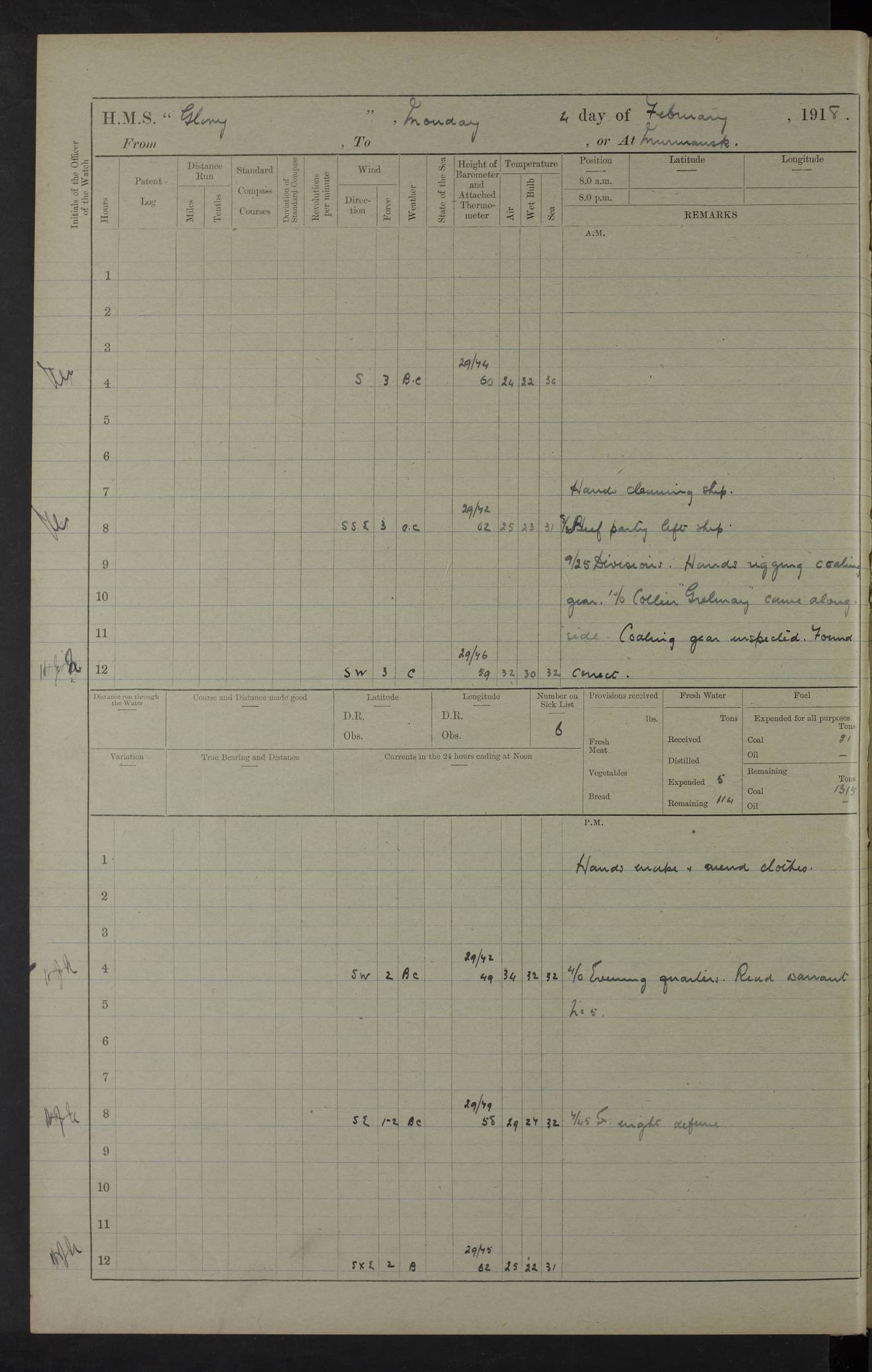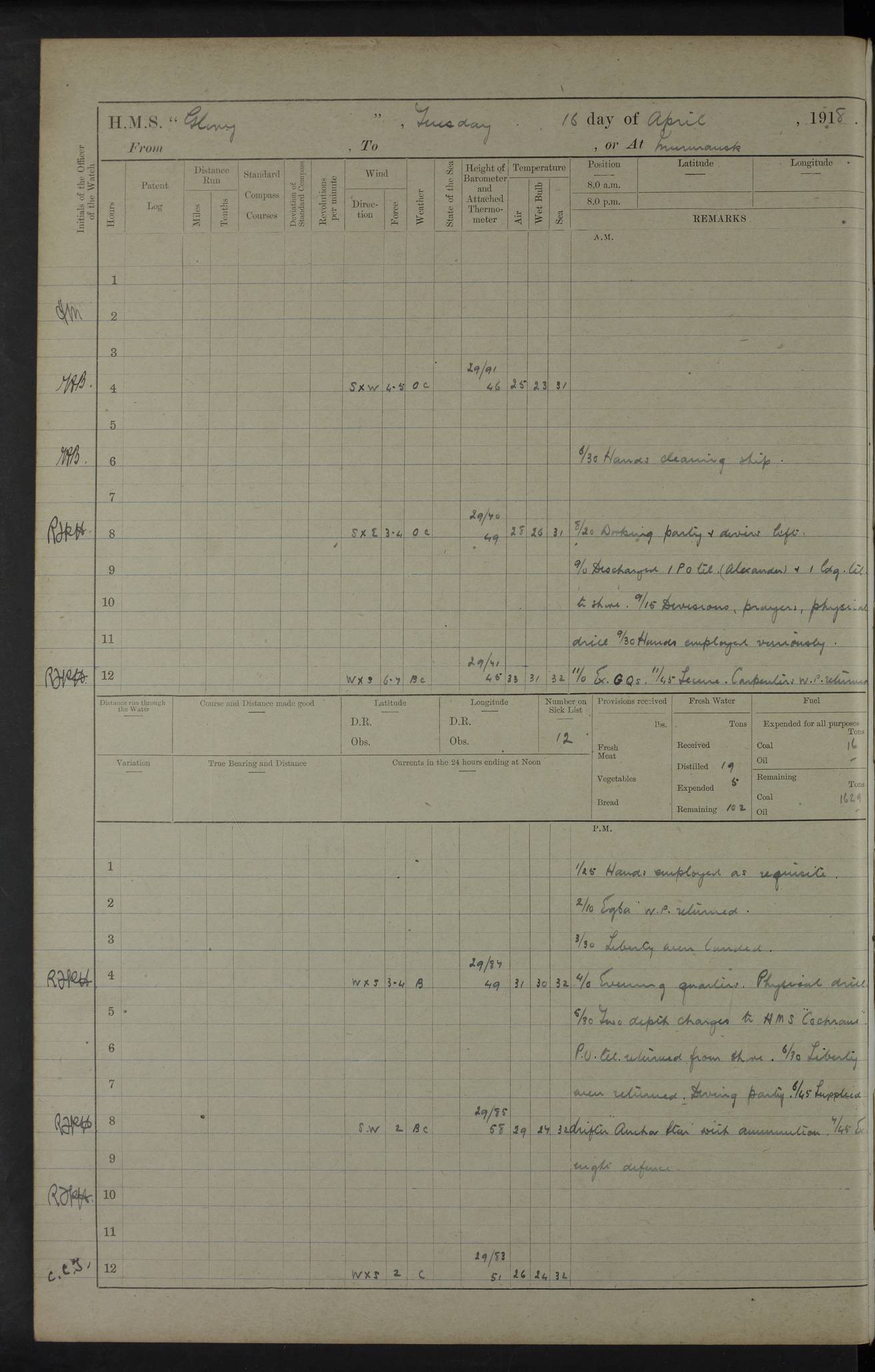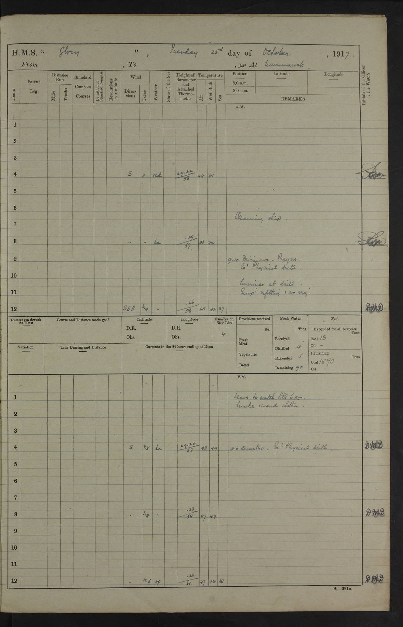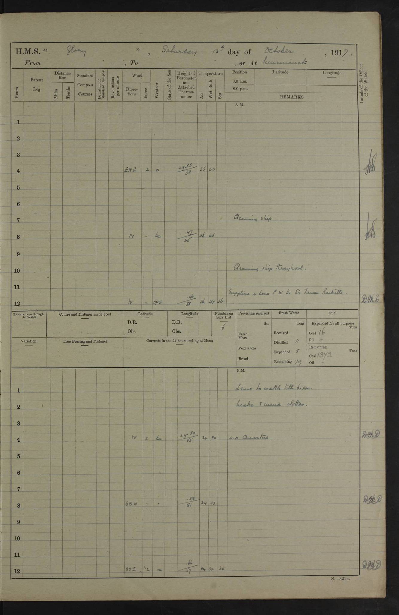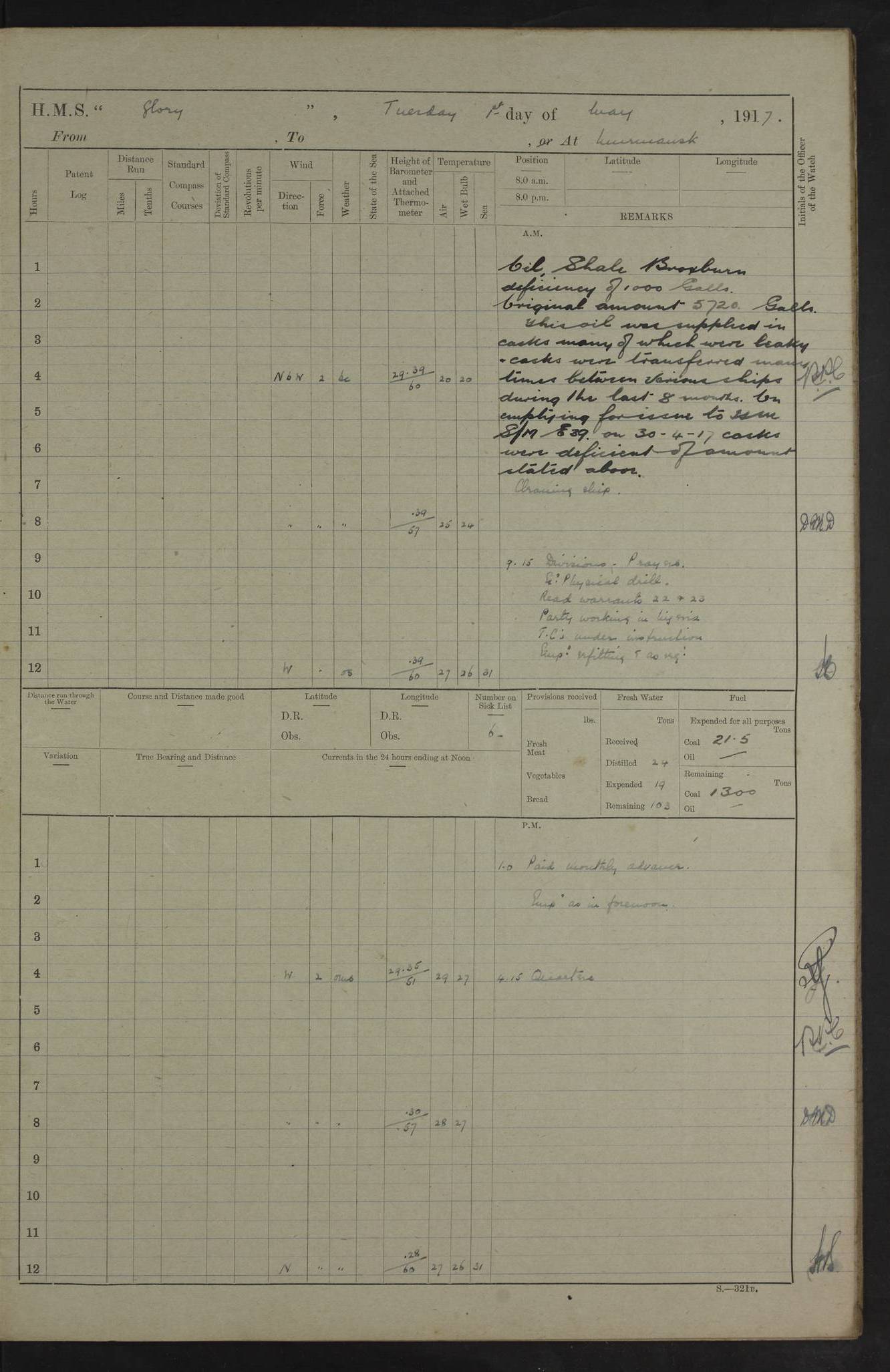 LOGS FOR OCTOBER 1916 For the period covered by the remainder of these logs (1 October, 1916 to 31 December 1918), HMS Glory was based at Murmansk, northern Russia. The city had a variety of names in the early 20th Century – including, Port Murman, Romanov and Murmansk. The location will be given in these pages as Murmansk, the modern name. A history of Murmansk’s names is available at http://en.wikipedia.org/wiki/Murmansk . 4f961482a2fc8e2def0011c7: (http://s3.amazonaws.com/oldweather/ADM53-43026/ADM 53-43026-001_0.jpg) This log is to be kept in a cover in future 4f961482a2fc8e2def0011c8: (http://s3.amazonaws.com/oldweather/ADM53-43026/ADM 53-43026-001_1.jpg) 4f961482a2fc8e2def0011c9: (http://s3.amazonaws.com/oldweather/ADM53-43026/ADM 53-43026-002_0.jpg) 4f961483a2fc8e2def0011ca: (http://s3.amazonaws.com/oldweather/ADM53-43026/ADM 53-43026-002_1.jpg) 4f961483a2fc8e2def0011cb: (http://s3.amazonaws.com/oldweather/ADM53-43026/ADM 53-43026-003_0.jpg) 4f961483a2fc8e2def0011cc: (http://s3.amazonaws.com/oldweather/ADM53-43026/ADM 53-43026-003_1.jpg) 1 October 1916 Murmansk Lat 69.03, Long 33.05 5.40am: Russian auxiliary Kolgiev sailed. Information regarding this vessel (or similar name) has not been found. 7.30am: Celebrated Holy Communion. am: Party working in Earl Essex. Earl Essex was a hired trawler of 225 grt, built, in 1914. Sourced from F.J. Dittmar & J.J. Colledge (1972) – British warships 1914–1919, Ian Allan. 10.45am: Held Divine Service. 11.30am: Celebrated Holy Communion. 4.45pm: Out nets. 4f961484a2fc8e2def0011cd: (http://s3.amazonaws.com/oldweather/ADM53-43026/ADM 53-43026-004_0.jpg) 2 October 1916 Murmansk Lat 69.03, Long 33.05 am: Party working in Earl Essex. 11.30am: Paid quarterly settlement. 6.15pm: Kolgiev arrived. 4f961484a2fc8e2def0011ce: (http://s3.amazonaws.com/oldweather/ADM53-43026/ADM 53-43026-004_1.jpg) 3 October 1916 Murmansk Lat 69.03, Long 33.05 Number on sick list: 9 9.20am: Aft port nets. 11.30am: Russian TBs Goorovoi and Plasteevyi(?) arrived. The first of these TBs is possibly ‘Grosovoi’, built at Le Havre around 1900. Her fate is unclear. The name of the second vessel is possibly incorrect, but no near match has been found. 1.30pm: Out port nets. 4f961484a2fc8e2def0011cf: (http://s3.amazonaws.com/oldweather/ADM53-43026/ADM 53-43026-005_0.jpg) 4 October 1916 Murmansk Lat 69.03, Long 33.05 8.30am: Salvator - broad pendant of Commodore T.W. Kemp arrived. Salvator (ex–Katoomba) was a hired yacht of 684 tons gross, built in 1903. She served as the Heliopolis in WW2. Details at WW1NavyBritishShips-Dittmar4AP.htm . 9.25am: Aft port nets. 11.05am: HE the Minister of Marine visited ship. 11.30am: Out port nets. 11.50am: Russian auxiliary Gotowsci(?) arrived. 12 noon: Kolgiev sailed. pm: HM Tug Blackcock arrived. Blackcock was a hired patrol tug, built in 1886 and wrecked on 18 January, 1918, in the White Sea. Sourced from F.J. Dittmar & J.J. Colledge (1972) – British warships 1914–1919, Ian Allan. 6.50pm: Kolgiev arrived. 4f961485a2fc8e2def0011d0: (http://s3.amazonaws.com/oldweather/ADM53-43026/ADM 53-43026-005_1.jpg) 5 October 1916 Murmansk Lat 69.03, Long 33.05 10.35am: Kolgiev sailed. 1.05pm: Salvator sailed. pm: Read Warrant No. 5. 4f961485a2fc8e2def0011d1: (http://s3.amazonaws.com/oldweather/ADM53-43026/ADM 53-43026-006_0.jpg) 6 October 1916 Murmansk Lat 69.03, Long 33.05 pm: 5 tons of water supplied to Blackcock. 3.30pm: Action. 3.45pm: Secure. Russian T.B's Grosovoi and Plasteevyi sailed. 4f961485a2fc8e2def0011d2: (http://s3.amazonaws.com/oldweather/ADM53-43026/ADM 53-43026-006_1.jpg) 7 October 1916 Murmansk Lat 69.03, Long 33.05 am: Party coaling trawler. am: Tested life buoys – correct. 4f961486a2fc8e2def0011d3: (http://s3.amazonaws.com/oldweather/ADM53-43026/ADM 53-43026-007_0.jpg) 8 October 1916 Murmansk Lat 69.03, Long 33.05 6.45am: Party working in collier. 7.30am: Celebrated Holy Communion. 10.45am: Held Divine service. 5.45pm: Held Divine Service. 4f961486a2fc8e2def0011d4: (http://s3.amazonaws.com/oldweather/ADM53-43026/ADM 53-43026-007_1.jpg) 9 October 1916 Murmansk Lat 69.03, Long 33.05 Number on sick list: 9 am: Exercised fire stations. am: 2nd pinnace patrolling. pm: Landed marines for drill. 4f961486a2fc8e2def0011d5: (http://s3.amazonaws.com/oldweather/ADM53-43026/ADM 53-43026-008_0.jpg) 10 October 1916 Murmansk Lat 69.03, Long 33.05 am: Steam pinnace patrolling. 1.55pm: Kolgiev arrived. 4f961487a2fc8e2def0011d6: (http://s3.amazonaws.com/oldweather/ADM53-43026/ADM 53-43026-008_1.jpg) 11 October 1916 Murmansk Lat 69.03, Long 33.05 am: Party working on boom defence. am: MT and QD men aired bedding. am: Marines at drill. 1.50pm: Kolgiev sailed. 3.15pm: British tug Racia (lighter ES 23 in tow) arrived. Racia was a hired screw tug of 410 grt, built in 1894 and sold on 23 June, 1920. Sourced from F.J. Dittmar & J.J. Colledge (1972) – British warships 1914–1919, Ian Allan. 4f961487a2fc8e2def0011d7: (http://s3.amazonaws.com/oldweather/ADM53-43026/ADM 53-43026-009_0.jpg) 12 October 1916 Murmansk Lat 69.03, Long 33.05 Number on sick list: 6 am: Party working on boom defence. am: Steam pinnace patrolling. pm: Make and mend clothes. 4.15pm: Read warrant No. 6. 6.00pm: Imperator Nicolas arrived. A vessel with this name has not been traced. 4f961487a2fc8e2def0011d8: (http://s3.amazonaws.com/oldweathe/ADM53-43026/ADM 53-43026-009_1.jpg) 13 October 1916 Murmansk Lat 69.03, Long 33.05 am: Steam pinnace patrolling. am: Party working on boom defence. am: Found foc’sle awning and side screens damaged by rats. 4f961488a2fc8e2def0011d9: (http://s3.amazonaws.com/oldweather/ADM53-43026/ADM 53-43026-010_0.jpg) 14 August 1916 (probably should read October) Murmansk Lat 69.03, Long 33.05 Number on sick list: 7 6.45am: Racia (floating crane in tow) sailed. am: Party working on boom defence. am: Tested life buoys – correct. 3.00pm: Vindictive arrived. HMS Vindictive was a protected cruiser of the Arrogant class, launched in 1897 at Chatham Dockyar