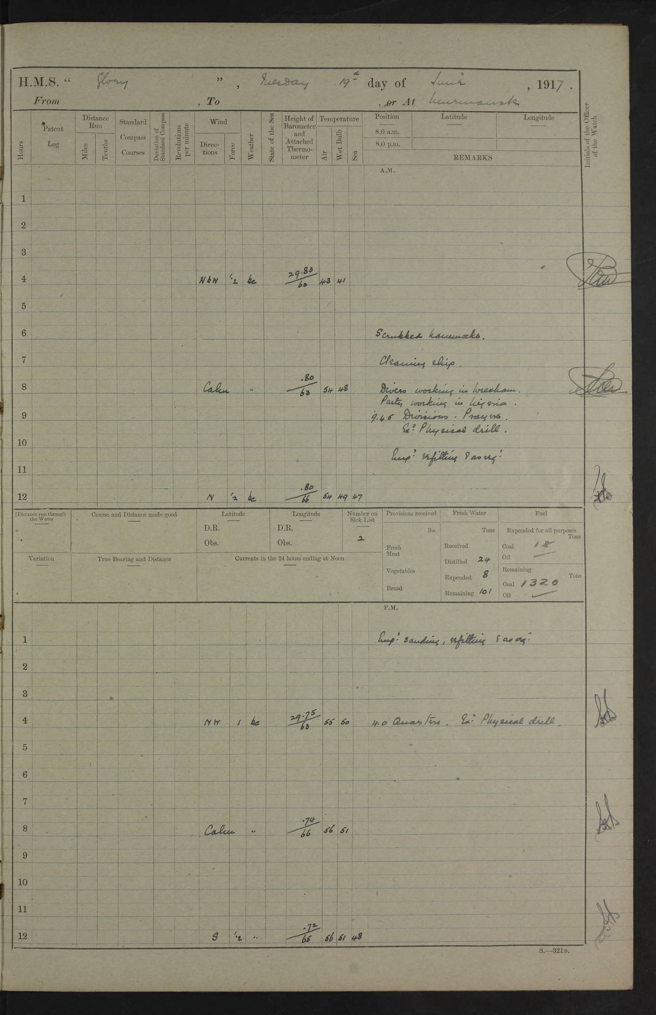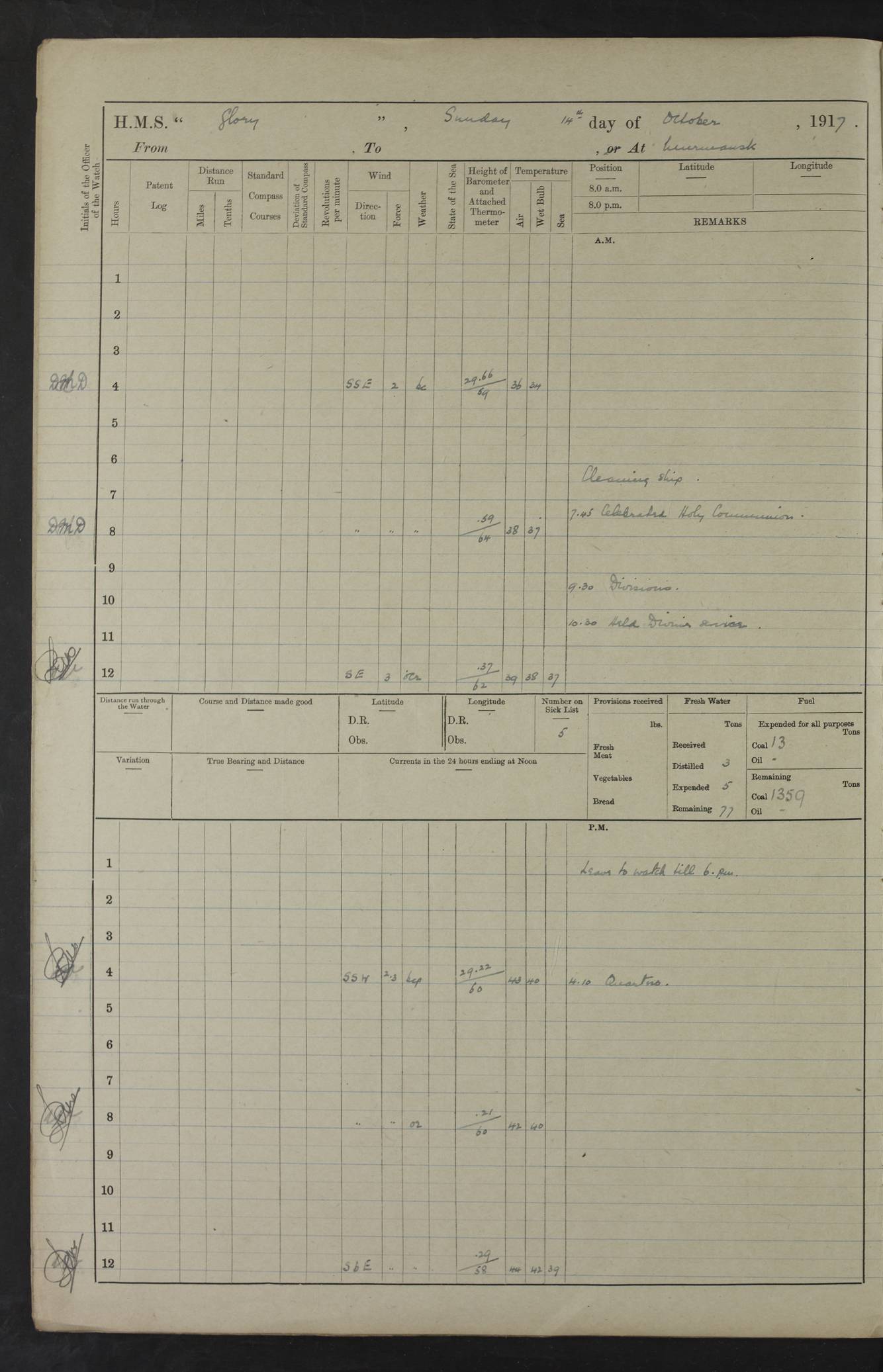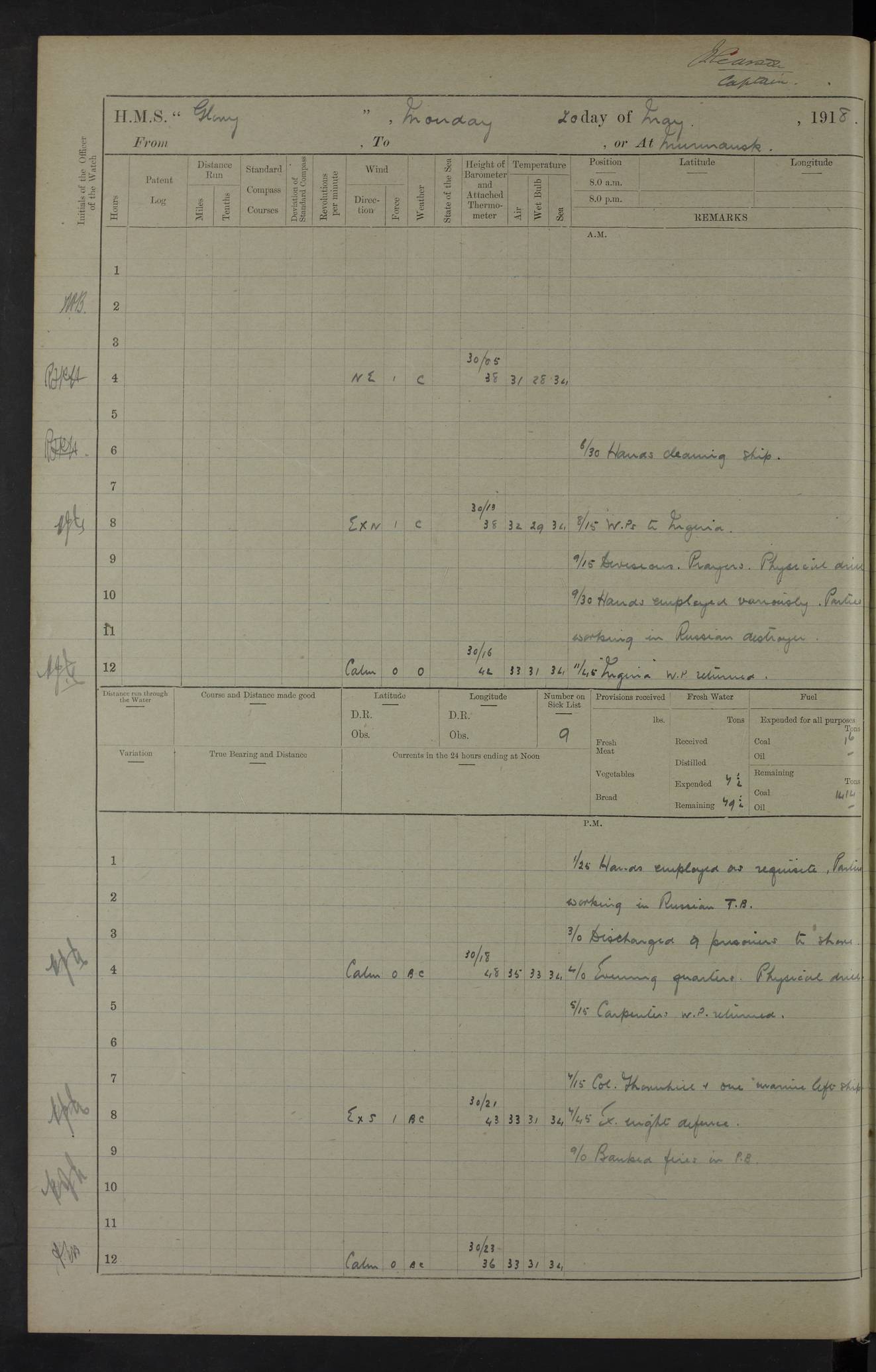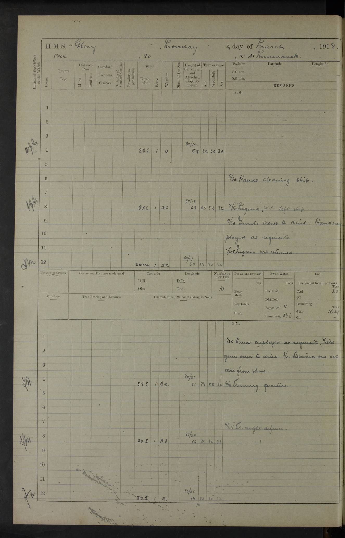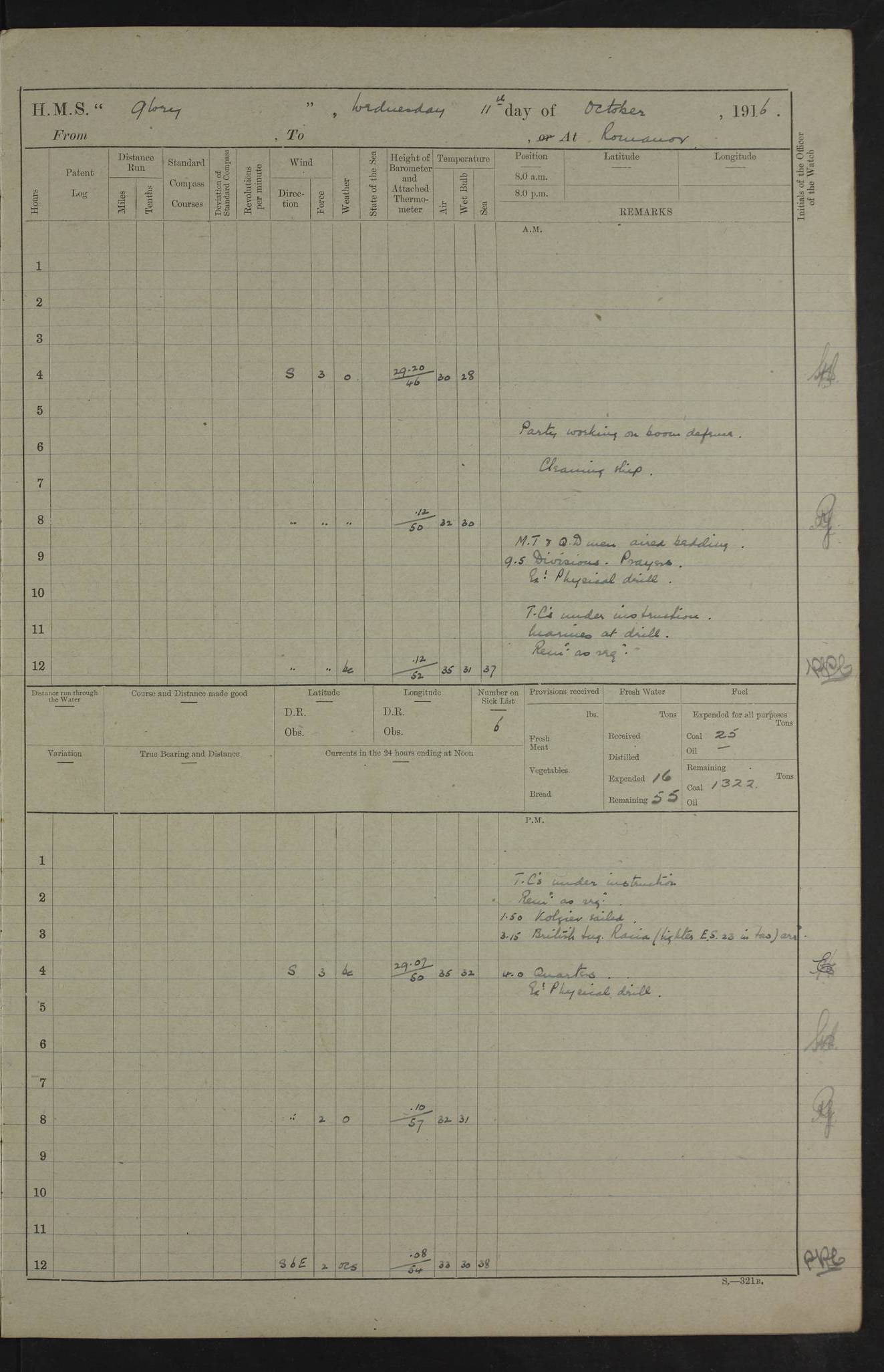 LOGS FOR OCTOBER 1916 For the period covered by the remainder of these logs (1 October, 1916 to 31 December 1918), HMS Glory was based at Murmansk, northern Russia. The city had a variety of names in the early 20th Century – including, Port Murman, Romanov and Murmansk. The location will be given in these pages as Murmansk, the modern name. A history of Murmansk’s names is available at http://en.wikipedia.org/wiki/Murmansk . 4f961482a2fc8e2def0011c7: (http://s3.amazonaws.com/oldweather/ADM53-43026/ADM 53-43026-001_0.jpg) This log is to be kept in a cover in future 4f961482a2fc8e2def0011c8: (http://s3.amazonaws.com/oldweather/ADM53-43026/ADM 53-43026-001_1.jpg) 4f961482a2fc8e2def0011c9: (http://s3.amazonaws.com/oldweather/ADM53-43026/ADM 53-43026-002_0.jpg) 4f961483a2fc8e2def0011ca: (http://s3.amazonaws.com/oldweather/ADM53-43026/ADM 53-43026-002_1.jpg) 4f961483a2fc8e2def0011cb: (http://s3.amazonaws.com/oldweather/ADM53-43026/ADM 53-43026-003_0.jpg) 4f961483a2fc8e2def0011cc: (http://s3.amazonaws.com/oldweather/ADM53-43026/ADM 53-43026-003_1.jpg) 1 October 1916 Murmansk Lat 69.03, Long 33.05 5.40am: Russian auxiliary Kolgiev sailed. Information regarding this vessel (or similar name) has not been found. 7.30am: Celebrated Holy Communion. am: Party working in Earl Essex. Earl Essex was a hired trawler of 225 grt, built, in 1914. Sourced from F.J. Dittmar & J.J. Colledge (1972) – British warships 1914–1919, Ian Allan. 10.45am: Held Divine Service. 11.30am: Celebrated Holy Communion. 4.45pm: Out nets. 4f961484a2fc8e2def0011cd: (http://s3.amazonaws.com/oldweather/ADM53-43026/ADM 53-43026-004_0.jpg) 2 October 1916 Murmansk Lat 69.03, Long 33.05 am: Party working in Earl Essex. 11.30am: Paid quarterly settlement. 6.15pm: Kolgiev arrived. 4f961484a2fc8e2def0011ce: (http://s3.amazonaws.com/oldweather/ADM53-43026/ADM 53-43026-004_1.jpg) 3 October 1916 Murmansk Lat 69.03, Long 33.05 Number on sick list: 9 9.20am: Aft port nets. 11.30am: Russian TBs Goorovoi and Plasteevyi(?) arrived. The first of these TBs is possibly ‘Grosovoi’, built at Le Havre around 1900. Her fate is unclear. The name of the second vessel is possibly incorrect, but no near match has been found. 1.30pm: Out port nets. 4f961484a2fc8e2def0011cf: (http://s3.amazonaws.com/oldweather/ADM53-43026/ADM 53-43026-005_0.jpg) 4 October 1916 Murmansk Lat 69.03, Long 33.05 8.30am: Salvator - broad pendant of Commodore T.W. Kemp arrived. Salvator (ex–Katoomba) was a hired yacht of 684 tons gross, built in 1903. She served as the Heliopolis in WW2. Details at WW1NavyBritishShips-Dittmar4AP.htm . 9.25am: Aft port nets. 11.05am: HE the Minister of Marine visited ship. 11.30am: Out port nets. 11.50am: Russian auxiliary Gotowsci(?) arrived. 12 noon: Kolgiev sailed. pm: HM Tug Blackcock arrived. Blackcock was a hired patrol tug, built in 1886 and wrecked on 18 January, 1918, in the White Sea. Sourced from F.J. Dittmar & J.J. Colledge (1972) – British warships 1914–1919, Ian Allan. 6.50pm: Kolgiev arrived. 4f961485a2fc8e2def0011d0: (http://s3.amazonaws.com/oldweather/ADM53-43026/ADM 53-43026-005_1.jpg) 5 October 1916 Murmansk Lat 69.03, Long 33.05 10.35am: Kolgiev sailed. 1.05pm: Salvator sailed. pm: Read Warrant No. 5. 4f961485a2fc8e2def0011d1: (http://s3.amazonaws.com/oldweather/ADM53-43026/ADM 53-43026-006_0.jpg) 6 October 1916 Murmansk Lat 69.03, Long 33.05 pm: 5 tons of water supplied to Blackcock. 3.30pm: Action. 3.45pm: Secure. Russian T.B's Grosovoi and Plasteevyi sailed. 4f961485a2fc8e2def0011d2: (http://s3.amazonaws.com/oldweather/ADM53-43026/ADM 53-43026-006_1.jpg) 7 October 1916 Murmansk Lat 69.03, Long 33.05 am: Party coaling trawler. am: Tested life buoys – correct. 4f961486a2fc8e2def0011d3: (http://s3.amazonaws.com/oldweather/ADM53-43026/ADM 53-43026-007_0.jpg) 8 October 1916 Murmansk Lat 69.03, Long 33.05 6.45am: Party working in collier. 7.30am: Celebrated Holy Communion. 10.45am: Held Divine service. 5.45pm: Held Divine Service. 4f961486a2fc8e2def0011d4: (http://s3.amazonaws.com/oldweather/ADM53-43026/ADM 53-43026-007_1.jpg) 9 October 1916 Murmansk Lat 69.03, Long 33.05 Number on sick list: 9 am: Exercised fire stations. am: 2nd pinnace patrolling. pm: Landed marines for drill. 4f961486a2fc8e2def0011d5: (http://s3.amazonaws.com/oldweather/ADM53-43026/ADM 53-43026-008_0.jpg) 10 October 1916 Murmansk Lat 69.03, Long 33.05 am: Steam pinnace patrolling. 1.55pm: Kolgiev arrived. 4f961487a2fc8e2def0011d6: (http://s3.amazonaws.com/oldweather/ADM53-43026/ADM 53-43026-008_1.jpg) 11 October 1916 Murmansk Lat 69.03, Long 33.05 am: Party working on boom defence. am: MT and QD men aired bedding. am: Marines at drill. 1.50pm: Kolgiev sailed. 3.15pm: British tug Racia (lighter ES 23 in tow) arrived. Racia was a hired screw tug of 410 grt, built in 1894 and sold on 23 June, 1920. Sourced from F.J. Dittmar & J.J. Colledge (1972) – British warships 1914–1919, Ian Allan. 4f961487a2fc8e2def0011d7: (http://s3.amazonaws.com/oldweather/ADM53-43026/ADM 53-43026-009_0.jpg) 12 October 1916 Murmansk Lat 69.03, Long 33.05 Number on sick list: 6 am: Party working on boom defence. am: Steam pinnace patrolling. pm: Make and mend clothes. 4.15pm: Read warrant No. 6. 6.00pm: Imperator Nicolas arrived. A vessel with this name has not been traced. 4f961487a2fc8e2def0011d8: (http://s3.amazonaws.com/oldweathe/ADM53-43026/ADM 53-43026-009_1.jpg) 13 October 1916 Murmansk Lat 69.03, Long 33.05 am: Steam pinnace patrolling. am: Party working on boom defence. am: Found foc’sle awning and side screens damaged by rats. 4f961488a2fc8e2def0011d9: (http://s3.amazonaws.com/oldweather/ADM53-43026/ADM 53-43026-010_0.jpg) 14 August 1916 (probably should read October) Murmansk Lat 69.03, Long 33.05 Number on sick list: 7 6.45am: Racia (floating crane in tow) sailed. am: Party working on boom defence. am: Tested life buoys – correct. 3.00pm: Vindictive arrived. HMS Vindictive was a protected cruiser of the Arrogant class, launched in 1897 at Chatham Dockyar