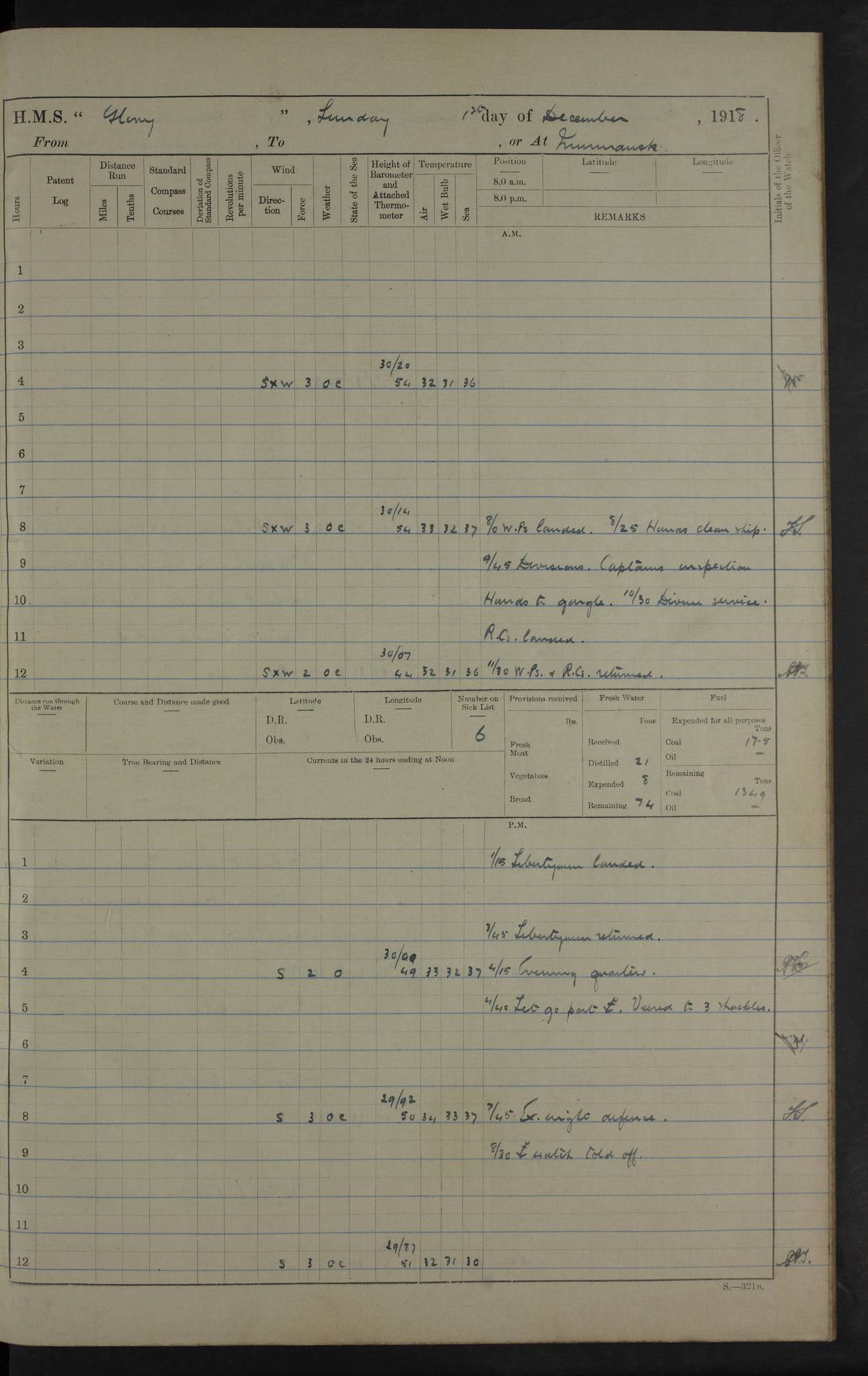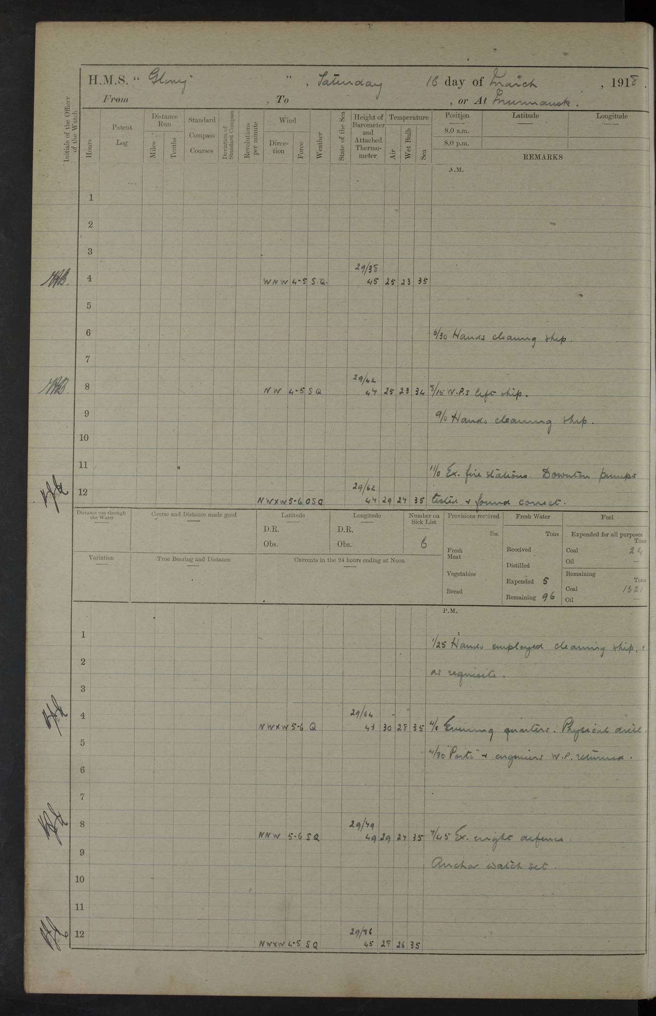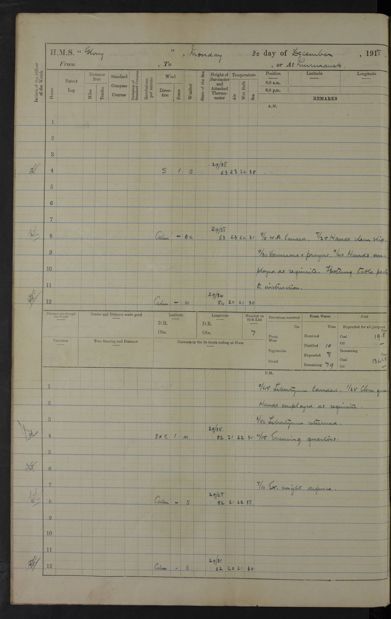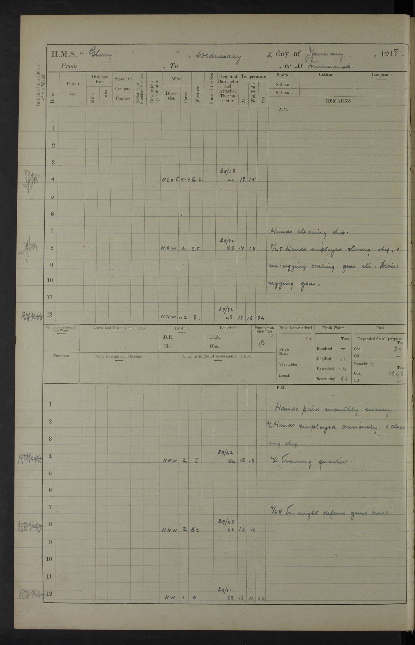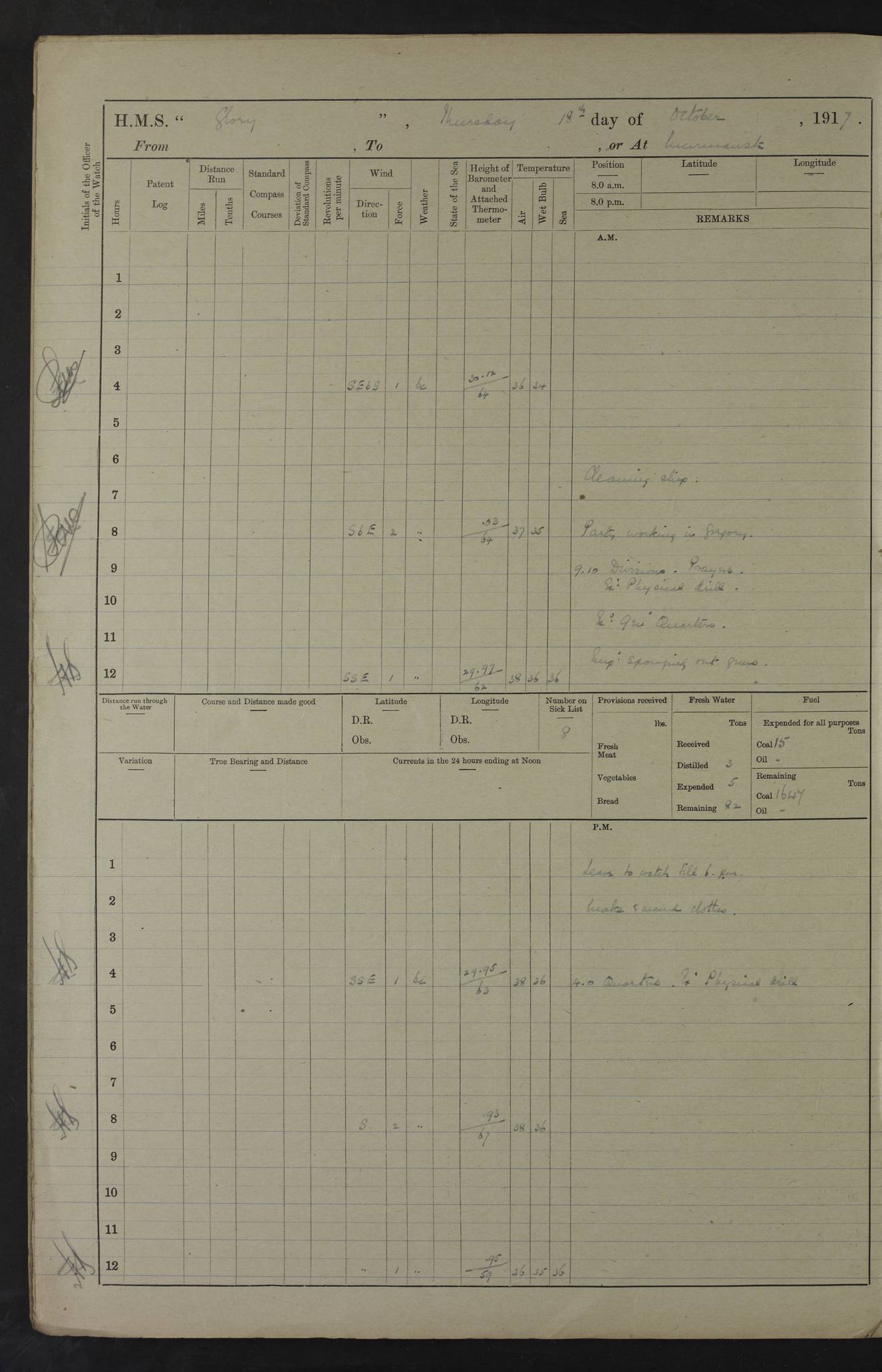 LOGS FOR OCTOBER 1916 For the period covered by the remainder of these logs (1 October, 1916 to 31 December 1918), HMS Glory was based at Murmansk, northern Russia. The city had a variety of names in the early 20th Century – including, Port Murman, Romanov and Murmansk. The location will be given in these pages as Murmansk, the modern name. A history of Murmansk’s names is available at http://en.wikipedia.org/wiki/Murmansk . 4f961482a2fc8e2def0011c7: (http://s3.amazonaws.com/oldweather/ADM53-43026/ADM 53-43026-001_0.jpg) This log is to be kept in a cover in future 4f961482a2fc8e2def0011c8: (http://s3.amazonaws.com/oldweather/ADM53-43026/ADM 53-43026-001_1.jpg) 4f961482a2fc8e2def0011c9: (http://s3.amazonaws.com/oldweather/ADM53-43026/ADM 53-43026-002_0.jpg) 4f961483a2fc8e2def0011ca: (http://s3.amazonaws.com/oldweather/ADM53-43026/ADM 53-43026-002_1.jpg) 4f961483a2fc8e2def0011cb: (http://s3.amazonaws.com/oldweather/ADM53-43026/ADM 53-43026-003_0.jpg) 4f961483a2fc8e2def0011cc: (http://s3.amazonaws.com/oldweather/ADM53-43026/ADM 53-43026-003_1.jpg) 1 October 1916 Murmansk Lat 69.03, Long 33.05 5.40am: Russian auxiliary Kolgiev sailed. Information regarding this vessel (or similar name) has not been found. 7.30am: Celebrated Holy Communion. am: Party working in Earl Essex. Earl Essex was a hired trawler of 225 grt, built, in 1914. Sourced from F.J. Dittmar & J.J. Colledge (1972) – British warships 1914–1919, Ian Allan. 10.45am: Held Divine Service. 11.30am: Celebrated Holy Communion. 4.45pm: Out nets. 4f961484a2fc8e2def0011cd: (http://s3.amazonaws.com/oldweather/ADM53-43026/ADM 53-43026-004_0.jpg) 2 October 1916 Murmansk Lat 69.03, Long 33.05 am: Party working in Earl Essex. 11.30am: Paid quarterly settlement. 6.15pm: Kolgiev arrived. 4f961484a2fc8e2def0011ce: (http://s3.amazonaws.com/oldweather/ADM53-43026/ADM 53-43026-004_1.jpg) 3 October 1916 Murmansk Lat 69.03, Long 33.05 Number on sick list: 9 9.20am: Aft port nets. 11.30am: Russian TBs Goorovoi and Plasteevyi(?) arrived. The first of these TBs is possibly ‘Grosovoi’, built at Le Havre around 1900. Her fate is unclear. The name of the second vessel is possibly incorrect, but no near match has been found. 1.30pm: Out port nets. 4f961484a2fc8e2def0011cf: (http://s3.amazonaws.com/oldweather/ADM53-43026/ADM 53-43026-005_0.jpg) 4 October 1916 Murmansk Lat 69.03, Long 33.05 8.30am: Salvator - broad pendant of Commodore T.W. Kemp arrived. Salvator (ex–Katoomba) was a hired yacht of 684 tons gross, built in 1903. She served as the Heliopolis in WW2. Details at WW1NavyBritishShips-Dittmar4AP.htm . 9.25am: Aft port nets. 11.05am: HE the Minister of Marine visited ship. 11.30am: Out port nets. 11.50am: Russian auxiliary Gotowsci(?) arrived. 12 noon: Kolgiev sailed. pm: HM Tug Blackcock arrived. Blackcock was a hired patrol tug, built in 1886 and wrecked on 18 January, 1918, in the White Sea. Sourced from F.J. Dittmar & J.J. Colledge (1972) – British warships 1914–1919, Ian Allan. 6.50pm: Kolgiev arrived. 4f961485a2fc8e2def0011d0: (http://s3.amazonaws.com/oldweather/ADM53-43026/ADM 53-43026-005_1.jpg) 5 October 1916 Murmansk Lat 69.03, Long 33.05 10.35am: Kolgiev sailed. 1.05pm: Salvator sailed. pm: Read Warrant No. 5. 4f961485a2fc8e2def0011d1: (http://s3.amazonaws.com/oldweather/ADM53-43026/ADM 53-43026-006_0.jpg) 6 October 1916 Murmansk Lat 69.03, Long 33.05 pm: 5 tons of water supplied to Blackcock. 3.30pm: Action. 3.45pm: Secure. Russian T.B's Grosovoi and Plasteevyi sailed. 4f961485a2fc8e2def0011d2: (http://s3.amazonaws.com/oldweather/ADM53-43026/ADM 53-43026-006_1.jpg) 7 October 1916 Murmansk Lat 69.03, Long 33.05 am: Party coaling trawler. am: Tested life buoys – correct. 4f961486a2fc8e2def0011d3: (http://s3.amazonaws.com/oldweather/ADM53-43026/ADM 53-43026-007_0.jpg) 8 October 1916 Murmansk Lat 69.03, Long 33.05 6.45am: Party working in collier. 7.30am: Celebrated Holy Communion. 10.45am: Held Divine service. 5.45pm: Held Divine Service. 4f961486a2fc8e2def0011d4: (http://s3.amazonaws.com/oldweather/ADM53-43026/ADM 53-43026-007_1.jpg) 9 October 1916 Murmansk Lat 69.03, Long 33.05 Number on sick list: 9 am: Exercised fire stations. am: 2nd pinnace patrolling. pm: Landed marines for drill. 4f961486a2fc8e2def0011d5: (http://s3.amazonaws.com/oldweather/ADM53-43026/ADM 53-43026-008_0.jpg) 10 October 1916 Murmansk Lat 69.03, Long 33.05 am: Steam pinnace patrolling. 1.55pm: Kolgiev arrived. 4f961487a2fc8e2def0011d6: (http://s3.amazonaws.com/oldweather/ADM53-43026/ADM 53-43026-008_1.jpg) 11 October 1916 Murmansk Lat 69.03, Long 33.05 am: Party working on boom defence. am: MT and QD men aired bedding. am: Marines at drill. 1.50pm: Kolgiev sailed. 3.15pm: British tug Racia (lighter ES 23 in tow) arrived. Racia was a hired screw tug of 410 grt, built in 1894 and sold on 23 June, 1920. Sourced from F.J. Dittmar & J.J. Colledge (1972) – British warships 1914–1919, Ian Allan. 4f961487a2fc8e2def0011d7: (http://s3.amazonaws.com/oldweather/ADM53-43026/ADM 53-43026-009_0.jpg) 12 October 1916 Murmansk Lat 69.03, Long 33.05 Number on sick list: 6 am: Party working on boom defence. am: Steam pinnace patrolling. pm: Make and mend clothes. 4.15pm: Read warrant No. 6. 6.00pm: Imperator Nicolas arrived. A vessel with this name has not been traced. 4f961487a2fc8e2def0011d8: (http://s3.amazonaws.com/oldweathe/ADM53-43026/ADM 53-43026-009_1.jpg) 13 October 1916 Murmansk Lat 69.03, Long 33.05 am: Steam pinnace patrolling. am: Party working on boom defence. am: Found foc’sle awning and side screens damaged by rats. 4f961488a2fc8e2def0011d9: (http://s3.amazonaws.com/oldweather/ADM53-43026/ADM 53-43026-010_0.jpg) 14 August 1916 (probably should read October) Murmansk Lat 69.03, Long 33.05 Number on sick list: 7 6.45am: Racia (floating crane in tow) sailed. am: Party working on boom defence. am: Tested life buoys – correct. 3.00pm: Vindictive arrived. HMS Vindictive was a protected cruiser of the Arrogant class, launched in 1897 at Chatham Dockyar