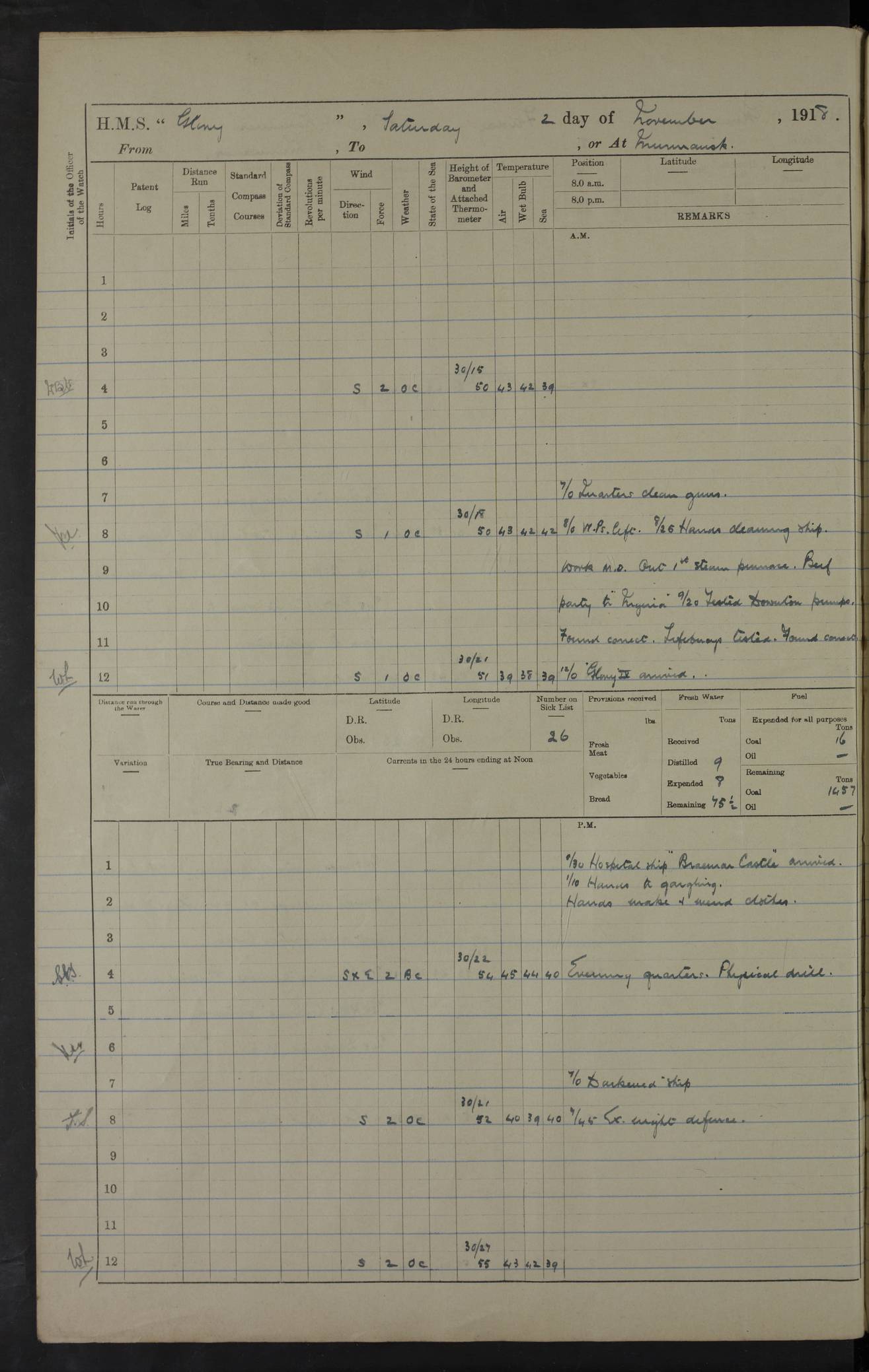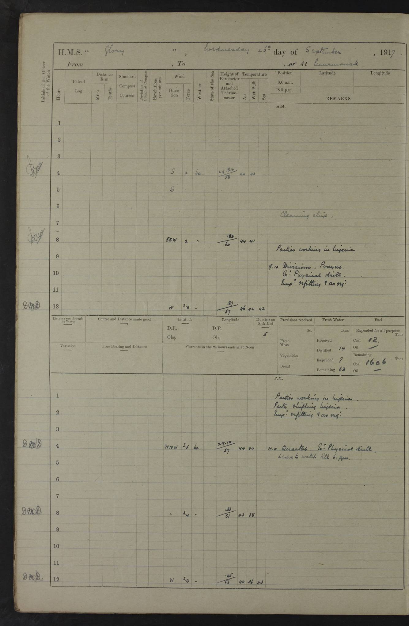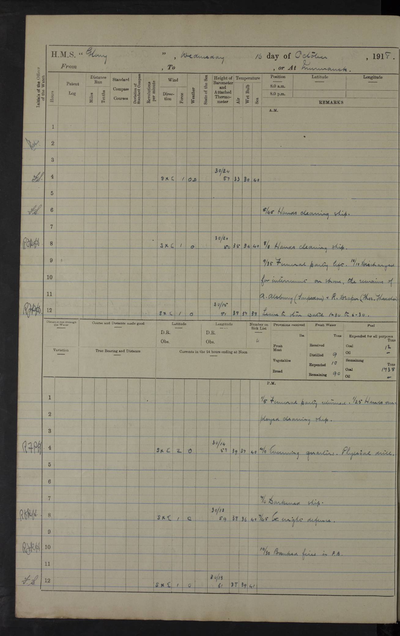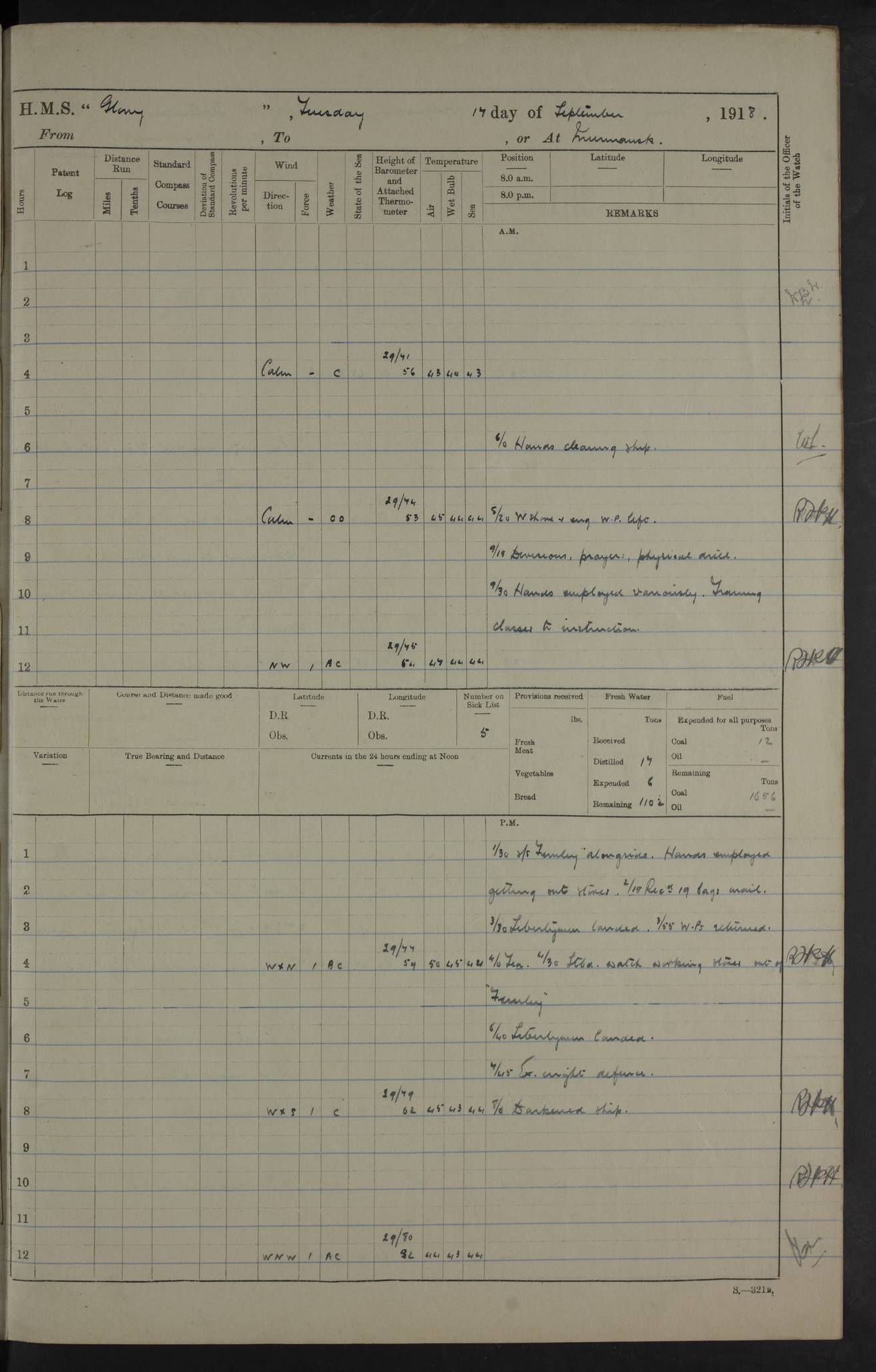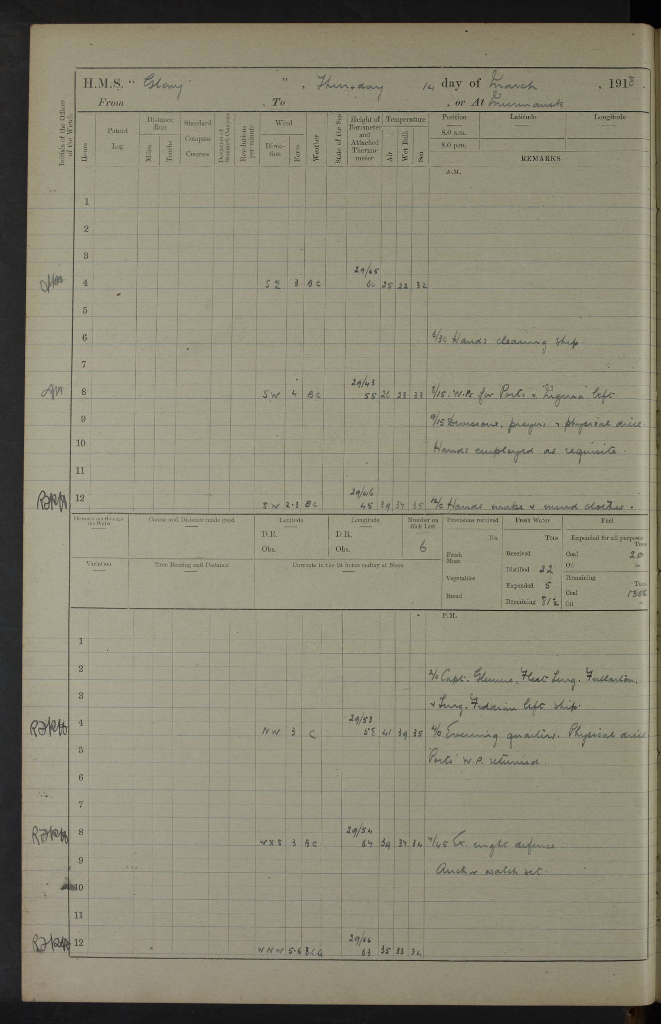LOGS FOR OCTOBER 1916 For the period covered by the remainder of these logs (1 October, 1916 to 31 December 1918), HMS Glory was based at Murmansk, northern Russia. The city had a variety of names in the early 20th Century – including, Port Murman, Romanov and Murmansk. The location will be given in these pages as Murmansk, the modern name. A history of Murmansk’s names is available at http://en.wikipedia.org/wiki/Murmansk . 4f961482a2fc8e2def0011c7: (http://s3.amazonaws.com/oldweather/ADM53-43026/ADM 53-43026-001_0.jpg) This log is to be kept in a cover in future 4f961482a2fc8e2def0011c8: (http://s3.amazonaws.com/oldweather/ADM53-43026/ADM 53-43026-001_1.jpg) 4f961482a2fc8e2def0011c9: (http://s3.amazonaws.com/oldweather/ADM53-43026/ADM 53-43026-002_0.jpg) 4f961483a2fc8e2def0011ca: (http://s3.amazonaws.com/oldweather/ADM53-43026/ADM 53-43026-002_1.jpg) 4f961483a2fc8e2def0011cb: (http://s3.amazonaws.com/oldweather/ADM53-43026/ADM 53-43026-003_0.jpg) 4f961483a2fc8e2def0011cc: (http://s3.amazonaws.com/oldweather/ADM53-43026/ADM 53-43026-003_1.jpg) 1 October 1916 Murmansk Lat 69.03, Long 33.05 5.40am: Russian auxiliary Kolgiev sailed. Information regarding this vessel (or similar name) has not been found. 7.30am: Celebrated Holy Communion. am: Party working in Earl Essex. Earl Essex was a hired trawler of 225 grt, built, in 1914. Sourced from F.J. Dittmar & J.J. Colledge (1972) – British warships 1914–1919, Ian Allan. 10.45am: Held Divine Service. 11.30am: Celebrated Holy Communion. 4.45pm: Out nets. 4f961484a2fc8e2def0011cd: (http://s3.amazonaws.com/oldweather/ADM53-43026/ADM 53-43026-004_0.jpg) 2 October 1916 Murmansk Lat 69.03, Long 33.05 am: Party working in Earl Essex. 11.30am: Paid quarterly settlement. 6.15pm: Kolgiev arrived. 4f961484a2fc8e2def0011ce: (http://s3.amazonaws.com/oldweather/ADM53-43026/ADM 53-43026-004_1.jpg) 3 October 1916 Murmansk Lat 69.03, Long 33.05 Number on sick list: 9 9.20am: Aft port nets. 11.30am: Russian TBs Goorovoi and Plasteevyi(?) arrived. The first of these TBs is possibly ‘Grosovoi’, built at Le Havre around 1900. Her fate is unclear. The name of the second vessel is possibly incorrect, but no near match has been found. 1.30pm: Out port nets. 4f961484a2fc8e2def0011cf: (http://s3.amazonaws.com/oldweather/ADM53-43026/ADM 53-43026-005_0.jpg) 4 October 1916 Murmansk Lat 69.03, Long 33.05 8.30am: Salvator - broad pendant of Commodore T.W. Kemp arrived. Salvator (ex–Katoomba) was a hired yacht of 684 tons gross, built in 1903. She served as the Heliopolis in WW2. Details at WW1NavyBritishShips-Dittmar4AP.htm . 9.25am: Aft port nets. 11.05am: HE the Minister of Marine visited ship. 11.30am: Out port nets. 11.50am: Russian auxiliary Gotowsci(?) arrived. 12 noon: Kolgiev sailed. pm: HM Tug Blackcock arrived. Blackcock was a hired patrol tug, built in 1886 and wrecked on 18 January, 1918, in the White Sea. Sourced from F.J. Dittmar & J.J. Colledge (1972) – British warships 1914–1919, Ian Allan. 6.50pm: Kolgiev arrived. 4f961485a2fc8e2def0011d0: (http://s3.amazonaws.com/oldweather/ADM53-43026/ADM 53-43026-005_1.jpg) 5 October 1916 Murmansk Lat 69.03, Long 33.05 10.35am: Kolgiev sailed. 1.05pm: Salvator sailed. pm: Read Warrant No. 5. 4f961485a2fc8e2def0011d1: (http://s3.amazonaws.com/oldweather/ADM53-43026/ADM 53-43026-006_0.jpg) 6 October 1916 Murmansk Lat 69.03, Long 33.05 pm: 5 tons of water supplied to Blackcock. 3.30pm: Action. 3.45pm: Secure. Russian T.B's Grosovoi and Plasteevyi sailed. 4f961485a2fc8e2def0011d2: (http://s3.amazonaws.com/oldweather/ADM53-43026/ADM 53-43026-006_1.jpg) 7 October 1916 Murmansk Lat 69.03, Long 33.05 am: Party coaling trawler. am: Tested life buoys – correct. 4f961486a2fc8e2def0011d3: (http://s3.amazonaws.com/oldweather/ADM53-43026/ADM 53-43026-007_0.jpg) 8 October 1916 Murmansk Lat 69.03, Long 33.05 6.45am: Party working in collier. 7.30am: Celebrated Holy Communion. 10.45am: Held Divine service. 5.45pm: Held Divine Service. 4f961486a2fc8e2def0011d4: (http://s3.amazonaws.com/oldweather/ADM53-43026/ADM 53-43026-007_1.jpg) 9 October 1916 Murmansk Lat 69.03, Long 33.05 Number on sick list: 9 am: Exercised fire stations. am: 2nd pinnace patrolling. pm: Landed marines for drill. 4f961486a2fc8e2def0011d5: (http://s3.amazonaws.com/oldweather/ADM53-43026/ADM 53-43026-008_0.jpg) 10 October 1916 Murmansk Lat 69.03, Long 33.05 am: Steam pinnace patrolling. 1.55pm: Kolgiev arrived. 4f961487a2fc8e2def0011d6: (http://s3.amazonaws.com/oldweather/ADM53-43026/ADM 53-43026-008_1.jpg) 11 October 1916 Murmansk Lat 69.03, Long 33.05 am: Party working on boom defence. am: MT and QD men aired bedding. am: Marines at drill. 1.50pm: Kolgiev sailed. 3.15pm: British tug Racia (lighter ES 23 in tow) arrived. Racia was a hired screw tug of 410 grt, built in 1894 and sold on 23 June, 1920. Sourced from F.J. Dittmar & J.J. Colledge (1972) – British warships 1914–1919, Ian Allan. 4f961487a2fc8e2def0011d7: (http://s3.amazonaws.com/oldweather/ADM53-43026/ADM 53-43026-009_0.jpg) 12 October 1916 Murmansk Lat 69.03, Long 33.05 Number on sick list: 6 am: Party working on boom defence. am: Steam pinnace patrolling. pm: Make and mend clothes. 4.15pm: Read warrant No. 6. 6.00pm: Imperator Nicolas arrived. A vessel with this name has not been traced. 4f961487a2fc8e2def0011d8: (http://s3.amazonaws.com/oldweathe/ADM53-43026/ADM 53-43026-009_1.jpg) 13 October 1916 Murmansk Lat 69.03, Long 33.05 am: Steam pinnace patrolling. am: Party working on boom defence. am: Found foc’sle awning and side screens damaged by rats. 4f961488a2fc8e2def0011d9: (http://s3.amazonaws.com/oldweather/ADM53-43026/ADM 53-43026-010_0.jpg) 14 August 1916 (probably should read October) Murmansk Lat 69.03, Long 33.05 Number on sick list: 7 6.45am: Racia (floating crane in tow) sailed. am: Party working on boom defence. am: Tested life buoys – correct. 3.00pm: Vindictive arrived. HMS Vindictive was a protected cruiser of the Arrogant class, launched in 1897 at Chatham Dockyar
