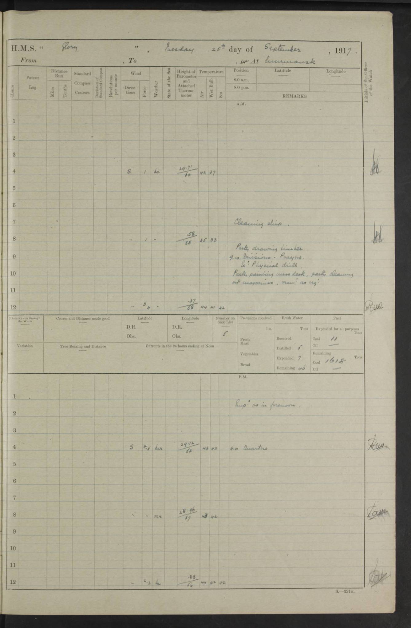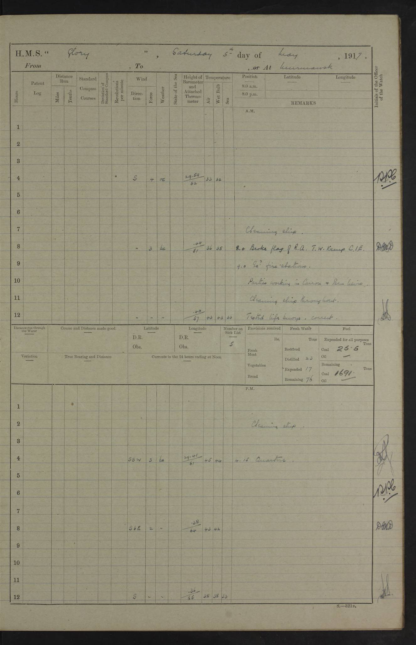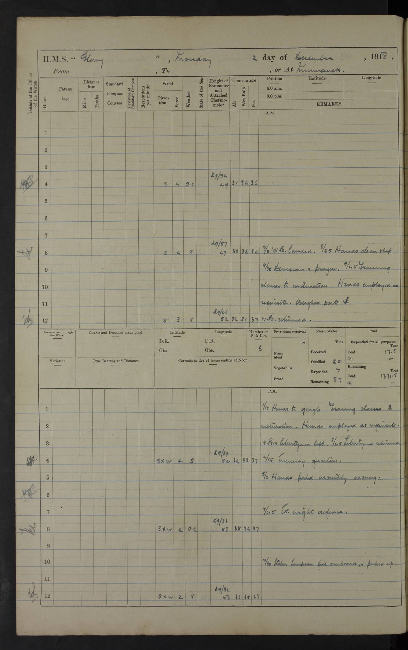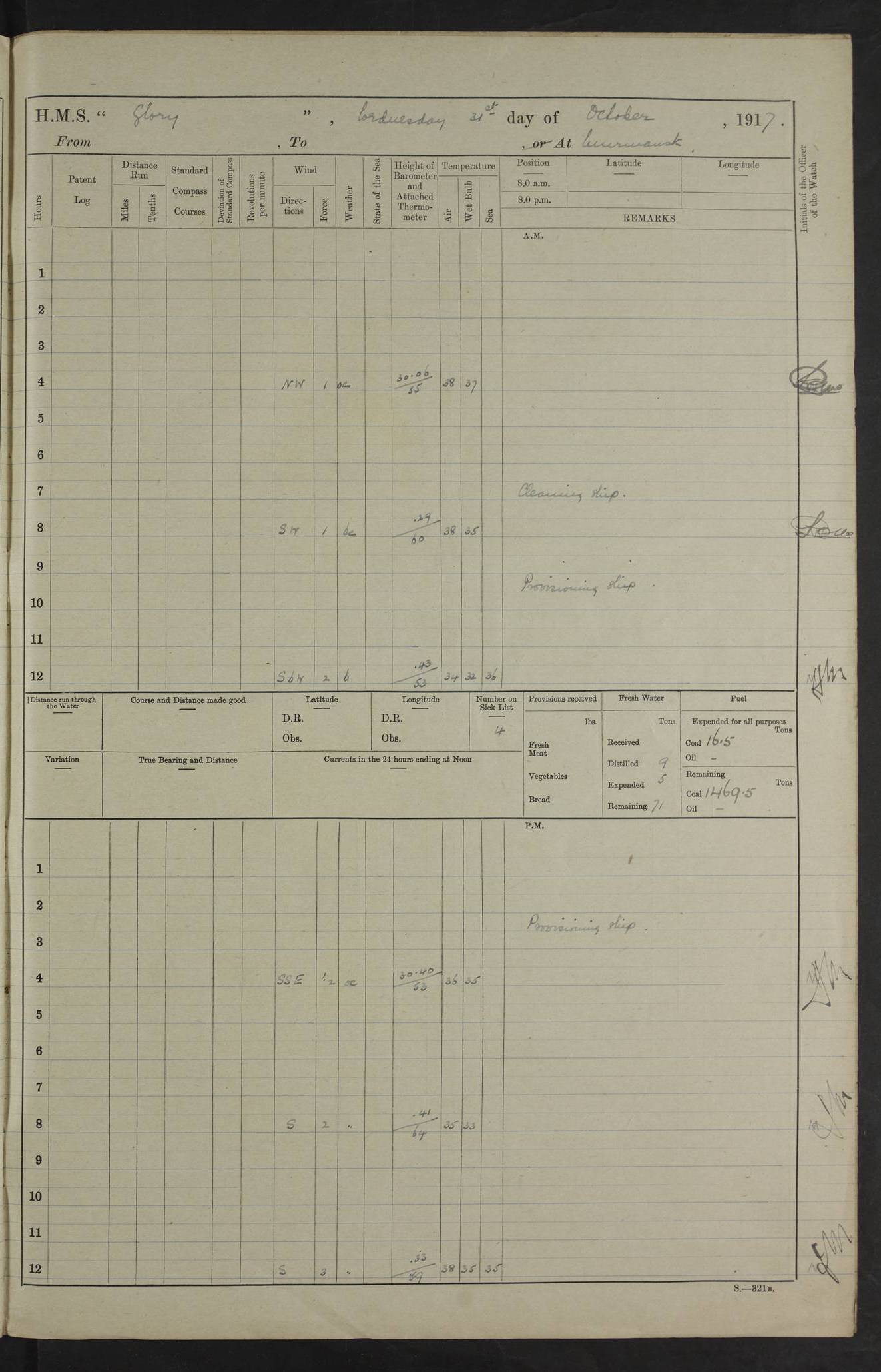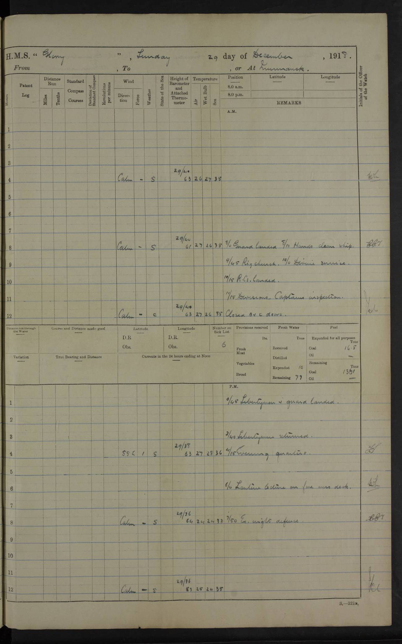 LOGS FOR OCTOBER 1916 For the period covered by the remainder of these logs (1 October, 1916 to 31 December 1918), HMS Glory was based at Murmansk, northern Russia. The city had a variety of names in the early 20th Century – including, Port Murman, Romanov and Murmansk. The location will be given in these pages as Murmansk, the modern name. A history of Murmansk’s names is available at http://en.wikipedia.org/wiki/Murmansk . 4f961482a2fc8e2def0011c7: (http://s3.amazonaws.com/oldweather/ADM53-43026/ADM 53-43026-001_0.jpg) This log is to be kept in a cover in future 4f961482a2fc8e2def0011c8: (http://s3.amazonaws.com/oldweather/ADM53-43026/ADM 53-43026-001_1.jpg) 4f961482a2fc8e2def0011c9: (http://s3.amazonaws.com/oldweather/ADM53-43026/ADM 53-43026-002_0.jpg) 4f961483a2fc8e2def0011ca: (http://s3.amazonaws.com/oldweather/ADM53-43026/ADM 53-43026-002_1.jpg) 4f961483a2fc8e2def0011cb: (http://s3.amazonaws.com/oldweather/ADM53-43026/ADM 53-43026-003_0.jpg) 4f961483a2fc8e2def0011cc: (http://s3.amazonaws.com/oldweather/ADM53-43026/ADM 53-43026-003_1.jpg) 1 October 1916 Murmansk Lat 69.03, Long 33.05 5.40am: Russian auxiliary Kolgiev sailed. Information regarding this vessel (or similar name) has not been found. 7.30am: Celebrated Holy Communion. am: Party working in Earl Essex. Earl Essex was a hired trawler of 225 grt, built, in 1914. Sourced from F.J. Dittmar & J.J. Colledge (1972) – British warships 1914–1919, Ian Allan. 10.45am: Held Divine Service. 11.30am: Celebrated Holy Communion. 4.45pm: Out nets. 4f961484a2fc8e2def0011cd: (http://s3.amazonaws.com/oldweather/ADM53-43026/ADM 53-43026-004_0.jpg) 2 October 1916 Murmansk Lat 69.03, Long 33.05 am: Party working in Earl Essex. 11.30am: Paid quarterly settlement. 6.15pm: Kolgiev arrived. 4f961484a2fc8e2def0011ce: (http://s3.amazonaws.com/oldweather/ADM53-43026/ADM 53-43026-004_1.jpg) 3 October 1916 Murmansk Lat 69.03, Long 33.05 Number on sick list: 9 9.20am: Aft port nets. 11.30am: Russian TBs Goorovoi and Plasteevyi(?) arrived. The first of these TBs is possibly ‘Grosovoi’, built at Le Havre around 1900. Her fate is unclear. The name of the second vessel is possibly incorrect, but no near match has been found. 1.30pm: Out port nets. 4f961484a2fc8e2def0011cf: (http://s3.amazonaws.com/oldweather/ADM53-43026/ADM 53-43026-005_0.jpg) 4 October 1916 Murmansk Lat 69.03, Long 33.05 8.30am: Salvator - broad pendant of Commodore T.W. Kemp arrived. Salvator (ex–Katoomba) was a hired yacht of 684 tons gross, built in 1903. She served as the Heliopolis in WW2. Details at WW1NavyBritishShips-Dittmar4AP.htm . 9.25am: Aft port nets. 11.05am: HE the Minister of Marine visited ship. 11.30am: Out port nets. 11.50am: Russian auxiliary Gotowsci(?) arrived. 12 noon: Kolgiev sailed. pm: HM Tug Blackcock arrived. Blackcock was a hired patrol tug, built in 1886 and wrecked on 18 January, 1918, in the White Sea. Sourced from F.J. Dittmar & J.J. Colledge (1972) – British warships 1914–1919, Ian Allan. 6.50pm: Kolgiev arrived. 4f961485a2fc8e2def0011d0: (http://s3.amazonaws.com/oldweather/ADM53-43026/ADM 53-43026-005_1.jpg) 5 October 1916 Murmansk Lat 69.03, Long 33.05 10.35am: Kolgiev sailed. 1.05pm: Salvator sailed. pm: Read Warrant No. 5. 4f961485a2fc8e2def0011d1: (http://s3.amazonaws.com/oldweather/ADM53-43026/ADM 53-43026-006_0.jpg) 6 October 1916 Murmansk Lat 69.03, Long 33.05 pm: 5 tons of water supplied to Blackcock. 3.30pm: Action. 3.45pm: Secure. Russian T.B's Grosovoi and Plasteevyi sailed. 4f961485a2fc8e2def0011d2: (http://s3.amazonaws.com/oldweather/ADM53-43026/ADM 53-43026-006_1.jpg) 7 October 1916 Murmansk Lat 69.03, Long 33.05 am: Party coaling trawler. am: Tested life buoys – correct. 4f961486a2fc8e2def0011d3: (http://s3.amazonaws.com/oldweather/ADM53-43026/ADM 53-43026-007_0.jpg) 8 October 1916 Murmansk Lat 69.03, Long 33.05 6.45am: Party working in collier. 7.30am: Celebrated Holy Communion. 10.45am: Held Divine service. 5.45pm: Held Divine Service. 4f961486a2fc8e2def0011d4: (http://s3.amazonaws.com/oldweather/ADM53-43026/ADM 53-43026-007_1.jpg) 9 October 1916 Murmansk Lat 69.03, Long 33.05 Number on sick list: 9 am: Exercised fire stations. am: 2nd pinnace patrolling. pm: Landed marines for drill. 4f961486a2fc8e2def0011d5: (http://s3.amazonaws.com/oldweather/ADM53-43026/ADM 53-43026-008_0.jpg) 10 October 1916 Murmansk Lat 69.03, Long 33.05 am: Steam pinnace patrolling. 1.55pm: Kolgiev arrived. 4f961487a2fc8e2def0011d6: (http://s3.amazonaws.com/oldweather/ADM53-43026/ADM 53-43026-008_1.jpg) 11 October 1916 Murmansk Lat 69.03, Long 33.05 am: Party working on boom defence. am: MT and QD men aired bedding. am: Marines at drill. 1.50pm: Kolgiev sailed. 3.15pm: British tug Racia (lighter ES 23 in tow) arrived. Racia was a hired screw tug of 410 grt, built in 1894 and sold on 23 June, 1920. Sourced from F.J. Dittmar & J.J. Colledge (1972) – British warships 1914–1919, Ian Allan. 4f961487a2fc8e2def0011d7: (http://s3.amazonaws.com/oldweather/ADM53-43026/ADM 53-43026-009_0.jpg) 12 October 1916 Murmansk Lat 69.03, Long 33.05 Number on sick list: 6 am: Party working on boom defence. am: Steam pinnace patrolling. pm: Make and mend clothes. 4.15pm: Read warrant No. 6. 6.00pm: Imperator Nicolas arrived. A vessel with this name has not been traced. 4f961487a2fc8e2def0011d8: (http://s3.amazonaws.com/oldweathe/ADM53-43026/ADM 53-43026-009_1.jpg) 13 October 1916 Murmansk Lat 69.03, Long 33.05 am: Steam pinnace patrolling. am: Party working on boom defence. am: Found foc’sle awning and side screens damaged by rats. 4f961488a2fc8e2def0011d9: (http://s3.amazonaws.com/oldweather/ADM53-43026/ADM 53-43026-010_0.jpg) 14 August 1916 (probably should read October) Murmansk Lat 69.03, Long 33.05 Number on sick list: 7 6.45am: Racia (floating crane in tow) sailed. am: Party working on boom defence. am: Tested life buoys – correct. 3.00pm: Vindictive arrived. HMS Vindictive was a protected cruiser of the Arrogant class, launched in 1897 at Chatham Dockyar