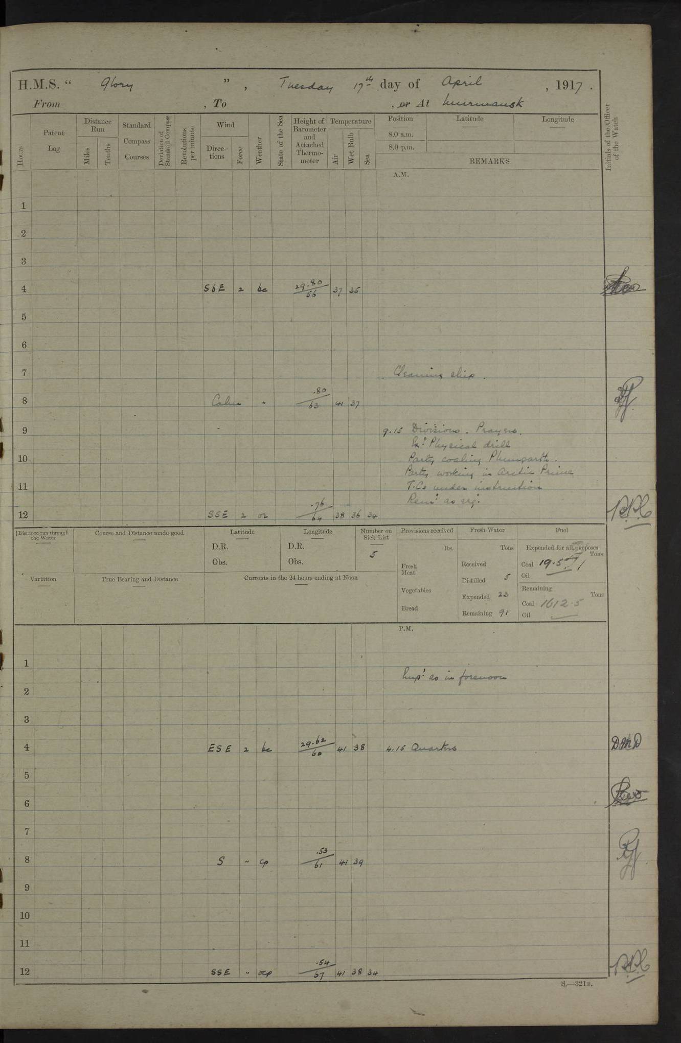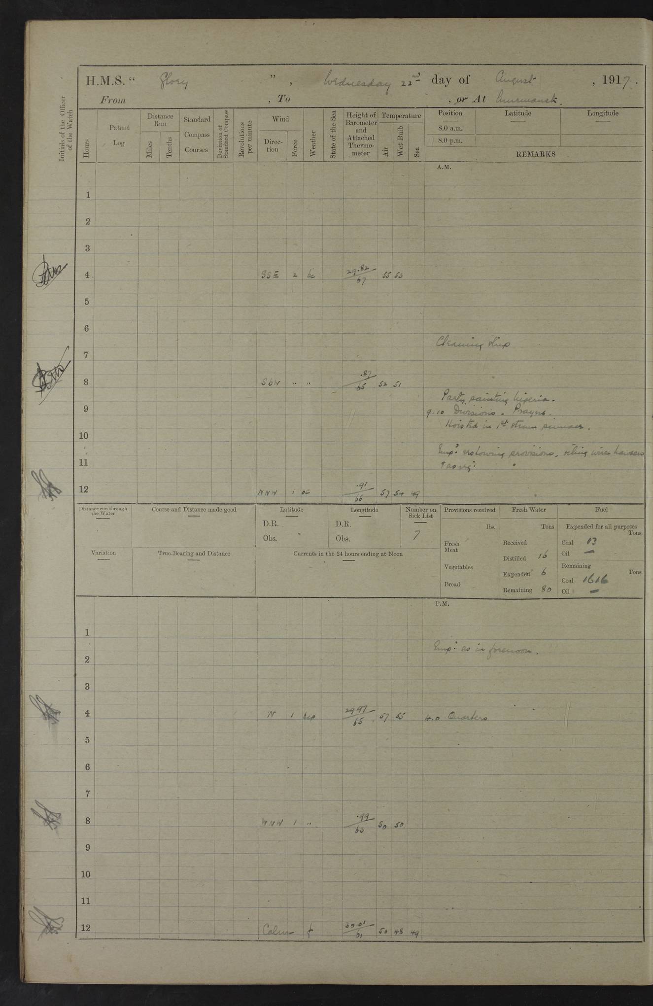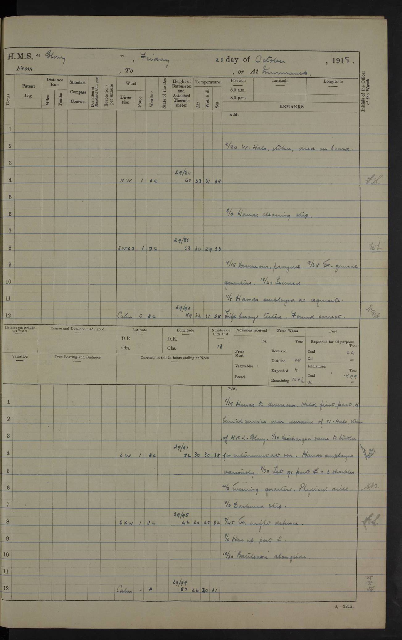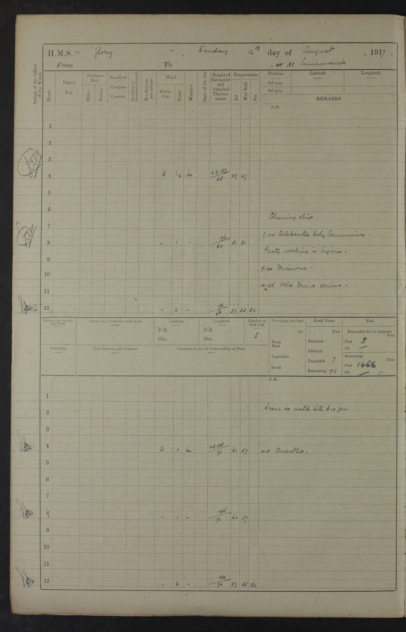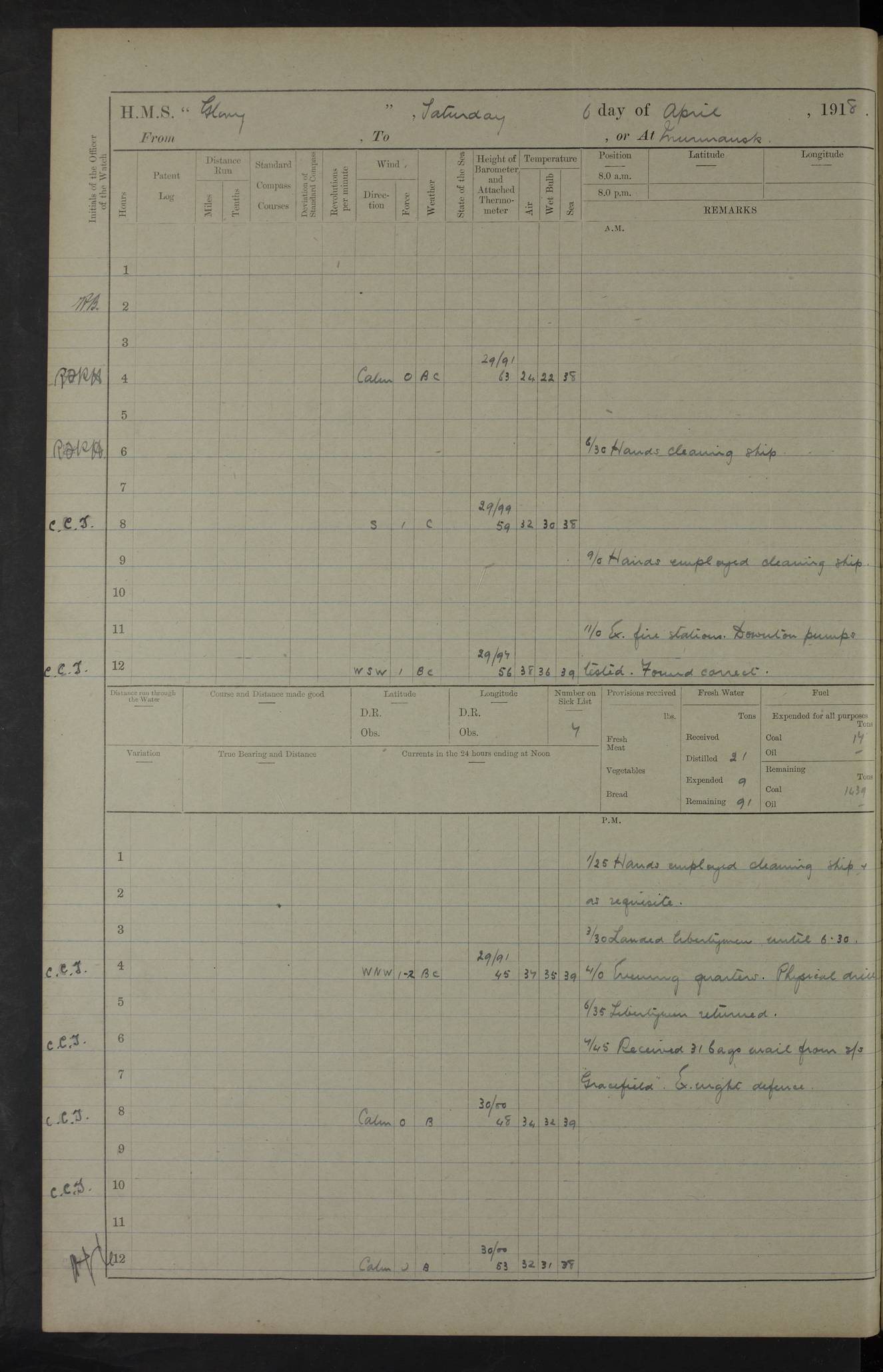 LOGS FOR OCTOBER 1916 For the period covered by the remainder of these logs (1 October, 1916 to 31 December 1918), HMS Glory was based at Murmansk, northern Russia. The city had a variety of names in the early 20th Century – including, Port Murman, Romanov and Murmansk. The location will be given in these pages as Murmansk, the modern name. A history of Murmansk’s names is available at http://en.wikipedia.org/wiki/Murmansk . 4f961482a2fc8e2def0011c7: (http://s3.amazonaws.com/oldweather/ADM53-43026/ADM 53-43026-001_0.jpg) This log is to be kept in a cover in future 4f961482a2fc8e2def0011c8: (http://s3.amazonaws.com/oldweather/ADM53-43026/ADM 53-43026-001_1.jpg) 4f961482a2fc8e2def0011c9: (http://s3.amazonaws.com/oldweather/ADM53-43026/ADM 53-43026-002_0.jpg) 4f961483a2fc8e2def0011ca: (http://s3.amazonaws.com/oldweather/ADM53-43026/ADM 53-43026-002_1.jpg) 4f961483a2fc8e2def0011cb: (http://s3.amazonaws.com/oldweather/ADM53-43026/ADM 53-43026-003_0.jpg) 4f961483a2fc8e2def0011cc: (http://s3.amazonaws.com/oldweather/ADM53-43026/ADM 53-43026-003_1.jpg) 1 October 1916 Murmansk Lat 69.03, Long 33.05 5.40am: Russian auxiliary Kolgiev sailed. Information regarding this vessel (or similar name) has not been found. 7.30am: Celebrated Holy Communion. am: Party working in Earl Essex. Earl Essex was a hired trawler of 225 grt, built, in 1914. Sourced from F.J. Dittmar & J.J. Colledge (1972) – British warships 1914–1919, Ian Allan. 10.45am: Held Divine Service. 11.30am: Celebrated Holy Communion. 4.45pm: Out nets. 4f961484a2fc8e2def0011cd: (http://s3.amazonaws.com/oldweather/ADM53-43026/ADM 53-43026-004_0.jpg) 2 October 1916 Murmansk Lat 69.03, Long 33.05 am: Party working in Earl Essex. 11.30am: Paid quarterly settlement. 6.15pm: Kolgiev arrived. 4f961484a2fc8e2def0011ce: (http://s3.amazonaws.com/oldweather/ADM53-43026/ADM 53-43026-004_1.jpg) 3 October 1916 Murmansk Lat 69.03, Long 33.05 Number on sick list: 9 9.20am: Aft port nets. 11.30am: Russian TBs Goorovoi and Plasteevyi(?) arrived. The first of these TBs is possibly ‘Grosovoi’, built at Le Havre around 1900. Her fate is unclear. The name of the second vessel is possibly incorrect, but no near match has been found. 1.30pm: Out port nets. 4f961484a2fc8e2def0011cf: (http://s3.amazonaws.com/oldweather/ADM53-43026/ADM 53-43026-005_0.jpg) 4 October 1916 Murmansk Lat 69.03, Long 33.05 8.30am: Salvator - broad pendant of Commodore T.W. Kemp arrived. Salvator (ex–Katoomba) was a hired yacht of 684 tons gross, built in 1903. She served as the Heliopolis in WW2. Details at WW1NavyBritishShips-Dittmar4AP.htm . 9.25am: Aft port nets. 11.05am: HE the Minister of Marine visited ship. 11.30am: Out port nets. 11.50am: Russian auxiliary Gotowsci(?) arrived. 12 noon: Kolgiev sailed. pm: HM Tug Blackcock arrived. Blackcock was a hired patrol tug, built in 1886 and wrecked on 18 January, 1918, in the White Sea. Sourced from F.J. Dittmar & J.J. Colledge (1972) – British warships 1914–1919, Ian Allan. 6.50pm: Kolgiev arrived. 4f961485a2fc8e2def0011d0: (http://s3.amazonaws.com/oldweather/ADM53-43026/ADM 53-43026-005_1.jpg) 5 October 1916 Murmansk Lat 69.03, Long 33.05 10.35am: Kolgiev sailed. 1.05pm: Salvator sailed. pm: Read Warrant No. 5. 4f961485a2fc8e2def0011d1: (http://s3.amazonaws.com/oldweather/ADM53-43026/ADM 53-43026-006_0.jpg) 6 October 1916 Murmansk Lat 69.03, Long 33.05 pm: 5 tons of water supplied to Blackcock. 3.30pm: Action. 3.45pm: Secure. Russian T.B's Grosovoi and Plasteevyi sailed. 4f961485a2fc8e2def0011d2: (http://s3.amazonaws.com/oldweather/ADM53-43026/ADM 53-43026-006_1.jpg) 7 October 1916 Murmansk Lat 69.03, Long 33.05 am: Party coaling trawler. am: Tested life buoys – correct. 4f961486a2fc8e2def0011d3: (http://s3.amazonaws.com/oldweather/ADM53-43026/ADM 53-43026-007_0.jpg) 8 October 1916 Murmansk Lat 69.03, Long 33.05 6.45am: Party working in collier. 7.30am: Celebrated Holy Communion. 10.45am: Held Divine service. 5.45pm: Held Divine Service. 4f961486a2fc8e2def0011d4: (http://s3.amazonaws.com/oldweather/ADM53-43026/ADM 53-43026-007_1.jpg) 9 October 1916 Murmansk Lat 69.03, Long 33.05 Number on sick list: 9 am: Exercised fire stations. am: 2nd pinnace patrolling. pm: Landed marines for drill. 4f961486a2fc8e2def0011d5: (http://s3.amazonaws.com/oldweather/ADM53-43026/ADM 53-43026-008_0.jpg) 10 October 1916 Murmansk Lat 69.03, Long 33.05 am: Steam pinnace patrolling. 1.55pm: Kolgiev arrived. 4f961487a2fc8e2def0011d6: (http://s3.amazonaws.com/oldweather/ADM53-43026/ADM 53-43026-008_1.jpg) 11 October 1916 Murmansk Lat 69.03, Long 33.05 am: Party working on boom defence. am: MT and QD men aired bedding. am: Marines at drill. 1.50pm: Kolgiev sailed. 3.15pm: British tug Racia (lighter ES 23 in tow) arrived. Racia was a hired screw tug of 410 grt, built in 1894 and sold on 23 June, 1920. Sourced from F.J. Dittmar & J.J. Colledge (1972) – British warships 1914–1919, Ian Allan. 4f961487a2fc8e2def0011d7: (http://s3.amazonaws.com/oldweather/ADM53-43026/ADM 53-43026-009_0.jpg) 12 October 1916 Murmansk Lat 69.03, Long 33.05 Number on sick list: 6 am: Party working on boom defence. am: Steam pinnace patrolling. pm: Make and mend clothes. 4.15pm: Read warrant No. 6. 6.00pm: Imperator Nicolas arrived. A vessel with this name has not been traced. 4f961487a2fc8e2def0011d8: (http://s3.amazonaws.com/oldweathe/ADM53-43026/ADM 53-43026-009_1.jpg) 13 October 1916 Murmansk Lat 69.03, Long 33.05 am: Steam pinnace patrolling. am: Party working on boom defence. am: Found foc’sle awning and side screens damaged by rats. 4f961488a2fc8e2def0011d9: (http://s3.amazonaws.com/oldweather/ADM53-43026/ADM 53-43026-010_0.jpg) 14 August 1916 (probably should read October) Murmansk Lat 69.03, Long 33.05 Number on sick list: 7 6.45am: Racia (floating crane in tow) sailed. am: Party working on boom defence. am: Tested life buoys – correct. 3.00pm: Vindictive arrived. HMS Vindictive was a protected cruiser of the Arrogant class, launched in 1897 at Chatham Dockyar