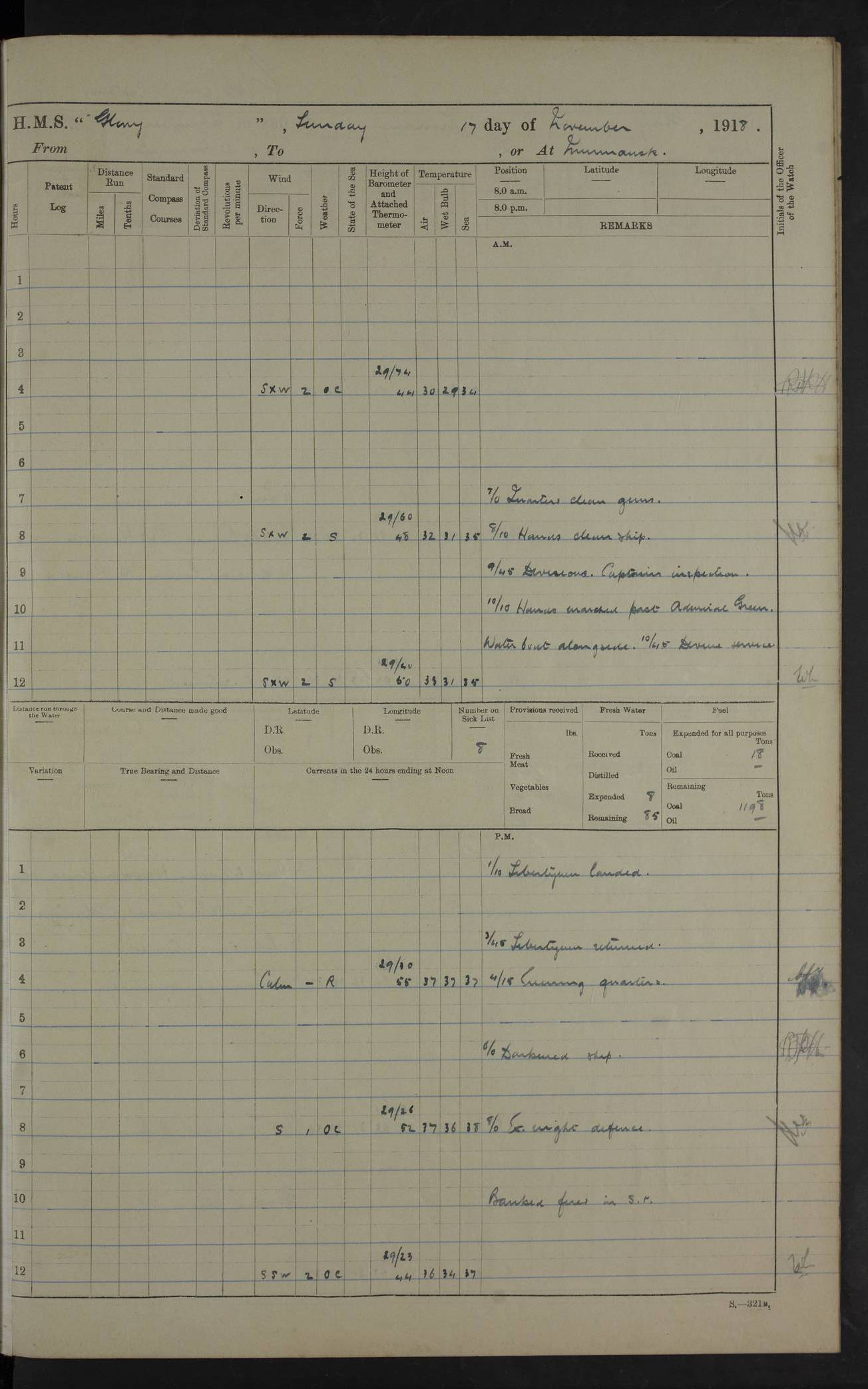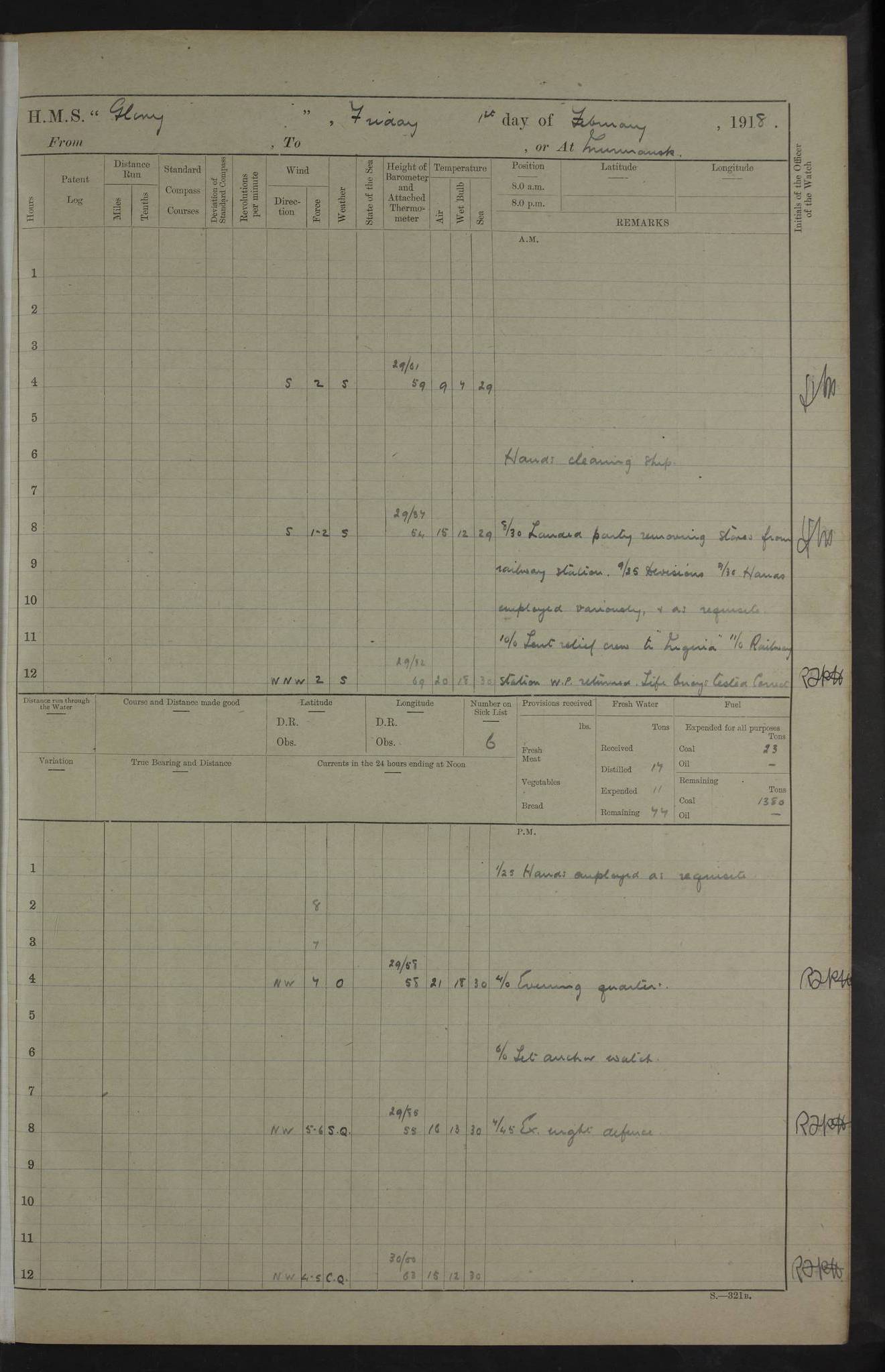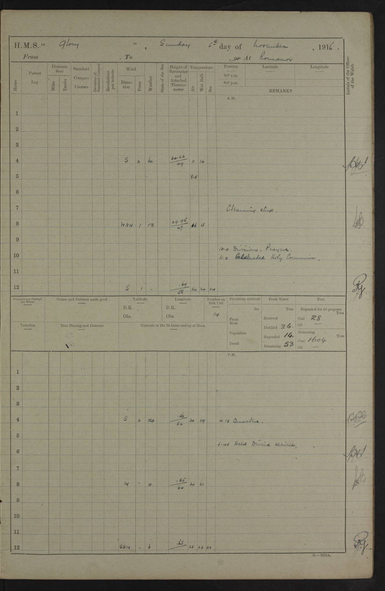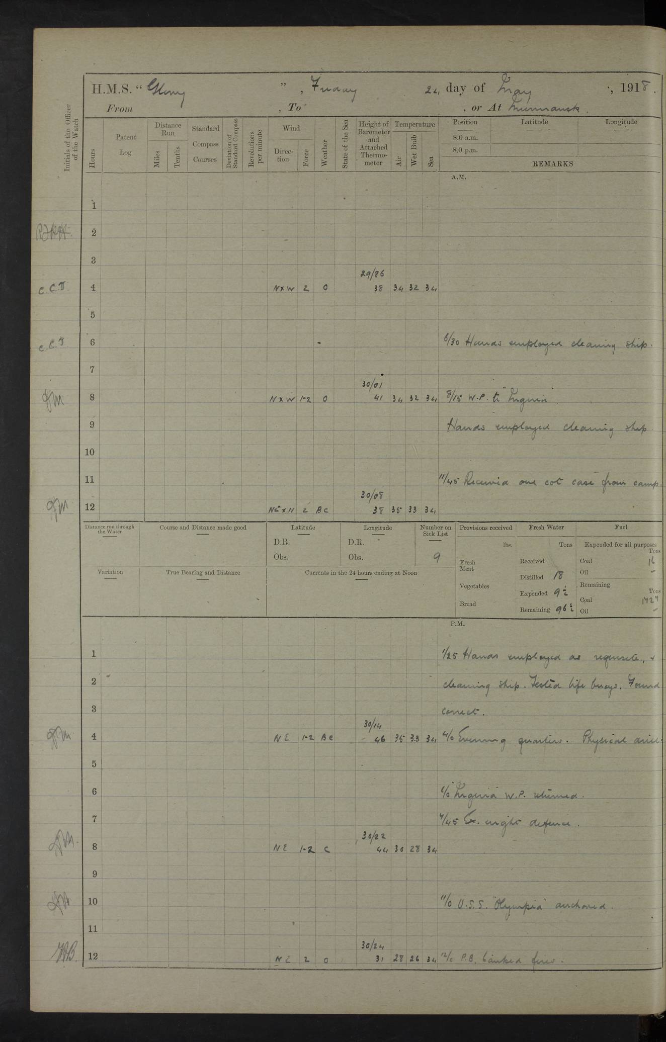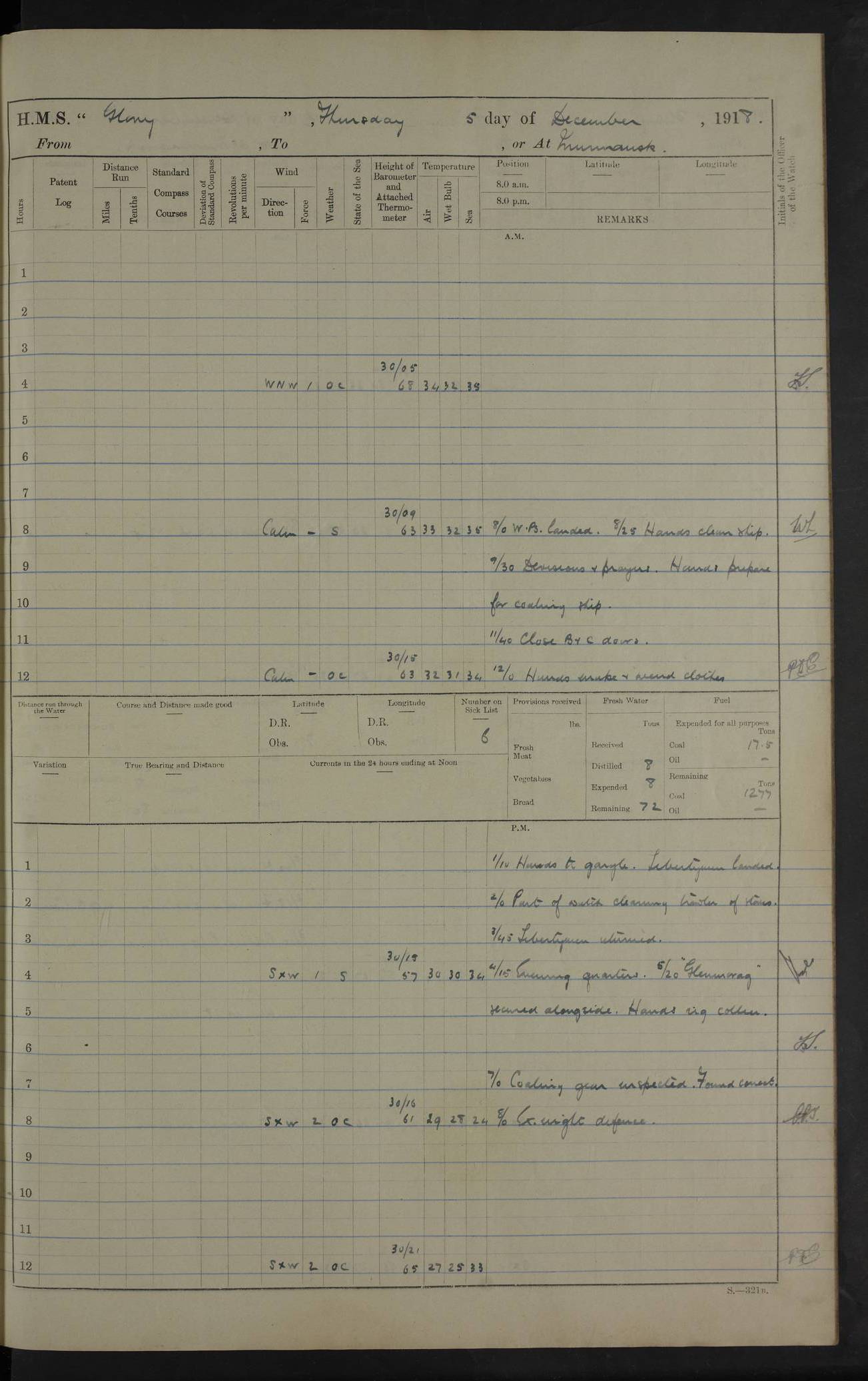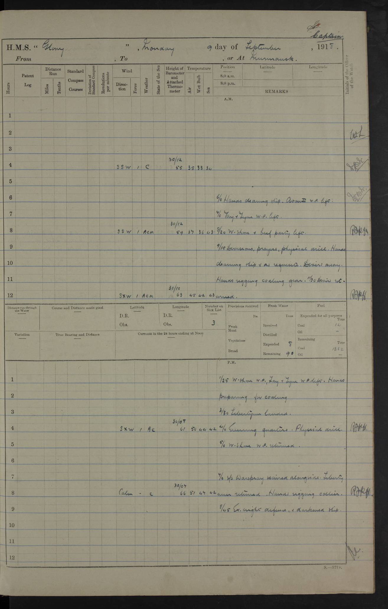 LOGS FOR OCTOBER 1916 For the period covered by the remainder of these logs (1 October, 1916 to 31 December 1918), HMS Glory was based at Murmansk, northern Russia. The city had a variety of names in the early 20th Century – including, Port Murman, Romanov and Murmansk. The location will be given in these pages as Murmansk, the modern name. A history of Murmansk’s names is available at http://en.wikipedia.org/wiki/Murmansk . 4f961482a2fc8e2def0011c7: (http://s3.amazonaws.com/oldweather/ADM53-43026/ADM 53-43026-001_0.jpg) This log is to be kept in a cover in future 4f961482a2fc8e2def0011c8: (http://s3.amazonaws.com/oldweather/ADM53-43026/ADM 53-43026-001_1.jpg) 4f961482a2fc8e2def0011c9: (http://s3.amazonaws.com/oldweather/ADM53-43026/ADM 53-43026-002_0.jpg) 4f961483a2fc8e2def0011ca: (http://s3.amazonaws.com/oldweather/ADM53-43026/ADM 53-43026-002_1.jpg) 4f961483a2fc8e2def0011cb: (http://s3.amazonaws.com/oldweather/ADM53-43026/ADM 53-43026-003_0.jpg) 4f961483a2fc8e2def0011cc: (http://s3.amazonaws.com/oldweather/ADM53-43026/ADM 53-43026-003_1.jpg) 1 October 1916 Murmansk Lat 69.03, Long 33.05 5.40am: Russian auxiliary Kolgiev sailed. Information regarding this vessel (or similar name) has not been found. 7.30am: Celebrated Holy Communion. am: Party working in Earl Essex. Earl Essex was a hired trawler of 225 grt, built, in 1914. Sourced from F.J. Dittmar & J.J. Colledge (1972) – British warships 1914–1919, Ian Allan. 10.45am: Held Divine Service. 11.30am: Celebrated Holy Communion. 4.45pm: Out nets. 4f961484a2fc8e2def0011cd: (http://s3.amazonaws.com/oldweather/ADM53-43026/ADM 53-43026-004_0.jpg) 2 October 1916 Murmansk Lat 69.03, Long 33.05 am: Party working in Earl Essex. 11.30am: Paid quarterly settlement. 6.15pm: Kolgiev arrived. 4f961484a2fc8e2def0011ce: (http://s3.amazonaws.com/oldweather/ADM53-43026/ADM 53-43026-004_1.jpg) 3 October 1916 Murmansk Lat 69.03, Long 33.05 Number on sick list: 9 9.20am: Aft port nets. 11.30am: Russian TBs Goorovoi and Plasteevyi(?) arrived. The first of these TBs is possibly ‘Grosovoi’, built at Le Havre around 1900. Her fate is unclear. The name of the second vessel is possibly incorrect, but no near match has been found. 1.30pm: Out port nets. 4f961484a2fc8e2def0011cf: (http://s3.amazonaws.com/oldweather/ADM53-43026/ADM 53-43026-005_0.jpg) 4 October 1916 Murmansk Lat 69.03, Long 33.05 8.30am: Salvator - broad pendant of Commodore T.W. Kemp arrived. Salvator (ex–Katoomba) was a hired yacht of 684 tons gross, built in 1903. She served as the Heliopolis in WW2. Details at WW1NavyBritishShips-Dittmar4AP.htm . 9.25am: Aft port nets. 11.05am: HE the Minister of Marine visited ship. 11.30am: Out port nets. 11.50am: Russian auxiliary Gotowsci(?) arrived. 12 noon: Kolgiev sailed. pm: HM Tug Blackcock arrived. Blackcock was a hired patrol tug, built in 1886 and wrecked on 18 January, 1918, in the White Sea. Sourced from F.J. Dittmar & J.J. Colledge (1972) – British warships 1914–1919, Ian Allan. 6.50pm: Kolgiev arrived. 4f961485a2fc8e2def0011d0: (http://s3.amazonaws.com/oldweather/ADM53-43026/ADM 53-43026-005_1.jpg) 5 October 1916 Murmansk Lat 69.03, Long 33.05 10.35am: Kolgiev sailed. 1.05pm: Salvator sailed. pm: Read Warrant No. 5. 4f961485a2fc8e2def0011d1: (http://s3.amazonaws.com/oldweather/ADM53-43026/ADM 53-43026-006_0.jpg) 6 October 1916 Murmansk Lat 69.03, Long 33.05 pm: 5 tons of water supplied to Blackcock. 3.30pm: Action. 3.45pm: Secure. Russian T.B's Grosovoi and Plasteevyi sailed. 4f961485a2fc8e2def0011d2: (http://s3.amazonaws.com/oldweather/ADM53-43026/ADM 53-43026-006_1.jpg) 7 October 1916 Murmansk Lat 69.03, Long 33.05 am: Party coaling trawler. am: Tested life buoys – correct. 4f961486a2fc8e2def0011d3: (http://s3.amazonaws.com/oldweather/ADM53-43026/ADM 53-43026-007_0.jpg) 8 October 1916 Murmansk Lat 69.03, Long 33.05 6.45am: Party working in collier. 7.30am: Celebrated Holy Communion. 10.45am: Held Divine service. 5.45pm: Held Divine Service. 4f961486a2fc8e2def0011d4: (http://s3.amazonaws.com/oldweather/ADM53-43026/ADM 53-43026-007_1.jpg) 9 October 1916 Murmansk Lat 69.03, Long 33.05 Number on sick list: 9 am: Exercised fire stations. am: 2nd pinnace patrolling. pm: Landed marines for drill. 4f961486a2fc8e2def0011d5: (http://s3.amazonaws.com/oldweather/ADM53-43026/ADM 53-43026-008_0.jpg) 10 October 1916 Murmansk Lat 69.03, Long 33.05 am: Steam pinnace patrolling. 1.55pm: Kolgiev arrived. 4f961487a2fc8e2def0011d6: (http://s3.amazonaws.com/oldweather/ADM53-43026/ADM 53-43026-008_1.jpg) 11 October 1916 Murmansk Lat 69.03, Long 33.05 am: Party working on boom defence. am: MT and QD men aired bedding. am: Marines at drill. 1.50pm: Kolgiev sailed. 3.15pm: British tug Racia (lighter ES 23 in tow) arrived. Racia was a hired screw tug of 410 grt, built in 1894 and sold on 23 June, 1920. Sourced from F.J. Dittmar & J.J. Colledge (1972) – British warships 1914–1919, Ian Allan. 4f961487a2fc8e2def0011d7: (http://s3.amazonaws.com/oldweather/ADM53-43026/ADM 53-43026-009_0.jpg) 12 October 1916 Murmansk Lat 69.03, Long 33.05 Number on sick list: 6 am: Party working on boom defence. am: Steam pinnace patrolling. pm: Make and mend clothes. 4.15pm: Read warrant No. 6. 6.00pm: Imperator Nicolas arrived. A vessel with this name has not been traced. 4f961487a2fc8e2def0011d8: (http://s3.amazonaws.com/oldweathe/ADM53-43026/ADM 53-43026-009_1.jpg) 13 October 1916 Murmansk Lat 69.03, Long 33.05 am: Steam pinnace patrolling. am: Party working on boom defence. am: Found foc’sle awning and side screens damaged by rats. 4f961488a2fc8e2def0011d9: (http://s3.amazonaws.com/oldweather/ADM53-43026/ADM 53-43026-010_0.jpg) 14 August 1916 (probably should read October) Murmansk Lat 69.03, Long 33.05 Number on sick list: 7 6.45am: Racia (floating crane in tow) sailed. am: Party working on boom defence. am: Tested life buoys – correct. 3.00pm: Vindictive arrived. HMS Vindictive was a protected cruiser of the Arrogant class, launched in 1897 at Chatham Dockyar