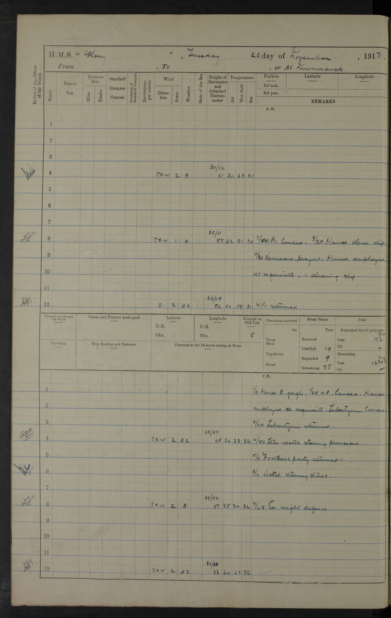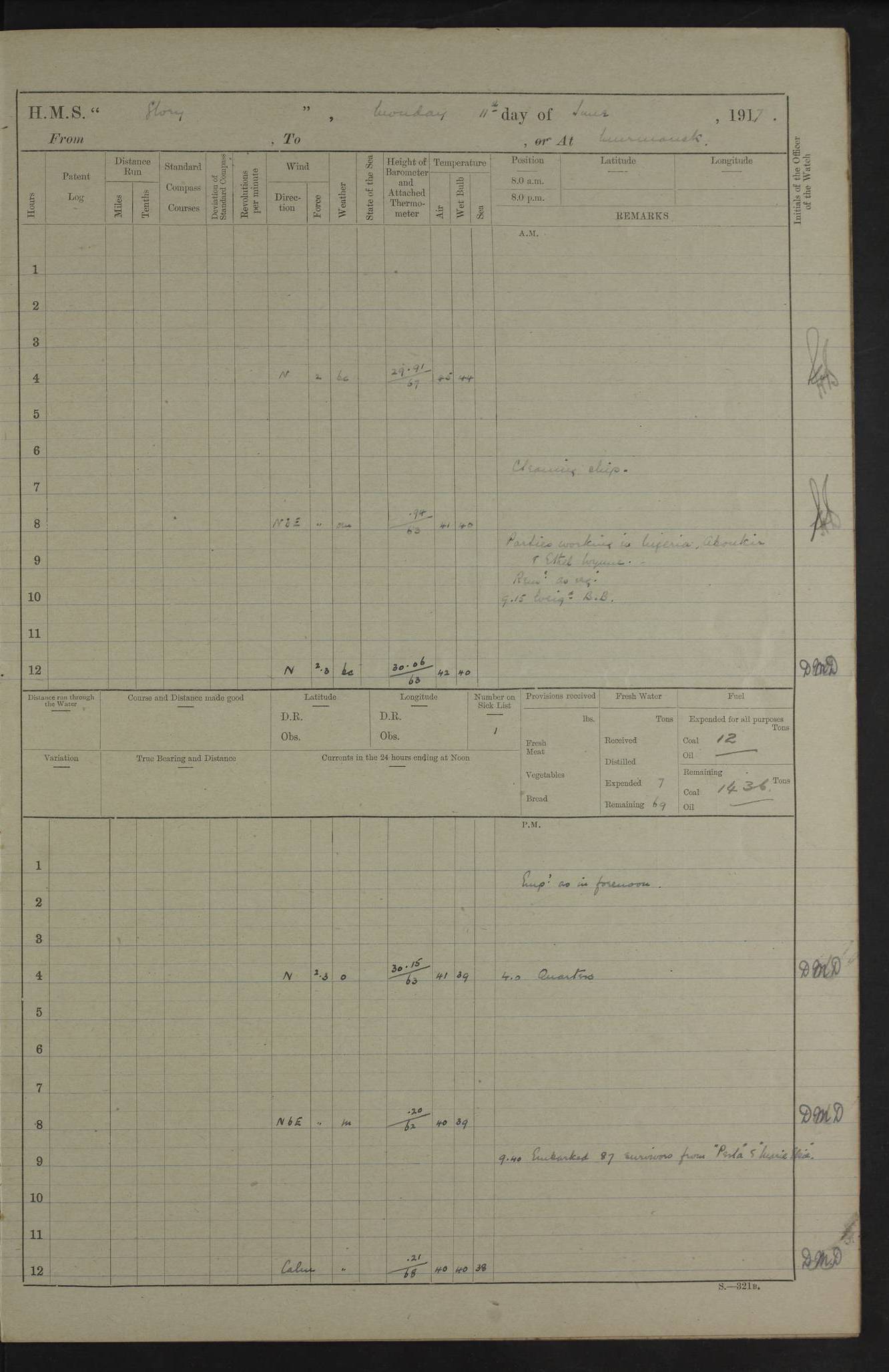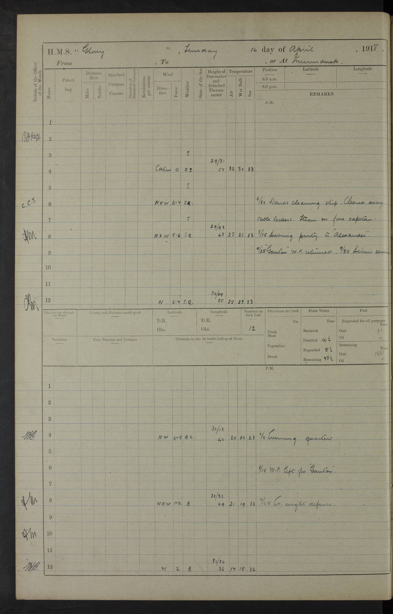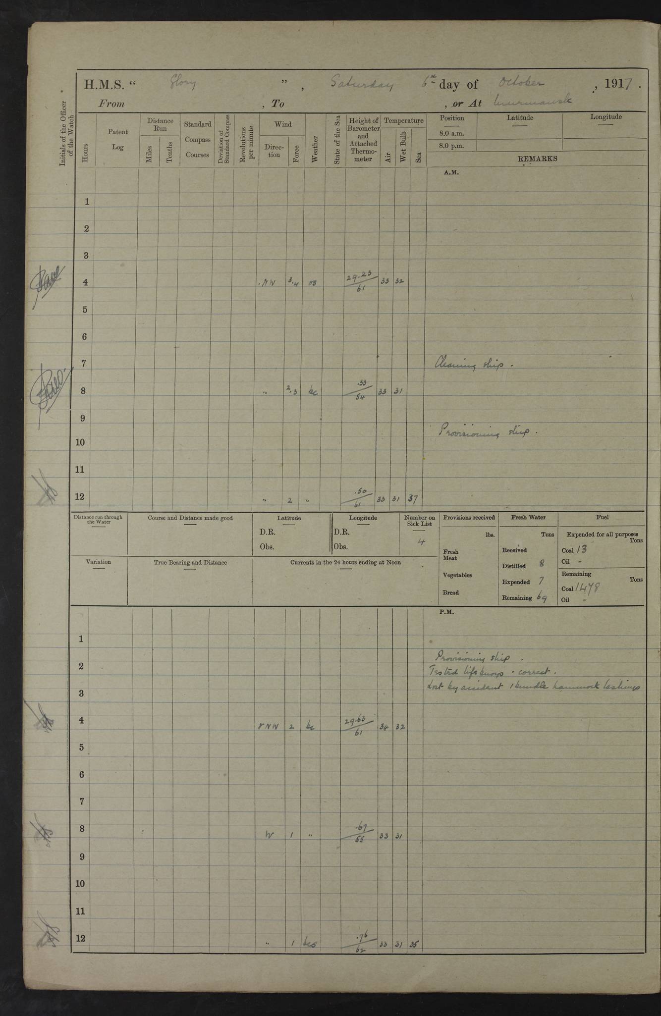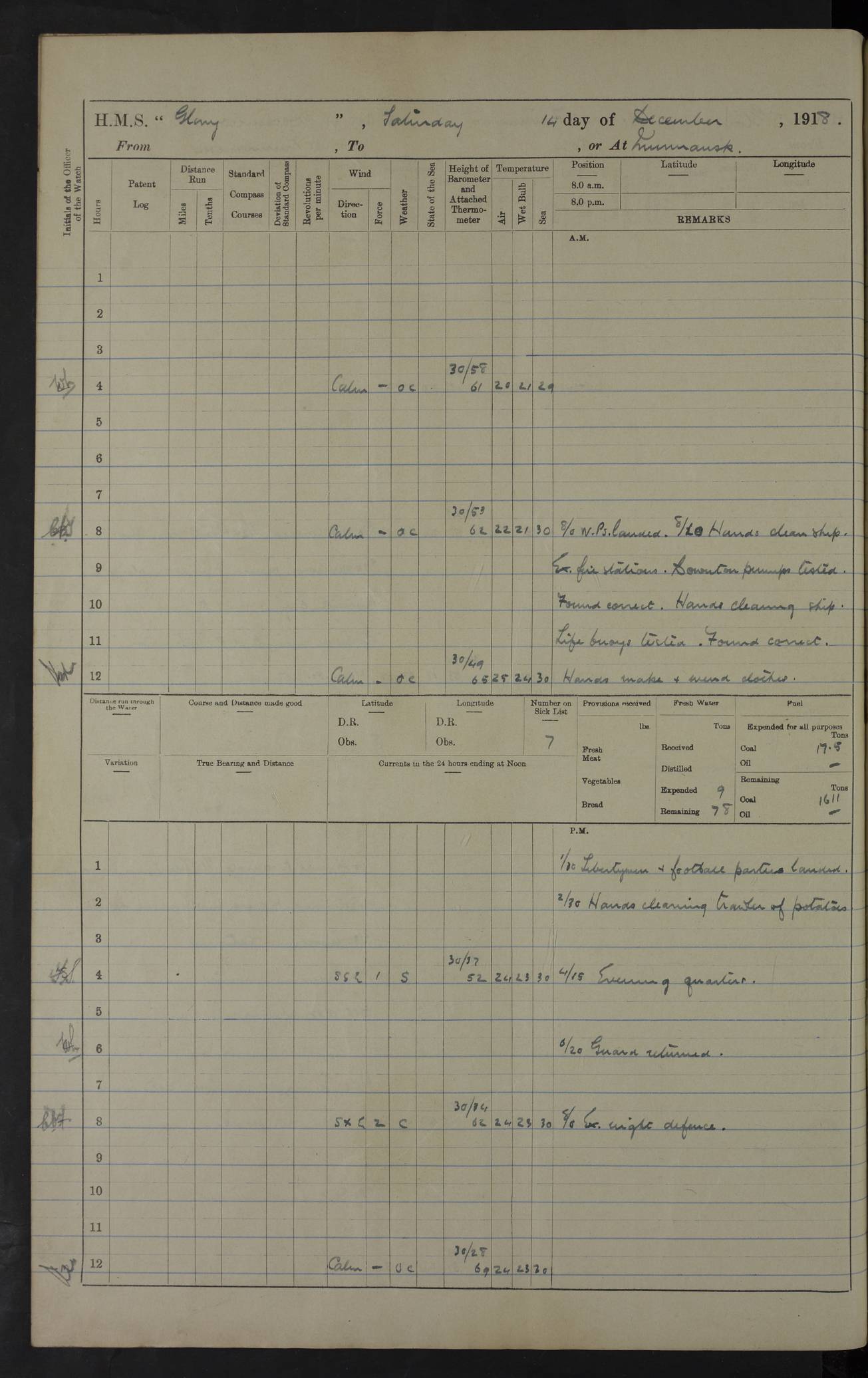 LOGS FOR OCTOBER 1916 For the period covered by the remainder of these logs (1 October, 1916 to 31 December 1918), HMS Glory was based at Murmansk, northern Russia. The city had a variety of names in the early 20th Century – including, Port Murman, Romanov and Murmansk. The location will be given in these pages as Murmansk, the modern name. A history of Murmansk’s names is available at http://en.wikipedia.org/wiki/Murmansk . 4f961482a2fc8e2def0011c7: (http://s3.amazonaws.com/oldweather/ADM53-43026/ADM 53-43026-001_0.jpg) This log is to be kept in a cover in future 4f961482a2fc8e2def0011c8: (http://s3.amazonaws.com/oldweather/ADM53-43026/ADM 53-43026-001_1.jpg) 4f961482a2fc8e2def0011c9: (http://s3.amazonaws.com/oldweather/ADM53-43026/ADM 53-43026-002_0.jpg) 4f961483a2fc8e2def0011ca: (http://s3.amazonaws.com/oldweather/ADM53-43026/ADM 53-43026-002_1.jpg) 4f961483a2fc8e2def0011cb: (http://s3.amazonaws.com/oldweather/ADM53-43026/ADM 53-43026-003_0.jpg) 4f961483a2fc8e2def0011cc: (http://s3.amazonaws.com/oldweather/ADM53-43026/ADM 53-43026-003_1.jpg) 1 October 1916 Murmansk Lat 69.03, Long 33.05 5.40am: Russian auxiliary Kolgiev sailed. Information regarding this vessel (or similar name) has not been found. 7.30am: Celebrated Holy Communion. am: Party working in Earl Essex. Earl Essex was a hired trawler of 225 grt, built, in 1914. Sourced from F.J. Dittmar & J.J. Colledge (1972) – British warships 1914–1919, Ian Allan. 10.45am: Held Divine Service. 11.30am: Celebrated Holy Communion. 4.45pm: Out nets. 4f961484a2fc8e2def0011cd: (http://s3.amazonaws.com/oldweather/ADM53-43026/ADM 53-43026-004_0.jpg) 2 October 1916 Murmansk Lat 69.03, Long 33.05 am: Party working in Earl Essex. 11.30am: Paid quarterly settlement. 6.15pm: Kolgiev arrived. 4f961484a2fc8e2def0011ce: (http://s3.amazonaws.com/oldweather/ADM53-43026/ADM 53-43026-004_1.jpg) 3 October 1916 Murmansk Lat 69.03, Long 33.05 Number on sick list: 9 9.20am: Aft port nets. 11.30am: Russian TBs Goorovoi and Plasteevyi(?) arrived. The first of these TBs is possibly ‘Grosovoi’, built at Le Havre around 1900. Her fate is unclear. The name of the second vessel is possibly incorrect, but no near match has been found. 1.30pm: Out port nets. 4f961484a2fc8e2def0011cf: (http://s3.amazonaws.com/oldweather/ADM53-43026/ADM 53-43026-005_0.jpg) 4 October 1916 Murmansk Lat 69.03, Long 33.05 8.30am: Salvator - broad pendant of Commodore T.W. Kemp arrived. Salvator (ex–Katoomba) was a hired yacht of 684 tons gross, built in 1903. She served as the Heliopolis in WW2. Details at WW1NavyBritishShips-Dittmar4AP.htm . 9.25am: Aft port nets. 11.05am: HE the Minister of Marine visited ship. 11.30am: Out port nets. 11.50am: Russian auxiliary Gotowsci(?) arrived. 12 noon: Kolgiev sailed. pm: HM Tug Blackcock arrived. Blackcock was a hired patrol tug, built in 1886 and wrecked on 18 January, 1918, in the White Sea. Sourced from F.J. Dittmar & J.J. Colledge (1972) – British warships 1914–1919, Ian Allan. 6.50pm: Kolgiev arrived. 4f961485a2fc8e2def0011d0: (http://s3.amazonaws.com/oldweather/ADM53-43026/ADM 53-43026-005_1.jpg) 5 October 1916 Murmansk Lat 69.03, Long 33.05 10.35am: Kolgiev sailed. 1.05pm: Salvator sailed. pm: Read Warrant No. 5. 4f961485a2fc8e2def0011d1: (http://s3.amazonaws.com/oldweather/ADM53-43026/ADM 53-43026-006_0.jpg) 6 October 1916 Murmansk Lat 69.03, Long 33.05 pm: 5 tons of water supplied to Blackcock. 3.30pm: Action. 3.45pm: Secure. Russian T.B's Grosovoi and Plasteevyi sailed. 4f961485a2fc8e2def0011d2: (http://s3.amazonaws.com/oldweather/ADM53-43026/ADM 53-43026-006_1.jpg) 7 October 1916 Murmansk Lat 69.03, Long 33.05 am: Party coaling trawler. am: Tested life buoys – correct. 4f961486a2fc8e2def0011d3: (http://s3.amazonaws.com/oldweather/ADM53-43026/ADM 53-43026-007_0.jpg) 8 October 1916 Murmansk Lat 69.03, Long 33.05 6.45am: Party working in collier. 7.30am: Celebrated Holy Communion. 10.45am: Held Divine service. 5.45pm: Held Divine Service. 4f961486a2fc8e2def0011d4: (http://s3.amazonaws.com/oldweather/ADM53-43026/ADM 53-43026-007_1.jpg) 9 October 1916 Murmansk Lat 69.03, Long 33.05 Number on sick list: 9 am: Exercised fire stations. am: 2nd pinnace patrolling. pm: Landed marines for drill. 4f961486a2fc8e2def0011d5: (http://s3.amazonaws.com/oldweather/ADM53-43026/ADM 53-43026-008_0.jpg) 10 October 1916 Murmansk Lat 69.03, Long 33.05 am: Steam pinnace patrolling. 1.55pm: Kolgiev arrived. 4f961487a2fc8e2def0011d6: (http://s3.amazonaws.com/oldweather/ADM53-43026/ADM 53-43026-008_1.jpg) 11 October 1916 Murmansk Lat 69.03, Long 33.05 am: Party working on boom defence. am: MT and QD men aired bedding. am: Marines at drill. 1.50pm: Kolgiev sailed. 3.15pm: British tug Racia (lighter ES 23 in tow) arrived. Racia was a hired screw tug of 410 grt, built in 1894 and sold on 23 June, 1920. Sourced from F.J. Dittmar & J.J. Colledge (1972) – British warships 1914–1919, Ian Allan. 4f961487a2fc8e2def0011d7: (http://s3.amazonaws.com/oldweather/ADM53-43026/ADM 53-43026-009_0.jpg) 12 October 1916 Murmansk Lat 69.03, Long 33.05 Number on sick list: 6 am: Party working on boom defence. am: Steam pinnace patrolling. pm: Make and mend clothes. 4.15pm: Read warrant No. 6. 6.00pm: Imperator Nicolas arrived. A vessel with this name has not been traced. 4f961487a2fc8e2def0011d8: (http://s3.amazonaws.com/oldweathe/ADM53-43026/ADM 53-43026-009_1.jpg) 13 October 1916 Murmansk Lat 69.03, Long 33.05 am: Steam pinnace patrolling. am: Party working on boom defence. am: Found foc’sle awning and side screens damaged by rats. 4f961488a2fc8e2def0011d9: (http://s3.amazonaws.com/oldweather/ADM53-43026/ADM 53-43026-010_0.jpg) 14 August 1916 (probably should read October) Murmansk Lat 69.03, Long 33.05 Number on sick list: 7 6.45am: Racia (floating crane in tow) sailed. am: Party working on boom defence. am: Tested life buoys – correct. 3.00pm: Vindictive arrived. HMS Vindictive was a protected cruiser of the Arrogant class, launched in 1897 at Chatham Dockyar
