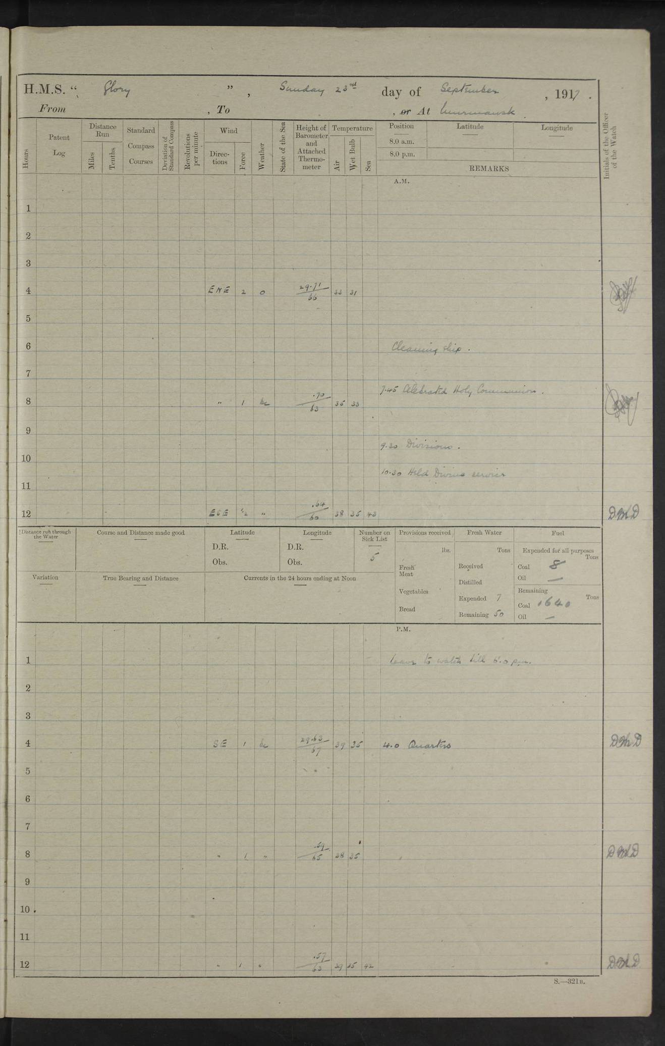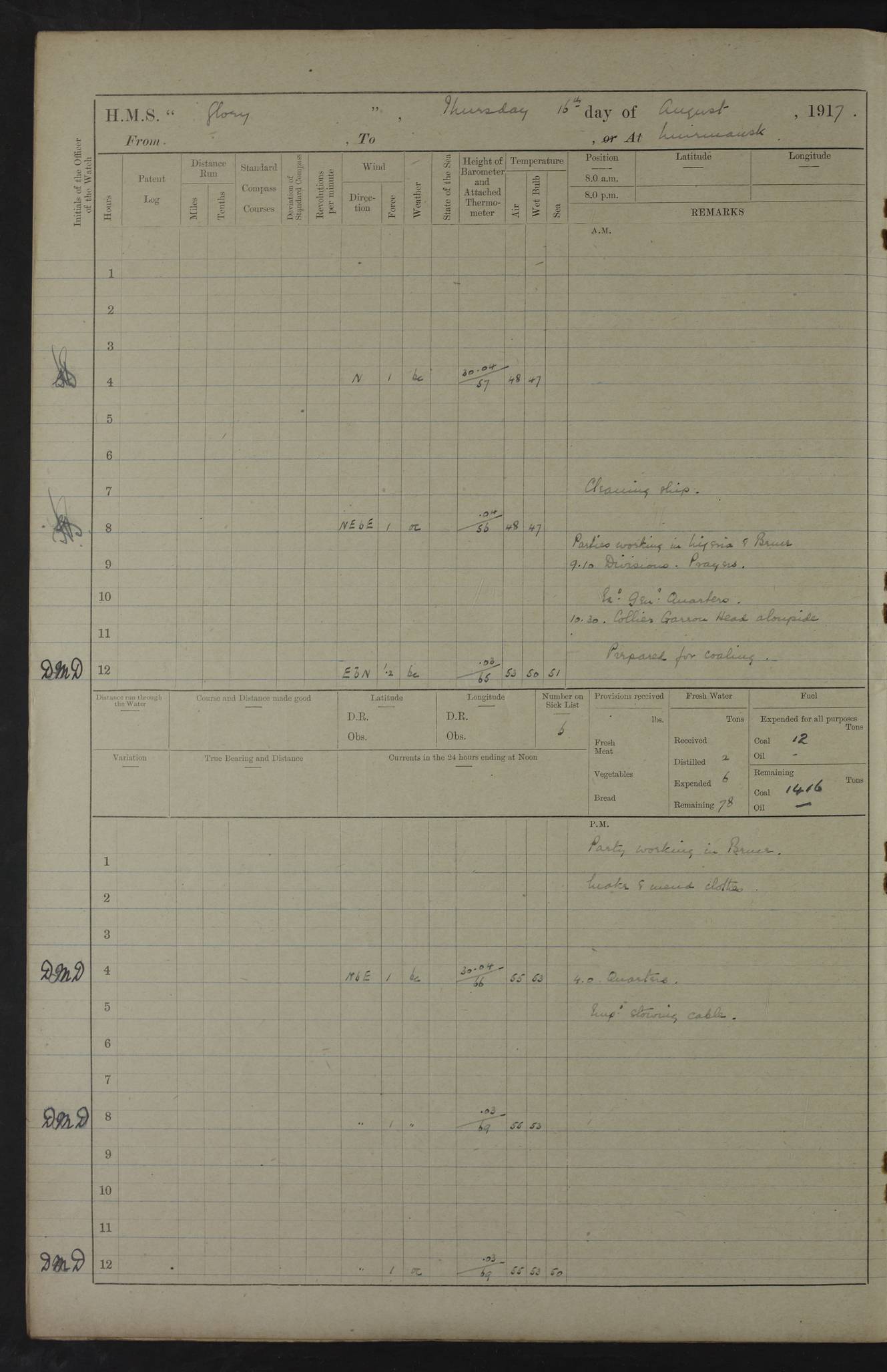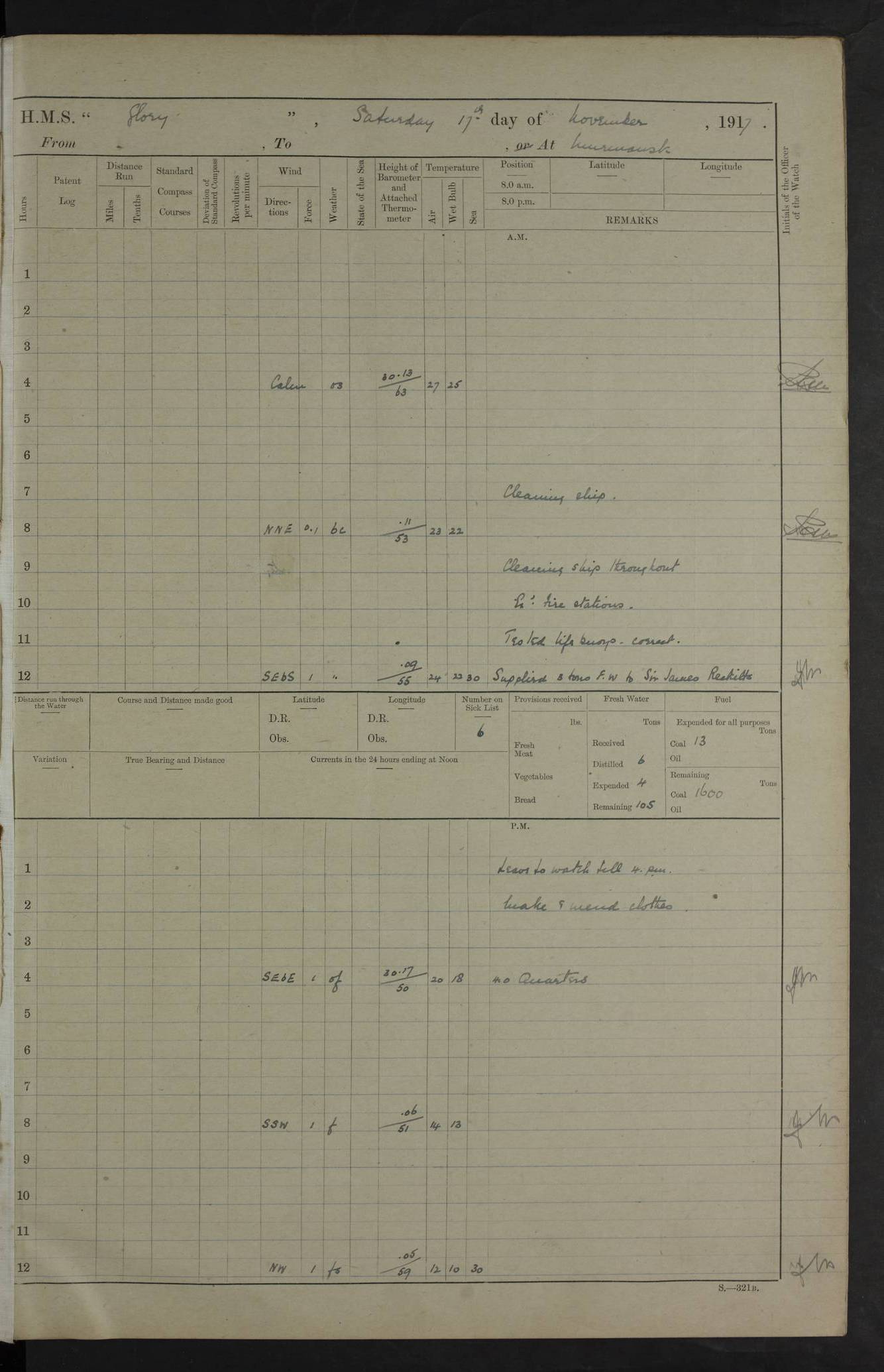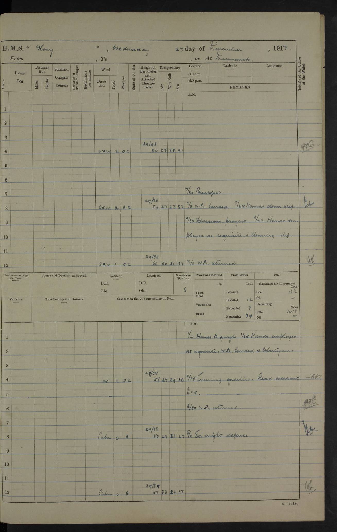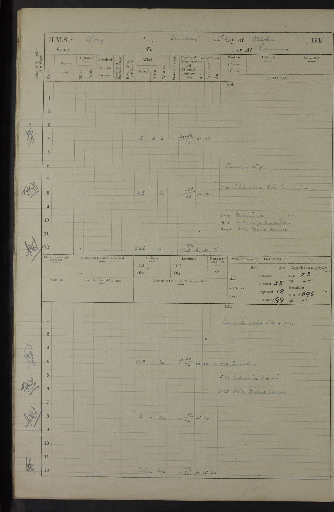 LOGS FOR OCTOBER 1916 For the period covered by the remainder of these logs (1 October, 1916 to 31 December 1918), HMS Glory was based at Murmansk, northern Russia. The city had a variety of names in the early 20th Century – including, Port Murman, Romanov and Murmansk. The location will be given in these pages as Murmansk, the modern name. A history of Murmansk’s names is available at http://en.wikipedia.org/wiki/Murmansk . 4f961482a2fc8e2def0011c7: (http://s3.amazonaws.com/oldweather/ADM53-43026/ADM 53-43026-001_0.jpg) This log is to be kept in a cover in future 4f961482a2fc8e2def0011c8: (http://s3.amazonaws.com/oldweather/ADM53-43026/ADM 53-43026-001_1.jpg) 4f961482a2fc8e2def0011c9: (http://s3.amazonaws.com/oldweather/ADM53-43026/ADM 53-43026-002_0.jpg) 4f961483a2fc8e2def0011ca: (http://s3.amazonaws.com/oldweather/ADM53-43026/ADM 53-43026-002_1.jpg) 4f961483a2fc8e2def0011cb: (http://s3.amazonaws.com/oldweather/ADM53-43026/ADM 53-43026-003_0.jpg) 4f961483a2fc8e2def0011cc: (http://s3.amazonaws.com/oldweather/ADM53-43026/ADM 53-43026-003_1.jpg) 1 October 1916 Murmansk Lat 69.03, Long 33.05 5.40am: Russian auxiliary Kolgiev sailed. Information regarding this vessel (or similar name) has not been found. 7.30am: Celebrated Holy Communion. am: Party working in Earl Essex. Earl Essex was a hired trawler of 225 grt, built, in 1914. Sourced from F.J. Dittmar & J.J. Colledge (1972) – British warships 1914–1919, Ian Allan. 10.45am: Held Divine Service. 11.30am: Celebrated Holy Communion. 4.45pm: Out nets. 4f961484a2fc8e2def0011cd: (http://s3.amazonaws.com/oldweather/ADM53-43026/ADM 53-43026-004_0.jpg) 2 October 1916 Murmansk Lat 69.03, Long 33.05 am: Party working in Earl Essex. 11.30am: Paid quarterly settlement. 6.15pm: Kolgiev arrived. 4f961484a2fc8e2def0011ce: (http://s3.amazonaws.com/oldweather/ADM53-43026/ADM 53-43026-004_1.jpg) 3 October 1916 Murmansk Lat 69.03, Long 33.05 Number on sick list: 9 9.20am: Aft port nets. 11.30am: Russian TBs Goorovoi and Plasteevyi(?) arrived. The first of these TBs is possibly ‘Grosovoi’, built at Le Havre around 1900. Her fate is unclear. The name of the second vessel is possibly incorrect, but no near match has been found. 1.30pm: Out port nets. 4f961484a2fc8e2def0011cf: (http://s3.amazonaws.com/oldweather/ADM53-43026/ADM 53-43026-005_0.jpg) 4 October 1916 Murmansk Lat 69.03, Long 33.05 8.30am: Salvator - broad pendant of Commodore T.W. Kemp arrived. Salvator (ex–Katoomba) was a hired yacht of 684 tons gross, built in 1903. She served as the Heliopolis in WW2. Details at WW1NavyBritishShips-Dittmar4AP.htm . 9.25am: Aft port nets. 11.05am: HE the Minister of Marine visited ship. 11.30am: Out port nets. 11.50am: Russian auxiliary Gotowsci(?) arrived. 12 noon: Kolgiev sailed. pm: HM Tug Blackcock arrived. Blackcock was a hired patrol tug, built in 1886 and wrecked on 18 January, 1918, in the White Sea. Sourced from F.J. Dittmar & J.J. Colledge (1972) – British warships 1914–1919, Ian Allan. 6.50pm: Kolgiev arrived. 4f961485a2fc8e2def0011d0: (http://s3.amazonaws.com/oldweather/ADM53-43026/ADM 53-43026-005_1.jpg) 5 October 1916 Murmansk Lat 69.03, Long 33.05 10.35am: Kolgiev sailed. 1.05pm: Salvator sailed. pm: Read Warrant No. 5. 4f961485a2fc8e2def0011d1: (http://s3.amazonaws.com/oldweather/ADM53-43026/ADM 53-43026-006_0.jpg) 6 October 1916 Murmansk Lat 69.03, Long 33.05 pm: 5 tons of water supplied to Blackcock. 3.30pm: Action. 3.45pm: Secure. Russian T.B's Grosovoi and Plasteevyi sailed. 4f961485a2fc8e2def0011d2: (http://s3.amazonaws.com/oldweather/ADM53-43026/ADM 53-43026-006_1.jpg) 7 October 1916 Murmansk Lat 69.03, Long 33.05 am: Party coaling trawler. am: Tested life buoys – correct. 4f961486a2fc8e2def0011d3: (http://s3.amazonaws.com/oldweather/ADM53-43026/ADM 53-43026-007_0.jpg) 8 October 1916 Murmansk Lat 69.03, Long 33.05 6.45am: Party working in collier. 7.30am: Celebrated Holy Communion. 10.45am: Held Divine service. 5.45pm: Held Divine Service. 4f961486a2fc8e2def0011d4: (http://s3.amazonaws.com/oldweather/ADM53-43026/ADM 53-43026-007_1.jpg) 9 October 1916 Murmansk Lat 69.03, Long 33.05 Number on sick list: 9 am: Exercised fire stations. am: 2nd pinnace patrolling. pm: Landed marines for drill. 4f961486a2fc8e2def0011d5: (http://s3.amazonaws.com/oldweather/ADM53-43026/ADM 53-43026-008_0.jpg) 10 October 1916 Murmansk Lat 69.03, Long 33.05 am: Steam pinnace patrolling. 1.55pm: Kolgiev arrived. 4f961487a2fc8e2def0011d6: (http://s3.amazonaws.com/oldweather/ADM53-43026/ADM 53-43026-008_1.jpg) 11 October 1916 Murmansk Lat 69.03, Long 33.05 am: Party working on boom defence. am: MT and QD men aired bedding. am: Marines at drill. 1.50pm: Kolgiev sailed. 3.15pm: British tug Racia (lighter ES 23 in tow) arrived. Racia was a hired screw tug of 410 grt, built in 1894 and sold on 23 June, 1920. Sourced from F.J. Dittmar & J.J. Colledge (1972) – British warships 1914–1919, Ian Allan. 4f961487a2fc8e2def0011d7: (http://s3.amazonaws.com/oldweather/ADM53-43026/ADM 53-43026-009_0.jpg) 12 October 1916 Murmansk Lat 69.03, Long 33.05 Number on sick list: 6 am: Party working on boom defence. am: Steam pinnace patrolling. pm: Make and mend clothes. 4.15pm: Read warrant No. 6. 6.00pm: Imperator Nicolas arrived. A vessel with this name has not been traced. 4f961487a2fc8e2def0011d8: (http://s3.amazonaws.com/oldweathe/ADM53-43026/ADM 53-43026-009_1.jpg) 13 October 1916 Murmansk Lat 69.03, Long 33.05 am: Steam pinnace patrolling. am: Party working on boom defence. am: Found foc’sle awning and side screens damaged by rats. 4f961488a2fc8e2def0011d9: (http://s3.amazonaws.com/oldweather/ADM53-43026/ADM 53-43026-010_0.jpg) 14 August 1916 (probably should read October) Murmansk Lat 69.03, Long 33.05 Number on sick list: 7 6.45am: Racia (floating crane in tow) sailed. am: Party working on boom defence. am: Tested life buoys – correct. 3.00pm: Vindictive arrived. HMS Vindictive was a protected cruiser of the Arrogant class, launched in 1897 at Chatham Dockyar