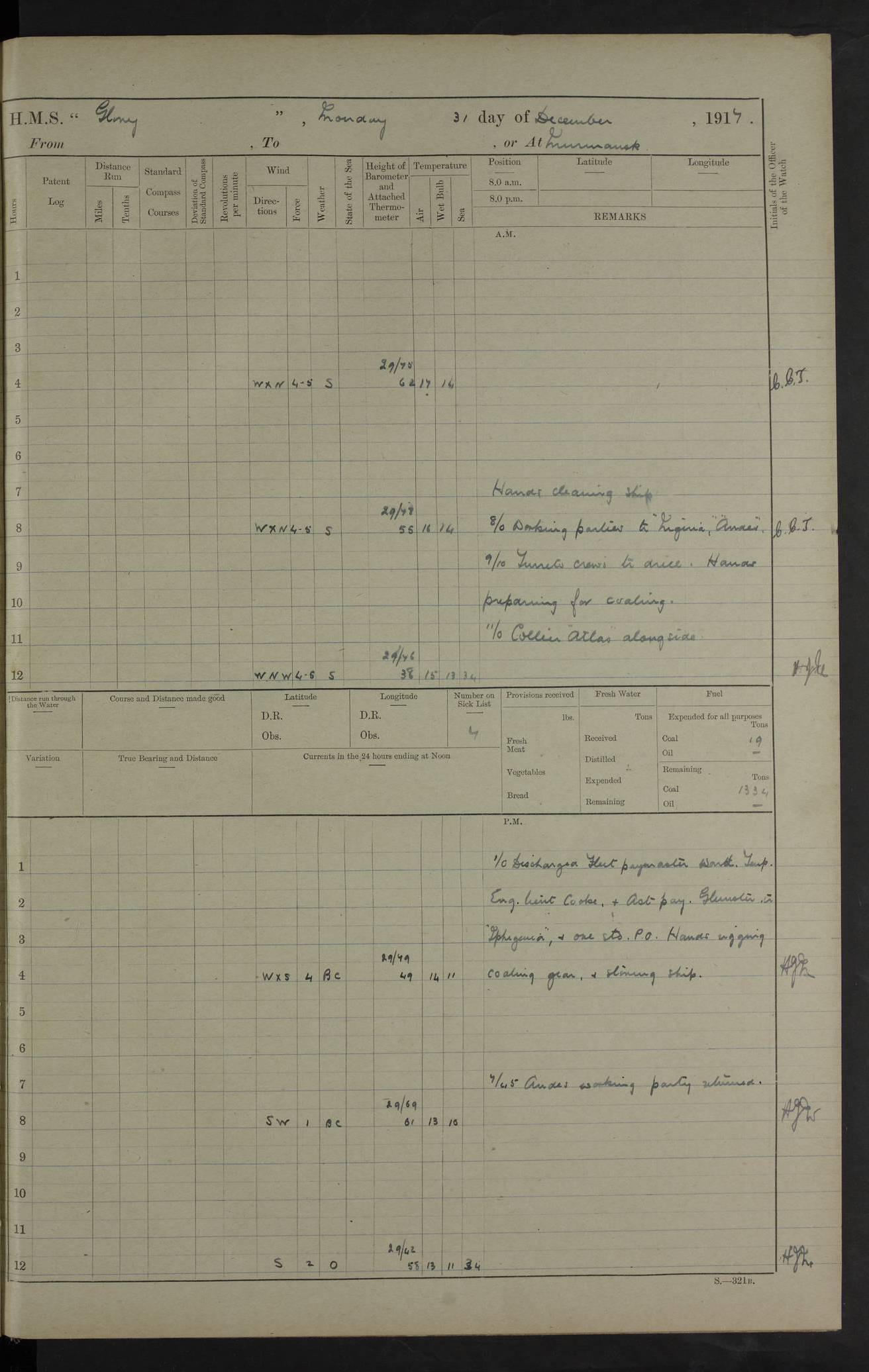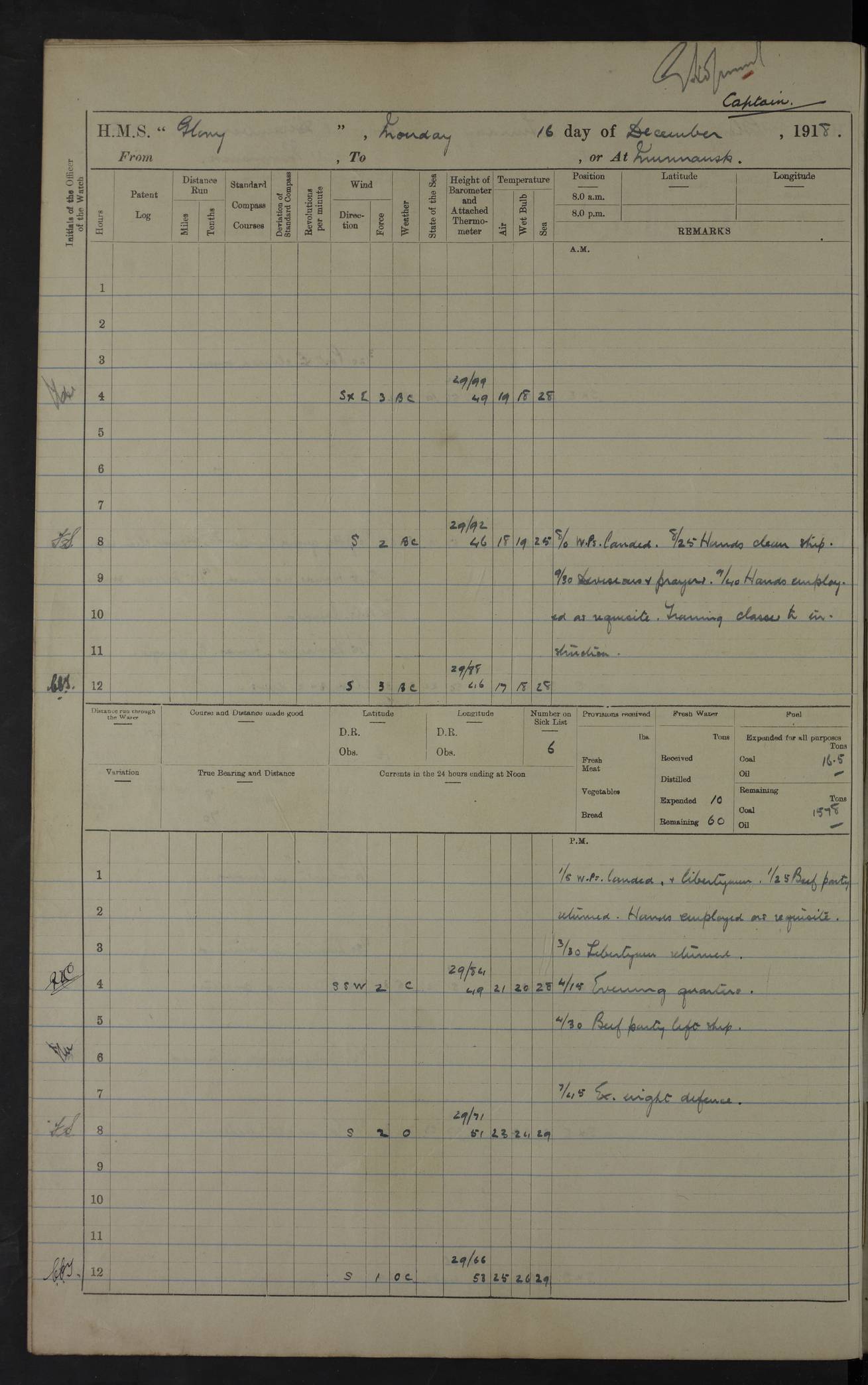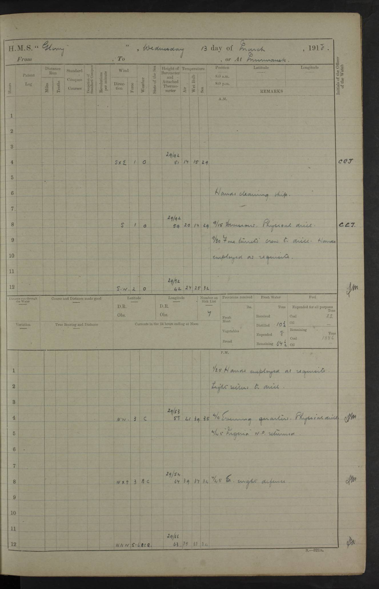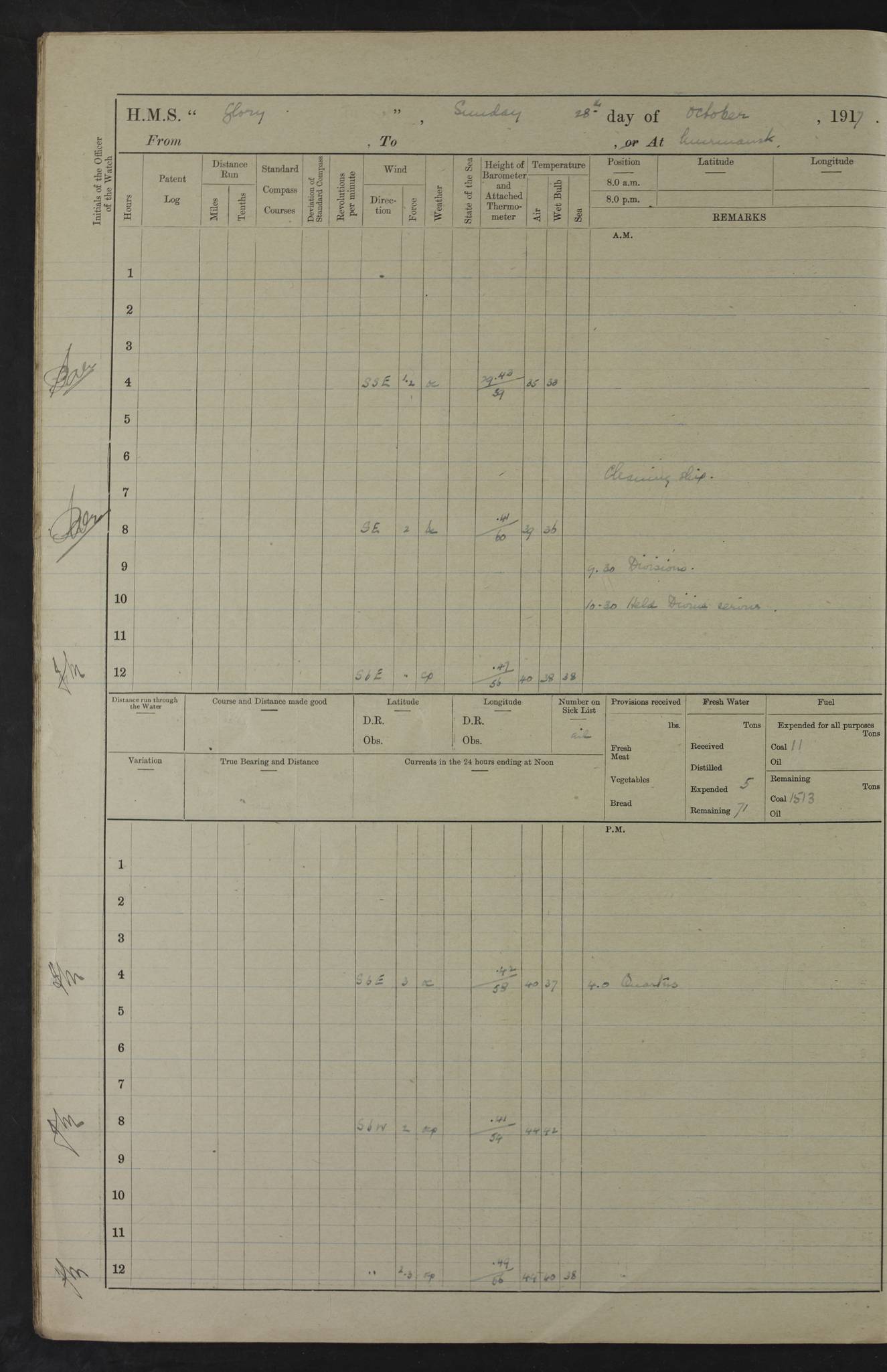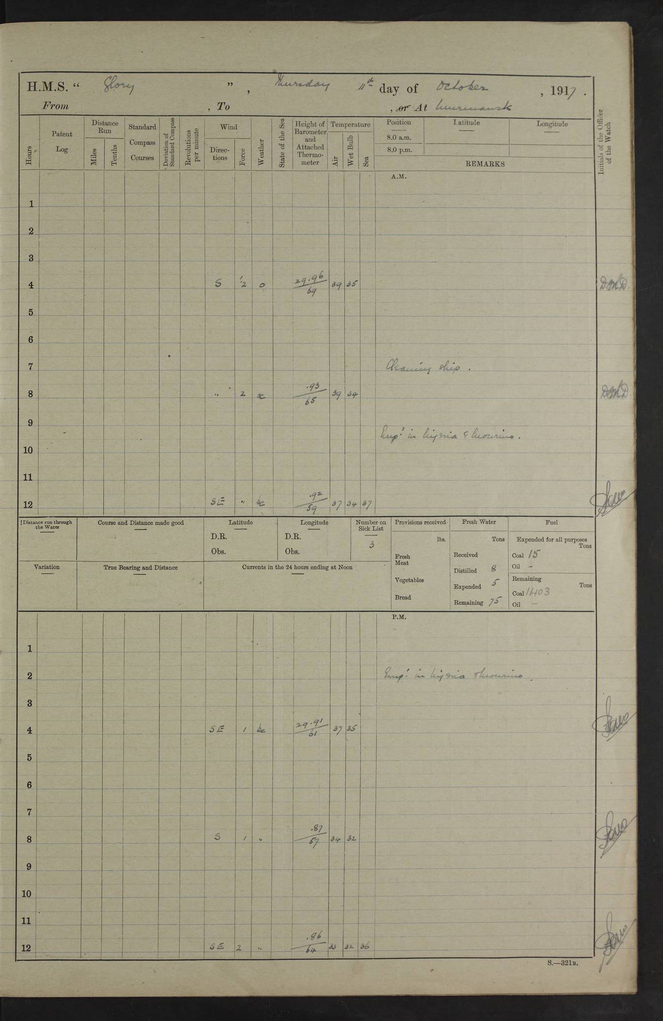 LOGS FOR OCTOBER 1916 For the period covered by the remainder of these logs (1 October, 1916 to 31 December 1918), HMS Glory was based at Murmansk, northern Russia. The city had a variety of names in the early 20th Century – including, Port Murman, Romanov and Murmansk. The location will be given in these pages as Murmansk, the modern name. A history of Murmansk’s names is available at http://en.wikipedia.org/wiki/Murmansk . 4f961482a2fc8e2def0011c7: (http://s3.amazonaws.com/oldweather/ADM53-43026/ADM 53-43026-001_0.jpg) This log is to be kept in a cover in future 4f961482a2fc8e2def0011c8: (http://s3.amazonaws.com/oldweather/ADM53-43026/ADM 53-43026-001_1.jpg) 4f961482a2fc8e2def0011c9: (http://s3.amazonaws.com/oldweather/ADM53-43026/ADM 53-43026-002_0.jpg) 4f961483a2fc8e2def0011ca: (http://s3.amazonaws.com/oldweather/ADM53-43026/ADM 53-43026-002_1.jpg) 4f961483a2fc8e2def0011cb: (http://s3.amazonaws.com/oldweather/ADM53-43026/ADM 53-43026-003_0.jpg) 4f961483a2fc8e2def0011cc: (http://s3.amazonaws.com/oldweather/ADM53-43026/ADM 53-43026-003_1.jpg) 1 October 1916 Murmansk Lat 69.03, Long 33.05 5.40am: Russian auxiliary Kolgiev sailed. Information regarding this vessel (or similar name) has not been found. 7.30am: Celebrated Holy Communion. am: Party working in Earl Essex. Earl Essex was a hired trawler of 225 grt, built, in 1914. Sourced from F.J. Dittmar & J.J. Colledge (1972) – British warships 1914–1919, Ian Allan. 10.45am: Held Divine Service. 11.30am: Celebrated Holy Communion. 4.45pm: Out nets. 4f961484a2fc8e2def0011cd: (http://s3.amazonaws.com/oldweather/ADM53-43026/ADM 53-43026-004_0.jpg) 2 October 1916 Murmansk Lat 69.03, Long 33.05 am: Party working in Earl Essex. 11.30am: Paid quarterly settlement. 6.15pm: Kolgiev arrived. 4f961484a2fc8e2def0011ce: (http://s3.amazonaws.com/oldweather/ADM53-43026/ADM 53-43026-004_1.jpg) 3 October 1916 Murmansk Lat 69.03, Long 33.05 Number on sick list: 9 9.20am: Aft port nets. 11.30am: Russian TBs Goorovoi and Plasteevyi(?) arrived. The first of these TBs is possibly ‘Grosovoi’, built at Le Havre around 1900. Her fate is unclear. The name of the second vessel is possibly incorrect, but no near match has been found. 1.30pm: Out port nets. 4f961484a2fc8e2def0011cf: (http://s3.amazonaws.com/oldweather/ADM53-43026/ADM 53-43026-005_0.jpg) 4 October 1916 Murmansk Lat 69.03, Long 33.05 8.30am: Salvator - broad pendant of Commodore T.W. Kemp arrived. Salvator (ex–Katoomba) was a hired yacht of 684 tons gross, built in 1903. She served as the Heliopolis in WW2. Details at WW1NavyBritishShips-Dittmar4AP.htm . 9.25am: Aft port nets. 11.05am: HE the Minister of Marine visited ship. 11.30am: Out port nets. 11.50am: Russian auxiliary Gotowsci(?) arrived. 12 noon: Kolgiev sailed. pm: HM Tug Blackcock arrived. Blackcock was a hired patrol tug, built in 1886 and wrecked on 18 January, 1918, in the White Sea. Sourced from F.J. Dittmar & J.J. Colledge (1972) – British warships 1914–1919, Ian Allan. 6.50pm: Kolgiev arrived. 4f961485a2fc8e2def0011d0: (http://s3.amazonaws.com/oldweather/ADM53-43026/ADM 53-43026-005_1.jpg) 5 October 1916 Murmansk Lat 69.03, Long 33.05 10.35am: Kolgiev sailed. 1.05pm: Salvator sailed. pm: Read Warrant No. 5. 4f961485a2fc8e2def0011d1: (http://s3.amazonaws.com/oldweather/ADM53-43026/ADM 53-43026-006_0.jpg) 6 October 1916 Murmansk Lat 69.03, Long 33.05 pm: 5 tons of water supplied to Blackcock. 3.30pm: Action. 3.45pm: Secure. Russian T.B's Grosovoi and Plasteevyi sailed. 4f961485a2fc8e2def0011d2: (http://s3.amazonaws.com/oldweather/ADM53-43026/ADM 53-43026-006_1.jpg) 7 October 1916 Murmansk Lat 69.03, Long 33.05 am: Party coaling trawler. am: Tested life buoys – correct. 4f961486a2fc8e2def0011d3: (http://s3.amazonaws.com/oldweather/ADM53-43026/ADM 53-43026-007_0.jpg) 8 October 1916 Murmansk Lat 69.03, Long 33.05 6.45am: Party working in collier. 7.30am: Celebrated Holy Communion. 10.45am: Held Divine service. 5.45pm: Held Divine Service. 4f961486a2fc8e2def0011d4: (http://s3.amazonaws.com/oldweather/ADM53-43026/ADM 53-43026-007_1.jpg) 9 October 1916 Murmansk Lat 69.03, Long 33.05 Number on sick list: 9 am: Exercised fire stations. am: 2nd pinnace patrolling. pm: Landed marines for drill. 4f961486a2fc8e2def0011d5: (http://s3.amazonaws.com/oldweather/ADM53-43026/ADM 53-43026-008_0.jpg) 10 October 1916 Murmansk Lat 69.03, Long 33.05 am: Steam pinnace patrolling. 1.55pm: Kolgiev arrived. 4f961487a2fc8e2def0011d6: (http://s3.amazonaws.com/oldweather/ADM53-43026/ADM 53-43026-008_1.jpg) 11 October 1916 Murmansk Lat 69.03, Long 33.05 am: Party working on boom defence. am: MT and QD men aired bedding. am: Marines at drill. 1.50pm: Kolgiev sailed. 3.15pm: British tug Racia (lighter ES 23 in tow) arrived. Racia was a hired screw tug of 410 grt, built in 1894 and sold on 23 June, 1920. Sourced from F.J. Dittmar & J.J. Colledge (1972) – British warships 1914–1919, Ian Allan. 4f961487a2fc8e2def0011d7: (http://s3.amazonaws.com/oldweather/ADM53-43026/ADM 53-43026-009_0.jpg) 12 October 1916 Murmansk Lat 69.03, Long 33.05 Number on sick list: 6 am: Party working on boom defence. am: Steam pinnace patrolling. pm: Make and mend clothes. 4.15pm: Read warrant No. 6. 6.00pm: Imperator Nicolas arrived. A vessel with this name has not been traced. 4f961487a2fc8e2def0011d8: (http://s3.amazonaws.com/oldweathe/ADM53-43026/ADM 53-43026-009_1.jpg) 13 October 1916 Murmansk Lat 69.03, Long 33.05 am: Steam pinnace patrolling. am: Party working on boom defence. am: Found foc’sle awning and side screens damaged by rats. 4f961488a2fc8e2def0011d9: (http://s3.amazonaws.com/oldweather/ADM53-43026/ADM 53-43026-010_0.jpg) 14 August 1916 (probably should read October) Murmansk Lat 69.03, Long 33.05 Number on sick list: 7 6.45am: Racia (floating crane in tow) sailed. am: Party working on boom defence. am: Tested life buoys – correct. 3.00pm: Vindictive arrived. HMS Vindictive was a protected cruiser of the Arrogant class, launched in 1897 at Chatham Dockyar