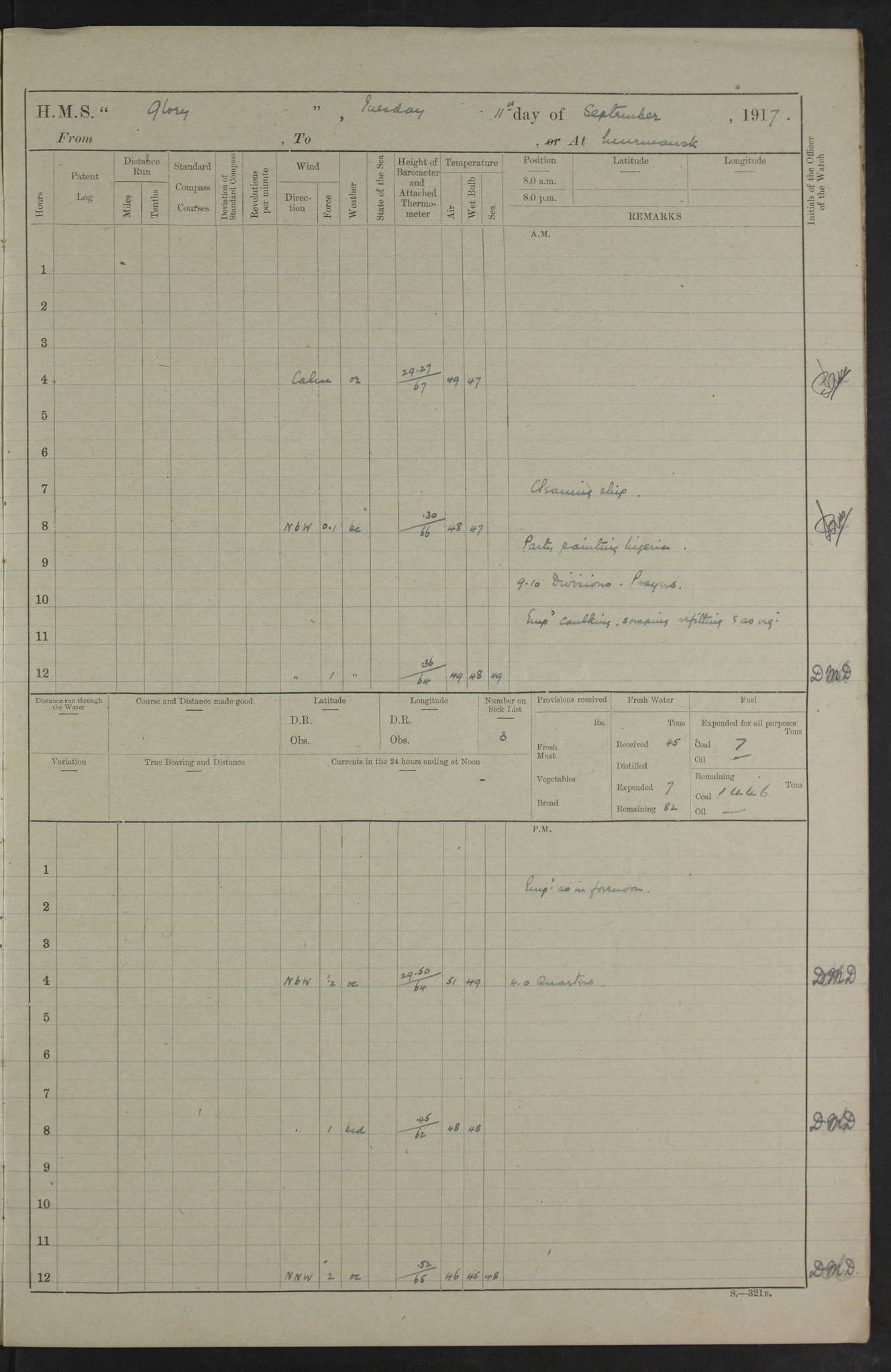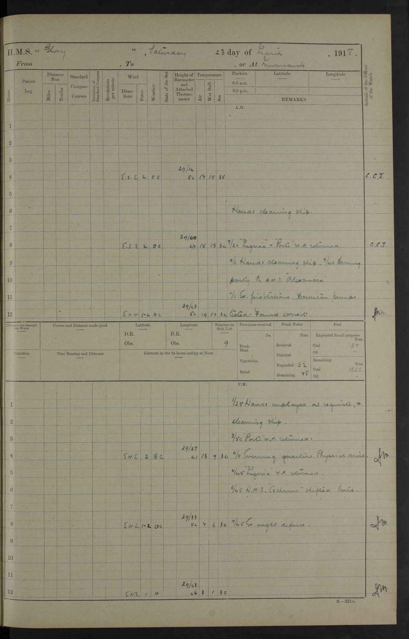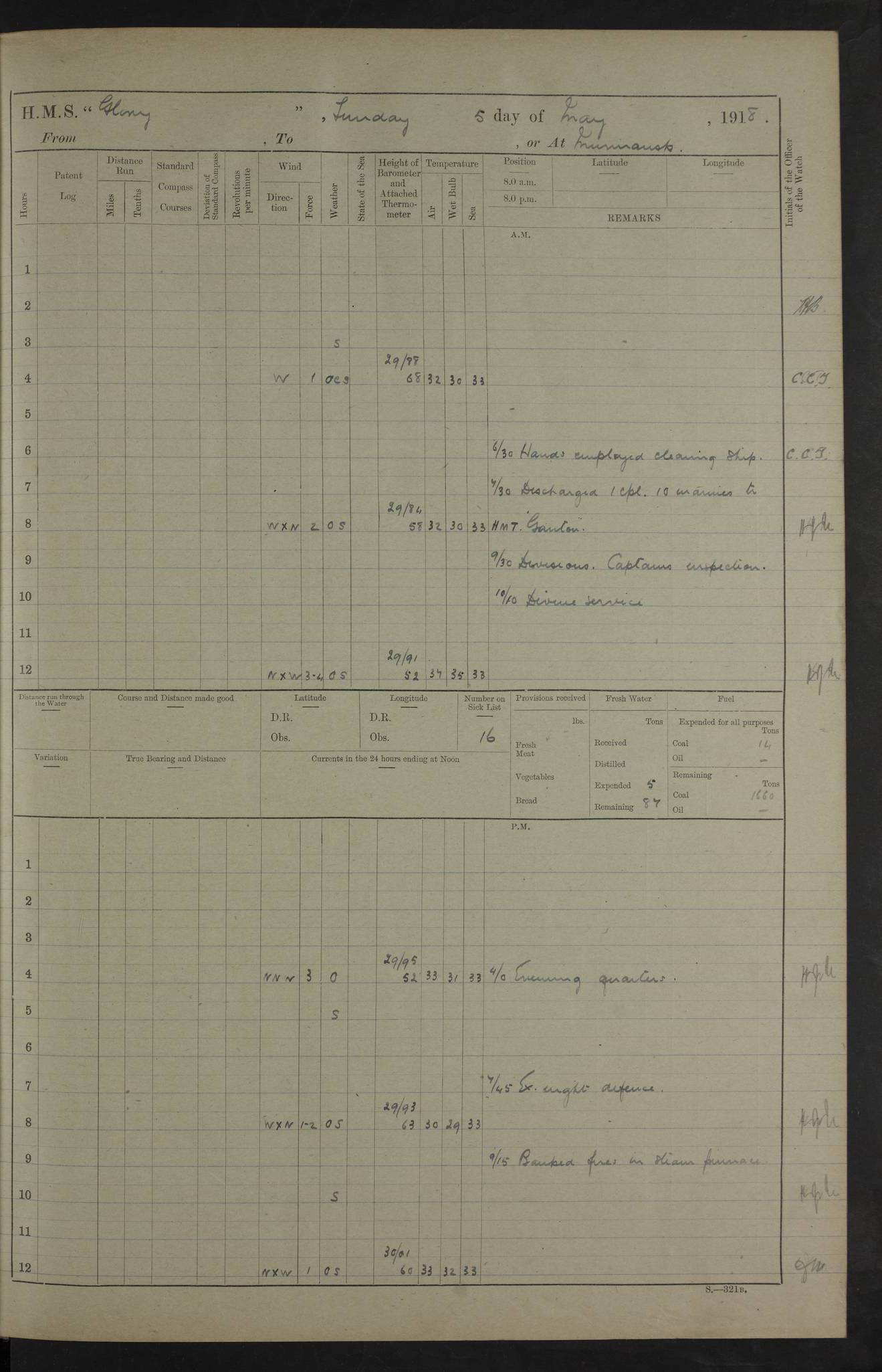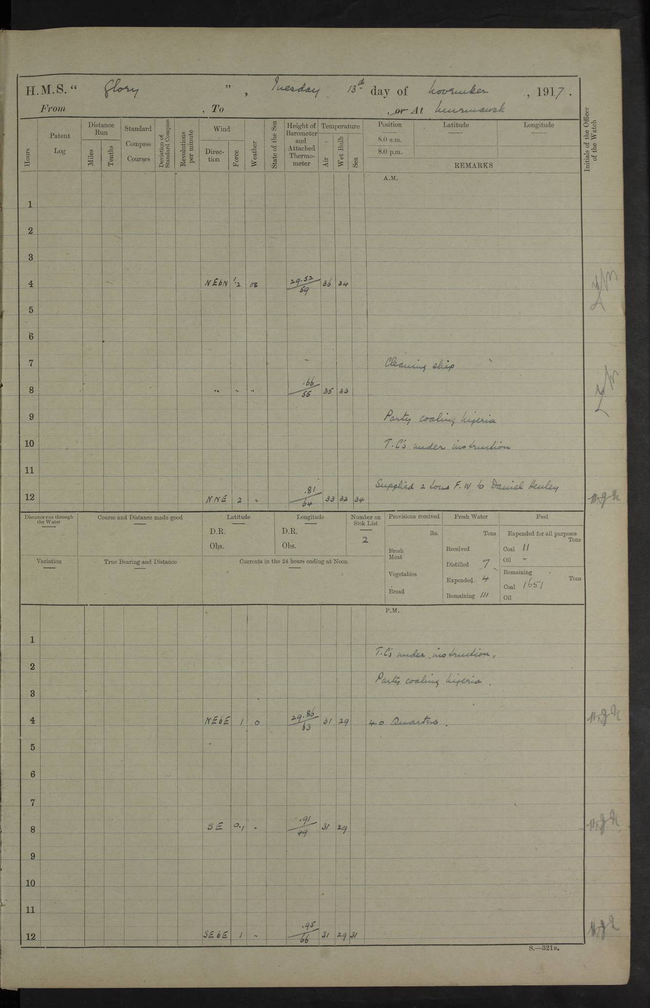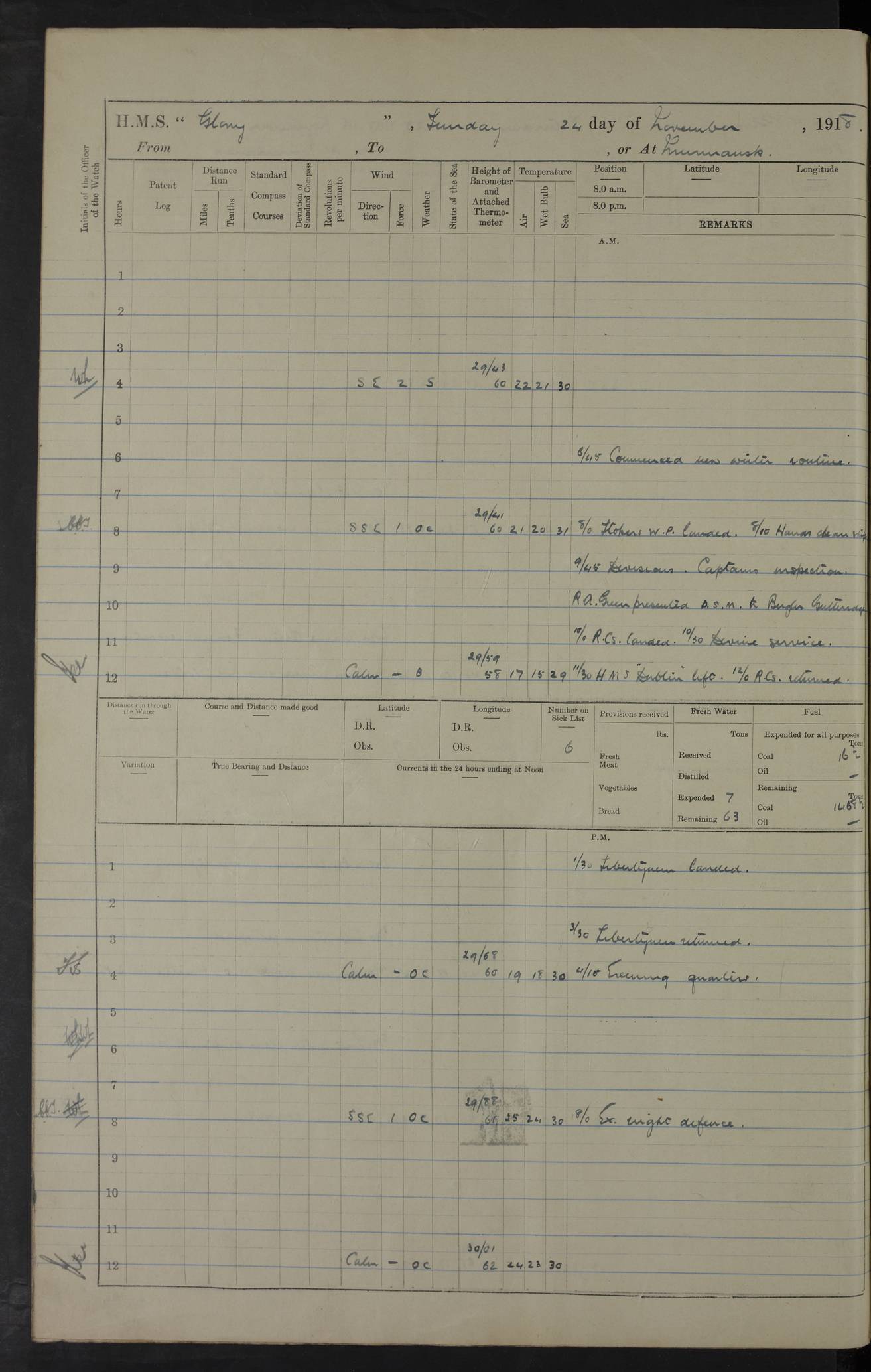 LOGS FOR OCTOBER 1916 For the period covered by the remainder of these logs (1 October, 1916 to 31 December 1918), HMS Glory was based at Murmansk, northern Russia. The city had a variety of names in the early 20th Century – including, Port Murman, Romanov and Murmansk. The location will be given in these pages as Murmansk, the modern name. A history of Murmansk’s names is available at http://en.wikipedia.org/wiki/Murmansk . 4f961482a2fc8e2def0011c7: (http://s3.amazonaws.com/oldweather/ADM53-43026/ADM 53-43026-001_0.jpg) This log is to be kept in a cover in future 4f961482a2fc8e2def0011c8: (http://s3.amazonaws.com/oldweather/ADM53-43026/ADM 53-43026-001_1.jpg) 4f961482a2fc8e2def0011c9: (http://s3.amazonaws.com/oldweather/ADM53-43026/ADM 53-43026-002_0.jpg) 4f961483a2fc8e2def0011ca: (http://s3.amazonaws.com/oldweather/ADM53-43026/ADM 53-43026-002_1.jpg) 4f961483a2fc8e2def0011cb: (http://s3.amazonaws.com/oldweather/ADM53-43026/ADM 53-43026-003_0.jpg) 4f961483a2fc8e2def0011cc: (http://s3.amazonaws.com/oldweather/ADM53-43026/ADM 53-43026-003_1.jpg) 1 October 1916 Murmansk Lat 69.03, Long 33.05 5.40am: Russian auxiliary Kolgiev sailed. Information regarding this vessel (or similar name) has not been found. 7.30am: Celebrated Holy Communion. am: Party working in Earl Essex. Earl Essex was a hired trawler of 225 grt, built, in 1914. Sourced from F.J. Dittmar & J.J. Colledge (1972) – British warships 1914–1919, Ian Allan. 10.45am: Held Divine Service. 11.30am: Celebrated Holy Communion. 4.45pm: Out nets. 4f961484a2fc8e2def0011cd: (http://s3.amazonaws.com/oldweather/ADM53-43026/ADM 53-43026-004_0.jpg) 2 October 1916 Murmansk Lat 69.03, Long 33.05 am: Party working in Earl Essex. 11.30am: Paid quarterly settlement. 6.15pm: Kolgiev arrived. 4f961484a2fc8e2def0011ce: (http://s3.amazonaws.com/oldweather/ADM53-43026/ADM 53-43026-004_1.jpg) 3 October 1916 Murmansk Lat 69.03, Long 33.05 Number on sick list: 9 9.20am: Aft port nets. 11.30am: Russian TBs Goorovoi and Plasteevyi(?) arrived. The first of these TBs is possibly ‘Grosovoi’, built at Le Havre around 1900. Her fate is unclear. The name of the second vessel is possibly incorrect, but no near match has been found. 1.30pm: Out port nets. 4f961484a2fc8e2def0011cf: (http://s3.amazonaws.com/oldweather/ADM53-43026/ADM 53-43026-005_0.jpg) 4 October 1916 Murmansk Lat 69.03, Long 33.05 8.30am: Salvator - broad pendant of Commodore T.W. Kemp arrived. Salvator (ex–Katoomba) was a hired yacht of 684 tons gross, built in 1903. She served as the Heliopolis in WW2. Details at WW1NavyBritishShips-Dittmar4AP.htm . 9.25am: Aft port nets. 11.05am: HE the Minister of Marine visited ship. 11.30am: Out port nets. 11.50am: Russian auxiliary Gotowsci(?) arrived. 12 noon: Kolgiev sailed. pm: HM Tug Blackcock arrived. Blackcock was a hired patrol tug, built in 1886 and wrecked on 18 January, 1918, in the White Sea. Sourced from F.J. Dittmar & J.J. Colledge (1972) – British warships 1914–1919, Ian Allan. 6.50pm: Kolgiev arrived. 4f961485a2fc8e2def0011d0: (http://s3.amazonaws.com/oldweather/ADM53-43026/ADM 53-43026-005_1.jpg) 5 October 1916 Murmansk Lat 69.03, Long 33.05 10.35am: Kolgiev sailed. 1.05pm: Salvator sailed. pm: Read Warrant No. 5. 4f961485a2fc8e2def0011d1: (http://s3.amazonaws.com/oldweather/ADM53-43026/ADM 53-43026-006_0.jpg) 6 October 1916 Murmansk Lat 69.03, Long 33.05 pm: 5 tons of water supplied to Blackcock. 3.30pm: Action. 3.45pm: Secure. Russian T.B's Grosovoi and Plasteevyi sailed. 4f961485a2fc8e2def0011d2: (http://s3.amazonaws.com/oldweather/ADM53-43026/ADM 53-43026-006_1.jpg) 7 October 1916 Murmansk Lat 69.03, Long 33.05 am: Party coaling trawler. am: Tested life buoys – correct. 4f961486a2fc8e2def0011d3: (http://s3.amazonaws.com/oldweather/ADM53-43026/ADM 53-43026-007_0.jpg) 8 October 1916 Murmansk Lat 69.03, Long 33.05 6.45am: Party working in collier. 7.30am: Celebrated Holy Communion. 10.45am: Held Divine service. 5.45pm: Held Divine Service. 4f961486a2fc8e2def0011d4: (http://s3.amazonaws.com/oldweather/ADM53-43026/ADM 53-43026-007_1.jpg) 9 October 1916 Murmansk Lat 69.03, Long 33.05 Number on sick list: 9 am: Exercised fire stations. am: 2nd pinnace patrolling. pm: Landed marines for drill. 4f961486a2fc8e2def0011d5: (http://s3.amazonaws.com/oldweather/ADM53-43026/ADM 53-43026-008_0.jpg) 10 October 1916 Murmansk Lat 69.03, Long 33.05 am: Steam pinnace patrolling. 1.55pm: Kolgiev arrived. 4f961487a2fc8e2def0011d6: (http://s3.amazonaws.com/oldweather/ADM53-43026/ADM 53-43026-008_1.jpg) 11 October 1916 Murmansk Lat 69.03, Long 33.05 am: Party working on boom defence. am: MT and QD men aired bedding. am: Marines at drill. 1.50pm: Kolgiev sailed. 3.15pm: British tug Racia (lighter ES 23 in tow) arrived. Racia was a hired screw tug of 410 grt, built in 1894 and sold on 23 June, 1920. Sourced from F.J. Dittmar & J.J. Colledge (1972) – British warships 1914–1919, Ian Allan. 4f961487a2fc8e2def0011d7: (http://s3.amazonaws.com/oldweather/ADM53-43026/ADM 53-43026-009_0.jpg) 12 October 1916 Murmansk Lat 69.03, Long 33.05 Number on sick list: 6 am: Party working on boom defence. am: Steam pinnace patrolling. pm: Make and mend clothes. 4.15pm: Read warrant No. 6. 6.00pm: Imperator Nicolas arrived. A vessel with this name has not been traced. 4f961487a2fc8e2def0011d8: (http://s3.amazonaws.com/oldweathe/ADM53-43026/ADM 53-43026-009_1.jpg) 13 October 1916 Murmansk Lat 69.03, Long 33.05 am: Steam pinnace patrolling. am: Party working on boom defence. am: Found foc’sle awning and side screens damaged by rats. 4f961488a2fc8e2def0011d9: (http://s3.amazonaws.com/oldweather/ADM53-43026/ADM 53-43026-010_0.jpg) 14 August 1916 (probably should read October) Murmansk Lat 69.03, Long 33.05 Number on sick list: 7 6.45am: Racia (floating crane in tow) sailed. am: Party working on boom defence. am: Tested life buoys – correct. 3.00pm: Vindictive arrived. HMS Vindictive was a protected cruiser of the Arrogant class, launched in 1897 at Chatham Dockyar