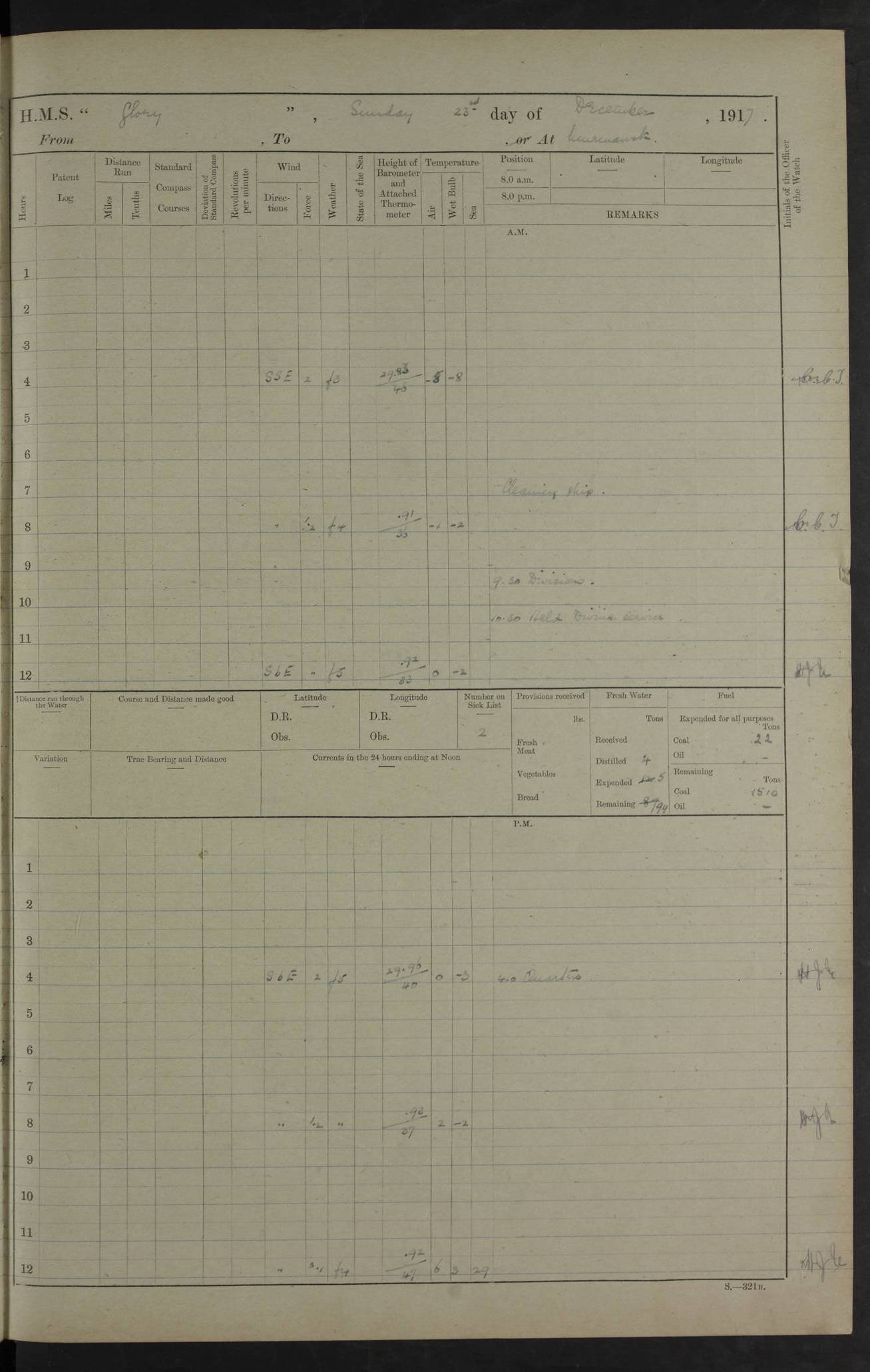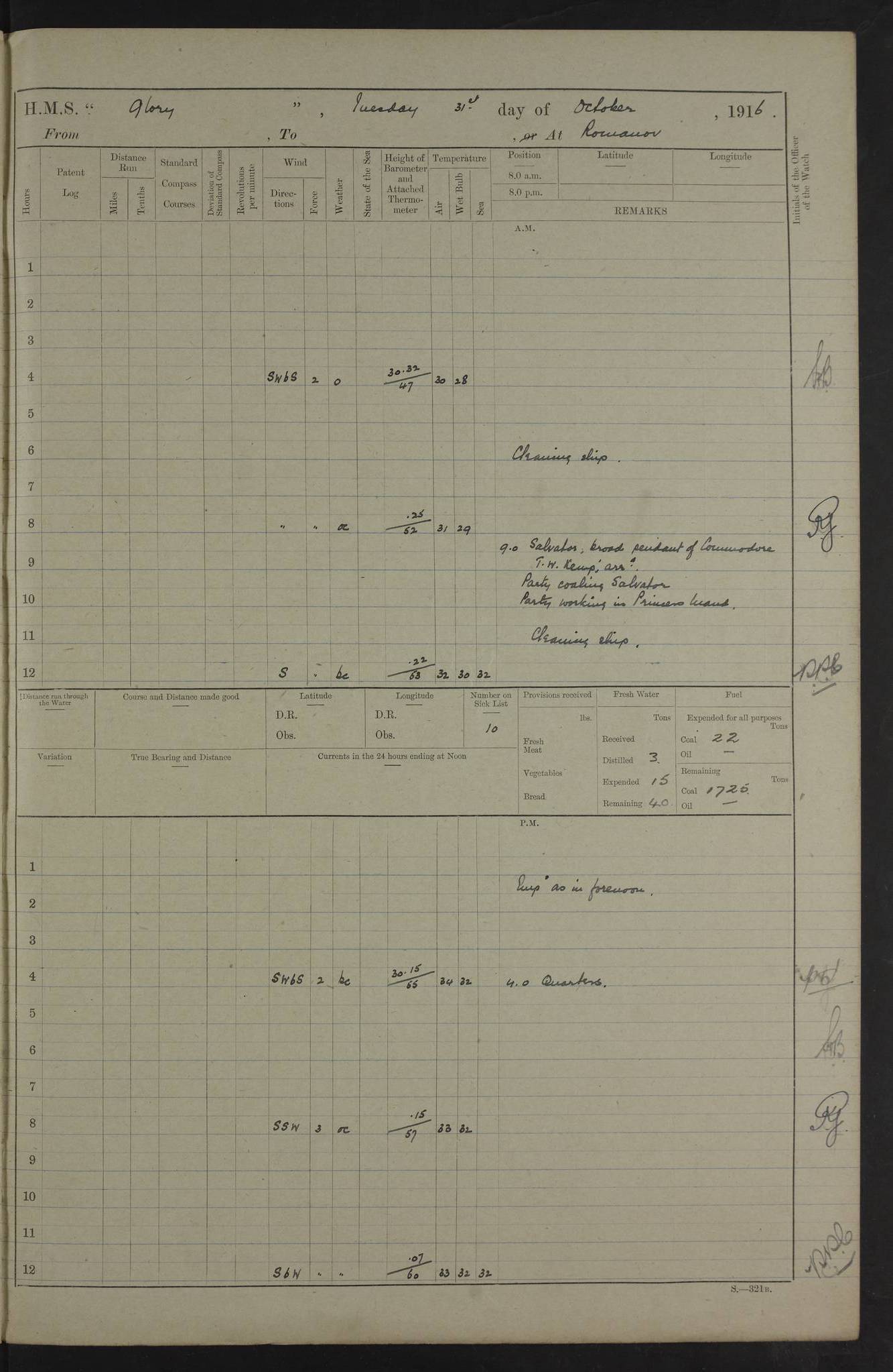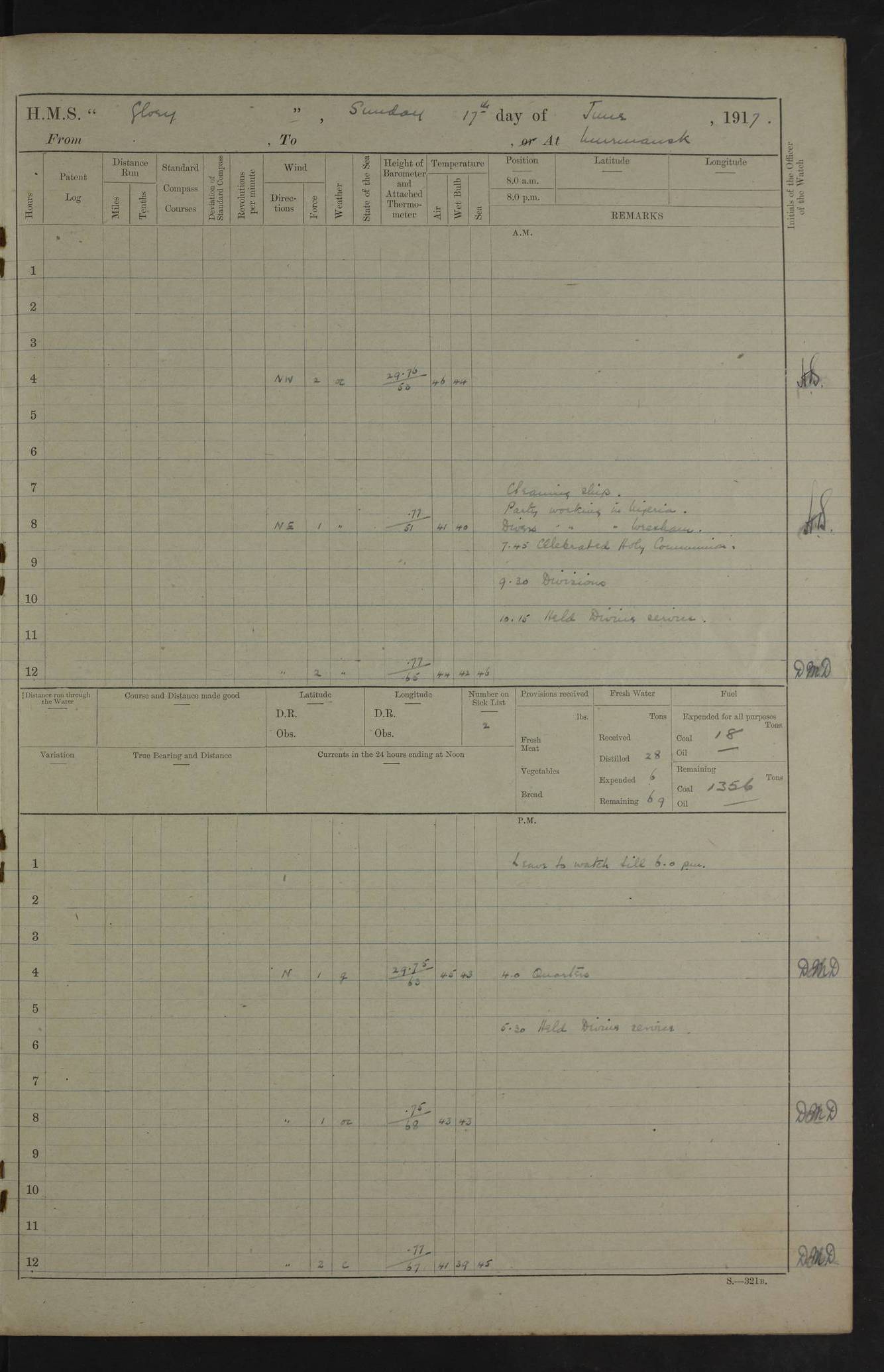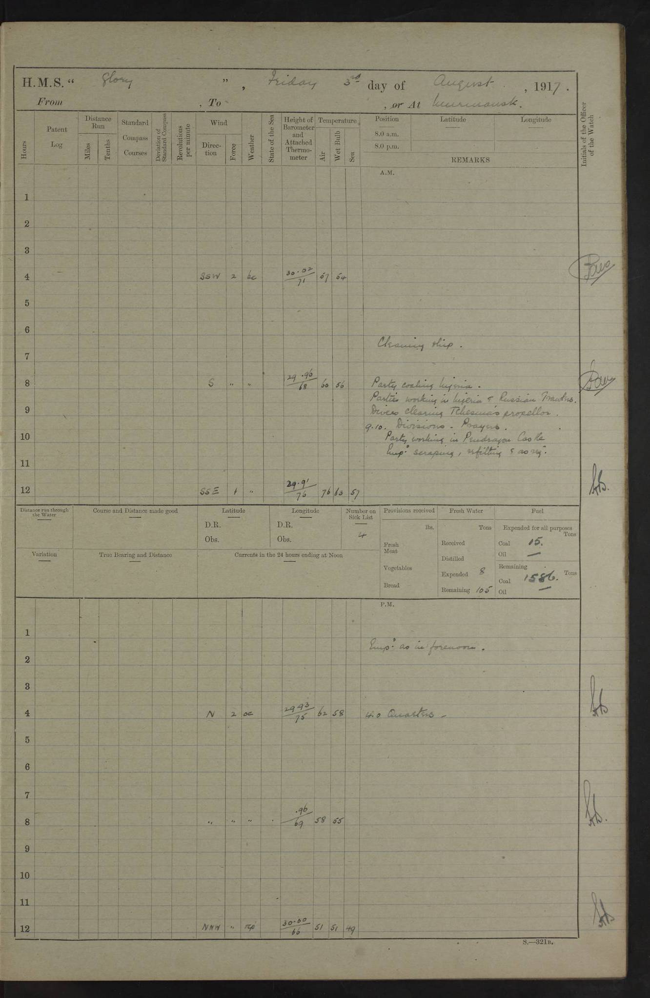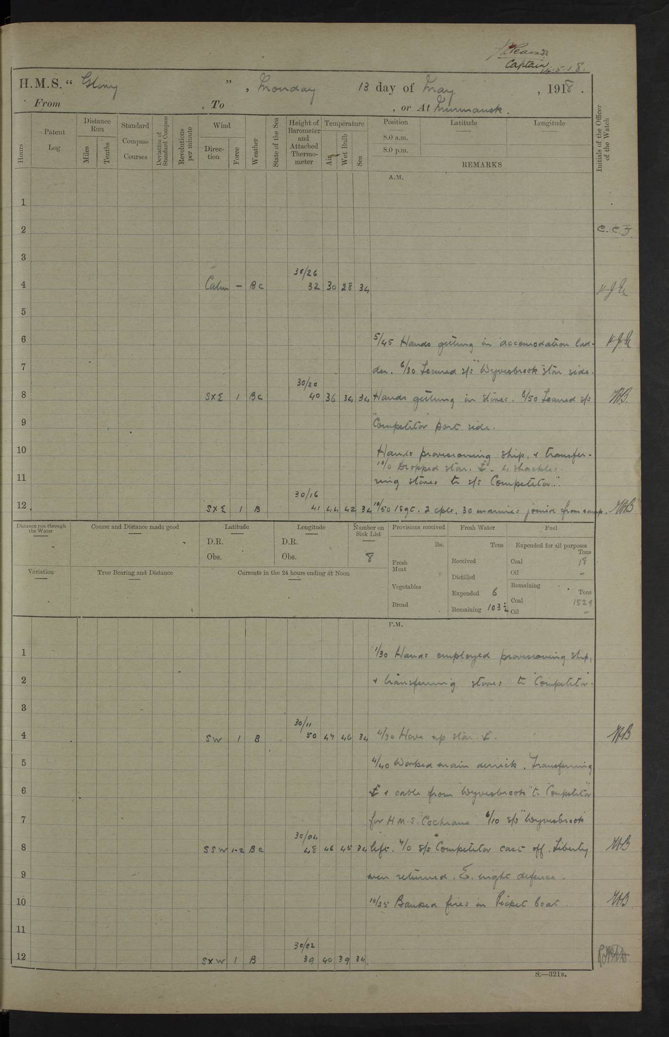 LOGS FOR OCTOBER 1916 For the period covered by the remainder of these logs (1 October, 1916 to 31 December 1918), HMS Glory was based at Murmansk, northern Russia. The city had a variety of names in the early 20th Century – including, Port Murman, Romanov and Murmansk. The location will be given in these pages as Murmansk, the modern name. A history of Murmansk’s names is available at http://en.wikipedia.org/wiki/Murmansk . 4f961482a2fc8e2def0011c7: (http://s3.amazonaws.com/oldweather/ADM53-43026/ADM 53-43026-001_0.jpg) This log is to be kept in a cover in future 4f961482a2fc8e2def0011c8: (http://s3.amazonaws.com/oldweather/ADM53-43026/ADM 53-43026-001_1.jpg) 4f961482a2fc8e2def0011c9: (http://s3.amazonaws.com/oldweather/ADM53-43026/ADM 53-43026-002_0.jpg) 4f961483a2fc8e2def0011ca: (http://s3.amazonaws.com/oldweather/ADM53-43026/ADM 53-43026-002_1.jpg) 4f961483a2fc8e2def0011cb: (http://s3.amazonaws.com/oldweather/ADM53-43026/ADM 53-43026-003_0.jpg) 4f961483a2fc8e2def0011cc: (http://s3.amazonaws.com/oldweather/ADM53-43026/ADM 53-43026-003_1.jpg) 1 October 1916 Murmansk Lat 69.03, Long 33.05 5.40am: Russian auxiliary Kolgiev sailed. Information regarding this vessel (or similar name) has not been found. 7.30am: Celebrated Holy Communion. am: Party working in Earl Essex. Earl Essex was a hired trawler of 225 grt, built, in 1914. Sourced from F.J. Dittmar & J.J. Colledge (1972) – British warships 1914–1919, Ian Allan. 10.45am: Held Divine Service. 11.30am: Celebrated Holy Communion. 4.45pm: Out nets. 4f961484a2fc8e2def0011cd: (http://s3.amazonaws.com/oldweather/ADM53-43026/ADM 53-43026-004_0.jpg) 2 October 1916 Murmansk Lat 69.03, Long 33.05 am: Party working in Earl Essex. 11.30am: Paid quarterly settlement. 6.15pm: Kolgiev arrived. 4f961484a2fc8e2def0011ce: (http://s3.amazonaws.com/oldweather/ADM53-43026/ADM 53-43026-004_1.jpg) 3 October 1916 Murmansk Lat 69.03, Long 33.05 Number on sick list: 9 9.20am: Aft port nets. 11.30am: Russian TBs Goorovoi and Plasteevyi(?) arrived. The first of these TBs is possibly ‘Grosovoi’, built at Le Havre around 1900. Her fate is unclear. The name of the second vessel is possibly incorrect, but no near match has been found. 1.30pm: Out port nets. 4f961484a2fc8e2def0011cf: (http://s3.amazonaws.com/oldweather/ADM53-43026/ADM 53-43026-005_0.jpg) 4 October 1916 Murmansk Lat 69.03, Long 33.05 8.30am: Salvator - broad pendant of Commodore T.W. Kemp arrived. Salvator (ex–Katoomba) was a hired yacht of 684 tons gross, built in 1903. She served as the Heliopolis in WW2. Details at WW1NavyBritishShips-Dittmar4AP.htm . 9.25am: Aft port nets. 11.05am: HE the Minister of Marine visited ship. 11.30am: Out port nets. 11.50am: Russian auxiliary Gotowsci(?) arrived. 12 noon: Kolgiev sailed. pm: HM Tug Blackcock arrived. Blackcock was a hired patrol tug, built in 1886 and wrecked on 18 January, 1918, in the White Sea. Sourced from F.J. Dittmar & J.J. Colledge (1972) – British warships 1914–1919, Ian Allan. 6.50pm: Kolgiev arrived. 4f961485a2fc8e2def0011d0: (http://s3.amazonaws.com/oldweather/ADM53-43026/ADM 53-43026-005_1.jpg) 5 October 1916 Murmansk Lat 69.03, Long 33.05 10.35am: Kolgiev sailed. 1.05pm: Salvator sailed. pm: Read Warrant No. 5. 4f961485a2fc8e2def0011d1: (http://s3.amazonaws.com/oldweather/ADM53-43026/ADM 53-43026-006_0.jpg) 6 October 1916 Murmansk Lat 69.03, Long 33.05 pm: 5 tons of water supplied to Blackcock. 3.30pm: Action. 3.45pm: Secure. Russian T.B's Grosovoi and Plasteevyi sailed. 4f961485a2fc8e2def0011d2: (http://s3.amazonaws.com/oldweather/ADM53-43026/ADM 53-43026-006_1.jpg) 7 October 1916 Murmansk Lat 69.03, Long 33.05 am: Party coaling trawler. am: Tested life buoys – correct. 4f961486a2fc8e2def0011d3: (http://s3.amazonaws.com/oldweather/ADM53-43026/ADM 53-43026-007_0.jpg) 8 October 1916 Murmansk Lat 69.03, Long 33.05 6.45am: Party working in collier. 7.30am: Celebrated Holy Communion. 10.45am: Held Divine service. 5.45pm: Held Divine Service. 4f961486a2fc8e2def0011d4: (http://s3.amazonaws.com/oldweather/ADM53-43026/ADM 53-43026-007_1.jpg) 9 October 1916 Murmansk Lat 69.03, Long 33.05 Number on sick list: 9 am: Exercised fire stations. am: 2nd pinnace patrolling. pm: Landed marines for drill. 4f961486a2fc8e2def0011d5: (http://s3.amazonaws.com/oldweather/ADM53-43026/ADM 53-43026-008_0.jpg) 10 October 1916 Murmansk Lat 69.03, Long 33.05 am: Steam pinnace patrolling. 1.55pm: Kolgiev arrived. 4f961487a2fc8e2def0011d6: (http://s3.amazonaws.com/oldweather/ADM53-43026/ADM 53-43026-008_1.jpg) 11 October 1916 Murmansk Lat 69.03, Long 33.05 am: Party working on boom defence. am: MT and QD men aired bedding. am: Marines at drill. 1.50pm: Kolgiev sailed. 3.15pm: British tug Racia (lighter ES 23 in tow) arrived. Racia was a hired screw tug of 410 grt, built in 1894 and sold on 23 June, 1920. Sourced from F.J. Dittmar & J.J. Colledge (1972) – British warships 1914–1919, Ian Allan. 4f961487a2fc8e2def0011d7: (http://s3.amazonaws.com/oldweather/ADM53-43026/ADM 53-43026-009_0.jpg) 12 October 1916 Murmansk Lat 69.03, Long 33.05 Number on sick list: 6 am: Party working on boom defence. am: Steam pinnace patrolling. pm: Make and mend clothes. 4.15pm: Read warrant No. 6. 6.00pm: Imperator Nicolas arrived. A vessel with this name has not been traced. 4f961487a2fc8e2def0011d8: (http://s3.amazonaws.com/oldweathe/ADM53-43026/ADM 53-43026-009_1.jpg) 13 October 1916 Murmansk Lat 69.03, Long 33.05 am: Steam pinnace patrolling. am: Party working on boom defence. am: Found foc’sle awning and side screens damaged by rats. 4f961488a2fc8e2def0011d9: (http://s3.amazonaws.com/oldweather/ADM53-43026/ADM 53-43026-010_0.jpg) 14 August 1916 (probably should read October) Murmansk Lat 69.03, Long 33.05 Number on sick list: 7 6.45am: Racia (floating crane in tow) sailed. am: Party working on boom defence. am: Tested life buoys – correct. 3.00pm: Vindictive arrived. HMS Vindictive was a protected cruiser of the Arrogant class, launched in 1897 at Chatham Dockyar