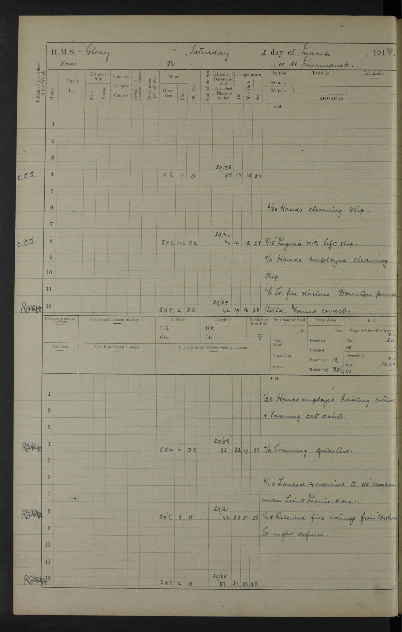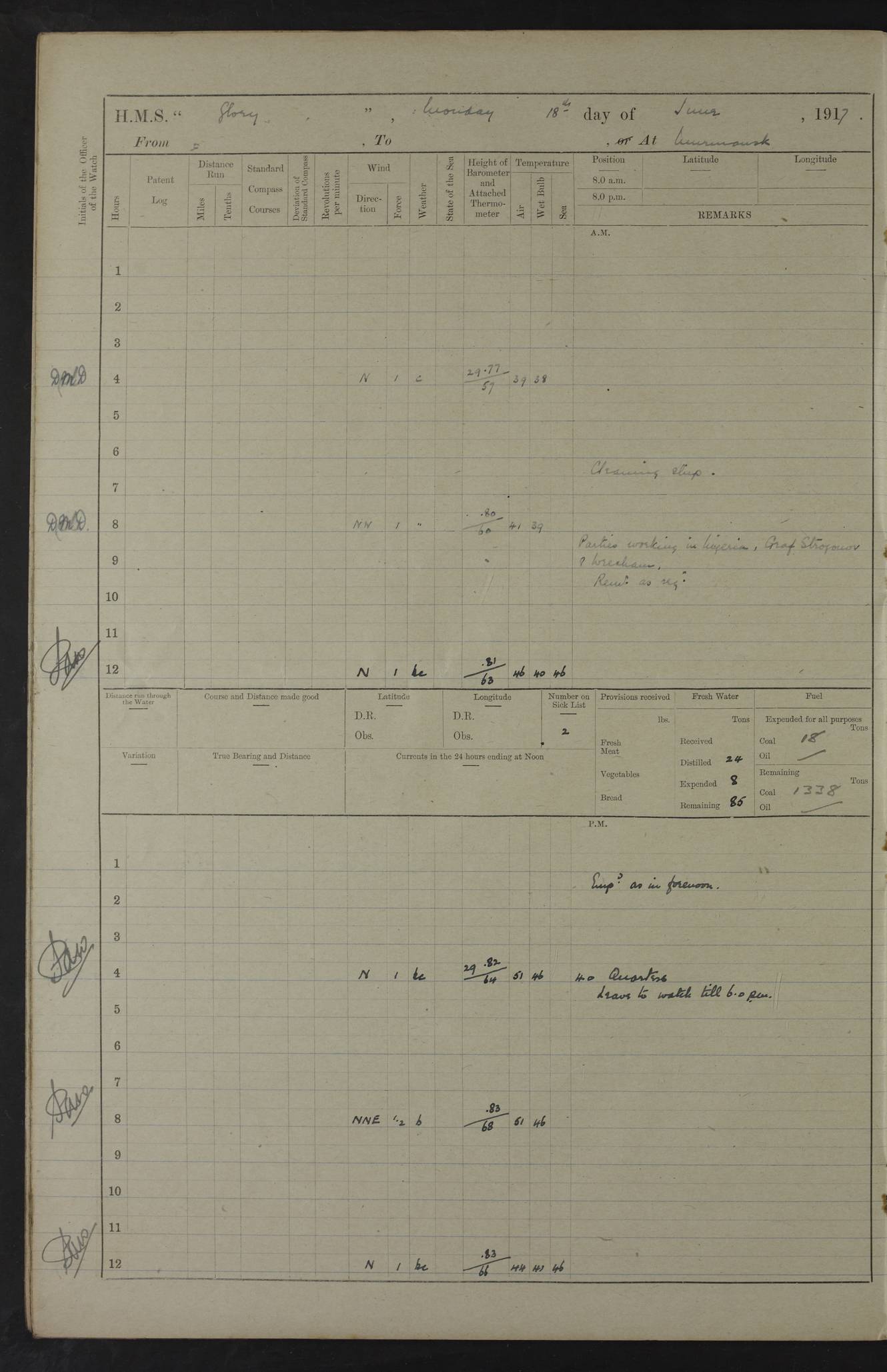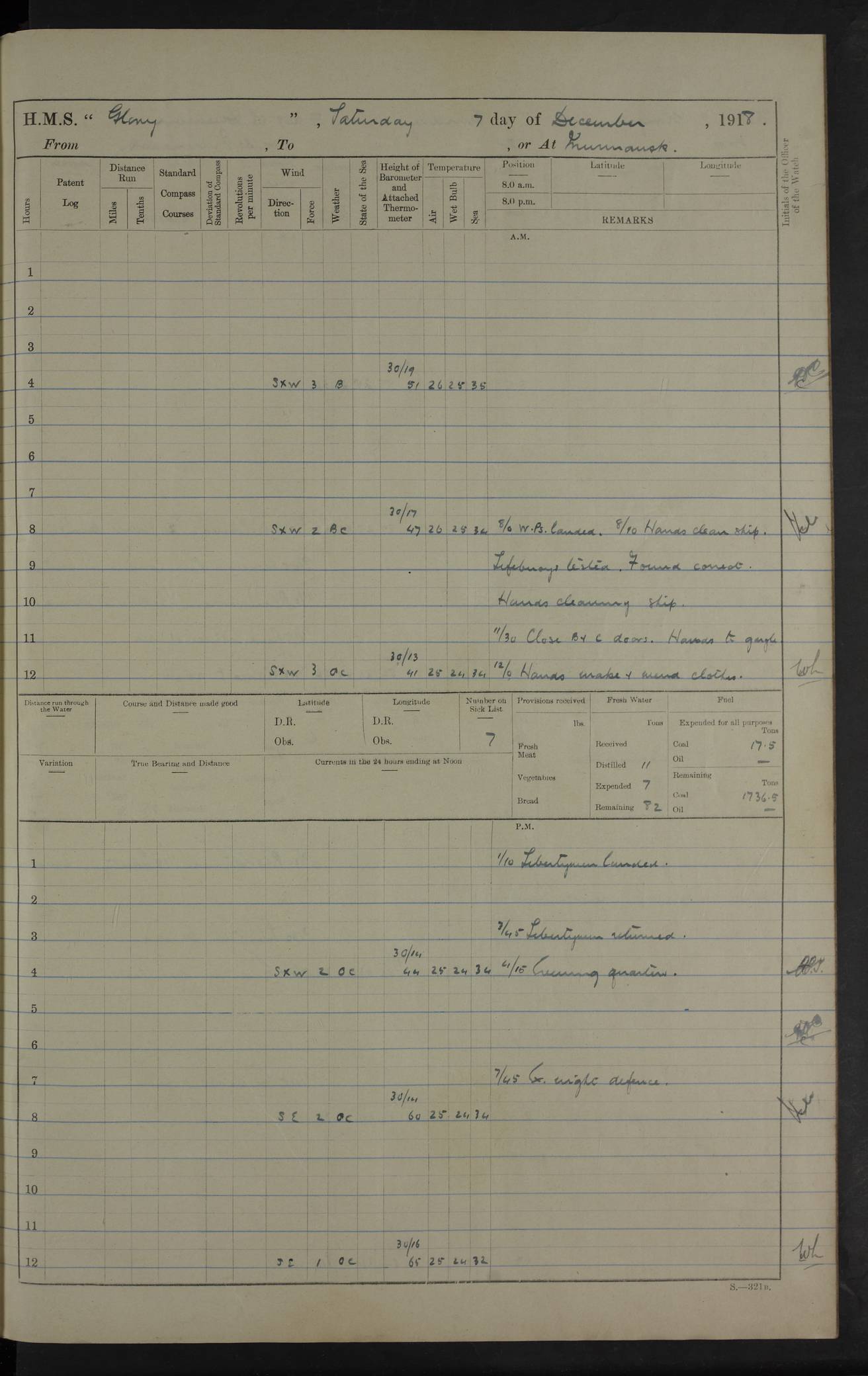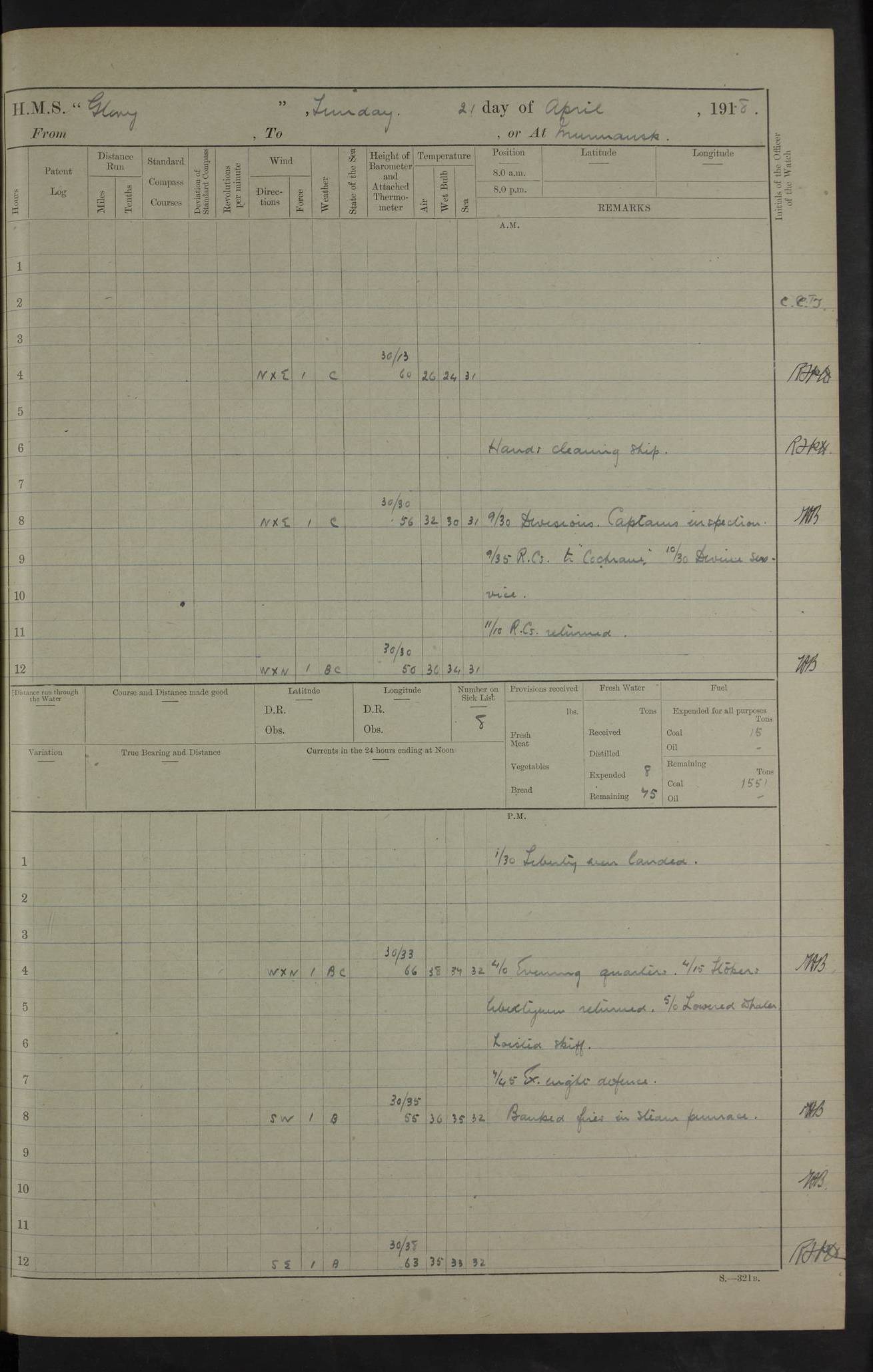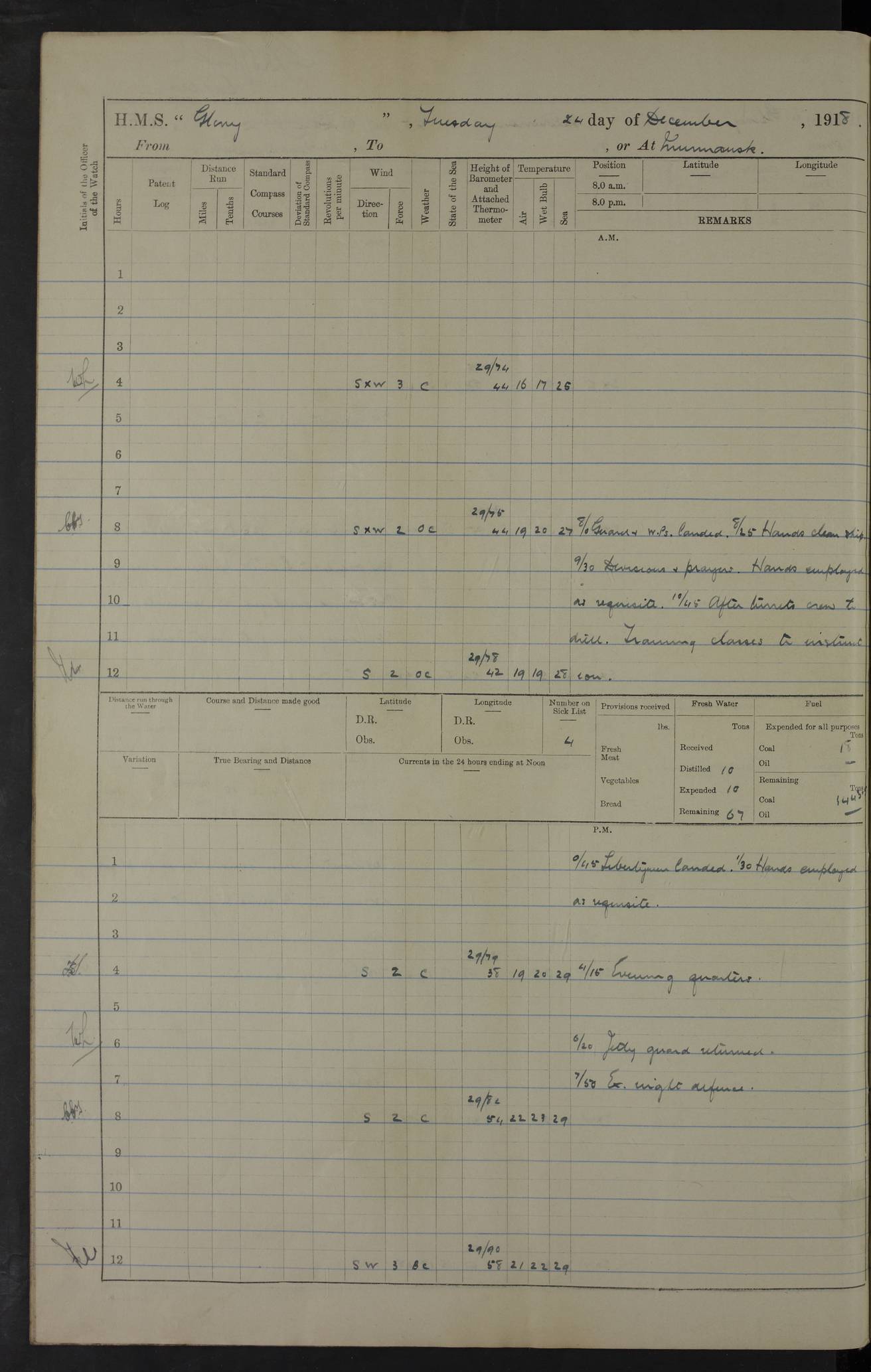 LOGS FOR OCTOBER 1916 For the period covered by the remainder of these logs (1 October, 1916 to 31 December 1918), HMS Glory was based at Murmansk, northern Russia. The city had a variety of names in the early 20th Century – including, Port Murman, Romanov and Murmansk. The location will be given in these pages as Murmansk, the modern name. A history of Murmansk’s names is available at http://en.wikipedia.org/wiki/Murmansk . 4f961482a2fc8e2def0011c7: (http://s3.amazonaws.com/oldweather/ADM53-43026/ADM 53-43026-001_0.jpg) This log is to be kept in a cover in future 4f961482a2fc8e2def0011c8: (http://s3.amazonaws.com/oldweather/ADM53-43026/ADM 53-43026-001_1.jpg) 4f961482a2fc8e2def0011c9: (http://s3.amazonaws.com/oldweather/ADM53-43026/ADM 53-43026-002_0.jpg) 4f961483a2fc8e2def0011ca: (http://s3.amazonaws.com/oldweather/ADM53-43026/ADM 53-43026-002_1.jpg) 4f961483a2fc8e2def0011cb: (http://s3.amazonaws.com/oldweather/ADM53-43026/ADM 53-43026-003_0.jpg) 4f961483a2fc8e2def0011cc: (http://s3.amazonaws.com/oldweather/ADM53-43026/ADM 53-43026-003_1.jpg) 1 October 1916 Murmansk Lat 69.03, Long 33.05 5.40am: Russian auxiliary Kolgiev sailed. Information regarding this vessel (or similar name) has not been found. 7.30am: Celebrated Holy Communion. am: Party working in Earl Essex. Earl Essex was a hired trawler of 225 grt, built, in 1914. Sourced from F.J. Dittmar & J.J. Colledge (1972) – British warships 1914–1919, Ian Allan. 10.45am: Held Divine Service. 11.30am: Celebrated Holy Communion. 4.45pm: Out nets. 4f961484a2fc8e2def0011cd: (http://s3.amazonaws.com/oldweather/ADM53-43026/ADM 53-43026-004_0.jpg) 2 October 1916 Murmansk Lat 69.03, Long 33.05 am: Party working in Earl Essex. 11.30am: Paid quarterly settlement. 6.15pm: Kolgiev arrived. 4f961484a2fc8e2def0011ce: (http://s3.amazonaws.com/oldweather/ADM53-43026/ADM 53-43026-004_1.jpg) 3 October 1916 Murmansk Lat 69.03, Long 33.05 Number on sick list: 9 9.20am: Aft port nets. 11.30am: Russian TBs Goorovoi and Plasteevyi(?) arrived. The first of these TBs is possibly ‘Grosovoi’, built at Le Havre around 1900. Her fate is unclear. The name of the second vessel is possibly incorrect, but no near match has been found. 1.30pm: Out port nets. 4f961484a2fc8e2def0011cf: (http://s3.amazonaws.com/oldweather/ADM53-43026/ADM 53-43026-005_0.jpg) 4 October 1916 Murmansk Lat 69.03, Long 33.05 8.30am: Salvator - broad pendant of Commodore T.W. Kemp arrived. Salvator (ex–Katoomba) was a hired yacht of 684 tons gross, built in 1903. She served as the Heliopolis in WW2. Details at WW1NavyBritishShips-Dittmar4AP.htm . 9.25am: Aft port nets. 11.05am: HE the Minister of Marine visited ship. 11.30am: Out port nets. 11.50am: Russian auxiliary Gotowsci(?) arrived. 12 noon: Kolgiev sailed. pm: HM Tug Blackcock arrived. Blackcock was a hired patrol tug, built in 1886 and wrecked on 18 January, 1918, in the White Sea. Sourced from F.J. Dittmar & J.J. Colledge (1972) – British warships 1914–1919, Ian Allan. 6.50pm: Kolgiev arrived. 4f961485a2fc8e2def0011d0: (http://s3.amazonaws.com/oldweather/ADM53-43026/ADM 53-43026-005_1.jpg) 5 October 1916 Murmansk Lat 69.03, Long 33.05 10.35am: Kolgiev sailed. 1.05pm: Salvator sailed. pm: Read Warrant No. 5. 4f961485a2fc8e2def0011d1: (http://s3.amazonaws.com/oldweather/ADM53-43026/ADM 53-43026-006_0.jpg) 6 October 1916 Murmansk Lat 69.03, Long 33.05 pm: 5 tons of water supplied to Blackcock. 3.30pm: Action. 3.45pm: Secure. Russian T.B's Grosovoi and Plasteevyi sailed. 4f961485a2fc8e2def0011d2: (http://s3.amazonaws.com/oldweather/ADM53-43026/ADM 53-43026-006_1.jpg) 7 October 1916 Murmansk Lat 69.03, Long 33.05 am: Party coaling trawler. am: Tested life buoys – correct. 4f961486a2fc8e2def0011d3: (http://s3.amazonaws.com/oldweather/ADM53-43026/ADM 53-43026-007_0.jpg) 8 October 1916 Murmansk Lat 69.03, Long 33.05 6.45am: Party working in collier. 7.30am: Celebrated Holy Communion. 10.45am: Held Divine service. 5.45pm: Held Divine Service. 4f961486a2fc8e2def0011d4: (http://s3.amazonaws.com/oldweather/ADM53-43026/ADM 53-43026-007_1.jpg) 9 October 1916 Murmansk Lat 69.03, Long 33.05 Number on sick list: 9 am: Exercised fire stations. am: 2nd pinnace patrolling. pm: Landed marines for drill. 4f961486a2fc8e2def0011d5: (http://s3.amazonaws.com/oldweather/ADM53-43026/ADM 53-43026-008_0.jpg) 10 October 1916 Murmansk Lat 69.03, Long 33.05 am: Steam pinnace patrolling. 1.55pm: Kolgiev arrived. 4f961487a2fc8e2def0011d6: (http://s3.amazonaws.com/oldweather/ADM53-43026/ADM 53-43026-008_1.jpg) 11 October 1916 Murmansk Lat 69.03, Long 33.05 am: Party working on boom defence. am: MT and QD men aired bedding. am: Marines at drill. 1.50pm: Kolgiev sailed. 3.15pm: British tug Racia (lighter ES 23 in tow) arrived. Racia was a hired screw tug of 410 grt, built in 1894 and sold on 23 June, 1920. Sourced from F.J. Dittmar & J.J. Colledge (1972) – British warships 1914–1919, Ian Allan. 4f961487a2fc8e2def0011d7: (http://s3.amazonaws.com/oldweather/ADM53-43026/ADM 53-43026-009_0.jpg) 12 October 1916 Murmansk Lat 69.03, Long 33.05 Number on sick list: 6 am: Party working on boom defence. am: Steam pinnace patrolling. pm: Make and mend clothes. 4.15pm: Read warrant No. 6. 6.00pm: Imperator Nicolas arrived. A vessel with this name has not been traced. 4f961487a2fc8e2def0011d8: (http://s3.amazonaws.com/oldweathe/ADM53-43026/ADM 53-43026-009_1.jpg) 13 October 1916 Murmansk Lat 69.03, Long 33.05 am: Steam pinnace patrolling. am: Party working on boom defence. am: Found foc’sle awning and side screens damaged by rats. 4f961488a2fc8e2def0011d9: (http://s3.amazonaws.com/oldweather/ADM53-43026/ADM 53-43026-010_0.jpg) 14 August 1916 (probably should read October) Murmansk Lat 69.03, Long 33.05 Number on sick list: 7 6.45am: Racia (floating crane in tow) sailed. am: Party working on boom defence. am: Tested life buoys – correct. 3.00pm: Vindictive arrived. HMS Vindictive was a protected cruiser of the Arrogant class, launched in 1897 at Chatham Dockyar