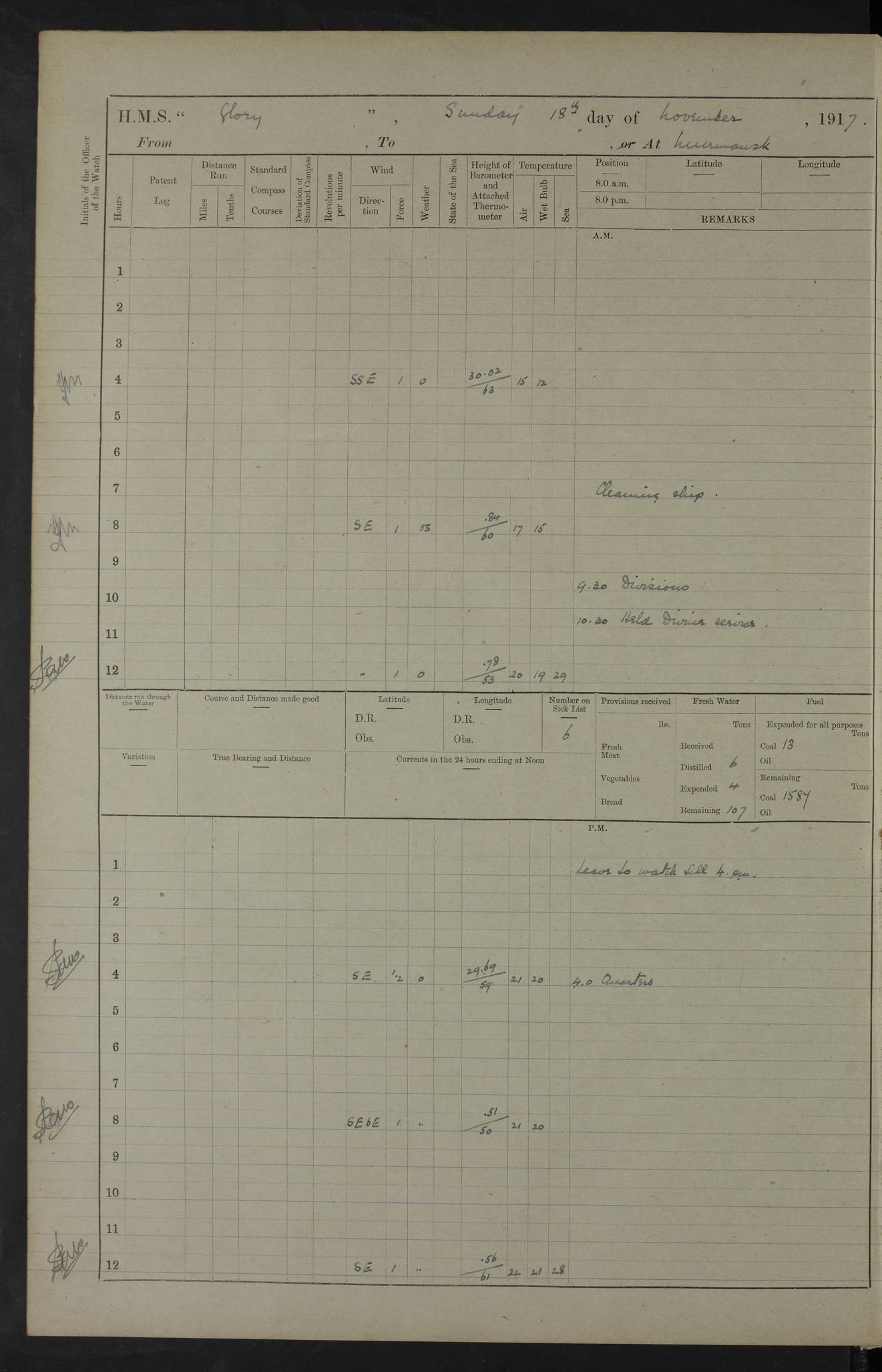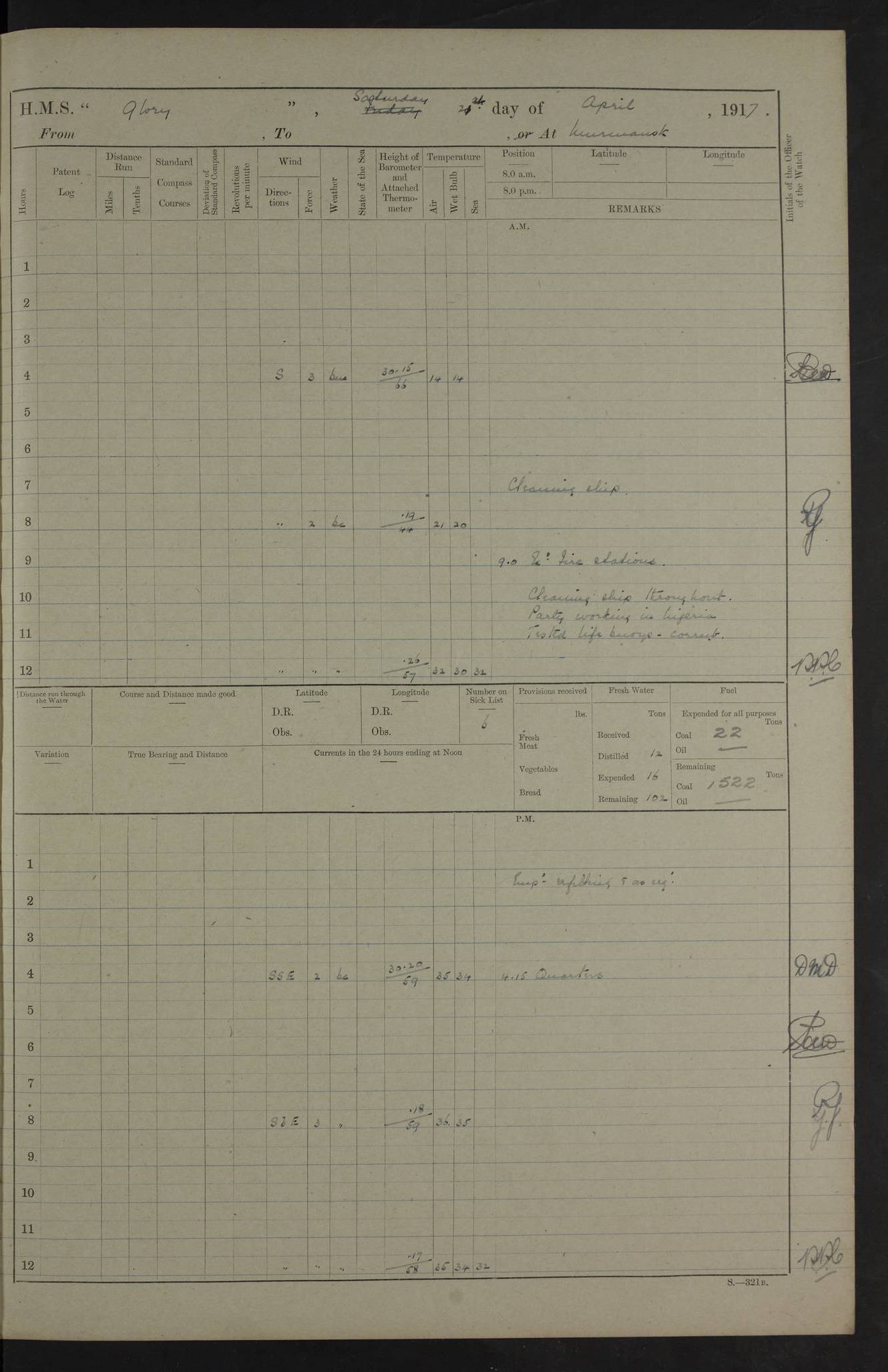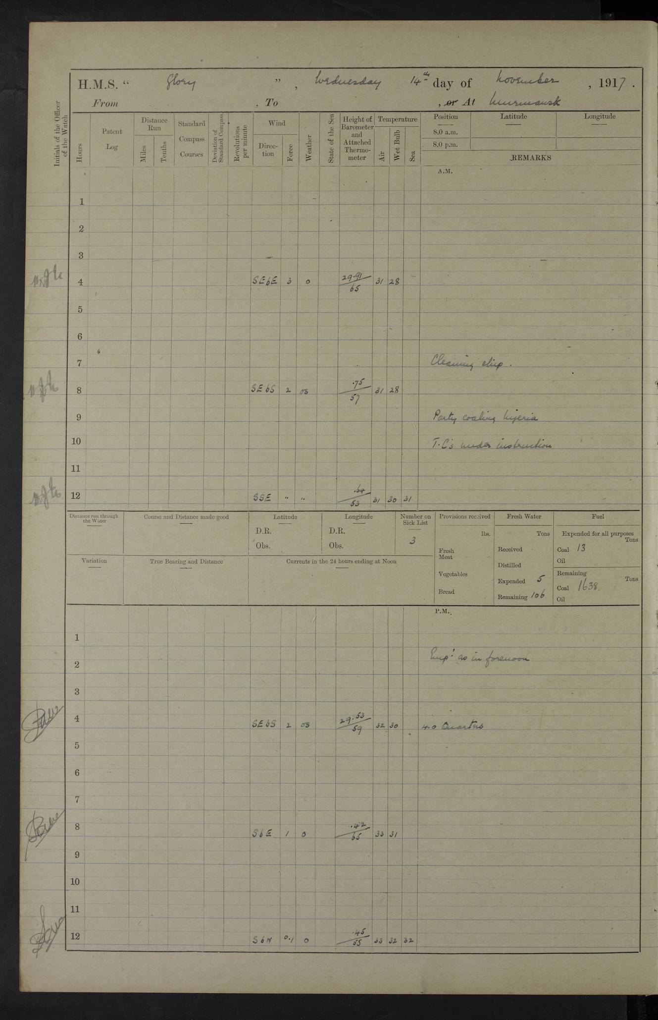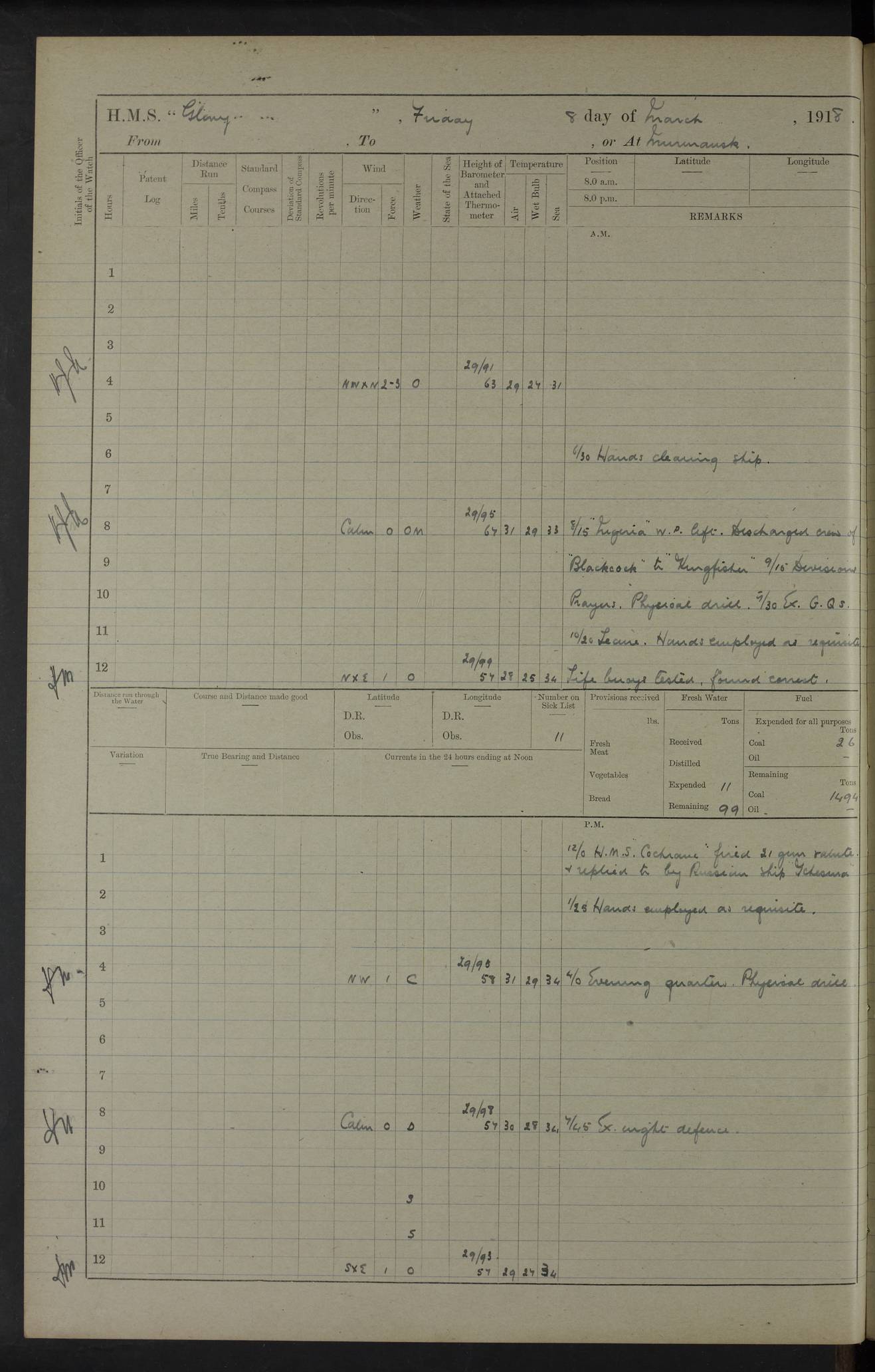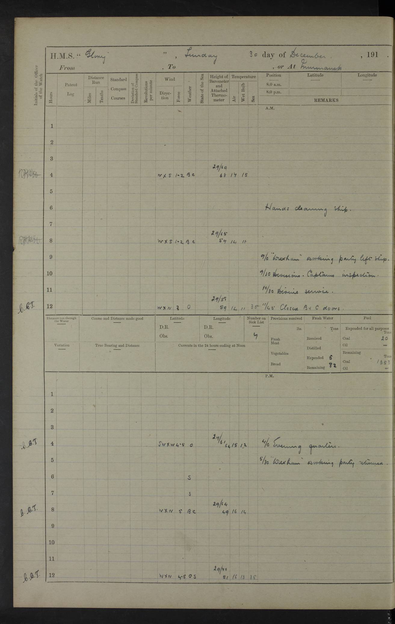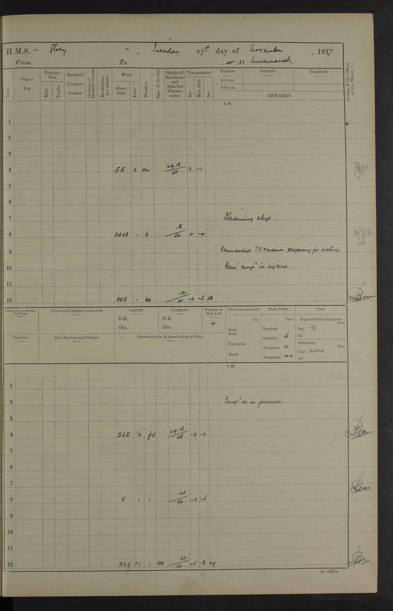 LOGS FOR OCTOBER 1916 For the period covered by the remainder of these logs (1 October, 1916 to 31 December 1918), HMS Glory was based at Murmansk, northern Russia. The city had a variety of names in the early 20th Century – including, Port Murman, Romanov and Murmansk. The location will be given in these pages as Murmansk, the modern name. A history of Murmansk’s names is available at http://en.wikipedia.org/wiki/Murmansk . 4f961482a2fc8e2def0011c7: (http://s3.amazonaws.com/oldweather/ADM53-43026/ADM 53-43026-001_0.jpg) This log is to be kept in a cover in future 4f961482a2fc8e2def0011c8: (http://s3.amazonaws.com/oldweather/ADM53-43026/ADM 53-43026-001_1.jpg) 4f961482a2fc8e2def0011c9: (http://s3.amazonaws.com/oldweather/ADM53-43026/ADM 53-43026-002_0.jpg) 4f961483a2fc8e2def0011ca: (http://s3.amazonaws.com/oldweather/ADM53-43026/ADM 53-43026-002_1.jpg) 4f961483a2fc8e2def0011cb: (http://s3.amazonaws.com/oldweather/ADM53-43026/ADM 53-43026-003_0.jpg) 4f961483a2fc8e2def0011cc: (http://s3.amazonaws.com/oldweather/ADM53-43026/ADM 53-43026-003_1.jpg) 1 October 1916 Murmansk Lat 69.03, Long 33.05 5.40am: Russian auxiliary Kolgiev sailed. Information regarding this vessel (or similar name) has not been found. 7.30am: Celebrated Holy Communion. am: Party working in Earl Essex. Earl Essex was a hired trawler of 225 grt, built, in 1914. Sourced from F.J. Dittmar & J.J. Colledge (1972) – British warships 1914–1919, Ian Allan. 10.45am: Held Divine Service. 11.30am: Celebrated Holy Communion. 4.45pm: Out nets. 4f961484a2fc8e2def0011cd: (http://s3.amazonaws.com/oldweather/ADM53-43026/ADM 53-43026-004_0.jpg) 2 October 1916 Murmansk Lat 69.03, Long 33.05 am: Party working in Earl Essex. 11.30am: Paid quarterly settlement. 6.15pm: Kolgiev arrived. 4f961484a2fc8e2def0011ce: (http://s3.amazonaws.com/oldweather/ADM53-43026/ADM 53-43026-004_1.jpg) 3 October 1916 Murmansk Lat 69.03, Long 33.05 Number on sick list: 9 9.20am: Aft port nets. 11.30am: Russian TBs Goorovoi and Plasteevyi(?) arrived. The first of these TBs is possibly ‘Grosovoi’, built at Le Havre around 1900. Her fate is unclear. The name of the second vessel is possibly incorrect, but no near match has been found. 1.30pm: Out port nets. 4f961484a2fc8e2def0011cf: (http://s3.amazonaws.com/oldweather/ADM53-43026/ADM 53-43026-005_0.jpg) 4 October 1916 Murmansk Lat 69.03, Long 33.05 8.30am: Salvator - broad pendant of Commodore T.W. Kemp arrived. Salvator (ex–Katoomba) was a hired yacht of 684 tons gross, built in 1903. She served as the Heliopolis in WW2. Details at WW1NavyBritishShips-Dittmar4AP.htm . 9.25am: Aft port nets. 11.05am: HE the Minister of Marine visited ship. 11.30am: Out port nets. 11.50am: Russian auxiliary Gotowsci(?) arrived. 12 noon: Kolgiev sailed. pm: HM Tug Blackcock arrived. Blackcock was a hired patrol tug, built in 1886 and wrecked on 18 January, 1918, in the White Sea. Sourced from F.J. Dittmar & J.J. Colledge (1972) – British warships 1914–1919, Ian Allan. 6.50pm: Kolgiev arrived. 4f961485a2fc8e2def0011d0: (http://s3.amazonaws.com/oldweather/ADM53-43026/ADM 53-43026-005_1.jpg) 5 October 1916 Murmansk Lat 69.03, Long 33.05 10.35am: Kolgiev sailed. 1.05pm: Salvator sailed. pm: Read Warrant No. 5. 4f961485a2fc8e2def0011d1: (http://s3.amazonaws.com/oldweather/ADM53-43026/ADM 53-43026-006_0.jpg) 6 October 1916 Murmansk Lat 69.03, Long 33.05 pm: 5 tons of water supplied to Blackcock. 3.30pm: Action. 3.45pm: Secure. Russian T.B's Grosovoi and Plasteevyi sailed. 4f961485a2fc8e2def0011d2: (http://s3.amazonaws.com/oldweather/ADM53-43026/ADM 53-43026-006_1.jpg) 7 October 1916 Murmansk Lat 69.03, Long 33.05 am: Party coaling trawler. am: Tested life buoys – correct. 4f961486a2fc8e2def0011d3: (http://s3.amazonaws.com/oldweather/ADM53-43026/ADM 53-43026-007_0.jpg) 8 October 1916 Murmansk Lat 69.03, Long 33.05 6.45am: Party working in collier. 7.30am: Celebrated Holy Communion. 10.45am: Held Divine service. 5.45pm: Held Divine Service. 4f961486a2fc8e2def0011d4: (http://s3.amazonaws.com/oldweather/ADM53-43026/ADM 53-43026-007_1.jpg) 9 October 1916 Murmansk Lat 69.03, Long 33.05 Number on sick list: 9 am: Exercised fire stations. am: 2nd pinnace patrolling. pm: Landed marines for drill. 4f961486a2fc8e2def0011d5: (http://s3.amazonaws.com/oldweather/ADM53-43026/ADM 53-43026-008_0.jpg) 10 October 1916 Murmansk Lat 69.03, Long 33.05 am: Steam pinnace patrolling. 1.55pm: Kolgiev arrived. 4f961487a2fc8e2def0011d6: (http://s3.amazonaws.com/oldweather/ADM53-43026/ADM 53-43026-008_1.jpg) 11 October 1916 Murmansk Lat 69.03, Long 33.05 am: Party working on boom defence. am: MT and QD men aired bedding. am: Marines at drill. 1.50pm: Kolgiev sailed. 3.15pm: British tug Racia (lighter ES 23 in tow) arrived. Racia was a hired screw tug of 410 grt, built in 1894 and sold on 23 June, 1920. Sourced from F.J. Dittmar & J.J. Colledge (1972) – British warships 1914–1919, Ian Allan. 4f961487a2fc8e2def0011d7: (http://s3.amazonaws.com/oldweather/ADM53-43026/ADM 53-43026-009_0.jpg) 12 October 1916 Murmansk Lat 69.03, Long 33.05 Number on sick list: 6 am: Party working on boom defence. am: Steam pinnace patrolling. pm: Make and mend clothes. 4.15pm: Read warrant No. 6. 6.00pm: Imperator Nicolas arrived. A vessel with this name has not been traced. 4f961487a2fc8e2def0011d8: (http://s3.amazonaws.com/oldweathe/ADM53-43026/ADM 53-43026-009_1.jpg) 13 October 1916 Murmansk Lat 69.03, Long 33.05 am: Steam pinnace patrolling. am: Party working on boom defence. am: Found foc’sle awning and side screens damaged by rats. 4f961488a2fc8e2def0011d9: (http://s3.amazonaws.com/oldweather/ADM53-43026/ADM 53-43026-010_0.jpg) 14 August 1916 (probably should read October) Murmansk Lat 69.03, Long 33.05 Number on sick list: 7 6.45am: Racia (floating crane in tow) sailed. am: Party working on boom defence. am: Tested life buoys – correct. 3.00pm: Vindictive arrived. HMS Vindictive was a protected cruiser of the Arrogant class, launched in 1897 at Chatham Dockyar