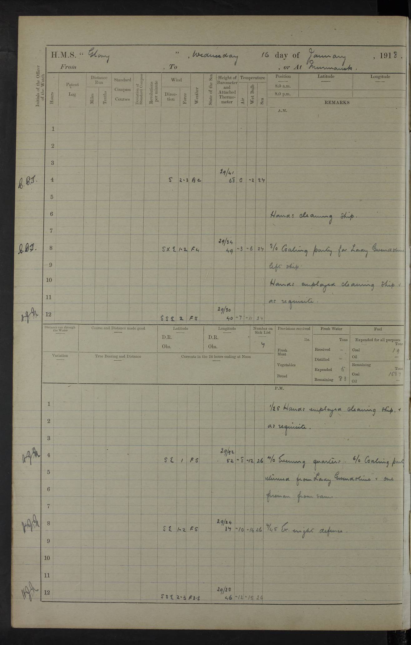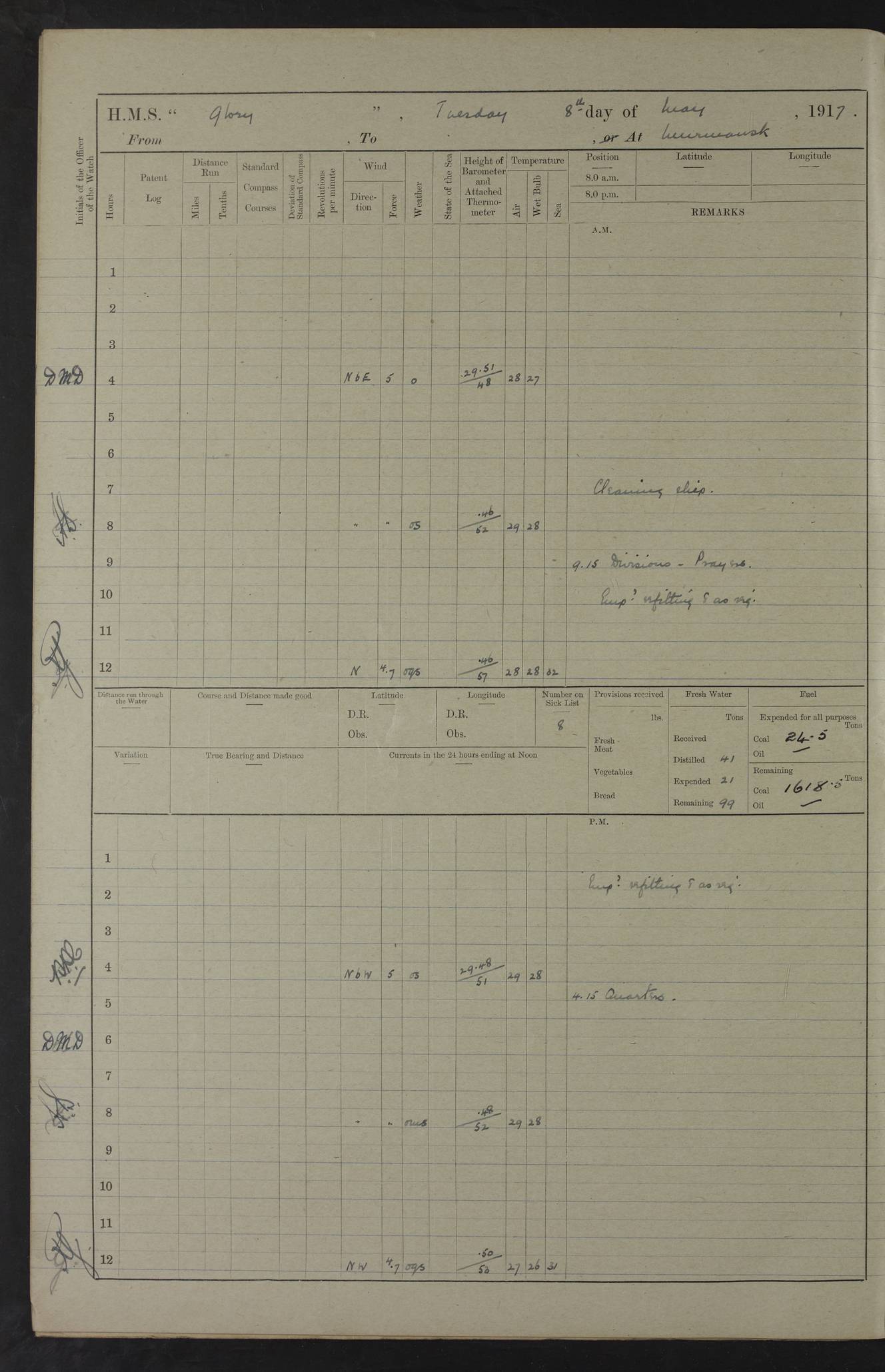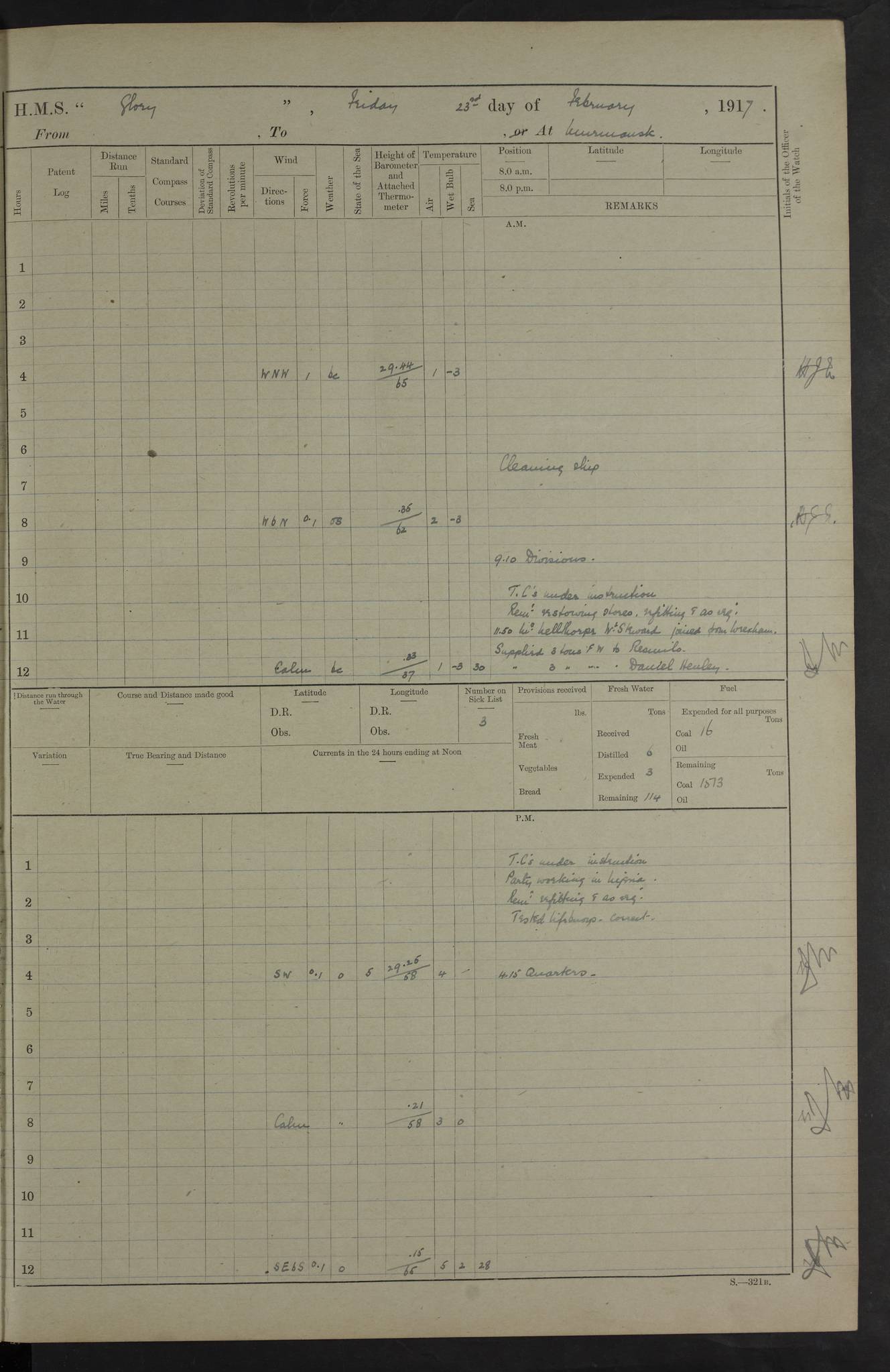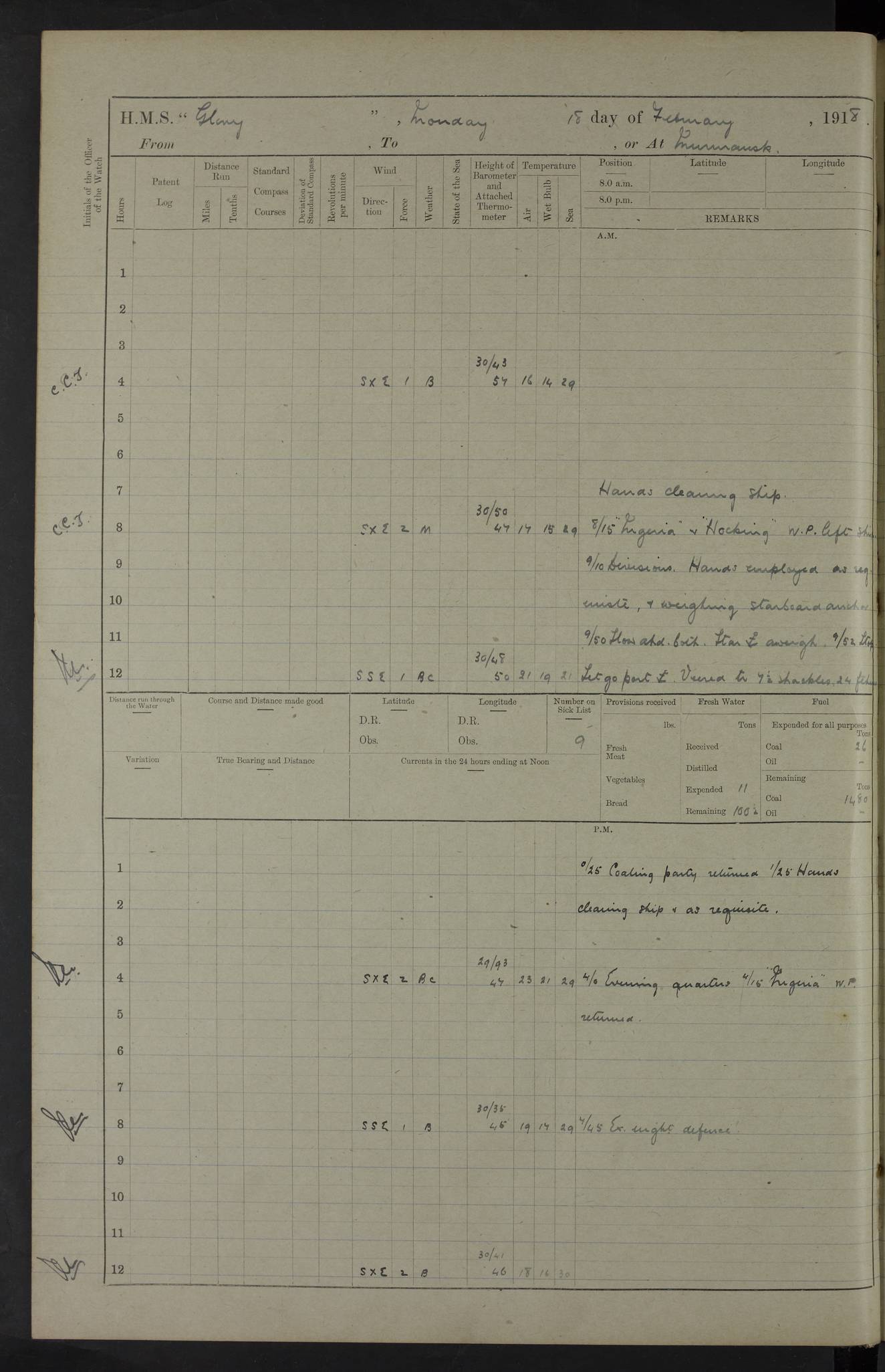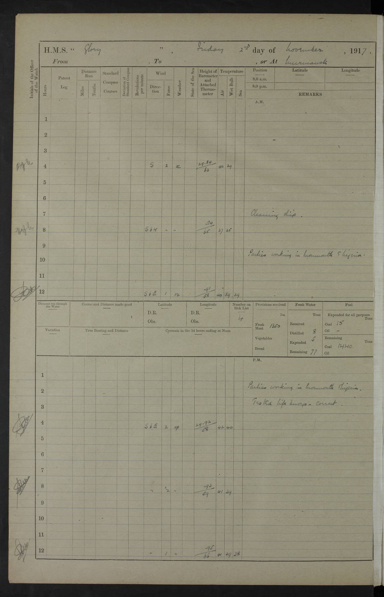 LOGS FOR OCTOBER 1916 For the period covered by the remainder of these logs (1 October, 1916 to 31 December 1918), HMS Glory was based at Murmansk, northern Russia. The city had a variety of names in the early 20th Century – including, Port Murman, Romanov and Murmansk. The location will be given in these pages as Murmansk, the modern name. A history of Murmansk’s names is available at http://en.wikipedia.org/wiki/Murmansk . 4f961482a2fc8e2def0011c7: (http://s3.amazonaws.com/oldweather/ADM53-43026/ADM 53-43026-001_0.jpg) This log is to be kept in a cover in future 4f961482a2fc8e2def0011c8: (http://s3.amazonaws.com/oldweather/ADM53-43026/ADM 53-43026-001_1.jpg) 4f961482a2fc8e2def0011c9: (http://s3.amazonaws.com/oldweather/ADM53-43026/ADM 53-43026-002_0.jpg) 4f961483a2fc8e2def0011ca: (http://s3.amazonaws.com/oldweather/ADM53-43026/ADM 53-43026-002_1.jpg) 4f961483a2fc8e2def0011cb: (http://s3.amazonaws.com/oldweather/ADM53-43026/ADM 53-43026-003_0.jpg) 4f961483a2fc8e2def0011cc: (http://s3.amazonaws.com/oldweather/ADM53-43026/ADM 53-43026-003_1.jpg) 1 October 1916 Murmansk Lat 69.03, Long 33.05 5.40am: Russian auxiliary Kolgiev sailed. Information regarding this vessel (or similar name) has not been found. 7.30am: Celebrated Holy Communion. am: Party working in Earl Essex. Earl Essex was a hired trawler of 225 grt, built, in 1914. Sourced from F.J. Dittmar & J.J. Colledge (1972) – British warships 1914–1919, Ian Allan. 10.45am: Held Divine Service. 11.30am: Celebrated Holy Communion. 4.45pm: Out nets. 4f961484a2fc8e2def0011cd: (http://s3.amazonaws.com/oldweather/ADM53-43026/ADM 53-43026-004_0.jpg) 2 October 1916 Murmansk Lat 69.03, Long 33.05 am: Party working in Earl Essex. 11.30am: Paid quarterly settlement. 6.15pm: Kolgiev arrived. 4f961484a2fc8e2def0011ce: (http://s3.amazonaws.com/oldweather/ADM53-43026/ADM 53-43026-004_1.jpg) 3 October 1916 Murmansk Lat 69.03, Long 33.05 Number on sick list: 9 9.20am: Aft port nets. 11.30am: Russian TBs Goorovoi and Plasteevyi(?) arrived. The first of these TBs is possibly ‘Grosovoi’, built at Le Havre around 1900. Her fate is unclear. The name of the second vessel is possibly incorrect, but no near match has been found. 1.30pm: Out port nets. 4f961484a2fc8e2def0011cf: (http://s3.amazonaws.com/oldweather/ADM53-43026/ADM 53-43026-005_0.jpg) 4 October 1916 Murmansk Lat 69.03, Long 33.05 8.30am: Salvator - broad pendant of Commodore T.W. Kemp arrived. Salvator (ex–Katoomba) was a hired yacht of 684 tons gross, built in 1903. She served as the Heliopolis in WW2. Details at WW1NavyBritishShips-Dittmar4AP.htm . 9.25am: Aft port nets. 11.05am: HE the Minister of Marine visited ship. 11.30am: Out port nets. 11.50am: Russian auxiliary Gotowsci(?) arrived. 12 noon: Kolgiev sailed. pm: HM Tug Blackcock arrived. Blackcock was a hired patrol tug, built in 1886 and wrecked on 18 January, 1918, in the White Sea. Sourced from F.J. Dittmar & J.J. Colledge (1972) – British warships 1914–1919, Ian Allan. 6.50pm: Kolgiev arrived. 4f961485a2fc8e2def0011d0: (http://s3.amazonaws.com/oldweather/ADM53-43026/ADM 53-43026-005_1.jpg) 5 October 1916 Murmansk Lat 69.03, Long 33.05 10.35am: Kolgiev sailed. 1.05pm: Salvator sailed. pm: Read Warrant No. 5. 4f961485a2fc8e2def0011d1: (http://s3.amazonaws.com/oldweather/ADM53-43026/ADM 53-43026-006_0.jpg) 6 October 1916 Murmansk Lat 69.03, Long 33.05 pm: 5 tons of water supplied to Blackcock. 3.30pm: Action. 3.45pm: Secure. Russian T.B's Grosovoi and Plasteevyi sailed. 4f961485a2fc8e2def0011d2: (http://s3.amazonaws.com/oldweather/ADM53-43026/ADM 53-43026-006_1.jpg) 7 October 1916 Murmansk Lat 69.03, Long 33.05 am: Party coaling trawler. am: Tested life buoys – correct. 4f961486a2fc8e2def0011d3: (http://s3.amazonaws.com/oldweather/ADM53-43026/ADM 53-43026-007_0.jpg) 8 October 1916 Murmansk Lat 69.03, Long 33.05 6.45am: Party working in collier. 7.30am: Celebrated Holy Communion. 10.45am: Held Divine service. 5.45pm: Held Divine Service. 4f961486a2fc8e2def0011d4: (http://s3.amazonaws.com/oldweather/ADM53-43026/ADM 53-43026-007_1.jpg) 9 October 1916 Murmansk Lat 69.03, Long 33.05 Number on sick list: 9 am: Exercised fire stations. am: 2nd pinnace patrolling. pm: Landed marines for drill. 4f961486a2fc8e2def0011d5: (http://s3.amazonaws.com/oldweather/ADM53-43026/ADM 53-43026-008_0.jpg) 10 October 1916 Murmansk Lat 69.03, Long 33.05 am: Steam pinnace patrolling. 1.55pm: Kolgiev arrived. 4f961487a2fc8e2def0011d6: (http://s3.amazonaws.com/oldweather/ADM53-43026/ADM 53-43026-008_1.jpg) 11 October 1916 Murmansk Lat 69.03, Long 33.05 am: Party working on boom defence. am: MT and QD men aired bedding. am: Marines at drill. 1.50pm: Kolgiev sailed. 3.15pm: British tug Racia (lighter ES 23 in tow) arrived. Racia was a hired screw tug of 410 grt, built in 1894 and sold on 23 June, 1920. Sourced from F.J. Dittmar & J.J. Colledge (1972) – British warships 1914–1919, Ian Allan. 4f961487a2fc8e2def0011d7: (http://s3.amazonaws.com/oldweather/ADM53-43026/ADM 53-43026-009_0.jpg) 12 October 1916 Murmansk Lat 69.03, Long 33.05 Number on sick list: 6 am: Party working on boom defence. am: Steam pinnace patrolling. pm: Make and mend clothes. 4.15pm: Read warrant No. 6. 6.00pm: Imperator Nicolas arrived. A vessel with this name has not been traced. 4f961487a2fc8e2def0011d8: (http://s3.amazonaws.com/oldweathe/ADM53-43026/ADM 53-43026-009_1.jpg) 13 October 1916 Murmansk Lat 69.03, Long 33.05 am: Steam pinnace patrolling. am: Party working on boom defence. am: Found foc’sle awning and side screens damaged by rats. 4f961488a2fc8e2def0011d9: (http://s3.amazonaws.com/oldweather/ADM53-43026/ADM 53-43026-010_0.jpg) 14 August 1916 (probably should read October) Murmansk Lat 69.03, Long 33.05 Number on sick list: 7 6.45am: Racia (floating crane in tow) sailed. am: Party working on boom defence. am: Tested life buoys – correct. 3.00pm: Vindictive arrived. HMS Vindictive was a protected cruiser of the Arrogant class, launched in 1897 at Chatham Dockyar