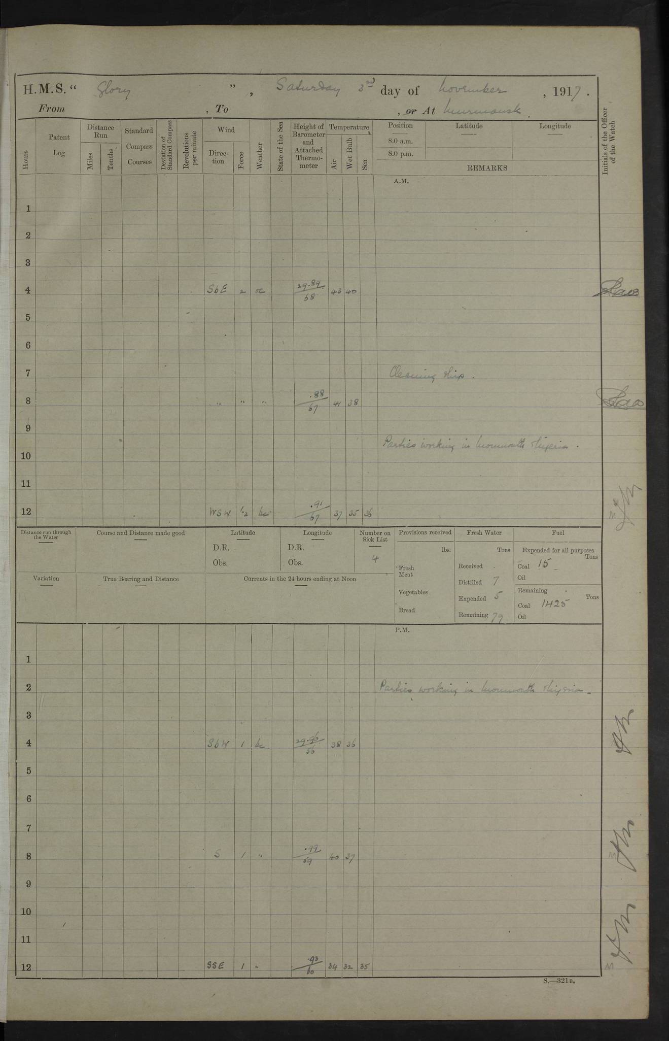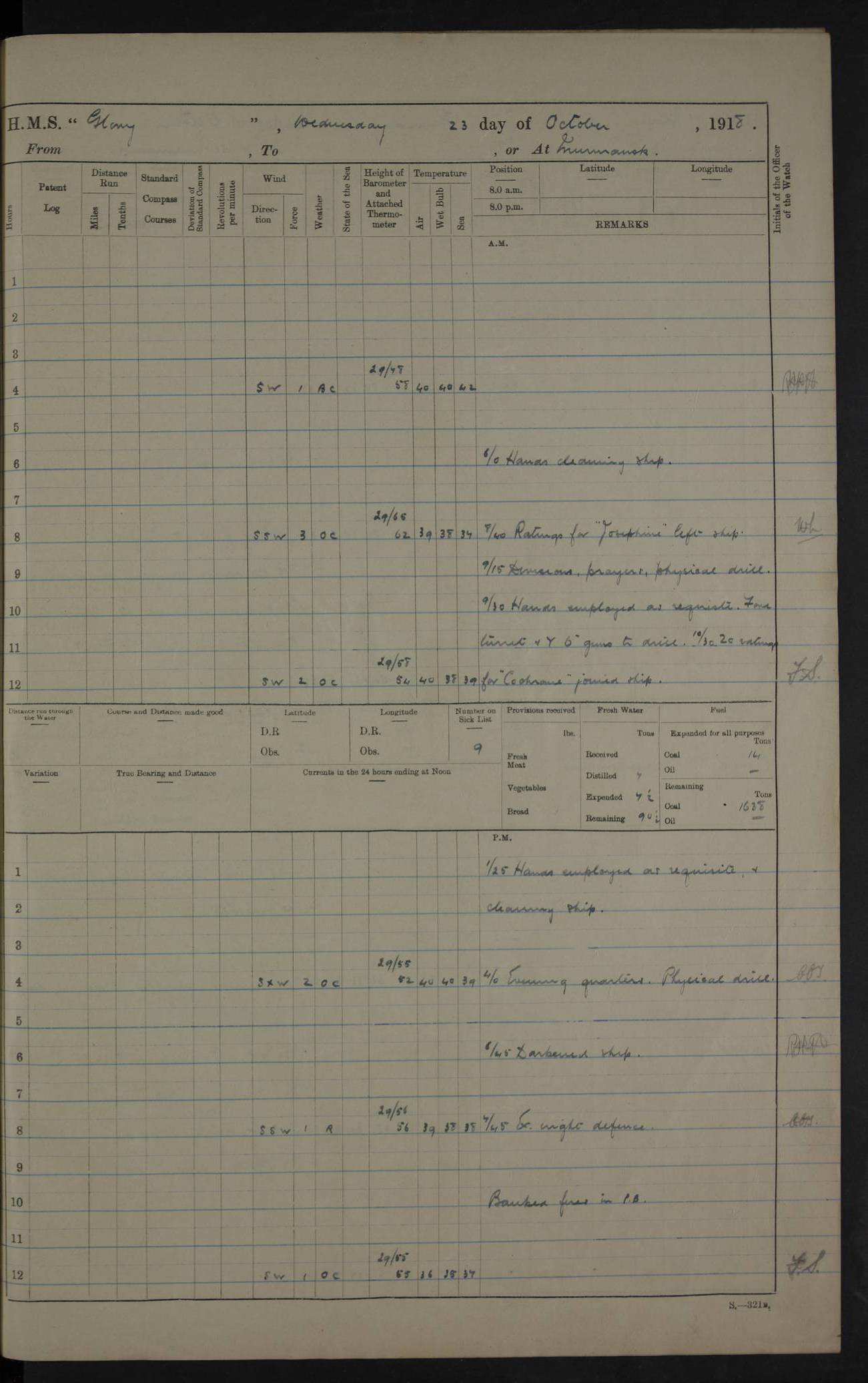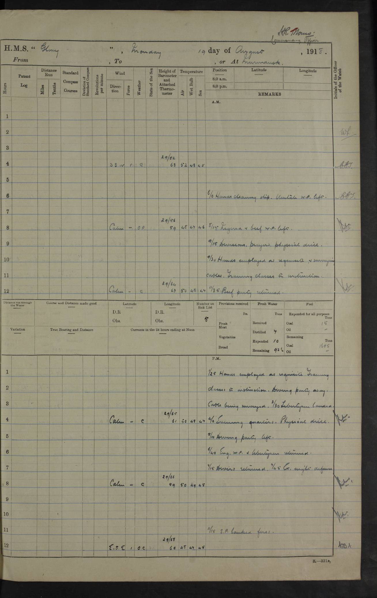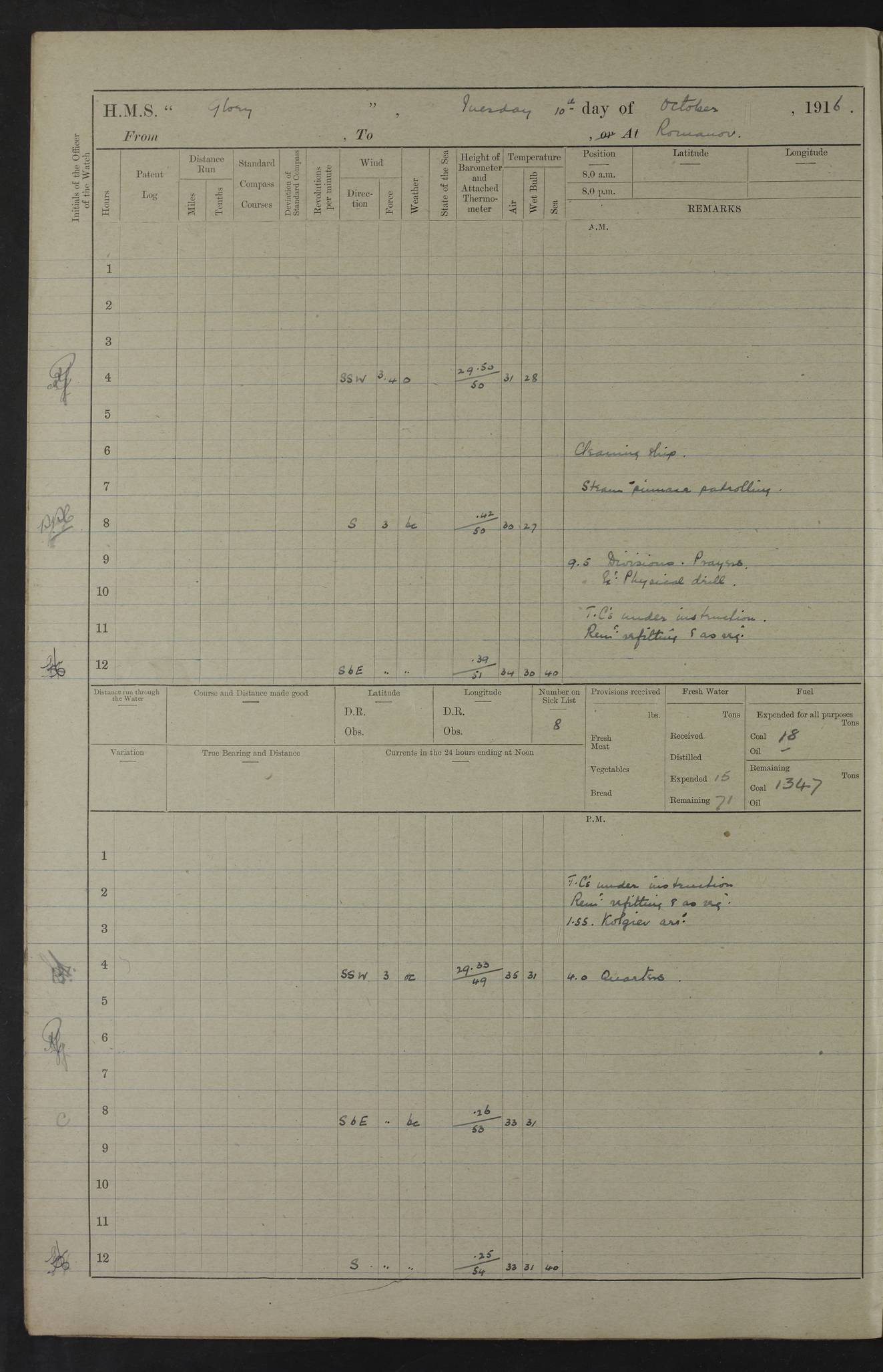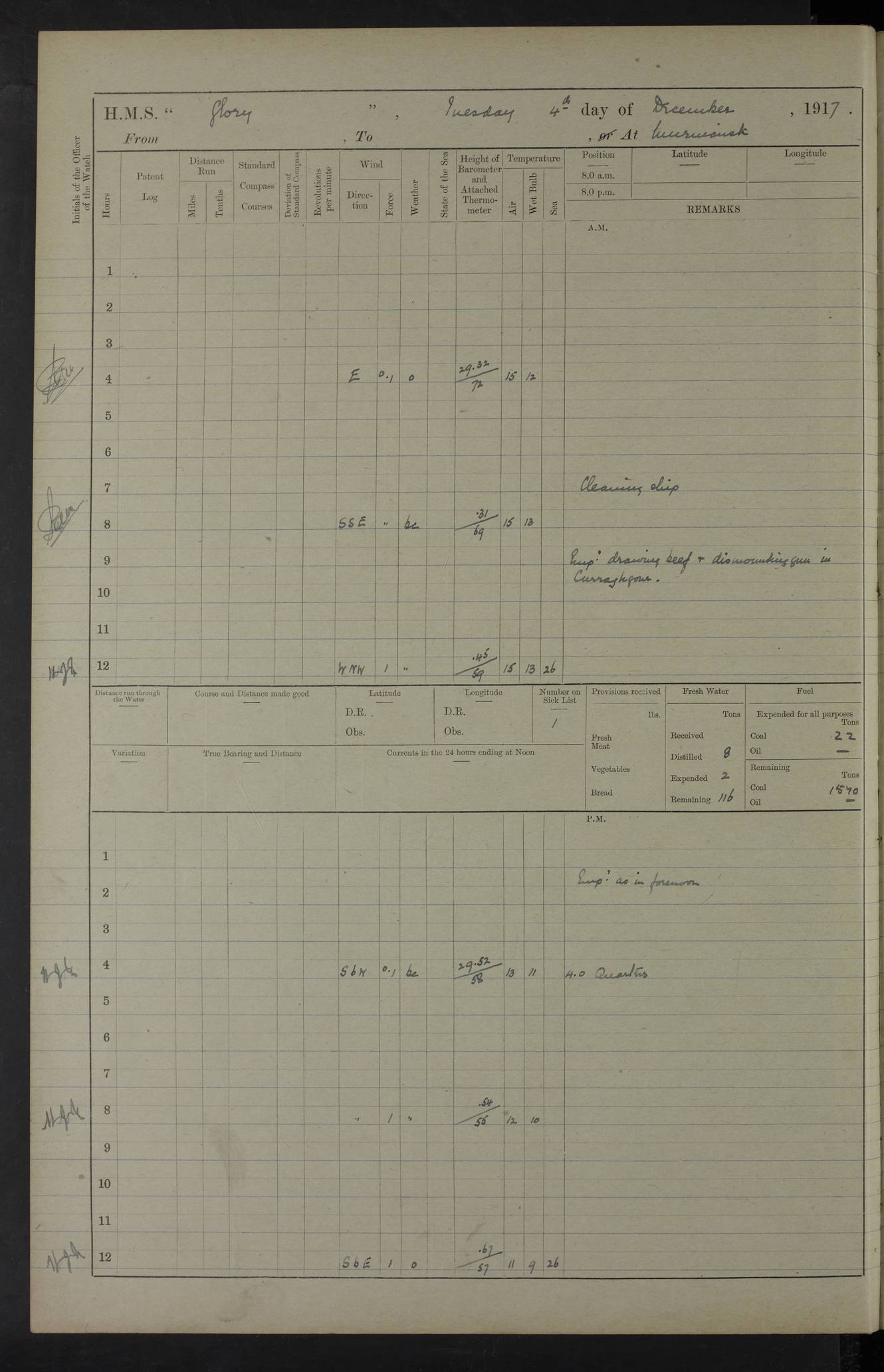 LOGS FOR OCTOBER 1916 For the period covered by the remainder of these logs (1 October, 1916 to 31 December 1918), HMS Glory was based at Murmansk, northern Russia. The city had a variety of names in the early 20th Century – including, Port Murman, Romanov and Murmansk. The location will be given in these pages as Murmansk, the modern name. A history of Murmansk’s names is available at http://en.wikipedia.org/wiki/Murmansk . 4f961482a2fc8e2def0011c7: (http://s3.amazonaws.com/oldweather/ADM53-43026/ADM 53-43026-001_0.jpg) This log is to be kept in a cover in future 4f961482a2fc8e2def0011c8: (http://s3.amazonaws.com/oldweather/ADM53-43026/ADM 53-43026-001_1.jpg) 4f961482a2fc8e2def0011c9: (http://s3.amazonaws.com/oldweather/ADM53-43026/ADM 53-43026-002_0.jpg) 4f961483a2fc8e2def0011ca: (http://s3.amazonaws.com/oldweather/ADM53-43026/ADM 53-43026-002_1.jpg) 4f961483a2fc8e2def0011cb: (http://s3.amazonaws.com/oldweather/ADM53-43026/ADM 53-43026-003_0.jpg) 4f961483a2fc8e2def0011cc: (http://s3.amazonaws.com/oldweather/ADM53-43026/ADM 53-43026-003_1.jpg) 1 October 1916 Murmansk Lat 69.03, Long 33.05 5.40am: Russian auxiliary Kolgiev sailed. Information regarding this vessel (or similar name) has not been found. 7.30am: Celebrated Holy Communion. am: Party working in Earl Essex. Earl Essex was a hired trawler of 225 grt, built, in 1914. Sourced from F.J. Dittmar & J.J. Colledge (1972) – British warships 1914–1919, Ian Allan. 10.45am: Held Divine Service. 11.30am: Celebrated Holy Communion. 4.45pm: Out nets. 4f961484a2fc8e2def0011cd: (http://s3.amazonaws.com/oldweather/ADM53-43026/ADM 53-43026-004_0.jpg) 2 October 1916 Murmansk Lat 69.03, Long 33.05 am: Party working in Earl Essex. 11.30am: Paid quarterly settlement. 6.15pm: Kolgiev arrived. 4f961484a2fc8e2def0011ce: (http://s3.amazonaws.com/oldweather/ADM53-43026/ADM 53-43026-004_1.jpg) 3 October 1916 Murmansk Lat 69.03, Long 33.05 Number on sick list: 9 9.20am: Aft port nets. 11.30am: Russian TBs Goorovoi and Plasteevyi(?) arrived. The first of these TBs is possibly ‘Grosovoi’, built at Le Havre around 1900. Her fate is unclear. The name of the second vessel is possibly incorrect, but no near match has been found. 1.30pm: Out port nets. 4f961484a2fc8e2def0011cf: (http://s3.amazonaws.com/oldweather/ADM53-43026/ADM 53-43026-005_0.jpg) 4 October 1916 Murmansk Lat 69.03, Long 33.05 8.30am: Salvator - broad pendant of Commodore T.W. Kemp arrived. Salvator (ex–Katoomba) was a hired yacht of 684 tons gross, built in 1903. She served as the Heliopolis in WW2. Details at WW1NavyBritishShips-Dittmar4AP.htm . 9.25am: Aft port nets. 11.05am: HE the Minister of Marine visited ship. 11.30am: Out port nets. 11.50am: Russian auxiliary Gotowsci(?) arrived. 12 noon: Kolgiev sailed. pm: HM Tug Blackcock arrived. Blackcock was a hired patrol tug, built in 1886 and wrecked on 18 January, 1918, in the White Sea. Sourced from F.J. Dittmar & J.J. Colledge (1972) – British warships 1914–1919, Ian Allan. 6.50pm: Kolgiev arrived. 4f961485a2fc8e2def0011d0: (http://s3.amazonaws.com/oldweather/ADM53-43026/ADM 53-43026-005_1.jpg) 5 October 1916 Murmansk Lat 69.03, Long 33.05 10.35am: Kolgiev sailed. 1.05pm: Salvator sailed. pm: Read Warrant No. 5. 4f961485a2fc8e2def0011d1: (http://s3.amazonaws.com/oldweather/ADM53-43026/ADM 53-43026-006_0.jpg) 6 October 1916 Murmansk Lat 69.03, Long 33.05 pm: 5 tons of water supplied to Blackcock. 3.30pm: Action. 3.45pm: Secure. Russian T.B's Grosovoi and Plasteevyi sailed. 4f961485a2fc8e2def0011d2: (http://s3.amazonaws.com/oldweather/ADM53-43026/ADM 53-43026-006_1.jpg) 7 October 1916 Murmansk Lat 69.03, Long 33.05 am: Party coaling trawler. am: Tested life buoys – correct. 4f961486a2fc8e2def0011d3: (http://s3.amazonaws.com/oldweather/ADM53-43026/ADM 53-43026-007_0.jpg) 8 October 1916 Murmansk Lat 69.03, Long 33.05 6.45am: Party working in collier. 7.30am: Celebrated Holy Communion. 10.45am: Held Divine service. 5.45pm: Held Divine Service. 4f961486a2fc8e2def0011d4: (http://s3.amazonaws.com/oldweather/ADM53-43026/ADM 53-43026-007_1.jpg) 9 October 1916 Murmansk Lat 69.03, Long 33.05 Number on sick list: 9 am: Exercised fire stations. am: 2nd pinnace patrolling. pm: Landed marines for drill. 4f961486a2fc8e2def0011d5: (http://s3.amazonaws.com/oldweather/ADM53-43026/ADM 53-43026-008_0.jpg) 10 October 1916 Murmansk Lat 69.03, Long 33.05 am: Steam pinnace patrolling. 1.55pm: Kolgiev arrived. 4f961487a2fc8e2def0011d6: (http://s3.amazonaws.com/oldweather/ADM53-43026/ADM 53-43026-008_1.jpg) 11 October 1916 Murmansk Lat 69.03, Long 33.05 am: Party working on boom defence. am: MT and QD men aired bedding. am: Marines at drill. 1.50pm: Kolgiev sailed. 3.15pm: British tug Racia (lighter ES 23 in tow) arrived. Racia was a hired screw tug of 410 grt, built in 1894 and sold on 23 June, 1920. Sourced from F.J. Dittmar & J.J. Colledge (1972) – British warships 1914–1919, Ian Allan. 4f961487a2fc8e2def0011d7: (http://s3.amazonaws.com/oldweather/ADM53-43026/ADM 53-43026-009_0.jpg) 12 October 1916 Murmansk Lat 69.03, Long 33.05 Number on sick list: 6 am: Party working on boom defence. am: Steam pinnace patrolling. pm: Make and mend clothes. 4.15pm: Read warrant No. 6. 6.00pm: Imperator Nicolas arrived. A vessel with this name has not been traced. 4f961487a2fc8e2def0011d8: (http://s3.amazonaws.com/oldweathe/ADM53-43026/ADM 53-43026-009_1.jpg) 13 October 1916 Murmansk Lat 69.03, Long 33.05 am: Steam pinnace patrolling. am: Party working on boom defence. am: Found foc’sle awning and side screens damaged by rats. 4f961488a2fc8e2def0011d9: (http://s3.amazonaws.com/oldweather/ADM53-43026/ADM 53-43026-010_0.jpg) 14 August 1916 (probably should read October) Murmansk Lat 69.03, Long 33.05 Number on sick list: 7 6.45am: Racia (floating crane in tow) sailed. am: Party working on boom defence. am: Tested life buoys – correct. 3.00pm: Vindictive arrived. HMS Vindictive was a protected cruiser of the Arrogant class, launched in 1897 at Chatham Dockyar