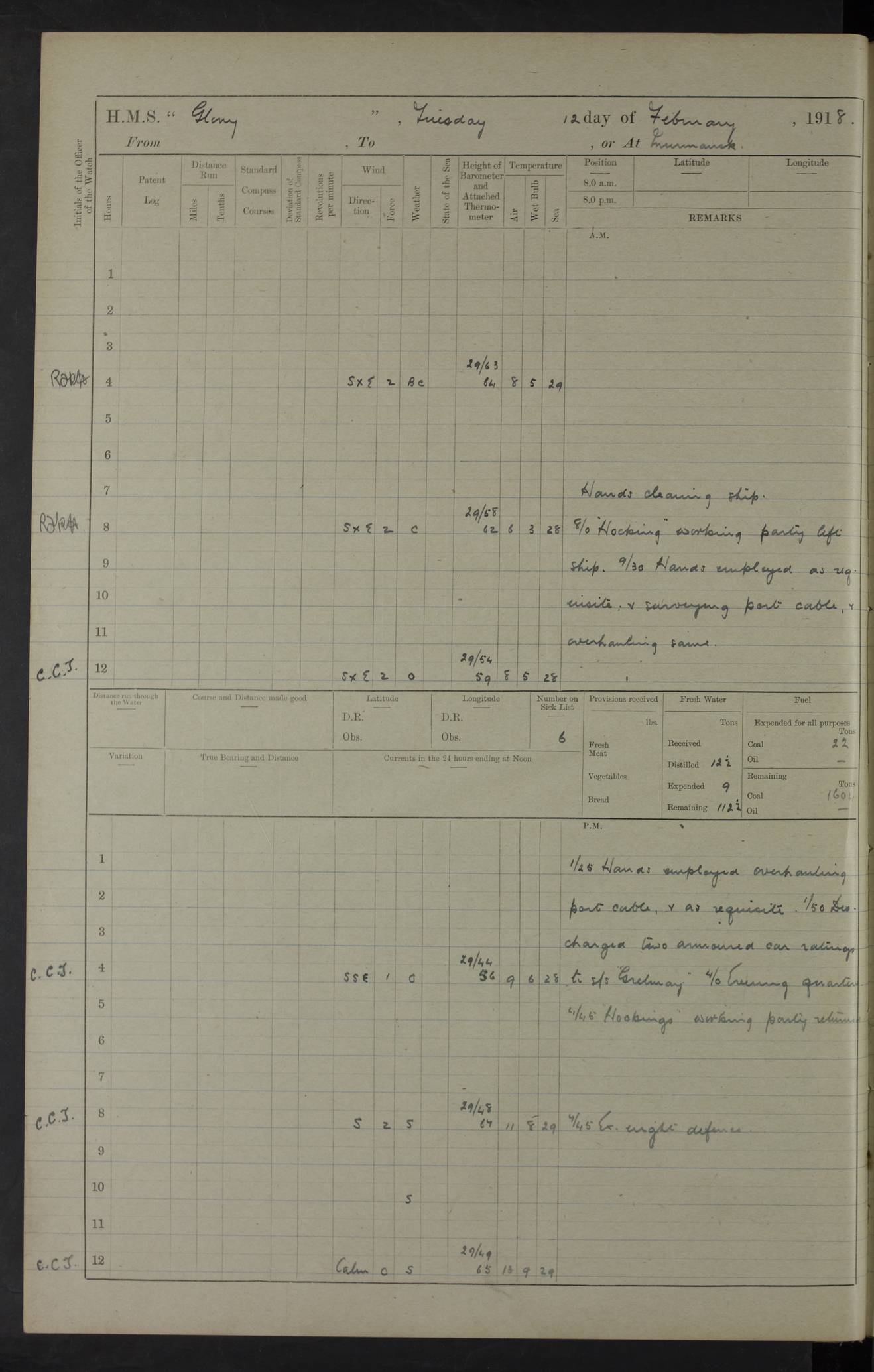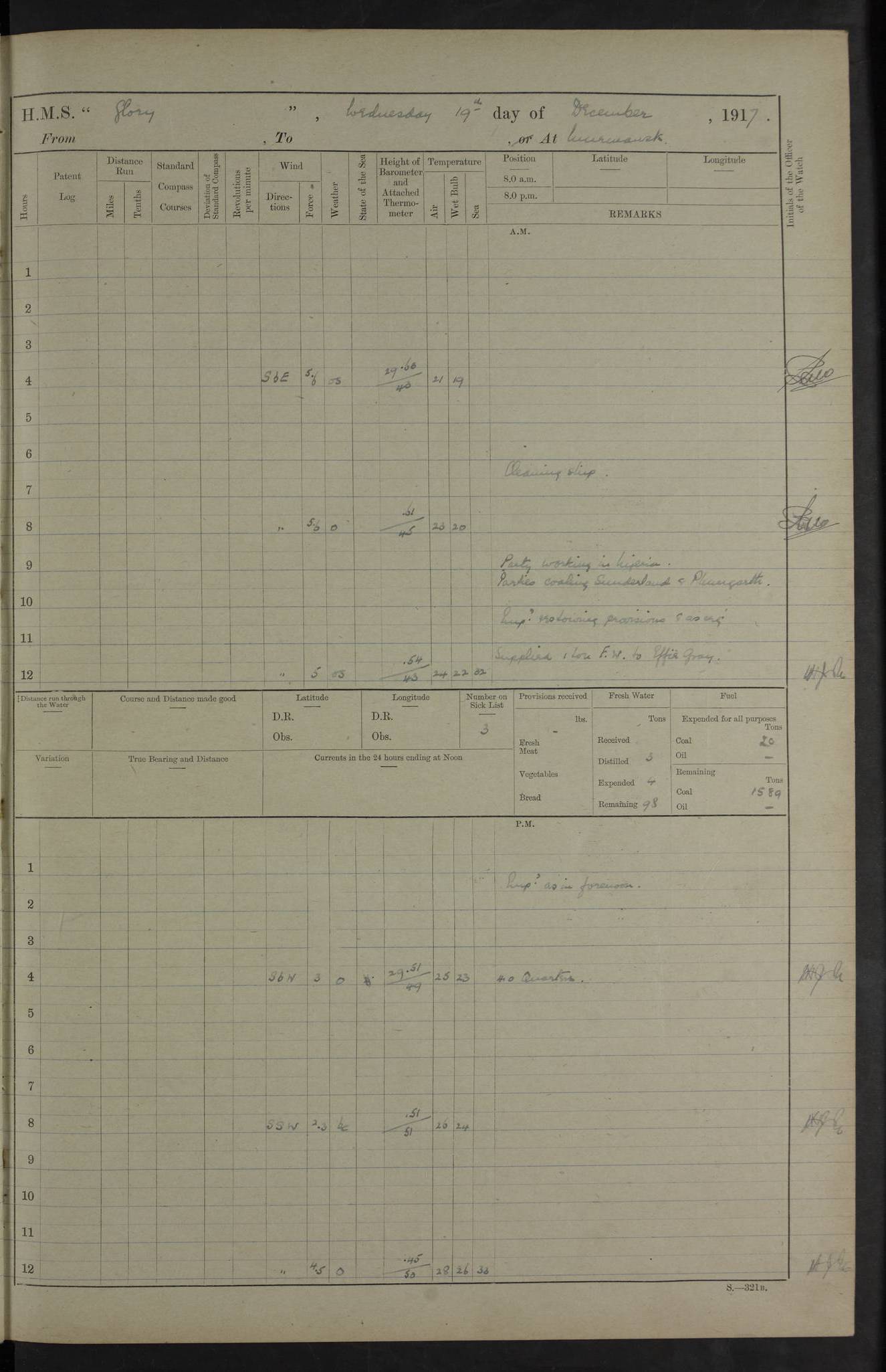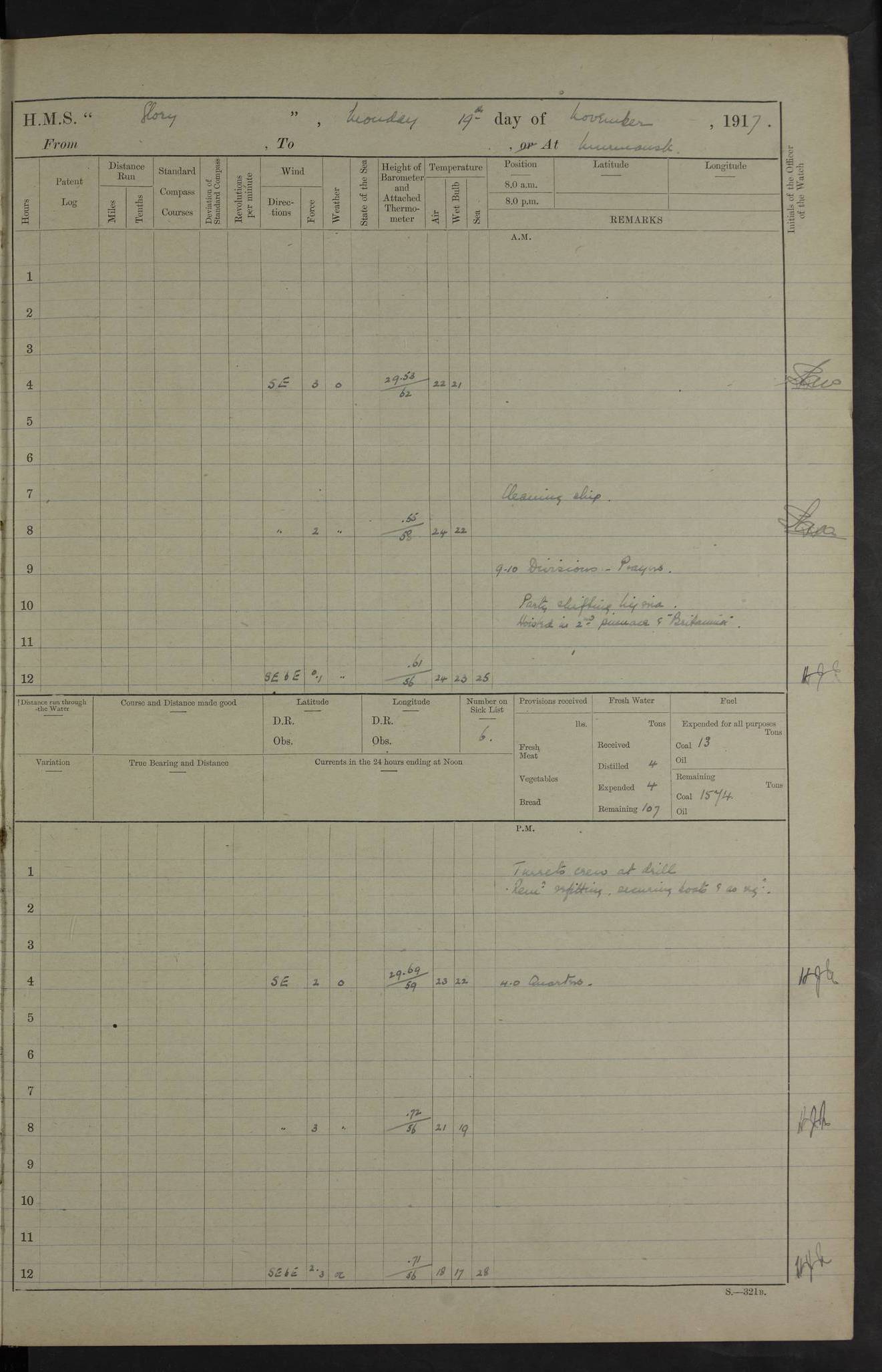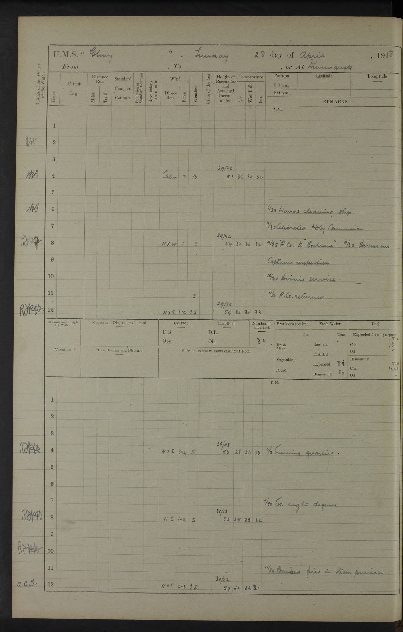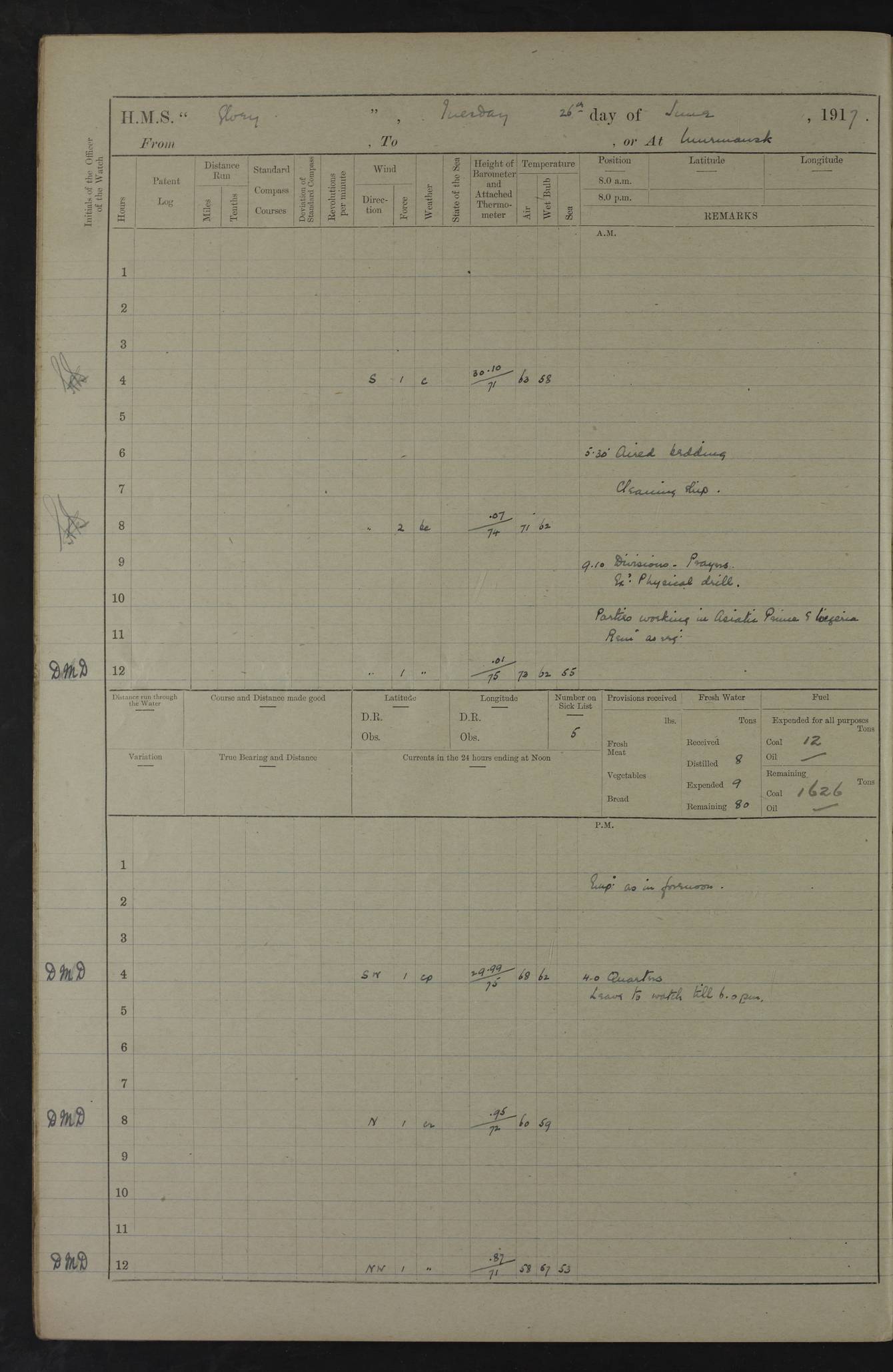 LOGS FOR OCTOBER 1916 For the period covered by the remainder of these logs (1 October, 1916 to 31 December 1918), HMS Glory was based at Murmansk, northern Russia. The city had a variety of names in the early 20th Century – including, Port Murman, Romanov and Murmansk. The location will be given in these pages as Murmansk, the modern name. A history of Murmansk’s names is available at http://en.wikipedia.org/wiki/Murmansk . 4f961482a2fc8e2def0011c7: (http://s3.amazonaws.com/oldweather/ADM53-43026/ADM 53-43026-001_0.jpg) This log is to be kept in a cover in future 4f961482a2fc8e2def0011c8: (http://s3.amazonaws.com/oldweather/ADM53-43026/ADM 53-43026-001_1.jpg) 4f961482a2fc8e2def0011c9: (http://s3.amazonaws.com/oldweather/ADM53-43026/ADM 53-43026-002_0.jpg) 4f961483a2fc8e2def0011ca: (http://s3.amazonaws.com/oldweather/ADM53-43026/ADM 53-43026-002_1.jpg) 4f961483a2fc8e2def0011cb: (http://s3.amazonaws.com/oldweather/ADM53-43026/ADM 53-43026-003_0.jpg) 4f961483a2fc8e2def0011cc: (http://s3.amazonaws.com/oldweather/ADM53-43026/ADM 53-43026-003_1.jpg) 1 October 1916 Murmansk Lat 69.03, Long 33.05 5.40am: Russian auxiliary Kolgiev sailed. Information regarding this vessel (or similar name) has not been found. 7.30am: Celebrated Holy Communion. am: Party working in Earl Essex. Earl Essex was a hired trawler of 225 grt, built, in 1914. Sourced from F.J. Dittmar & J.J. Colledge (1972) – British warships 1914–1919, Ian Allan. 10.45am: Held Divine Service. 11.30am: Celebrated Holy Communion. 4.45pm: Out nets. 4f961484a2fc8e2def0011cd: (http://s3.amazonaws.com/oldweather/ADM53-43026/ADM 53-43026-004_0.jpg) 2 October 1916 Murmansk Lat 69.03, Long 33.05 am: Party working in Earl Essex. 11.30am: Paid quarterly settlement. 6.15pm: Kolgiev arrived. 4f961484a2fc8e2def0011ce: (http://s3.amazonaws.com/oldweather/ADM53-43026/ADM 53-43026-004_1.jpg) 3 October 1916 Murmansk Lat 69.03, Long 33.05 Number on sick list: 9 9.20am: Aft port nets. 11.30am: Russian TBs Goorovoi and Plasteevyi(?) arrived. The first of these TBs is possibly ‘Grosovoi’, built at Le Havre around 1900. Her fate is unclear. The name of the second vessel is possibly incorrect, but no near match has been found. 1.30pm: Out port nets. 4f961484a2fc8e2def0011cf: (http://s3.amazonaws.com/oldweather/ADM53-43026/ADM 53-43026-005_0.jpg) 4 October 1916 Murmansk Lat 69.03, Long 33.05 8.30am: Salvator - broad pendant of Commodore T.W. Kemp arrived. Salvator (ex–Katoomba) was a hired yacht of 684 tons gross, built in 1903. She served as the Heliopolis in WW2. Details at WW1NavyBritishShips-Dittmar4AP.htm . 9.25am: Aft port nets. 11.05am: HE the Minister of Marine visited ship. 11.30am: Out port nets. 11.50am: Russian auxiliary Gotowsci(?) arrived. 12 noon: Kolgiev sailed. pm: HM Tug Blackcock arrived. Blackcock was a hired patrol tug, built in 1886 and wrecked on 18 January, 1918, in the White Sea. Sourced from F.J. Dittmar & J.J. Colledge (1972) – British warships 1914–1919, Ian Allan. 6.50pm: Kolgiev arrived. 4f961485a2fc8e2def0011d0: (http://s3.amazonaws.com/oldweather/ADM53-43026/ADM 53-43026-005_1.jpg) 5 October 1916 Murmansk Lat 69.03, Long 33.05 10.35am: Kolgiev sailed. 1.05pm: Salvator sailed. pm: Read Warrant No. 5. 4f961485a2fc8e2def0011d1: (http://s3.amazonaws.com/oldweather/ADM53-43026/ADM 53-43026-006_0.jpg) 6 October 1916 Murmansk Lat 69.03, Long 33.05 pm: 5 tons of water supplied to Blackcock. 3.30pm: Action. 3.45pm: Secure. Russian T.B's Grosovoi and Plasteevyi sailed. 4f961485a2fc8e2def0011d2: (http://s3.amazonaws.com/oldweather/ADM53-43026/ADM 53-43026-006_1.jpg) 7 October 1916 Murmansk Lat 69.03, Long 33.05 am: Party coaling trawler. am: Tested life buoys – correct. 4f961486a2fc8e2def0011d3: (http://s3.amazonaws.com/oldweather/ADM53-43026/ADM 53-43026-007_0.jpg) 8 October 1916 Murmansk Lat 69.03, Long 33.05 6.45am: Party working in collier. 7.30am: Celebrated Holy Communion. 10.45am: Held Divine service. 5.45pm: Held Divine Service. 4f961486a2fc8e2def0011d4: (http://s3.amazonaws.com/oldweather/ADM53-43026/ADM 53-43026-007_1.jpg) 9 October 1916 Murmansk Lat 69.03, Long 33.05 Number on sick list: 9 am: Exercised fire stations. am: 2nd pinnace patrolling. pm: Landed marines for drill. 4f961486a2fc8e2def0011d5: (http://s3.amazonaws.com/oldweather/ADM53-43026/ADM 53-43026-008_0.jpg) 10 October 1916 Murmansk Lat 69.03, Long 33.05 am: Steam pinnace patrolling. 1.55pm: Kolgiev arrived. 4f961487a2fc8e2def0011d6: (http://s3.amazonaws.com/oldweather/ADM53-43026/ADM 53-43026-008_1.jpg) 11 October 1916 Murmansk Lat 69.03, Long 33.05 am: Party working on boom defence. am: MT and QD men aired bedding. am: Marines at drill. 1.50pm: Kolgiev sailed. 3.15pm: British tug Racia (lighter ES 23 in tow) arrived. Racia was a hired screw tug of 410 grt, built in 1894 and sold on 23 June, 1920. Sourced from F.J. Dittmar & J.J. Colledge (1972) – British warships 1914–1919, Ian Allan. 4f961487a2fc8e2def0011d7: (http://s3.amazonaws.com/oldweather/ADM53-43026/ADM 53-43026-009_0.jpg) 12 October 1916 Murmansk Lat 69.03, Long 33.05 Number on sick list: 6 am: Party working on boom defence. am: Steam pinnace patrolling. pm: Make and mend clothes. 4.15pm: Read warrant No. 6. 6.00pm: Imperator Nicolas arrived. A vessel with this name has not been traced. 4f961487a2fc8e2def0011d8: (http://s3.amazonaws.com/oldweathe/ADM53-43026/ADM 53-43026-009_1.jpg) 13 October 1916 Murmansk Lat 69.03, Long 33.05 am: Steam pinnace patrolling. am: Party working on boom defence. am: Found foc’sle awning and side screens damaged by rats. 4f961488a2fc8e2def0011d9: (http://s3.amazonaws.com/oldweather/ADM53-43026/ADM 53-43026-010_0.jpg) 14 August 1916 (probably should read October) Murmansk Lat 69.03, Long 33.05 Number on sick list: 7 6.45am: Racia (floating crane in tow) sailed. am: Party working on boom defence. am: Tested life buoys – correct. 3.00pm: Vindictive arrived. HMS Vindictive was a protected cruiser of the Arrogant class, launched in 1897 at Chatham Dockyar